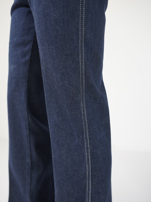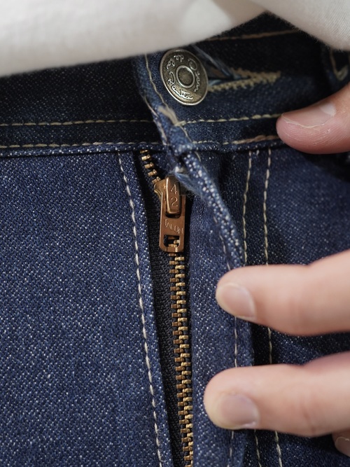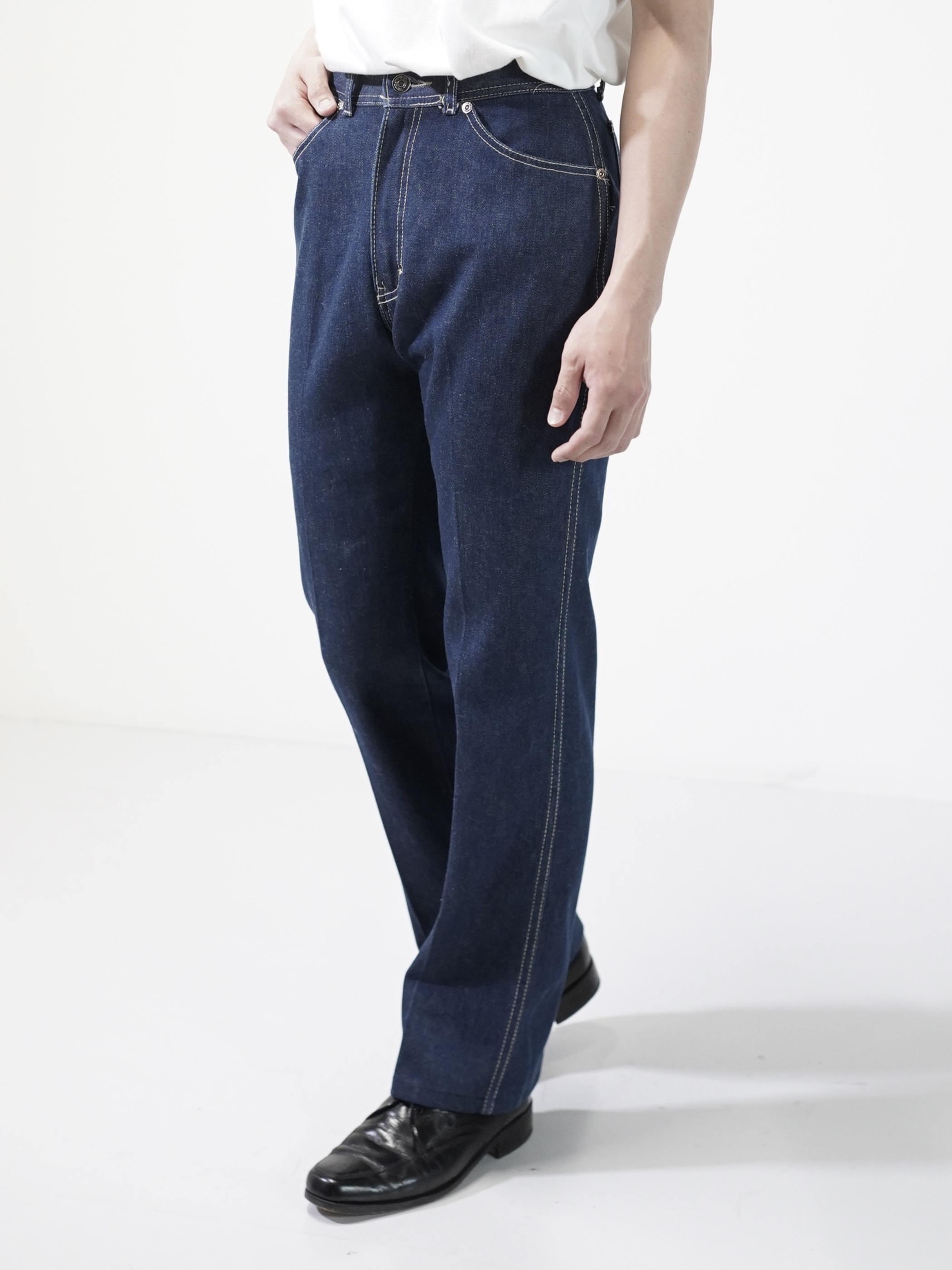 クリースが入ったドレストラウザーのようなインディゴジーンズ