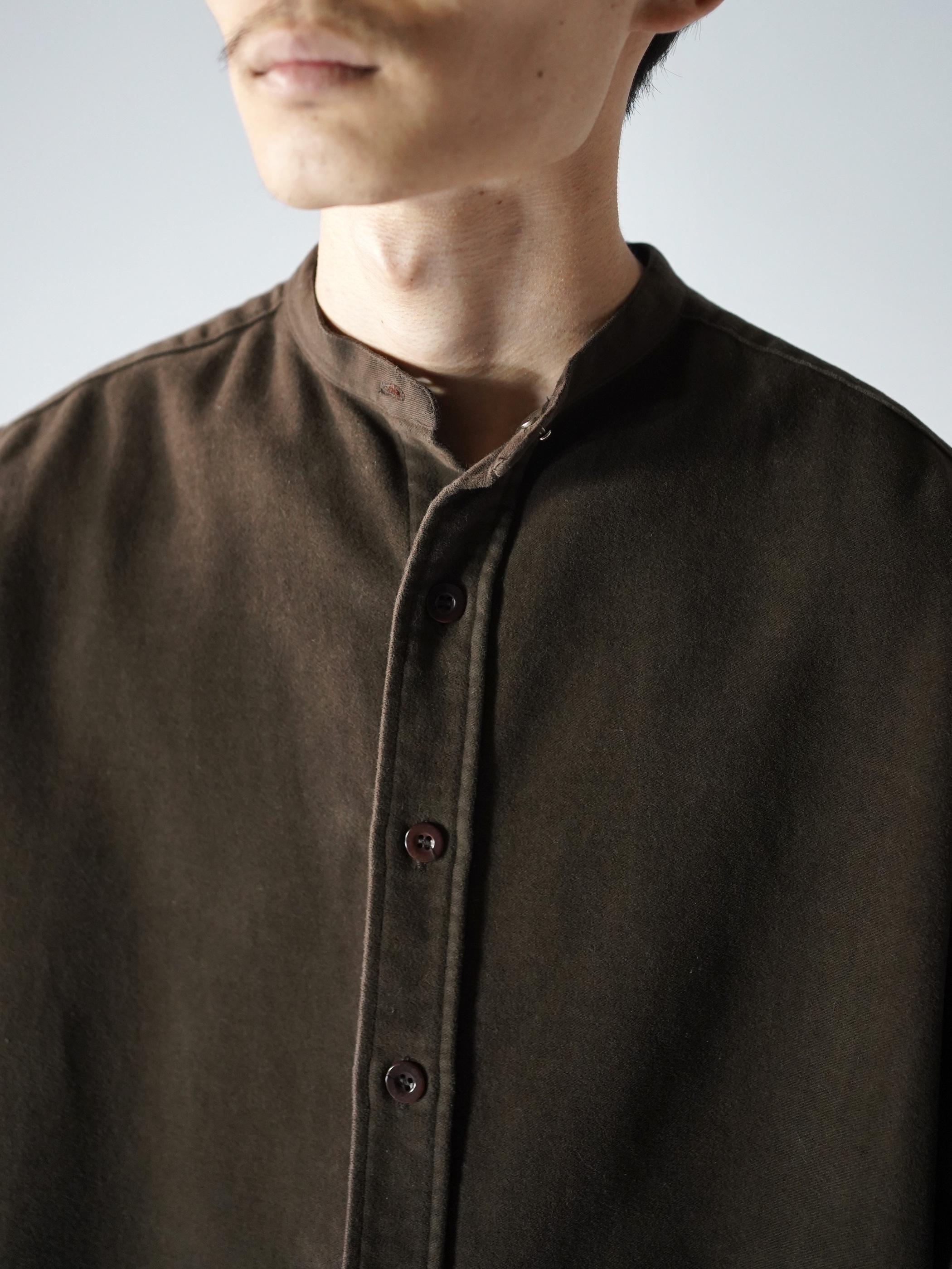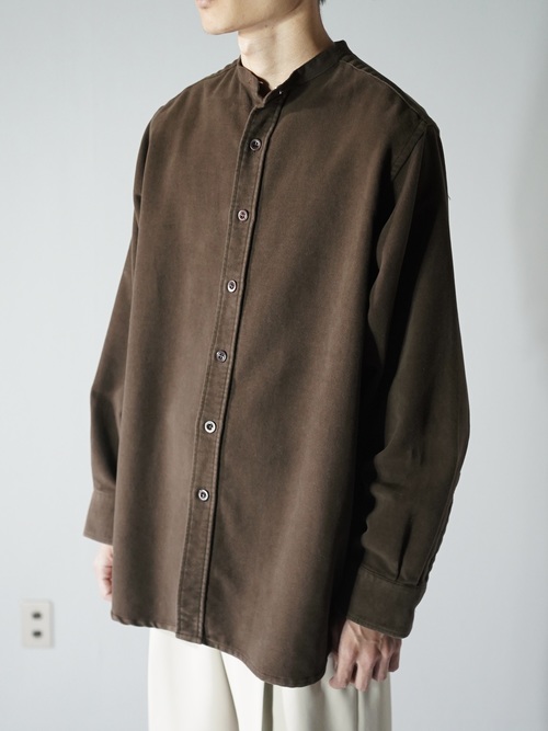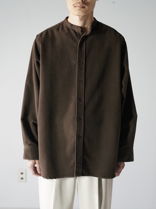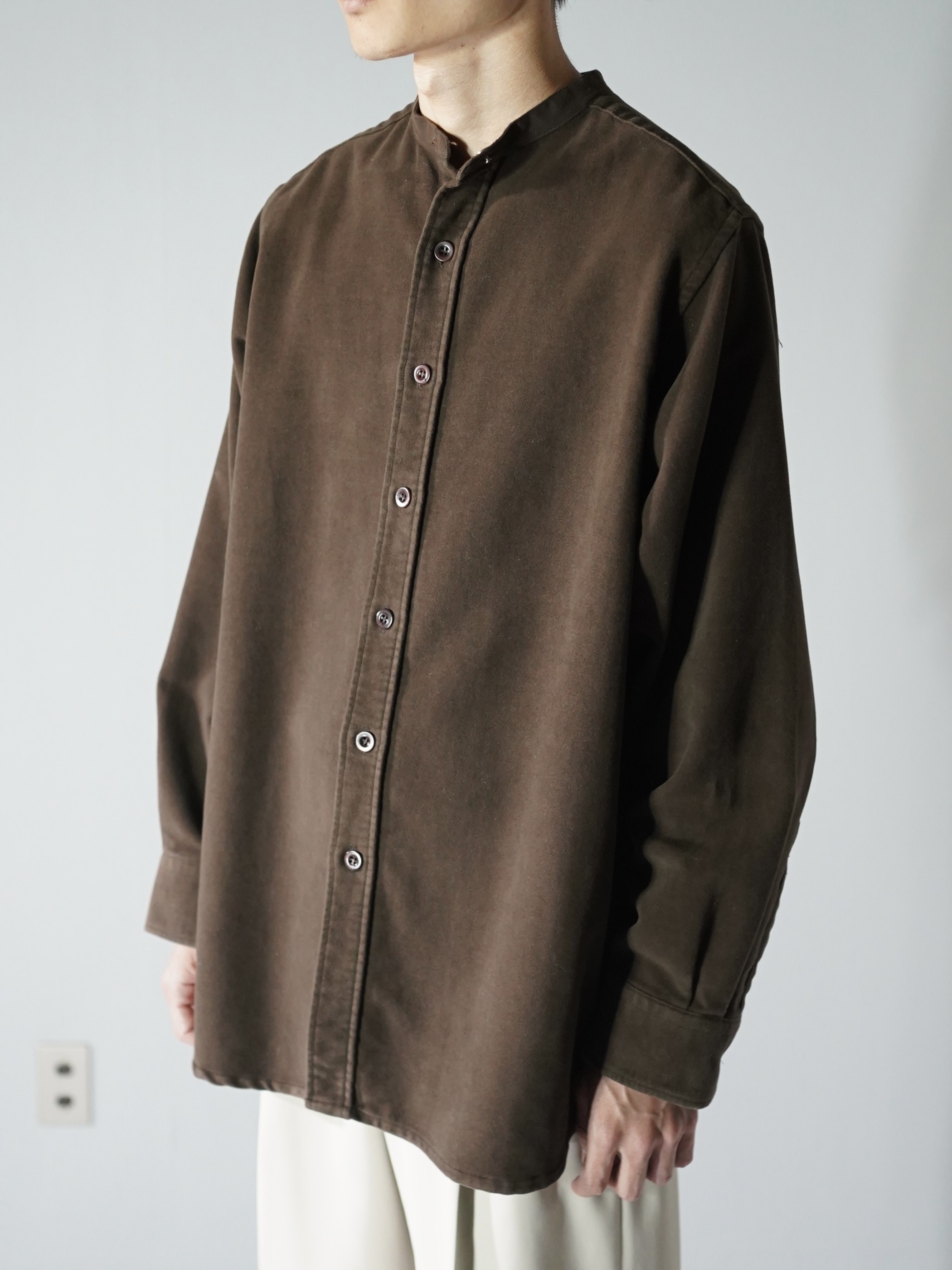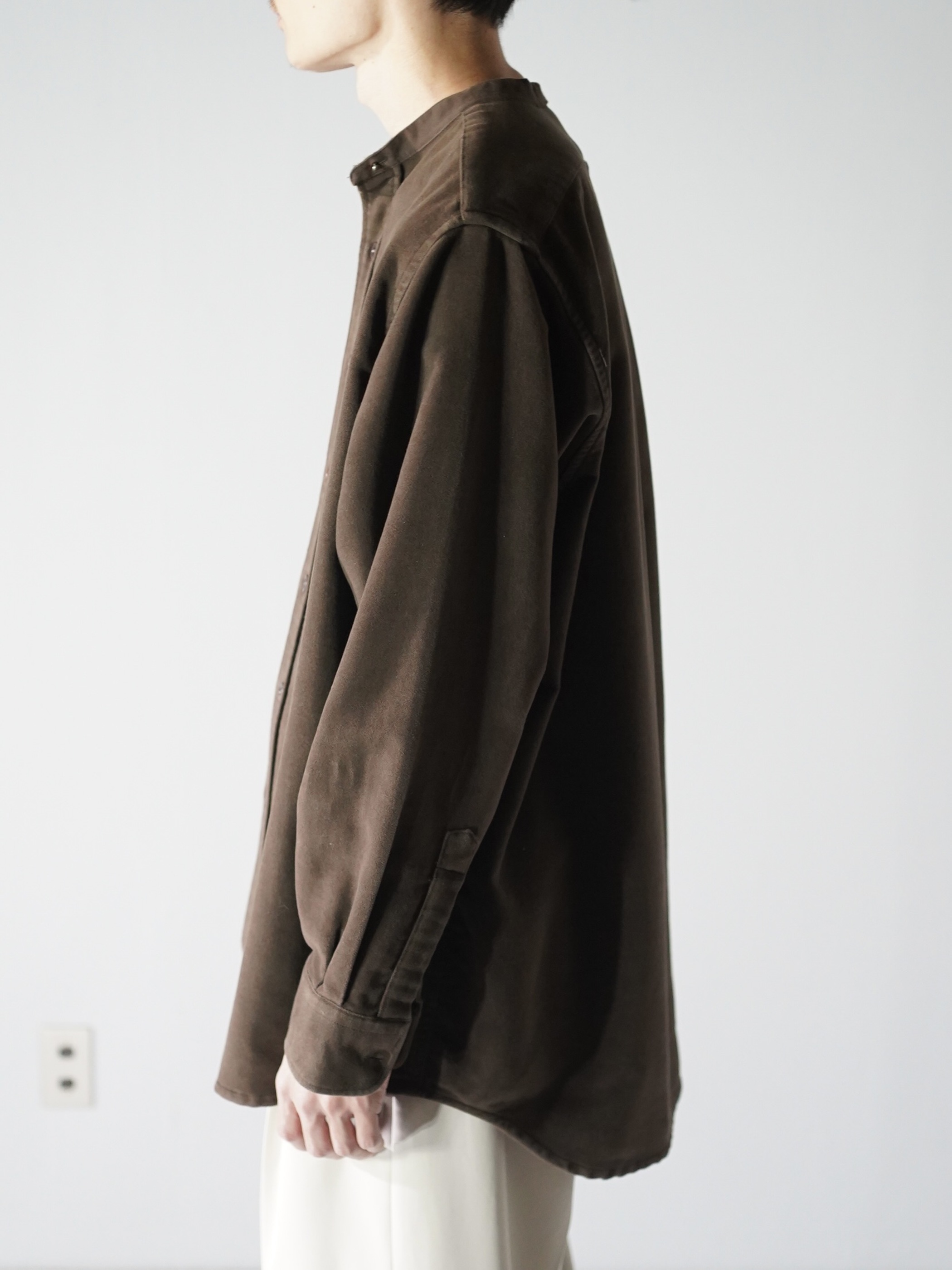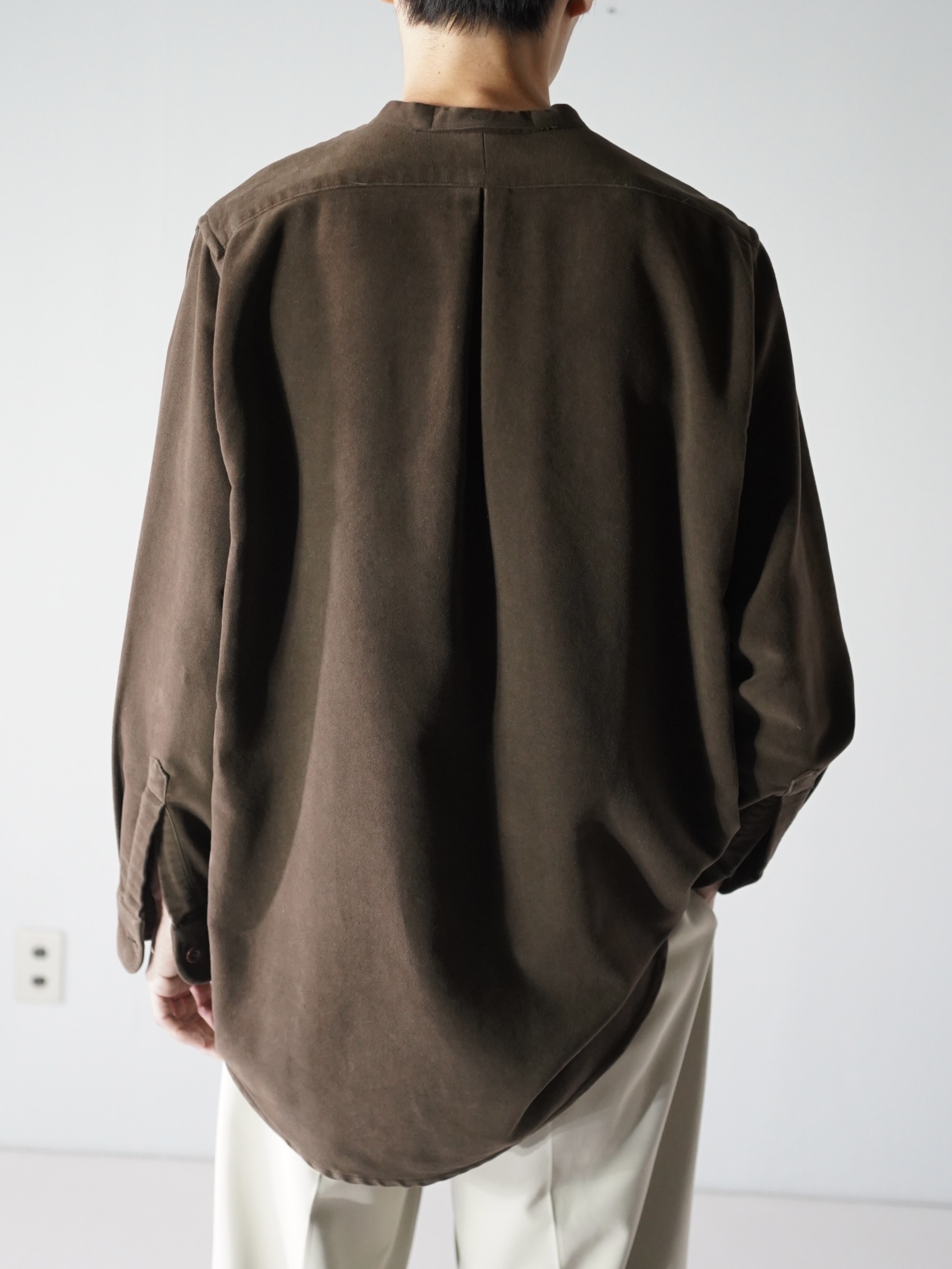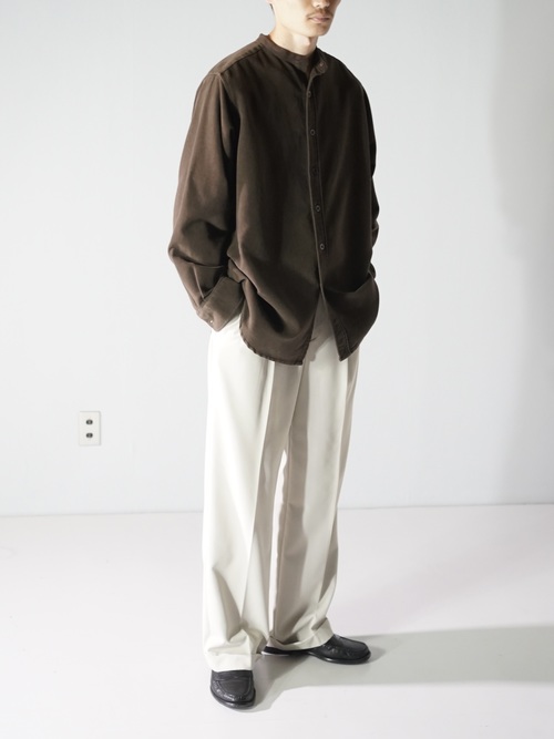フロントのトップボタンはピンボタンを採用し、ギャザーシャツのようなゆとりのある身幅とアーム幅。