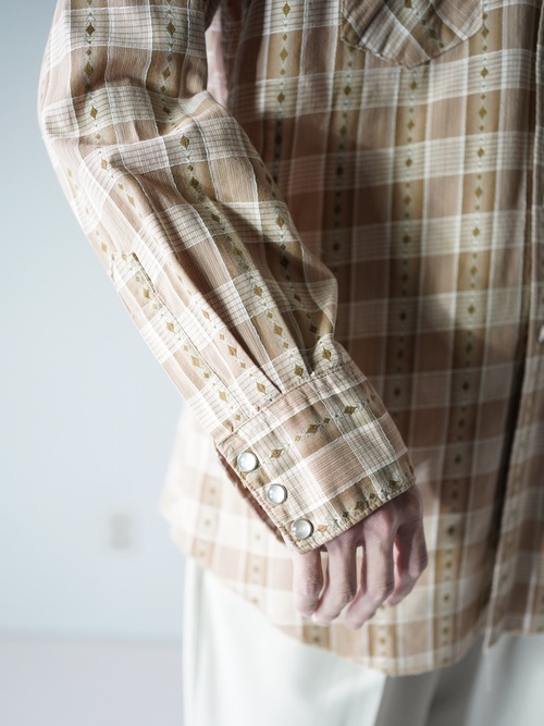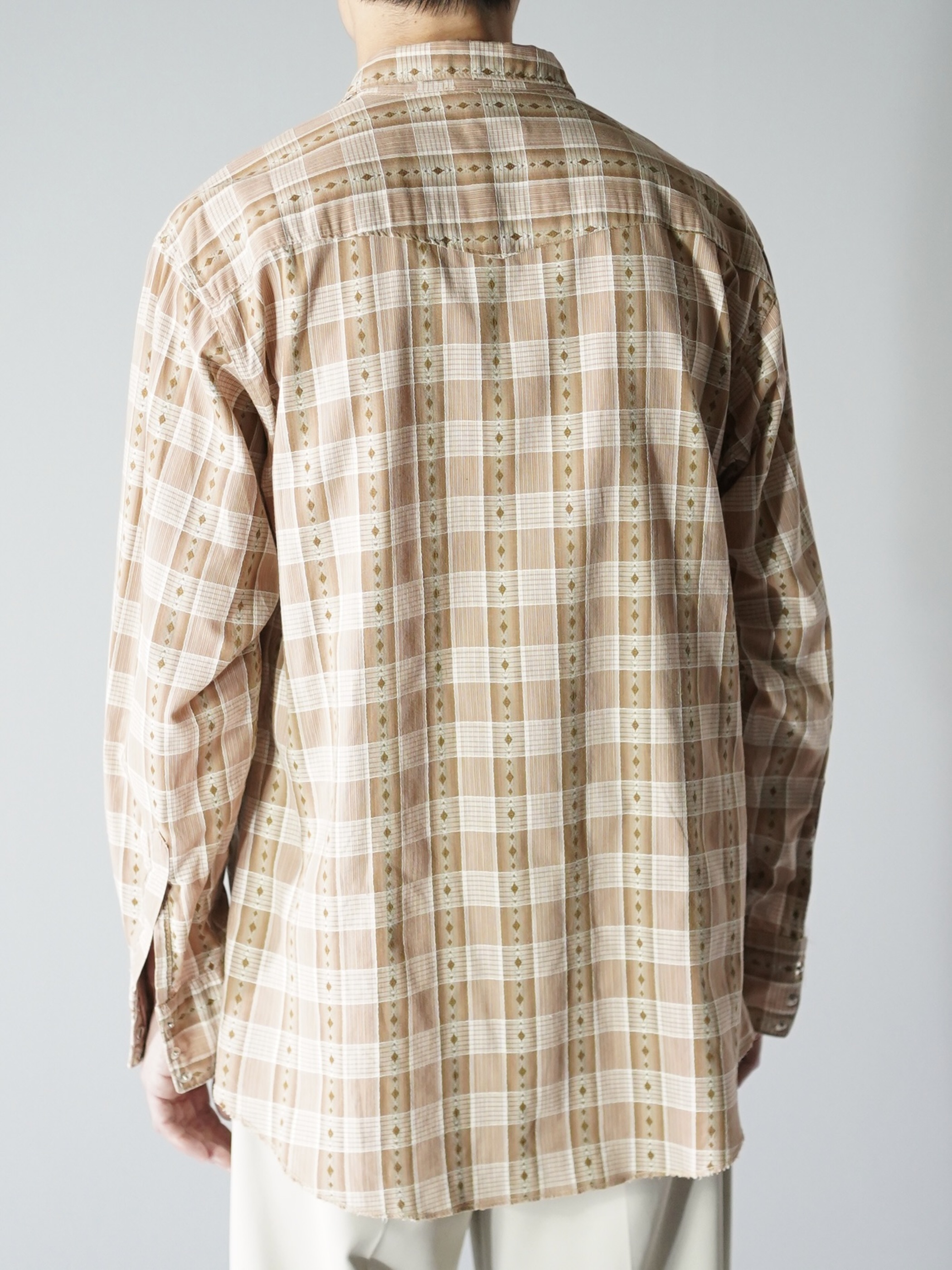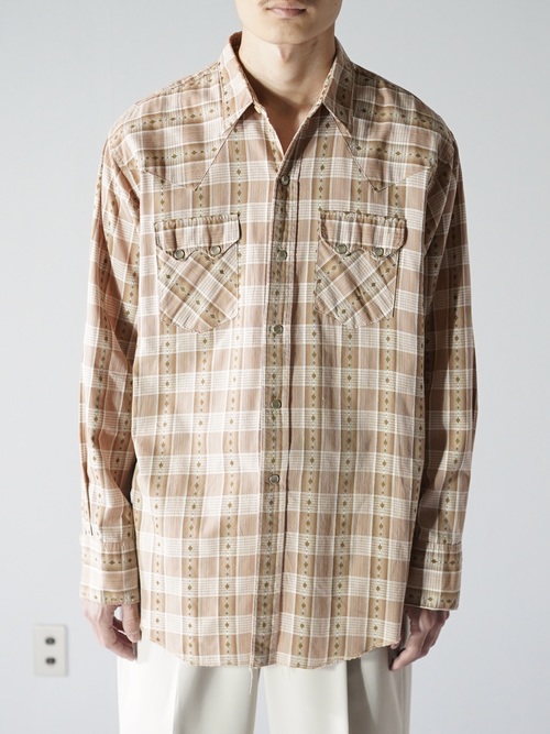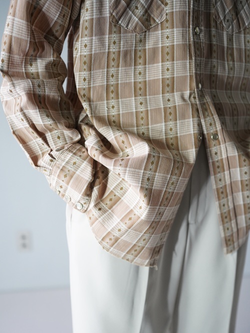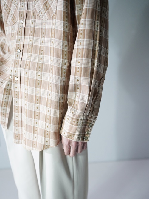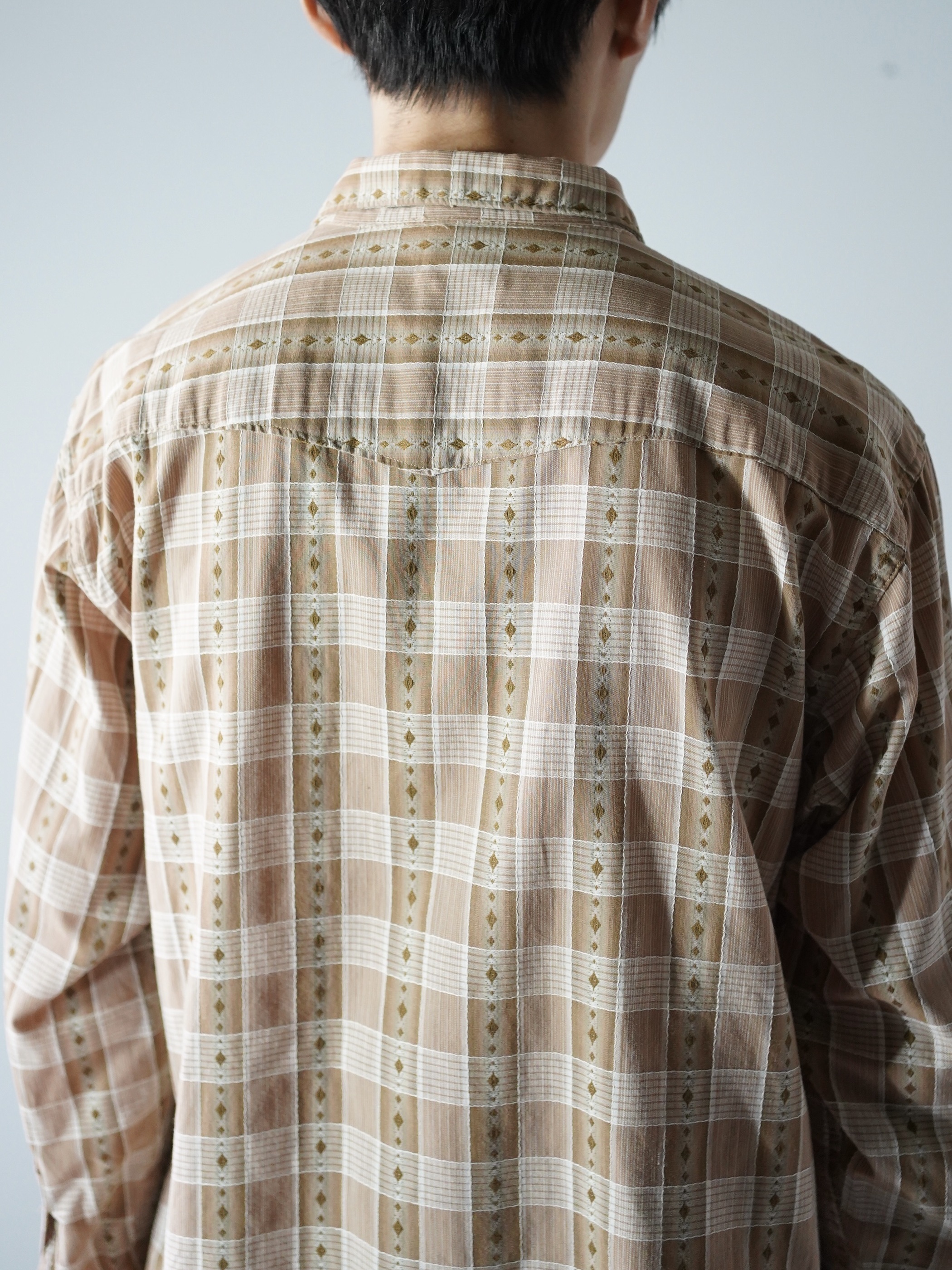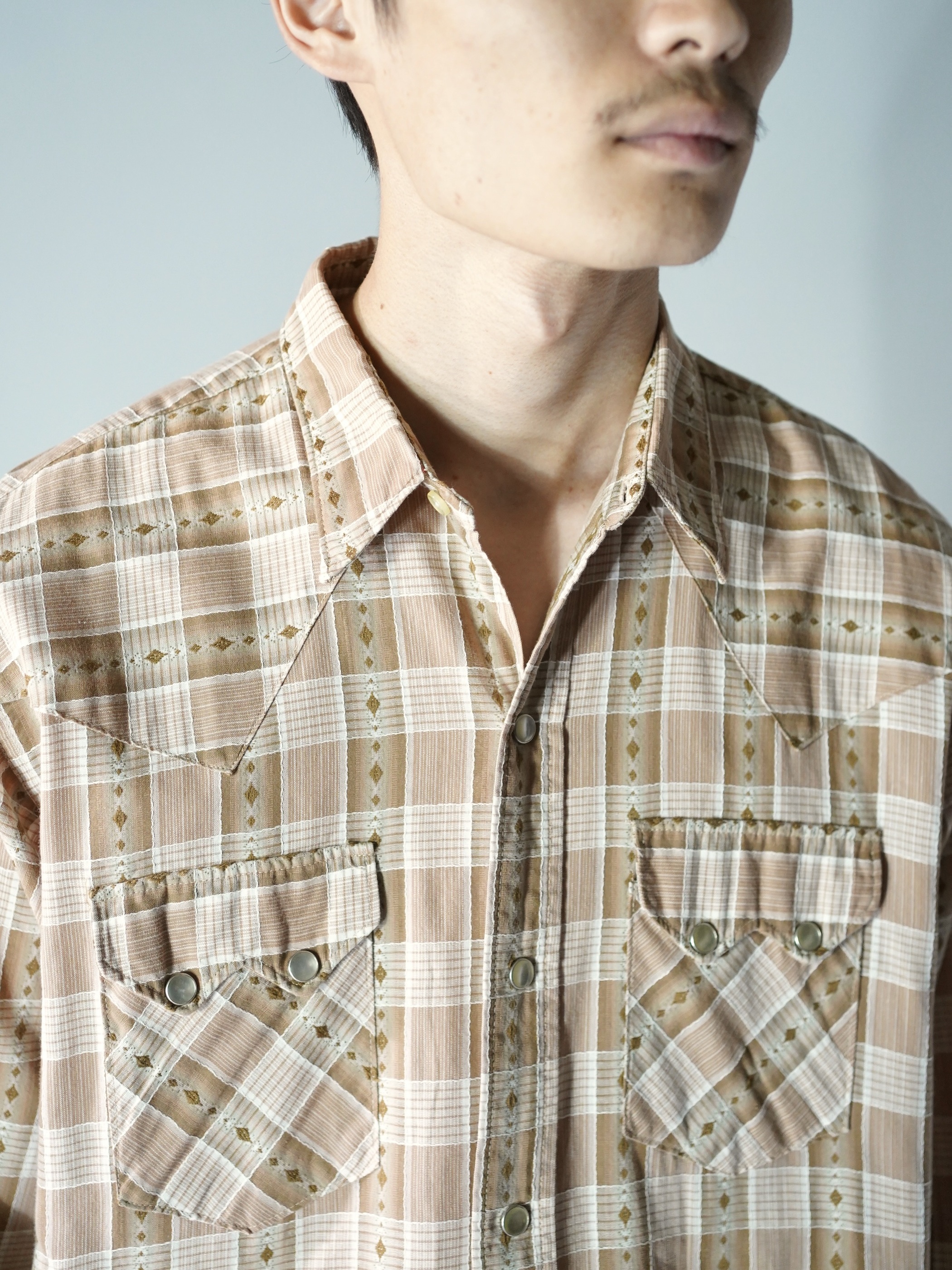 可愛い配色のチェック柄に、ネイティブ調の織り柄を組み合わせたウエスタンシャツ。