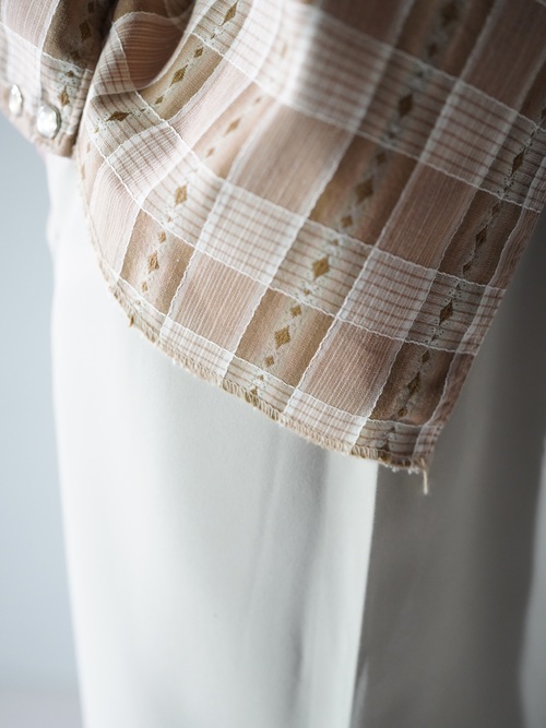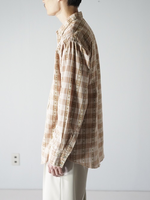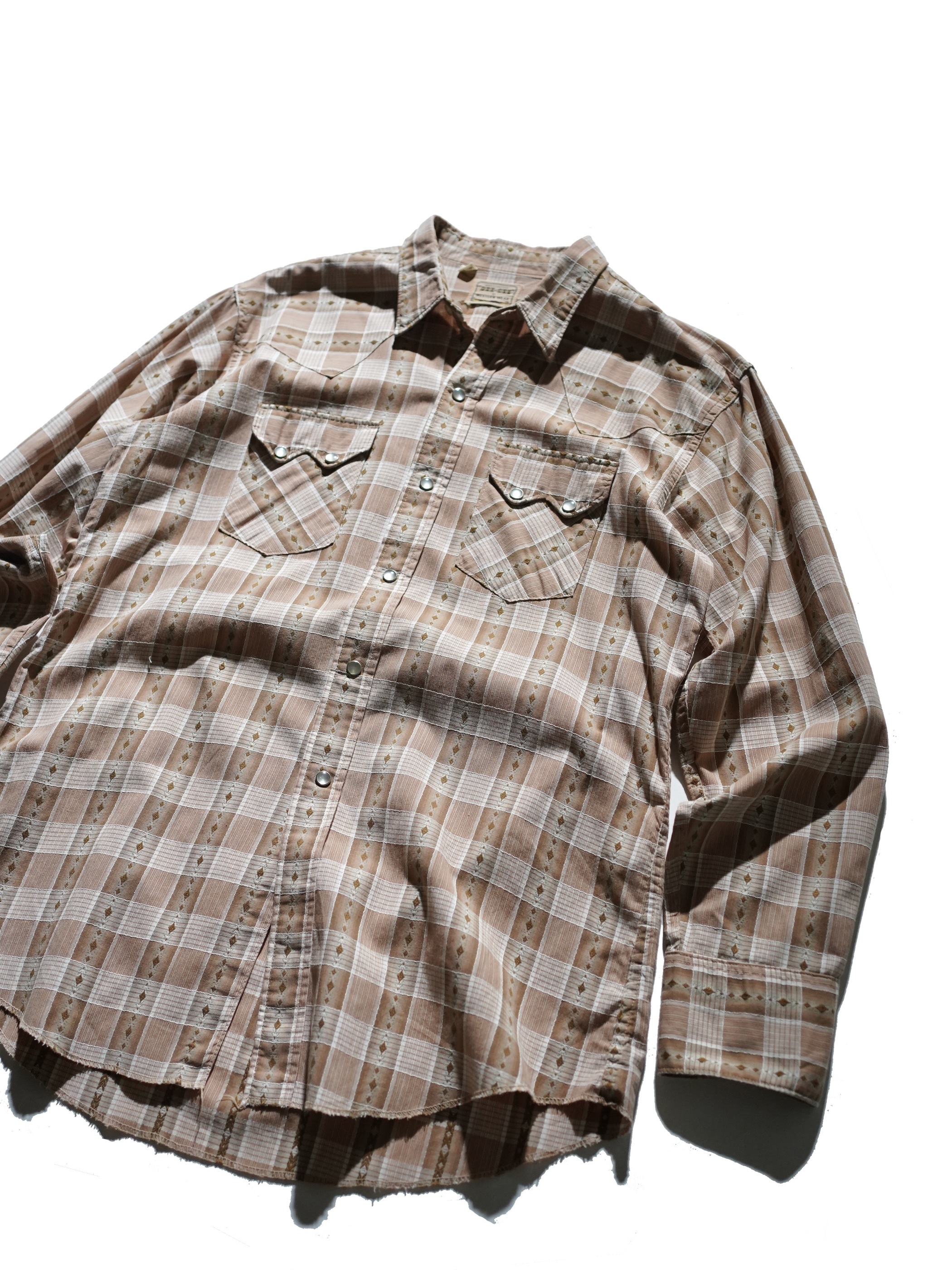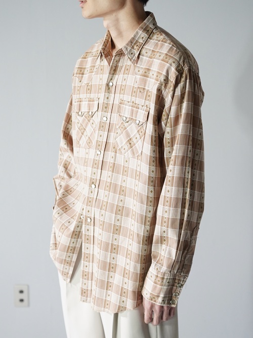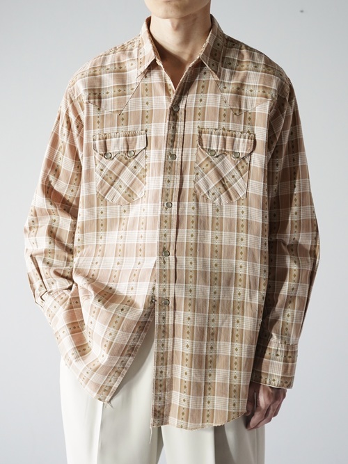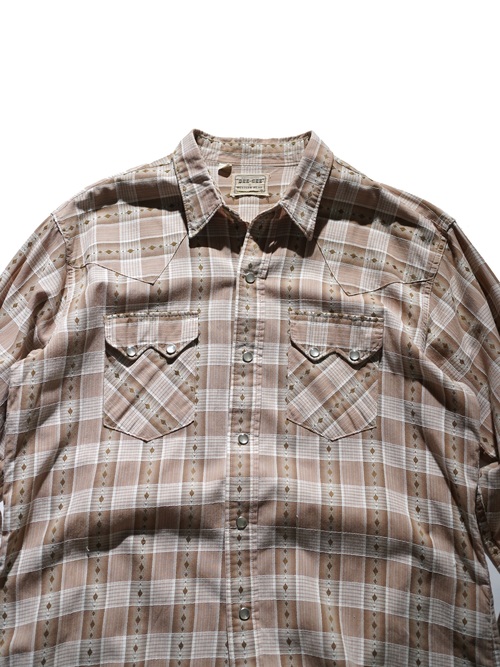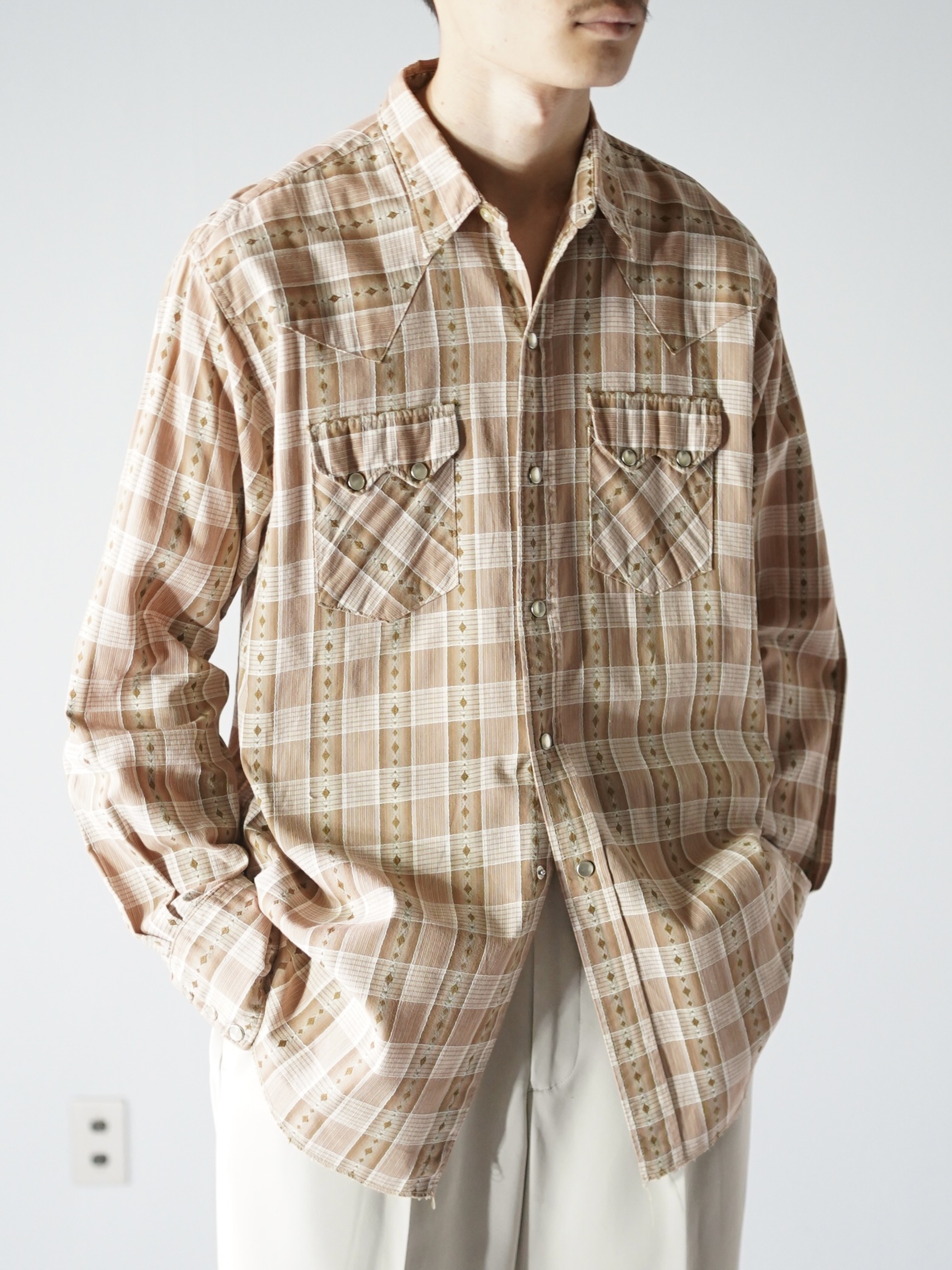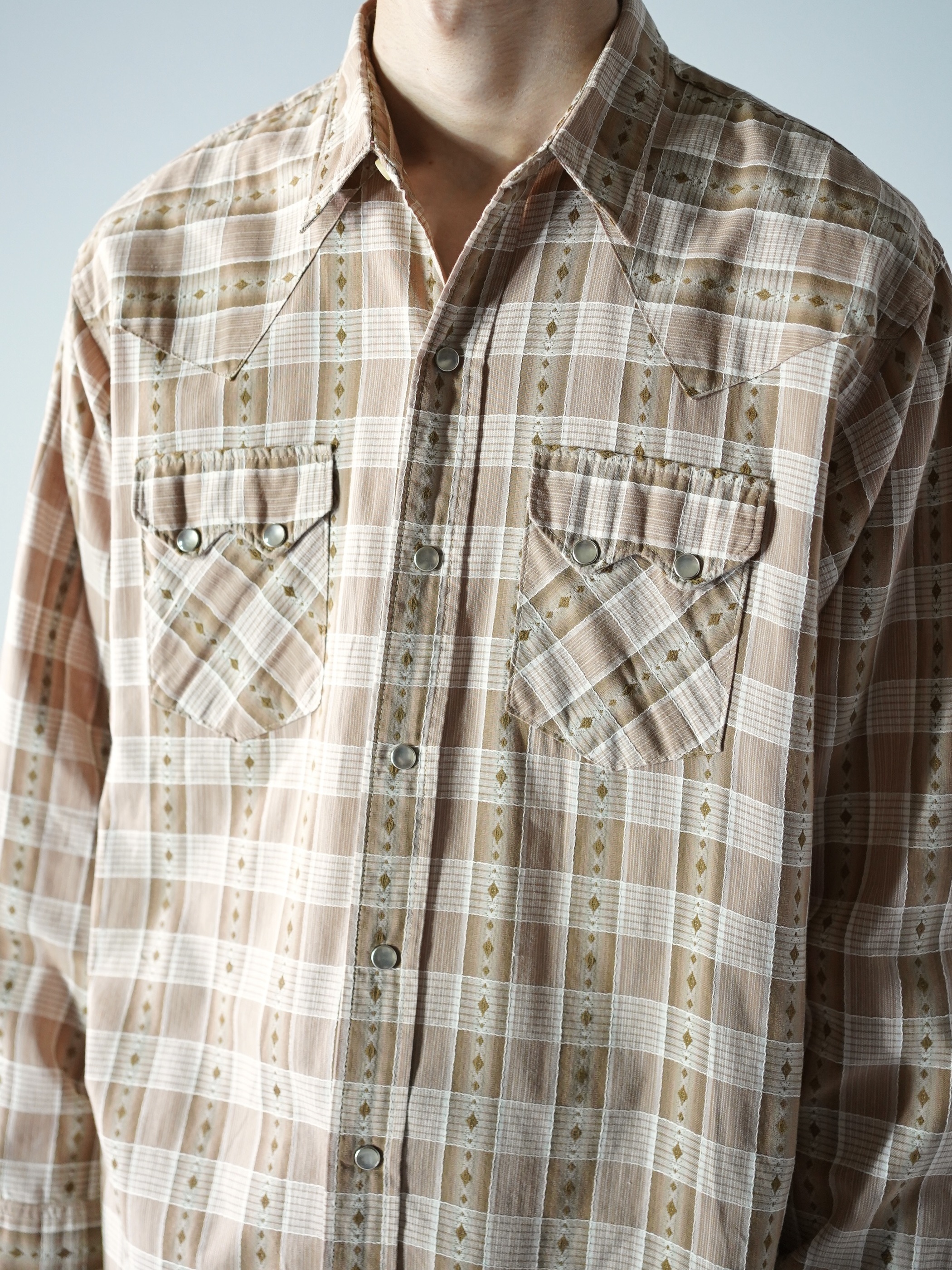 可愛い配色のチェック柄に、ネイティブ調の織り柄を組み合わせたウエスタンシャツ。