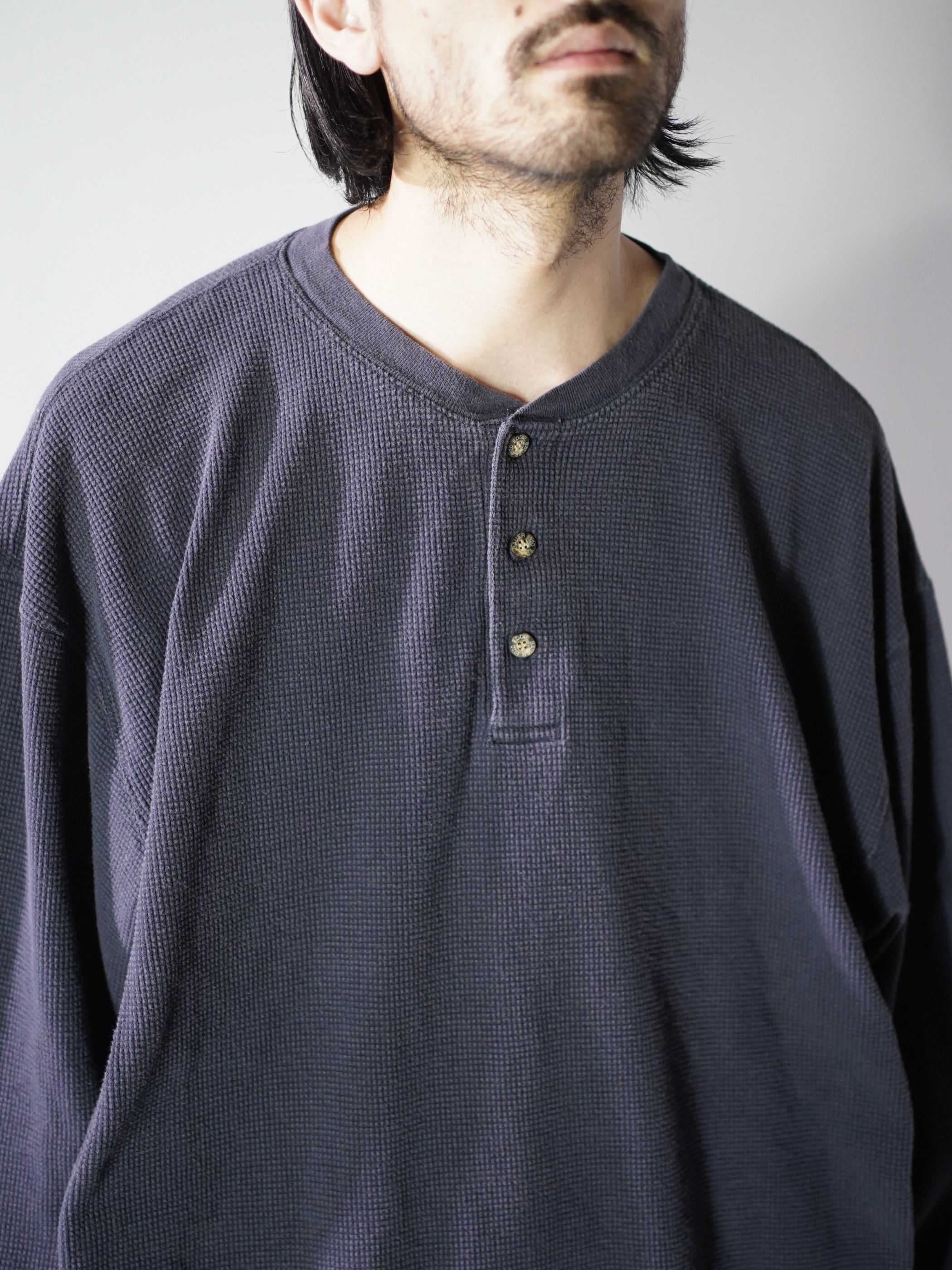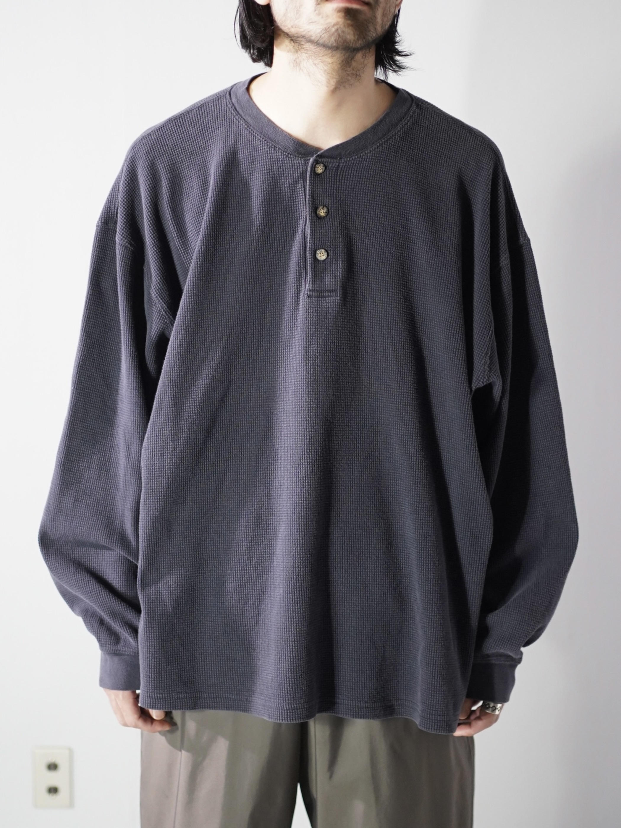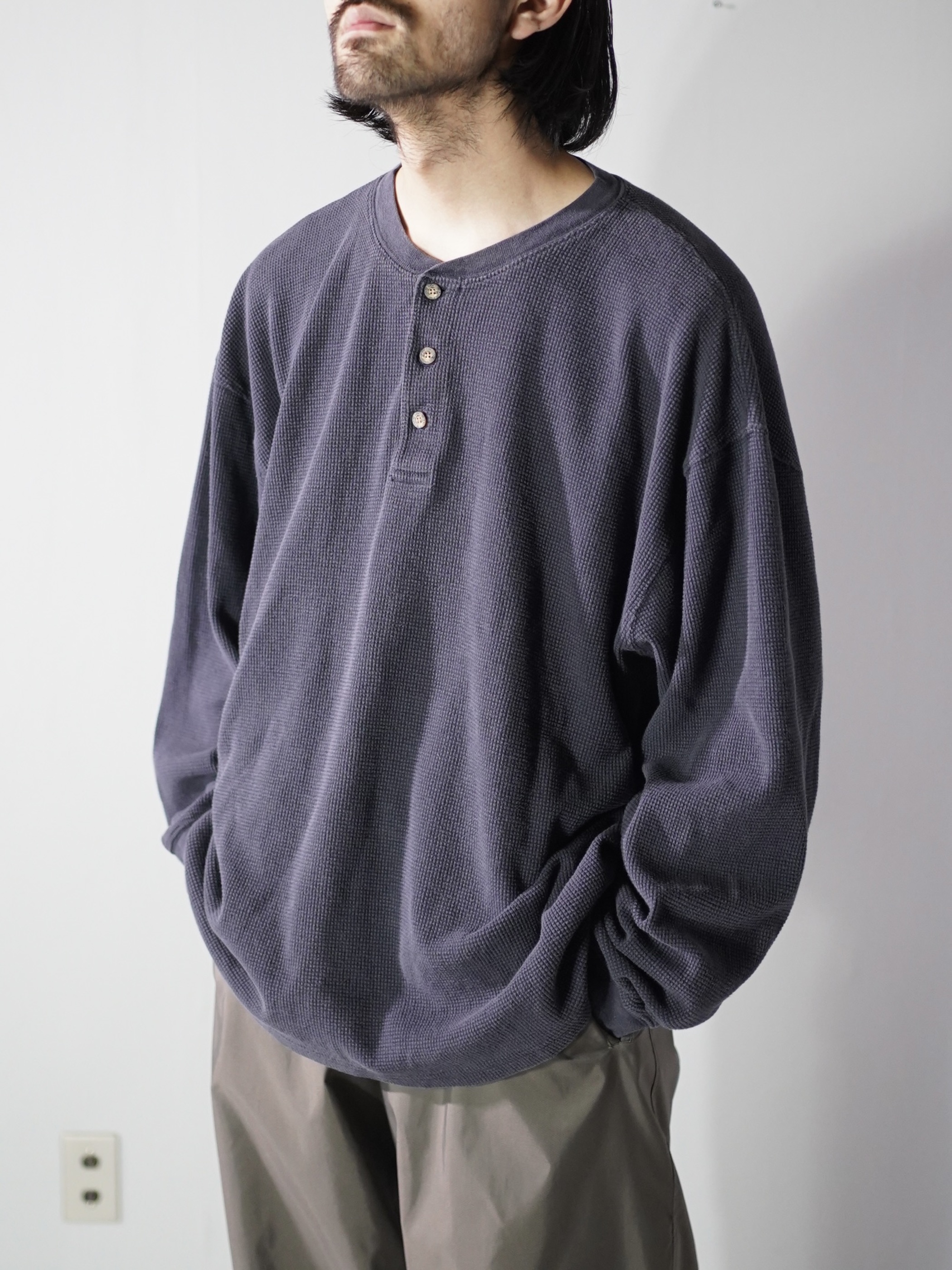 ワイドな身幅に余白のあるアーム幅。サーマル生地ならではの一枚でも成立するシルエットバランス。