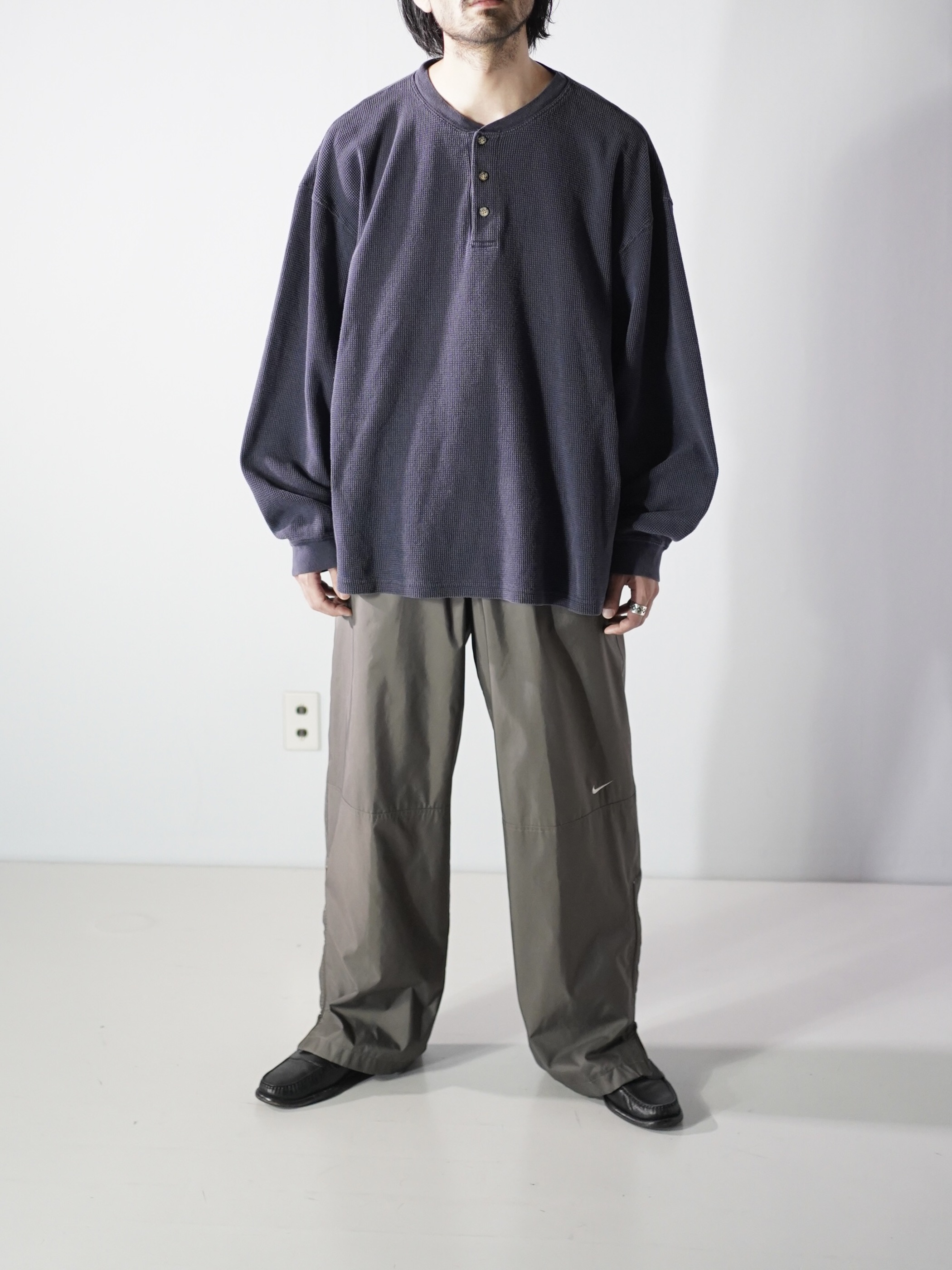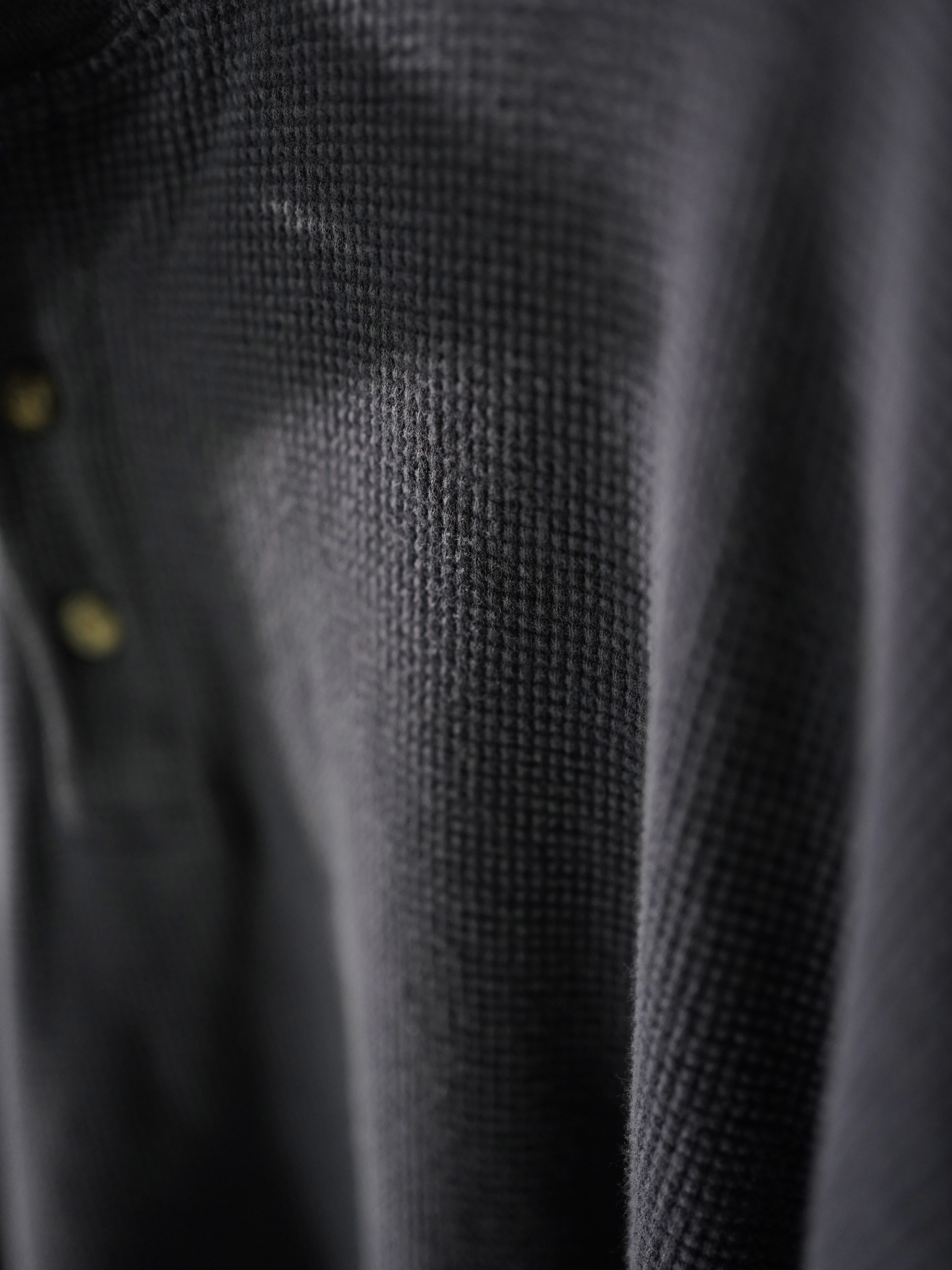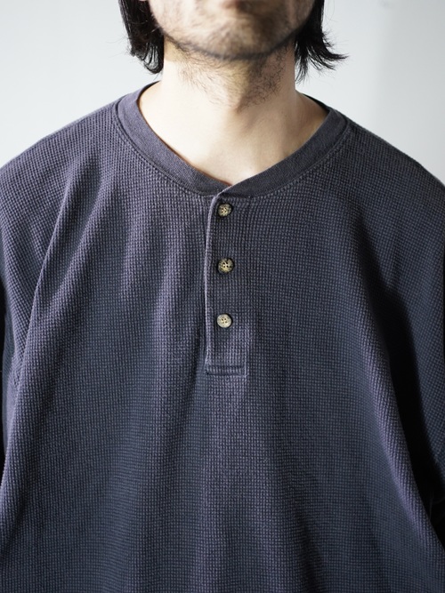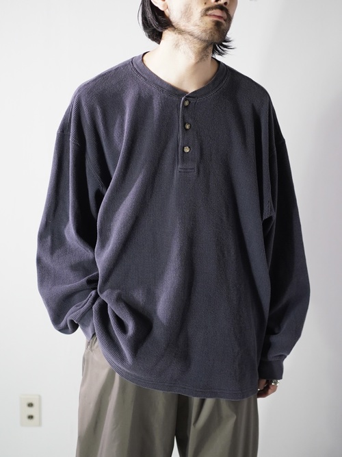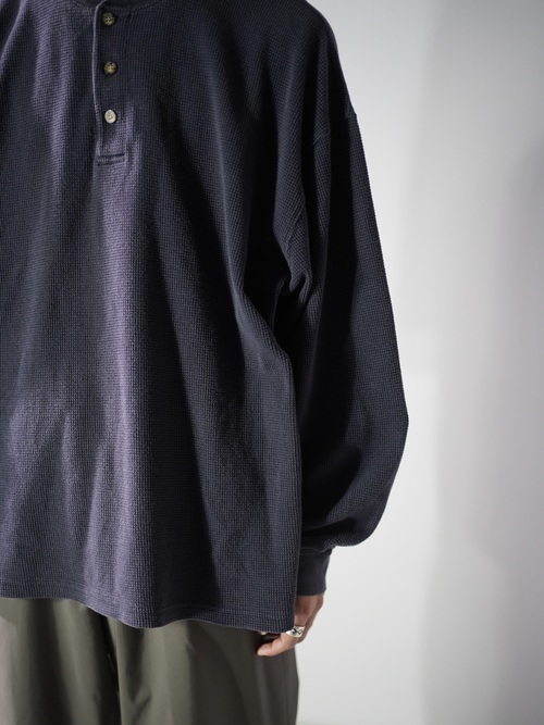 ワイドな身幅に余白のあるアーム幅。サーマル生地ならではの一枚でも成立するシルエットバランス。