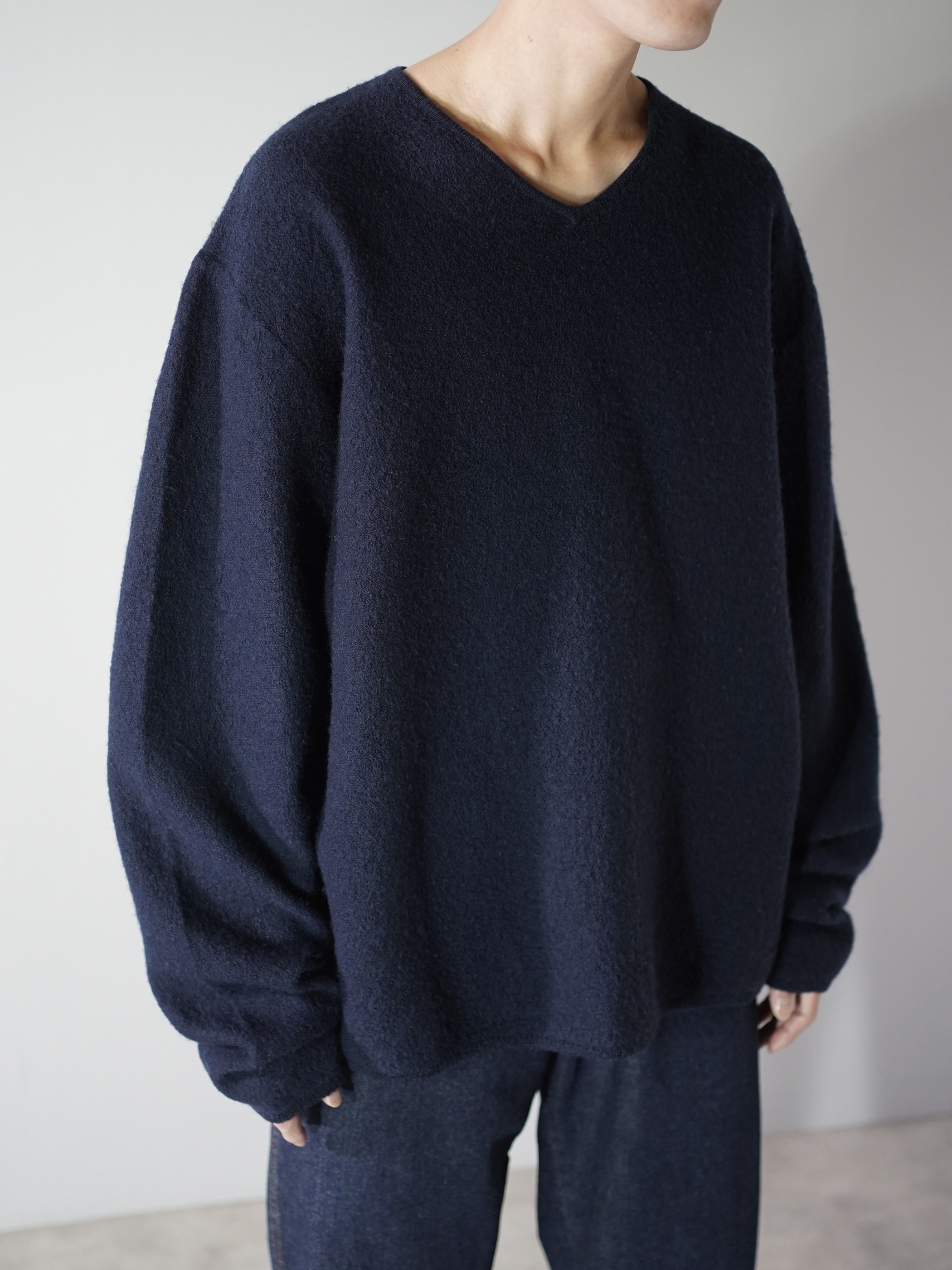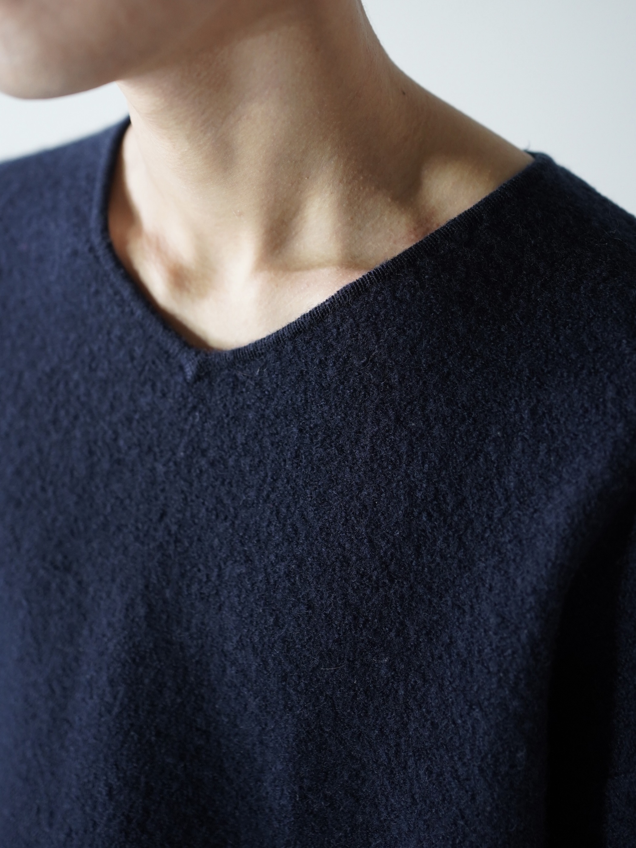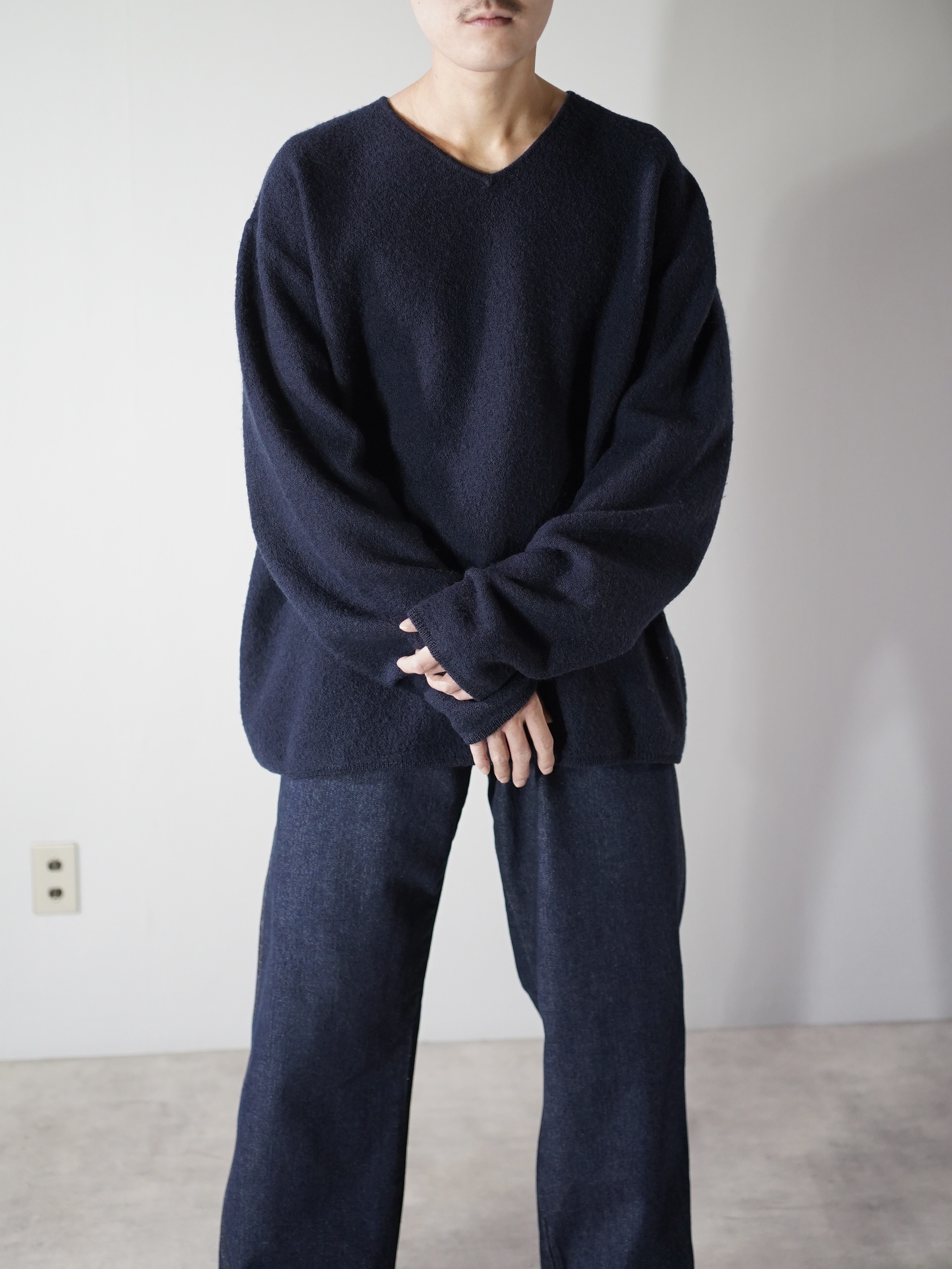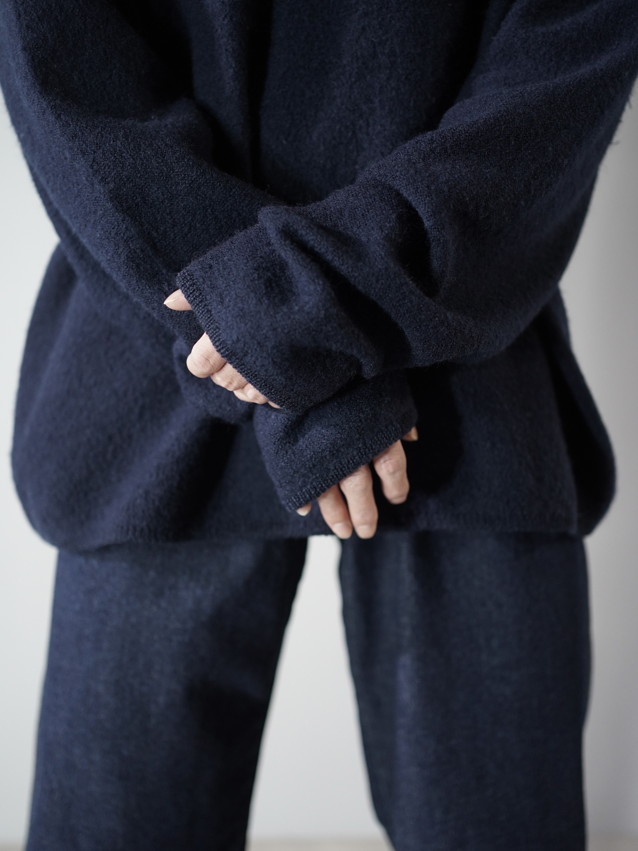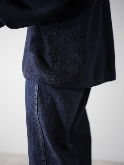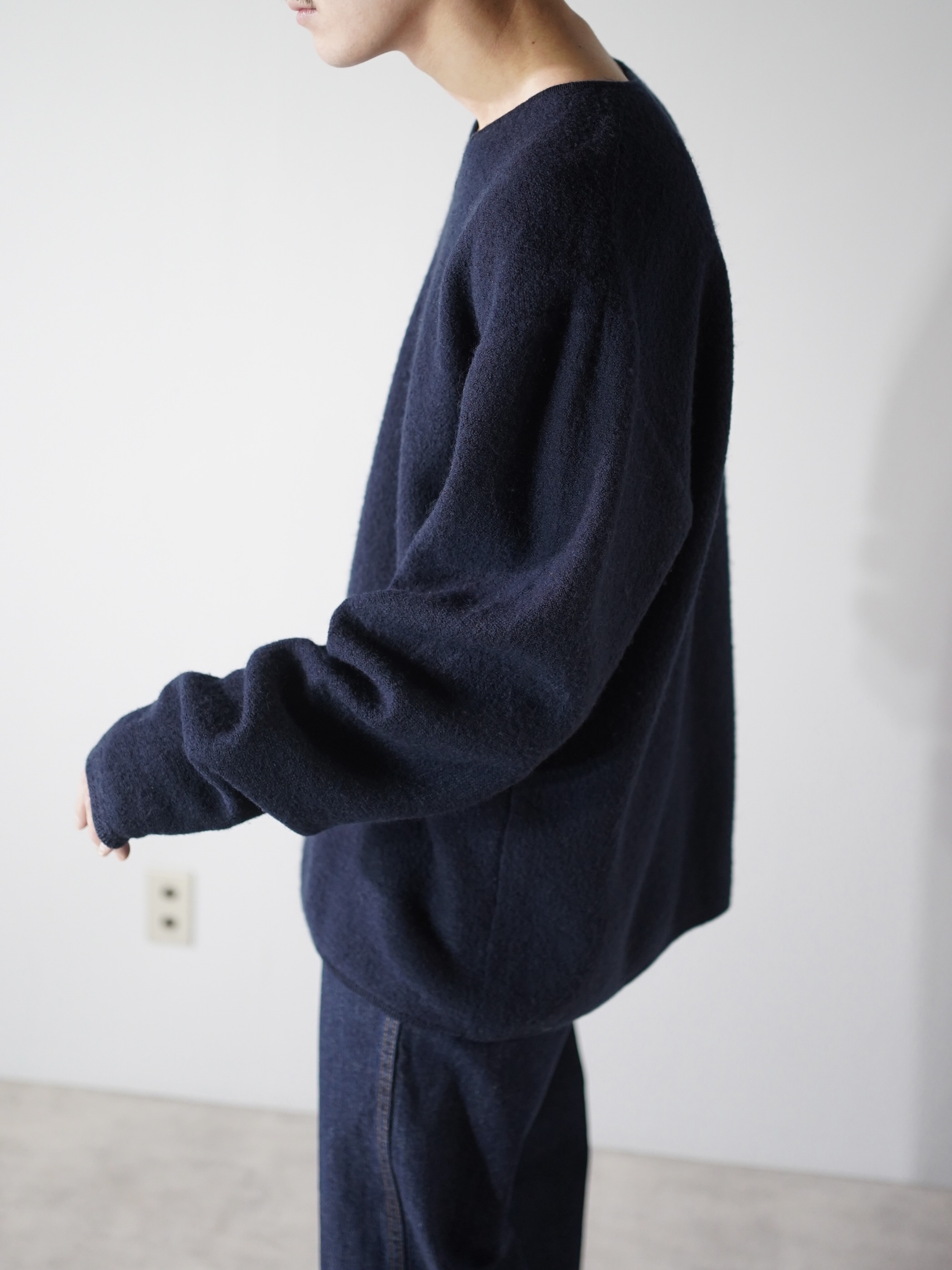 軽く柔らかな質感で、保温性に優れたボイルド生地は優しい肌あたりで、フォルムも相まってゆったりとした抜けを感じる濃紺セーターです。