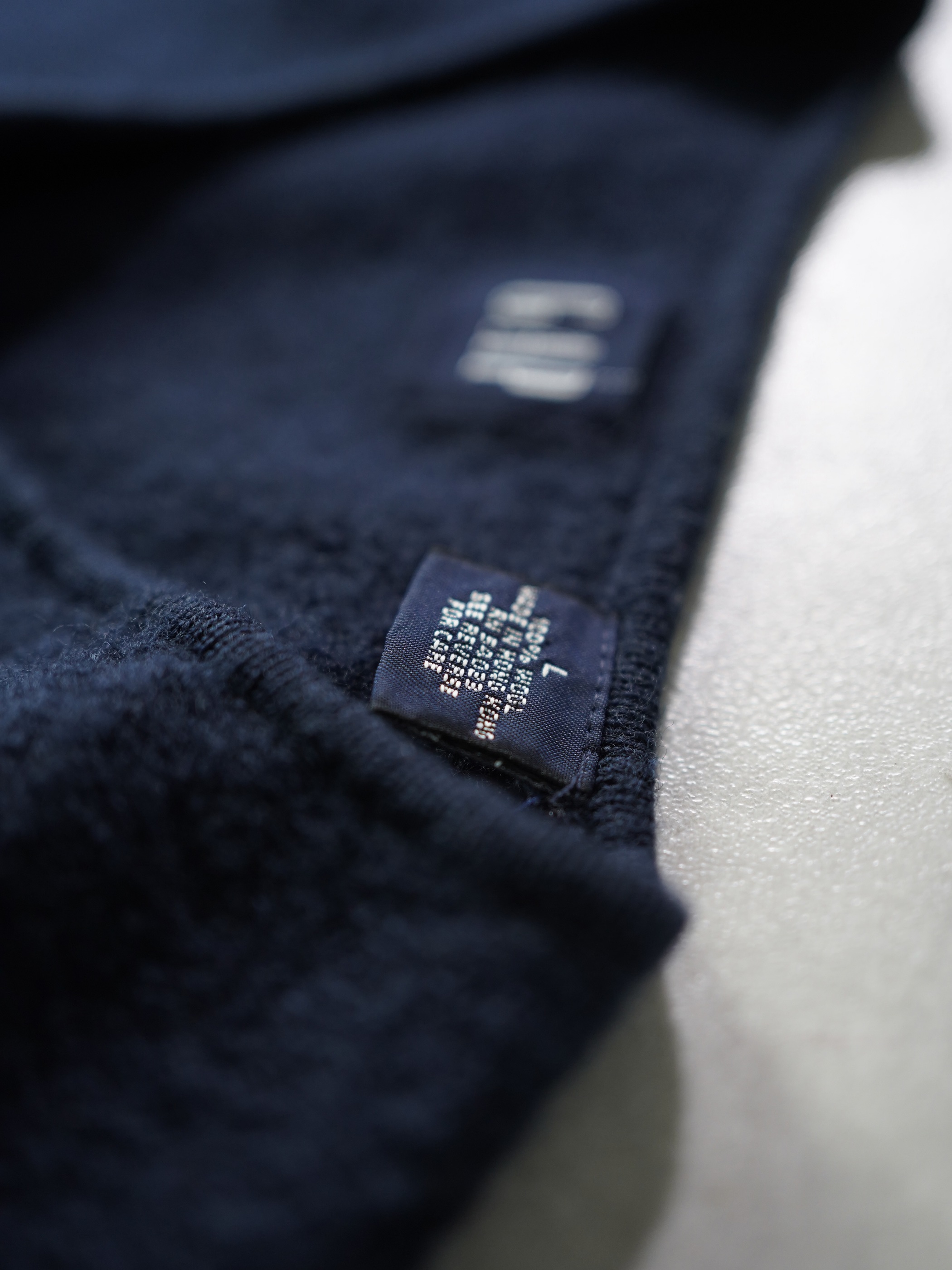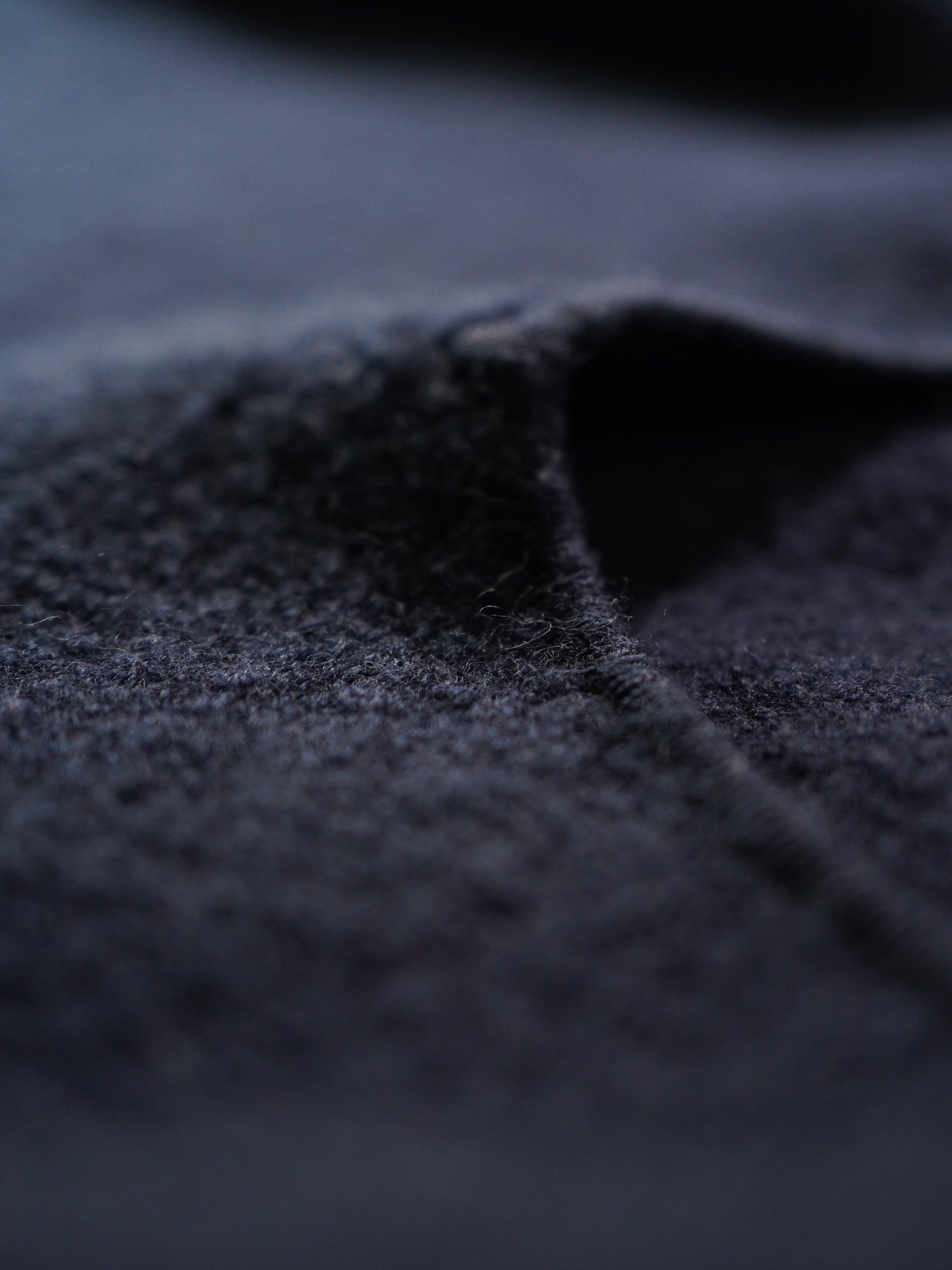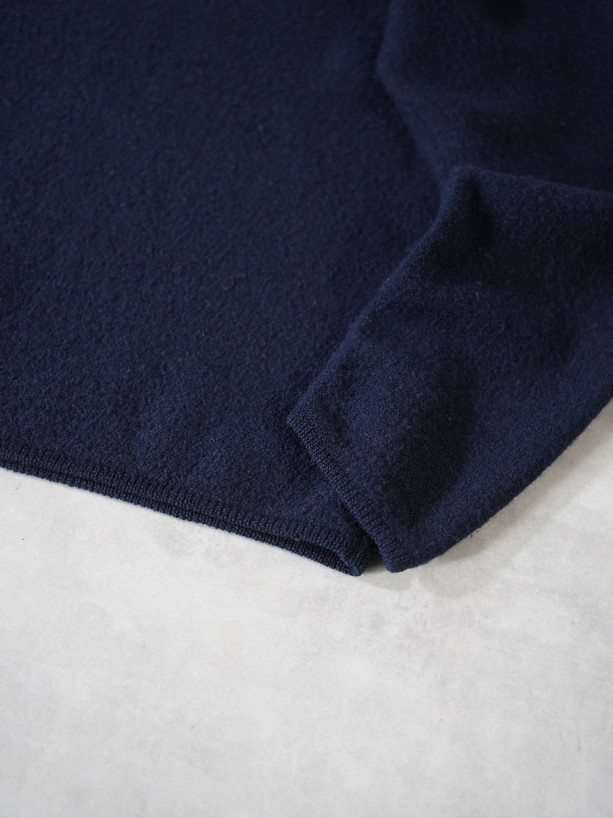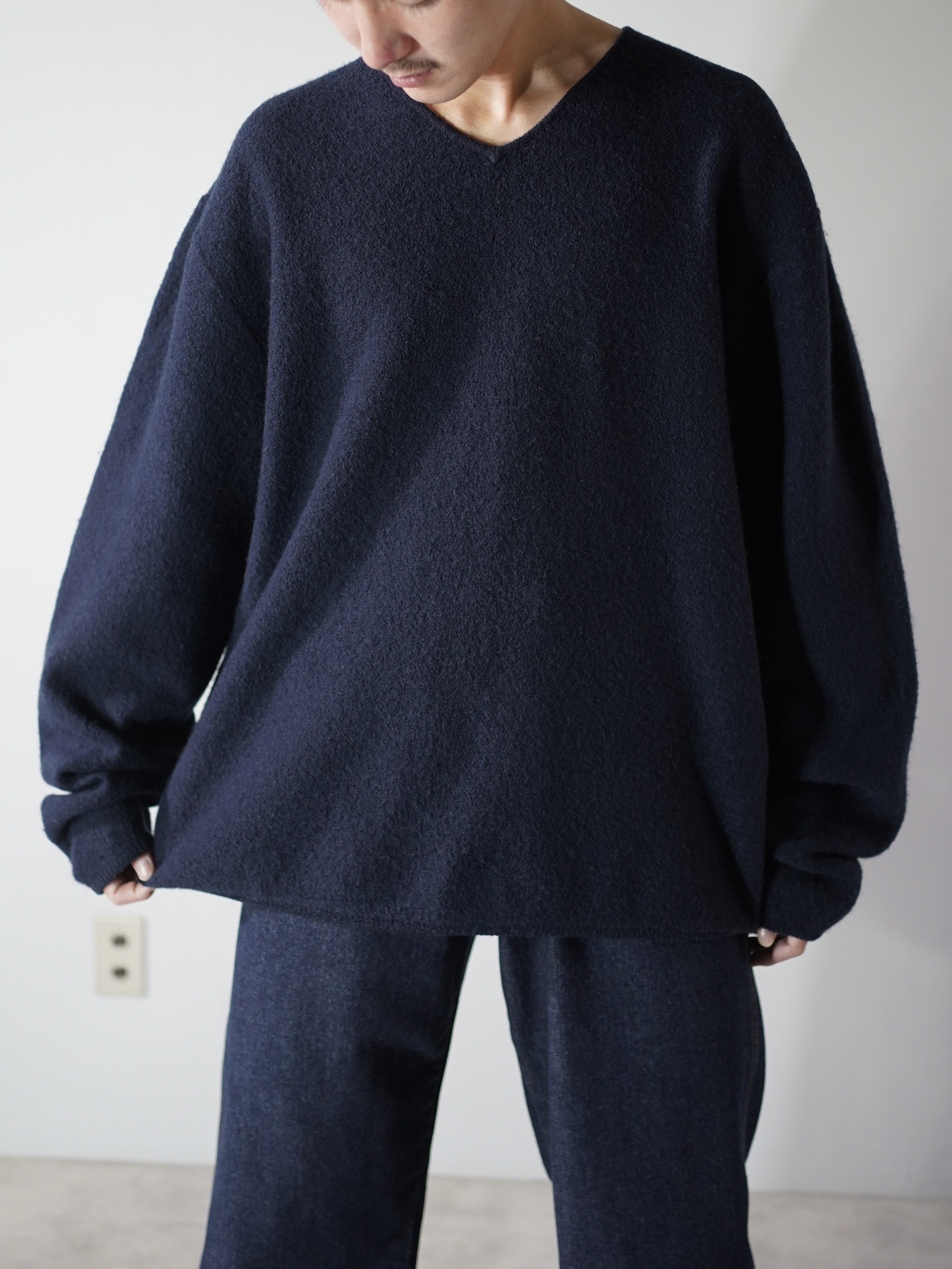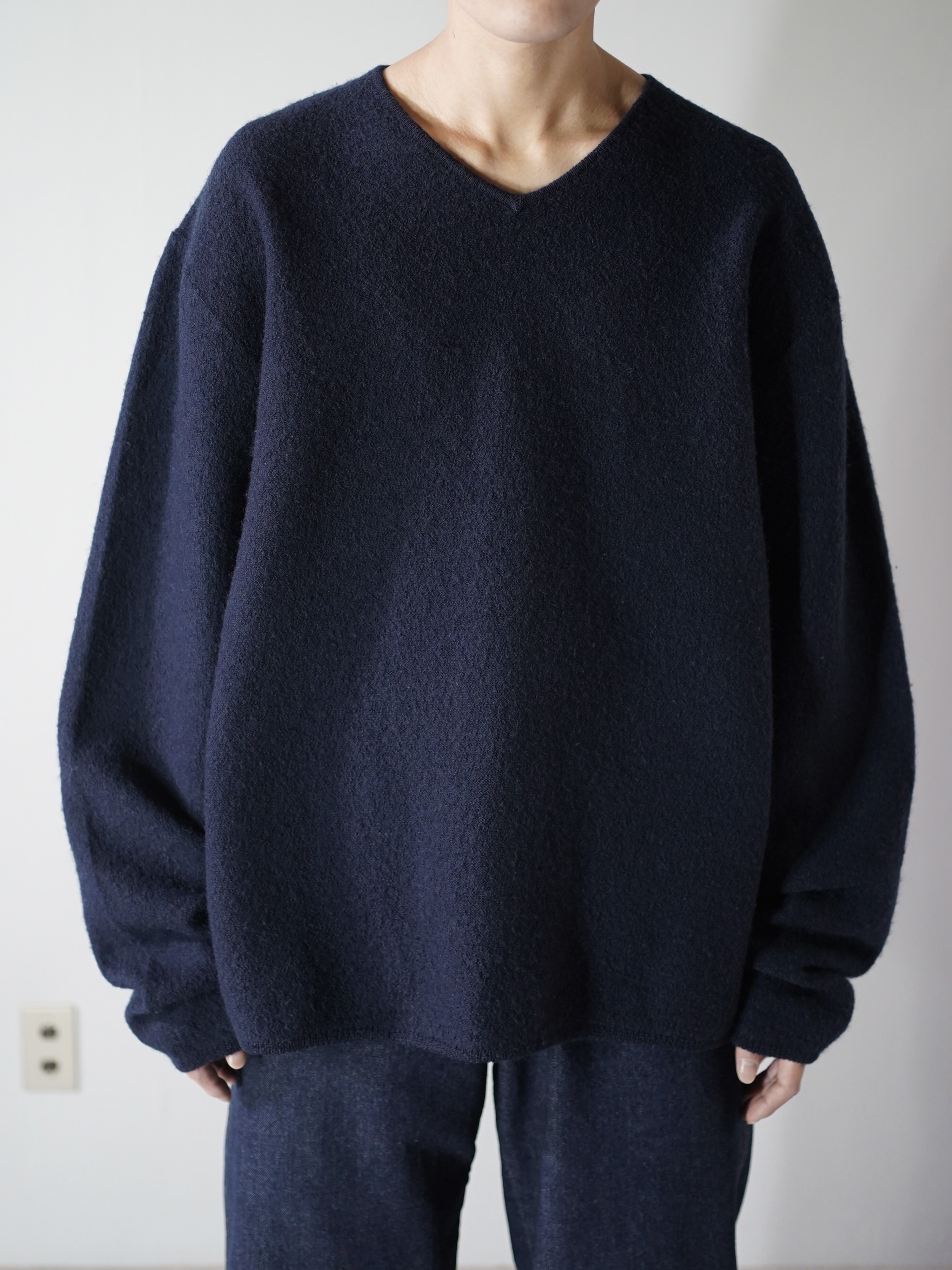 軽く柔らかな質感で、保温性に優れたボイルド生地は優しい肌あたりで、フォルムも相まってゆったりとした抜けを感じる濃紺セーターです。