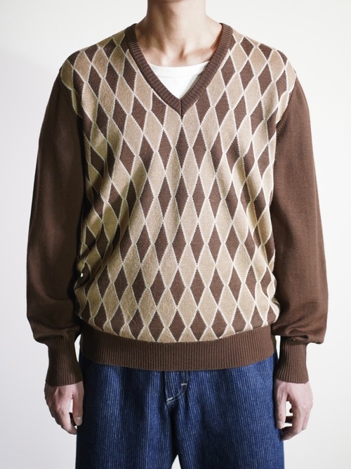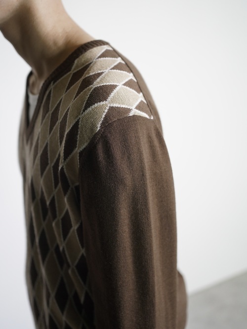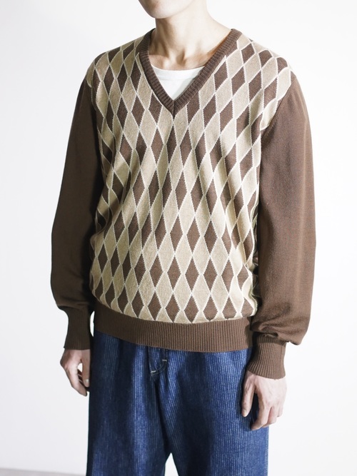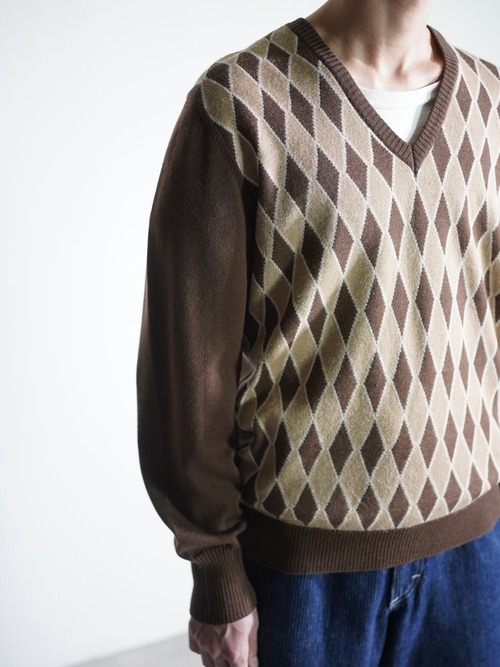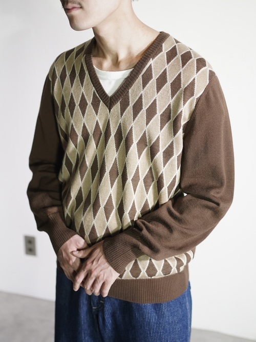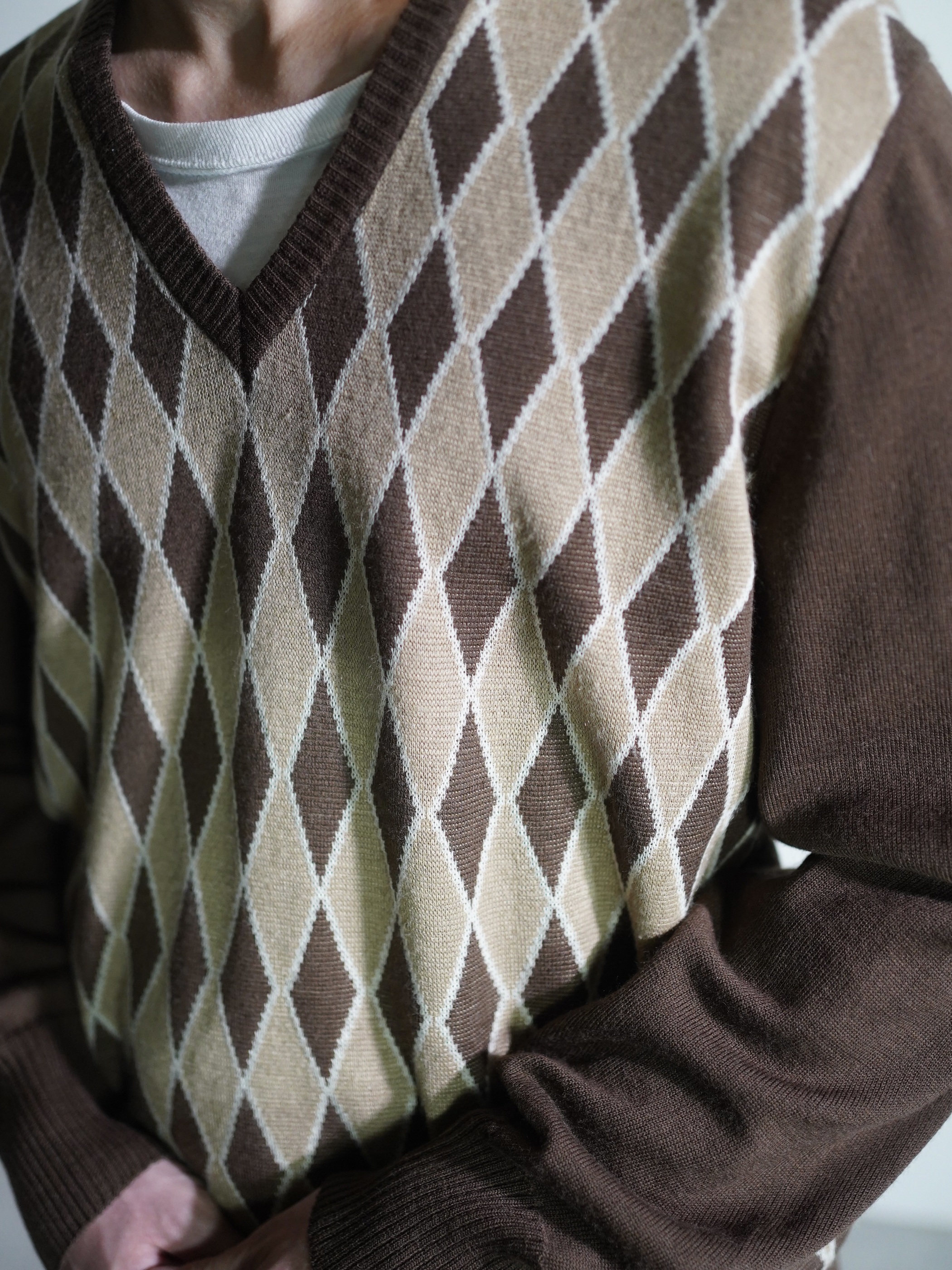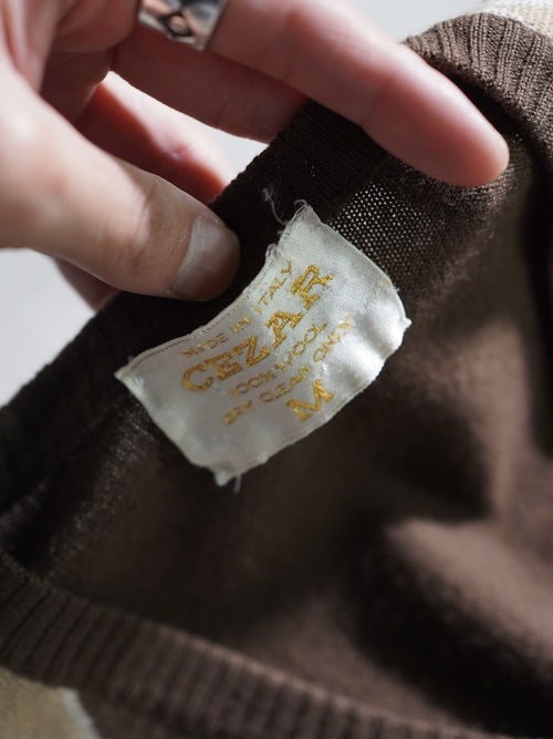 1980's CEZAR argyle pattern wool V-neck knit sweater/Made in Italy