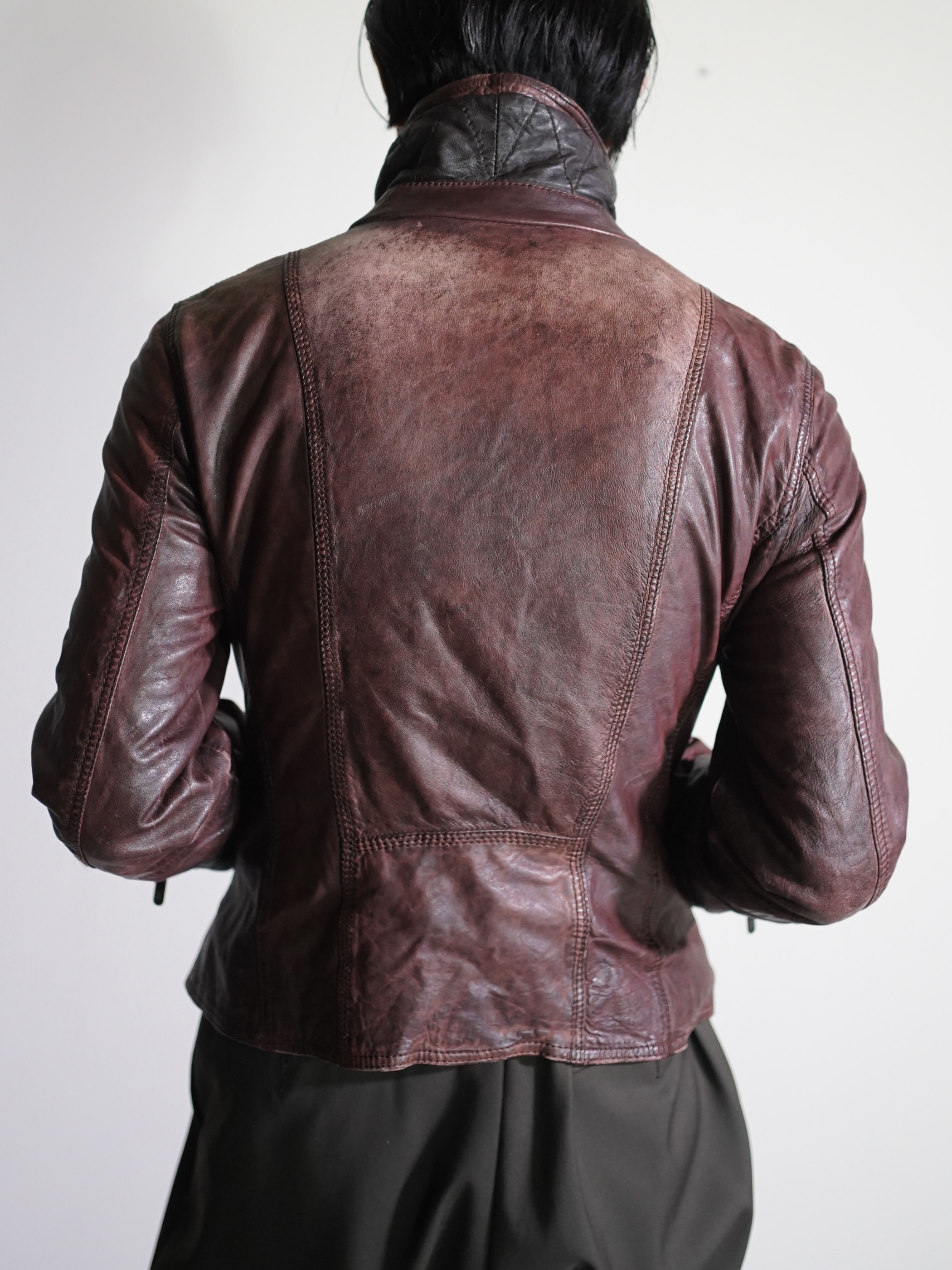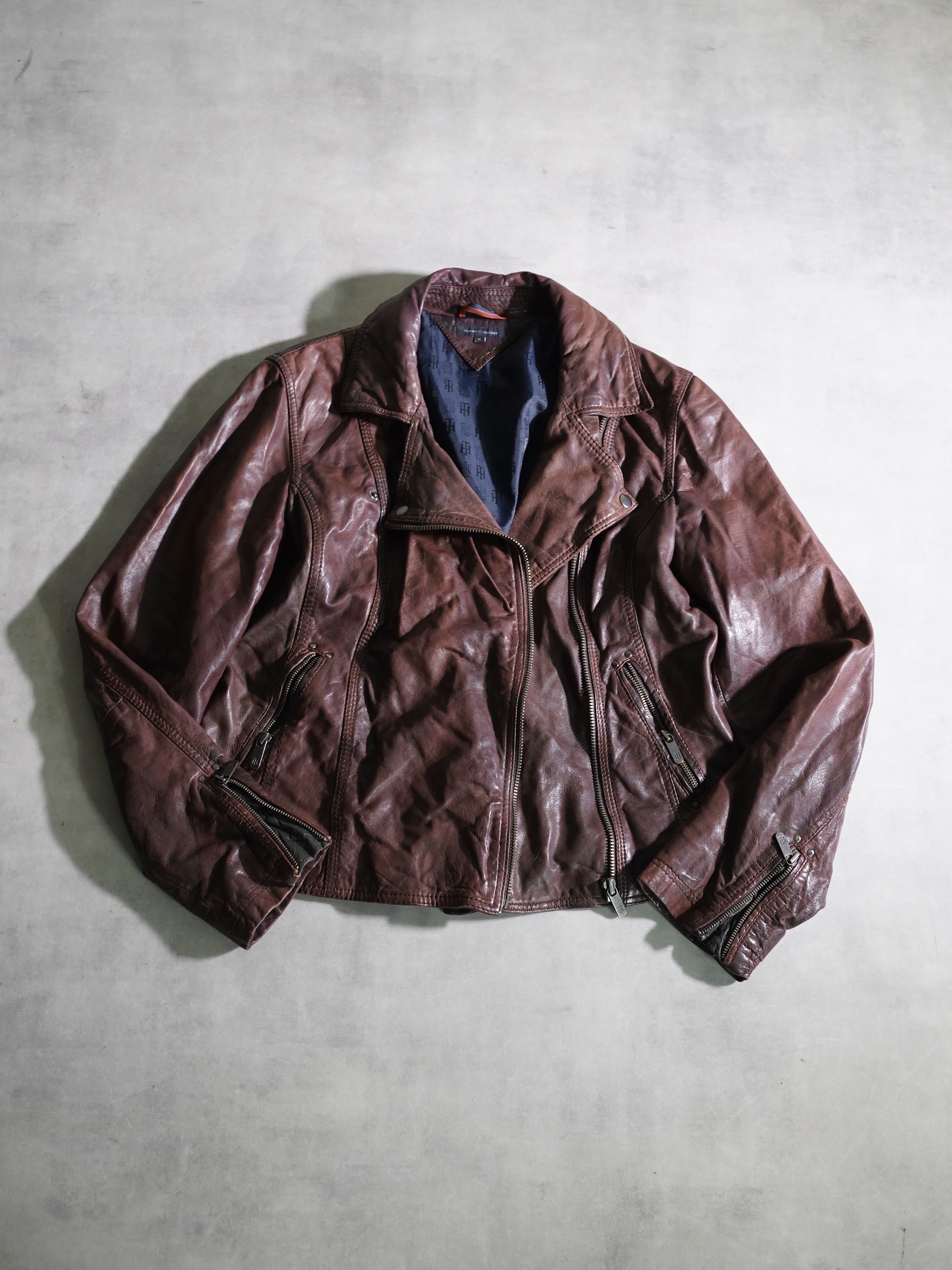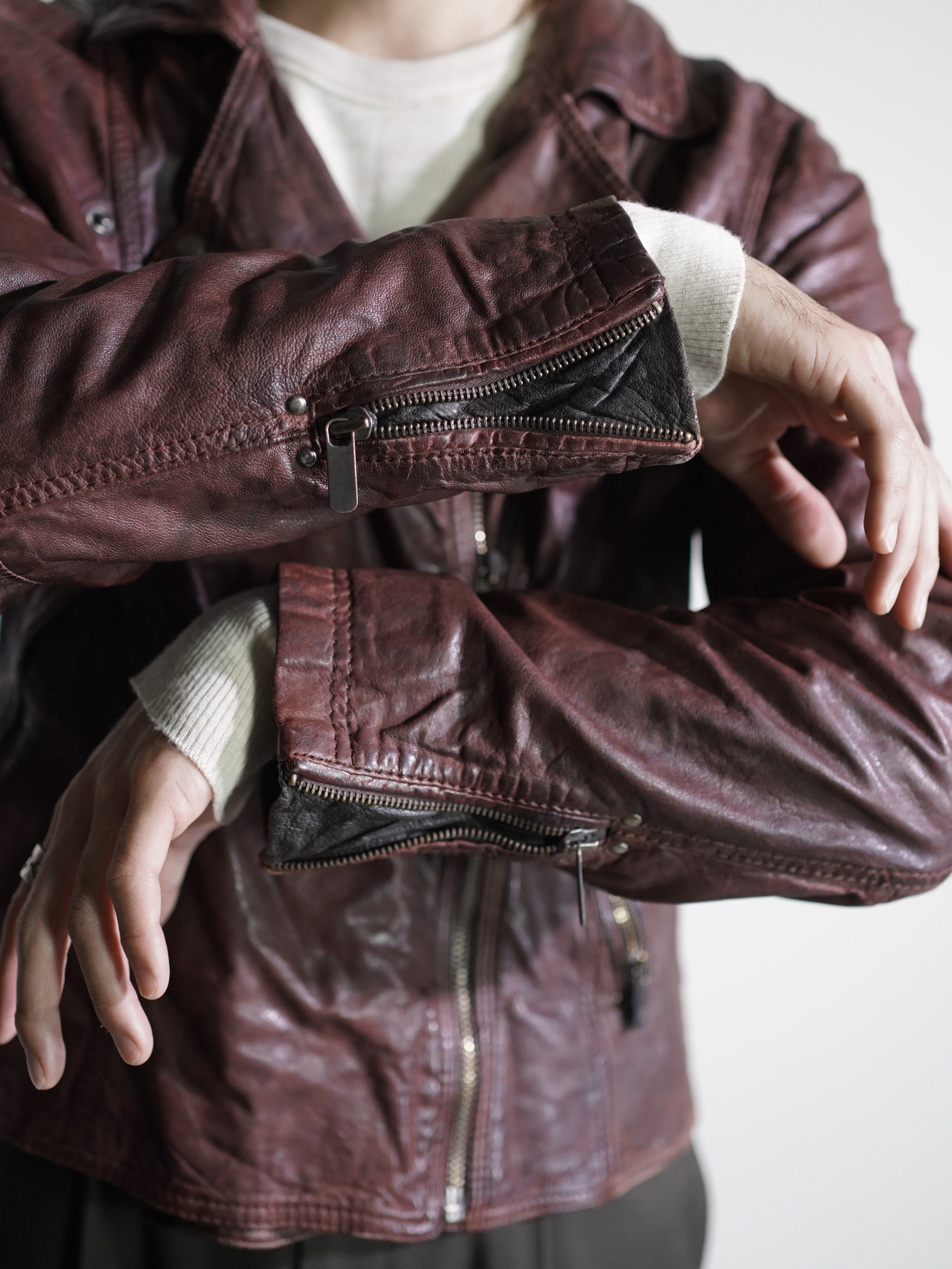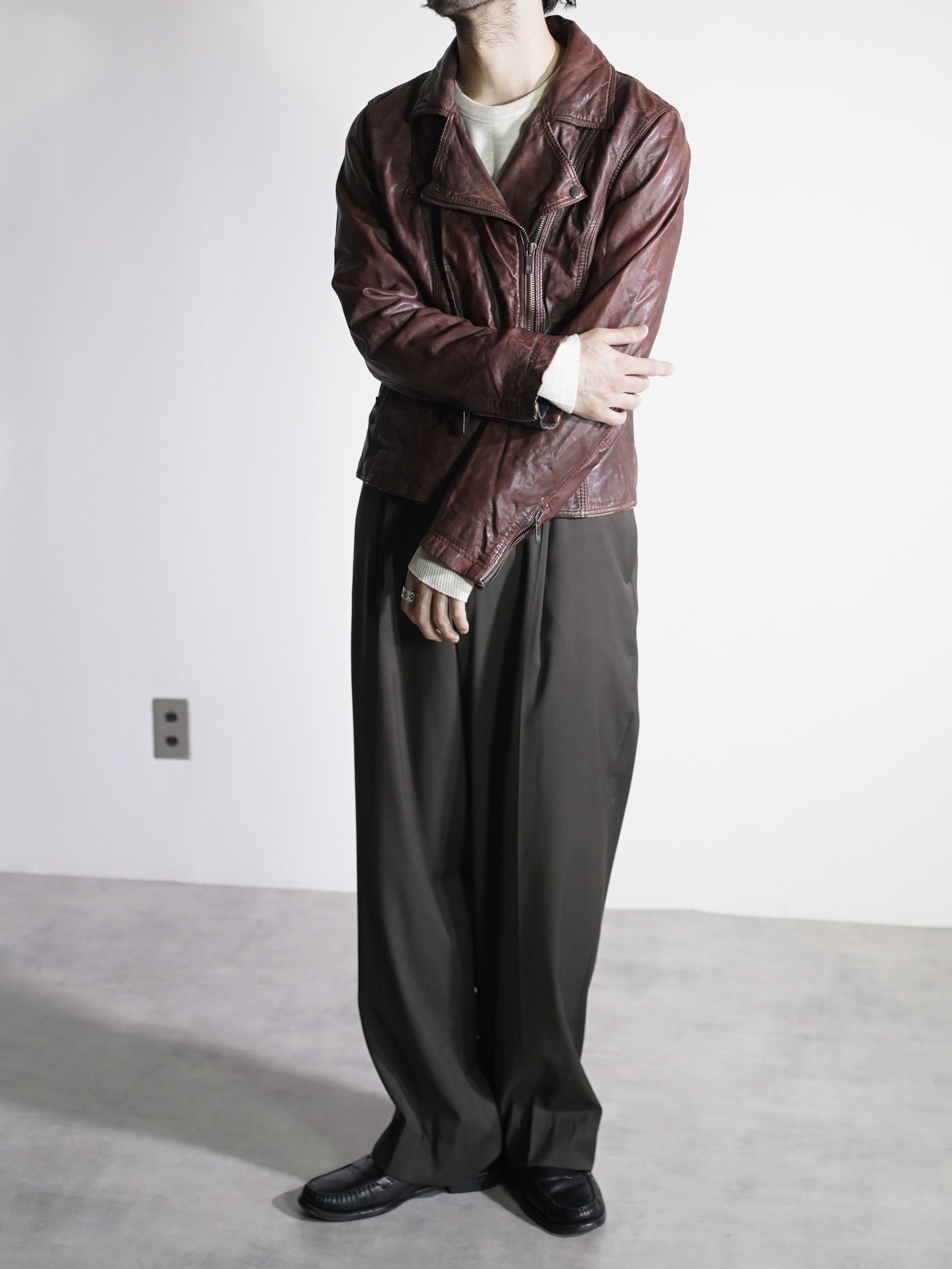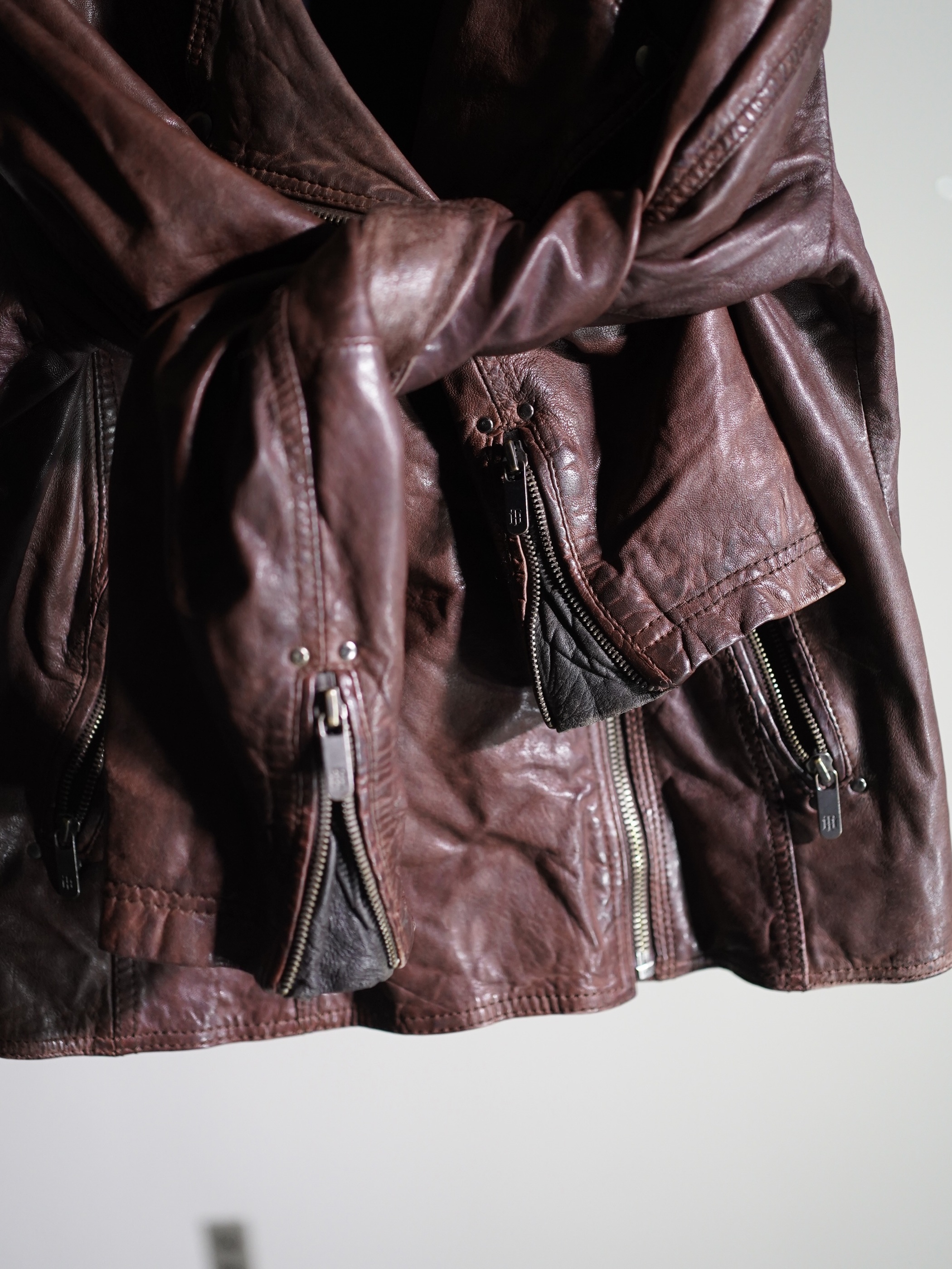 タイトなライダース着てる人はいないかもですが、この柔らかく、でもハリのある革の質感と、エッジの効いた色。