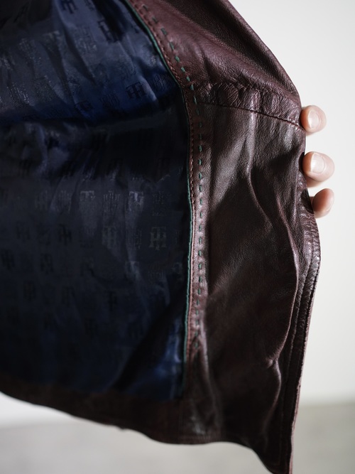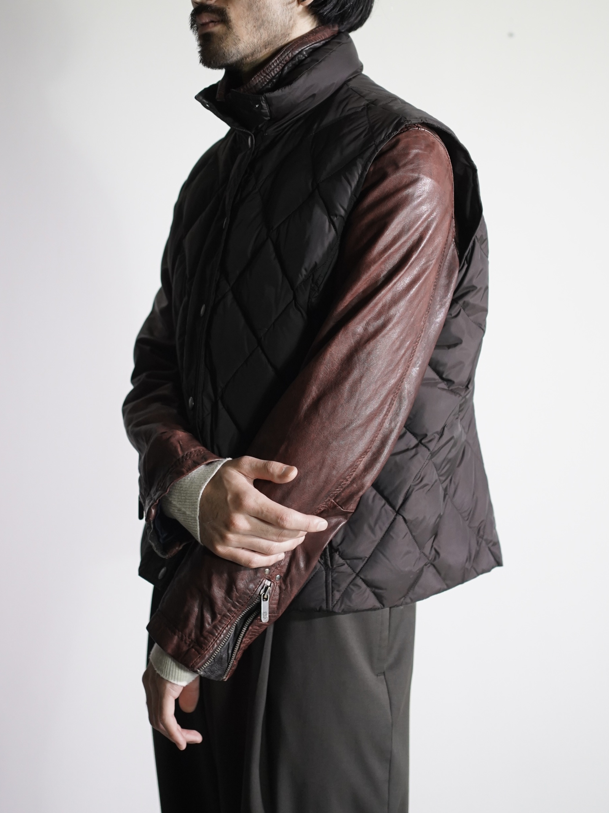 地味に袖ファスナーのマチ/襟裏のキルトステッチ部分が焦げ茶レザー。