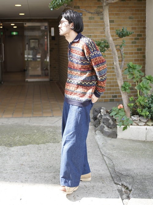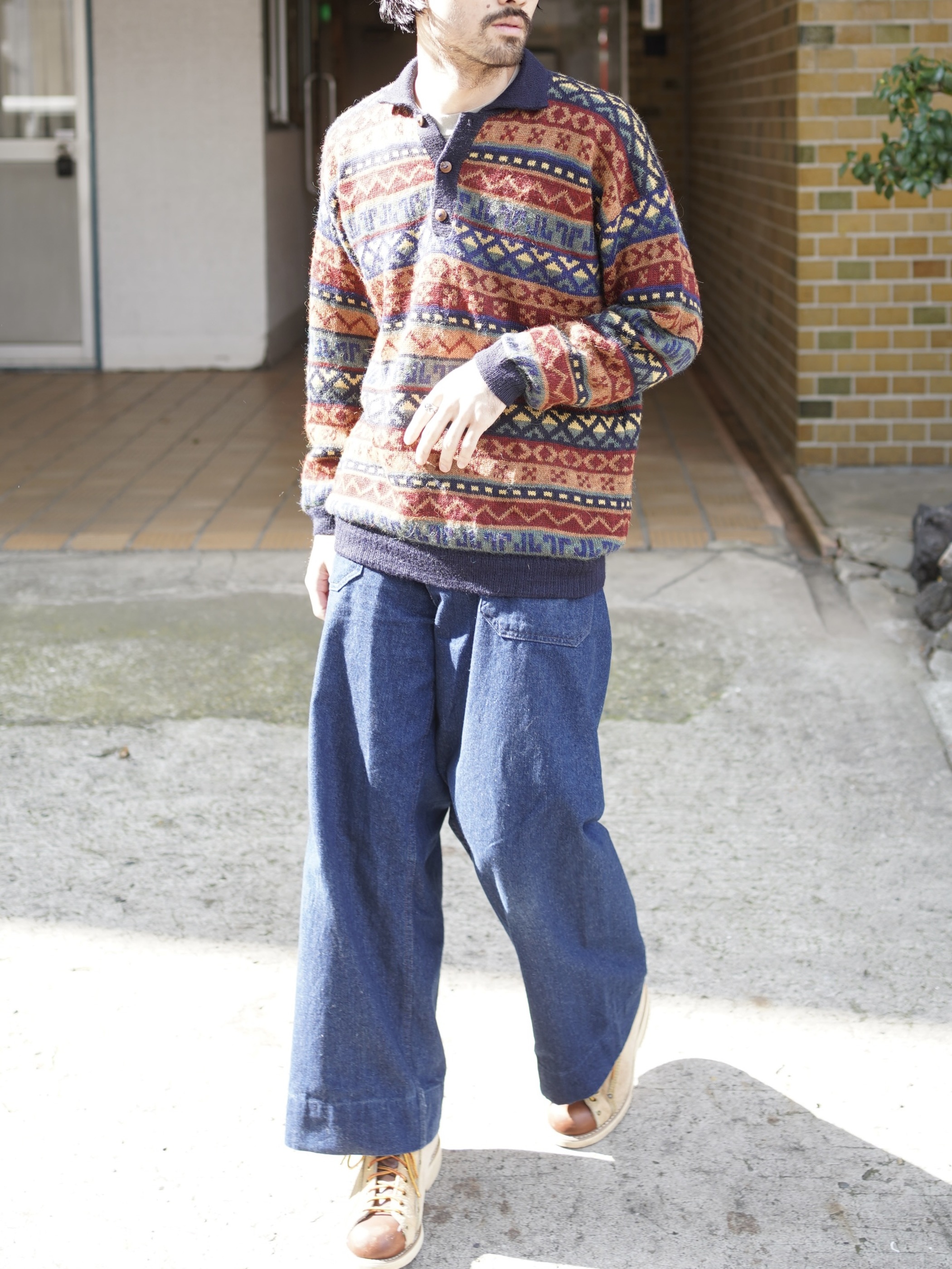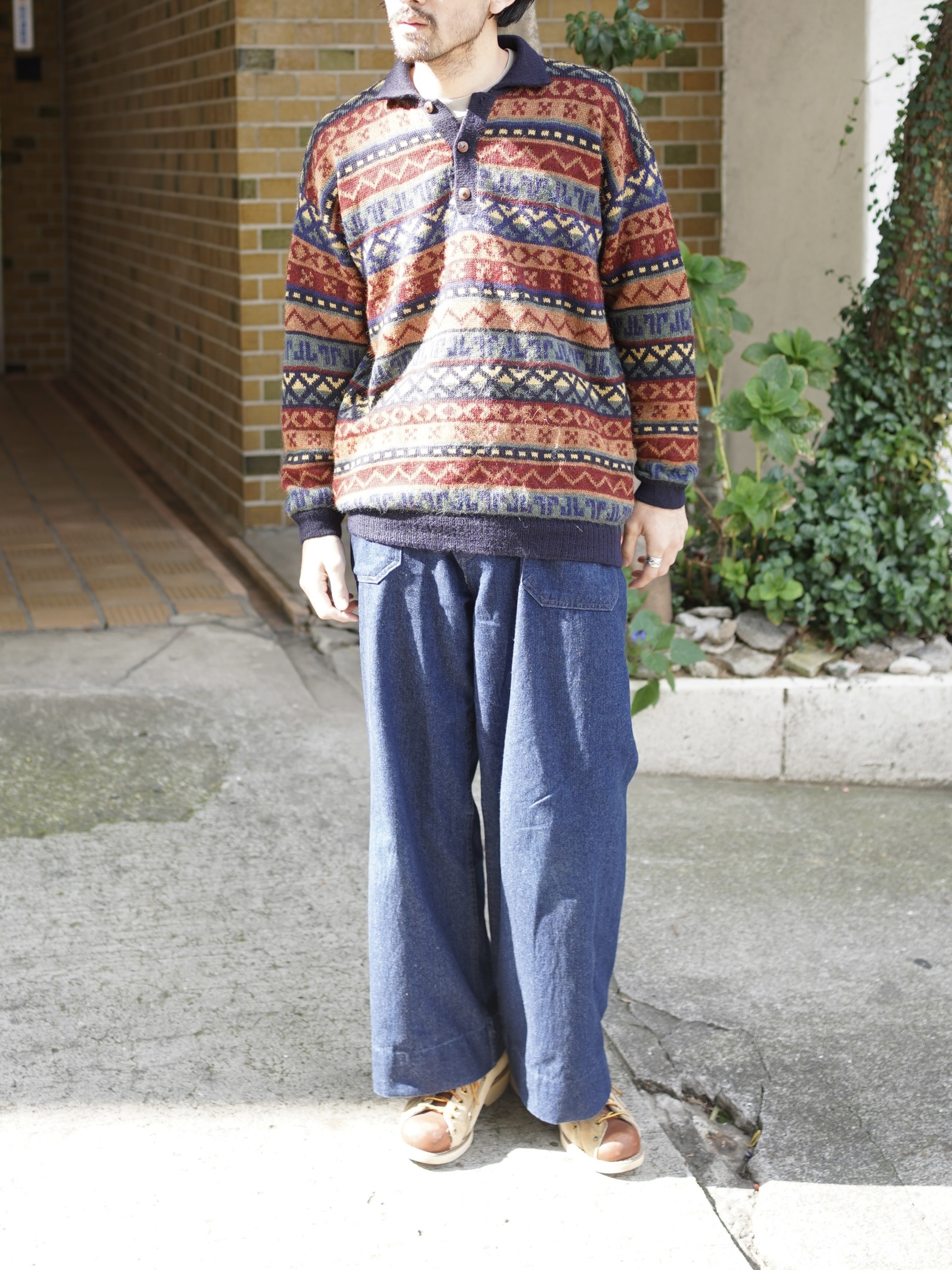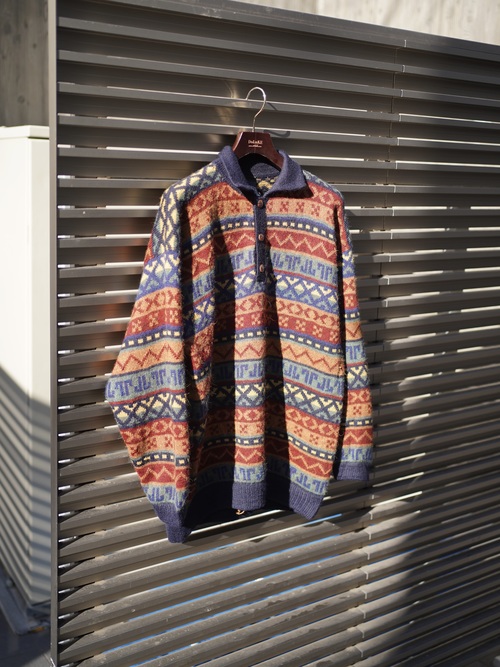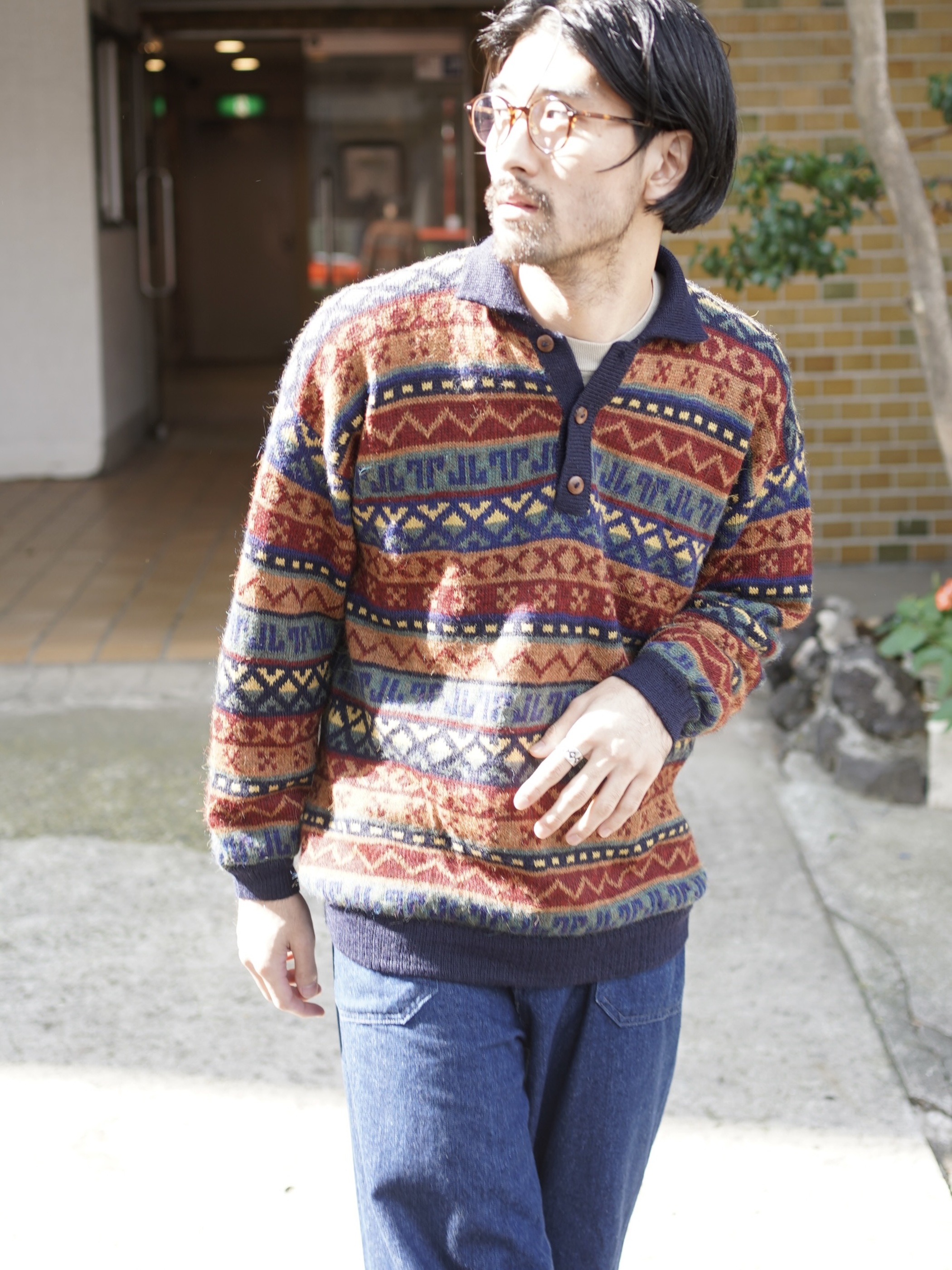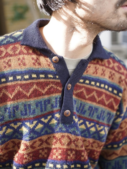 ・1990's AMAUTA Alpaca 100% native pattern border knit polo shirt