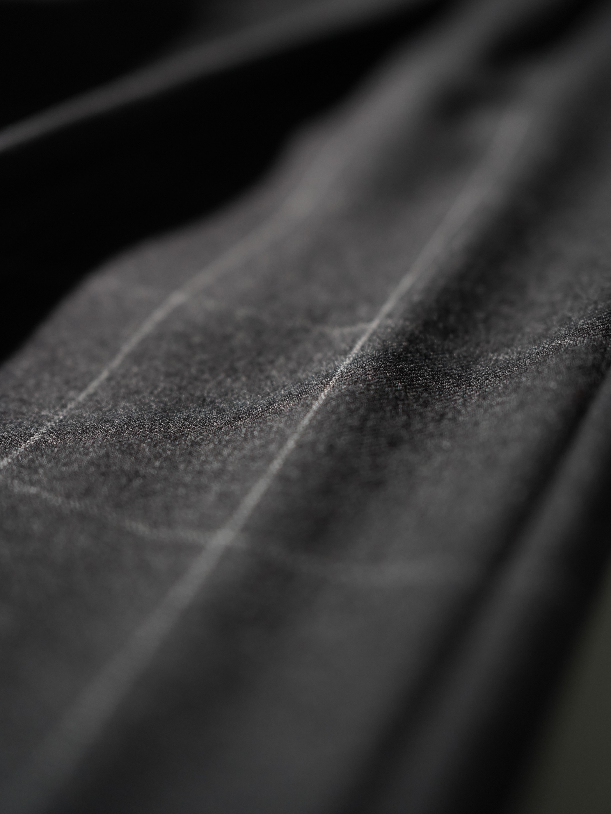 クラシックな柄とドレストラウザーズでありながらもフォーマルの枠には収まらない、ゆとりあるシルエット。