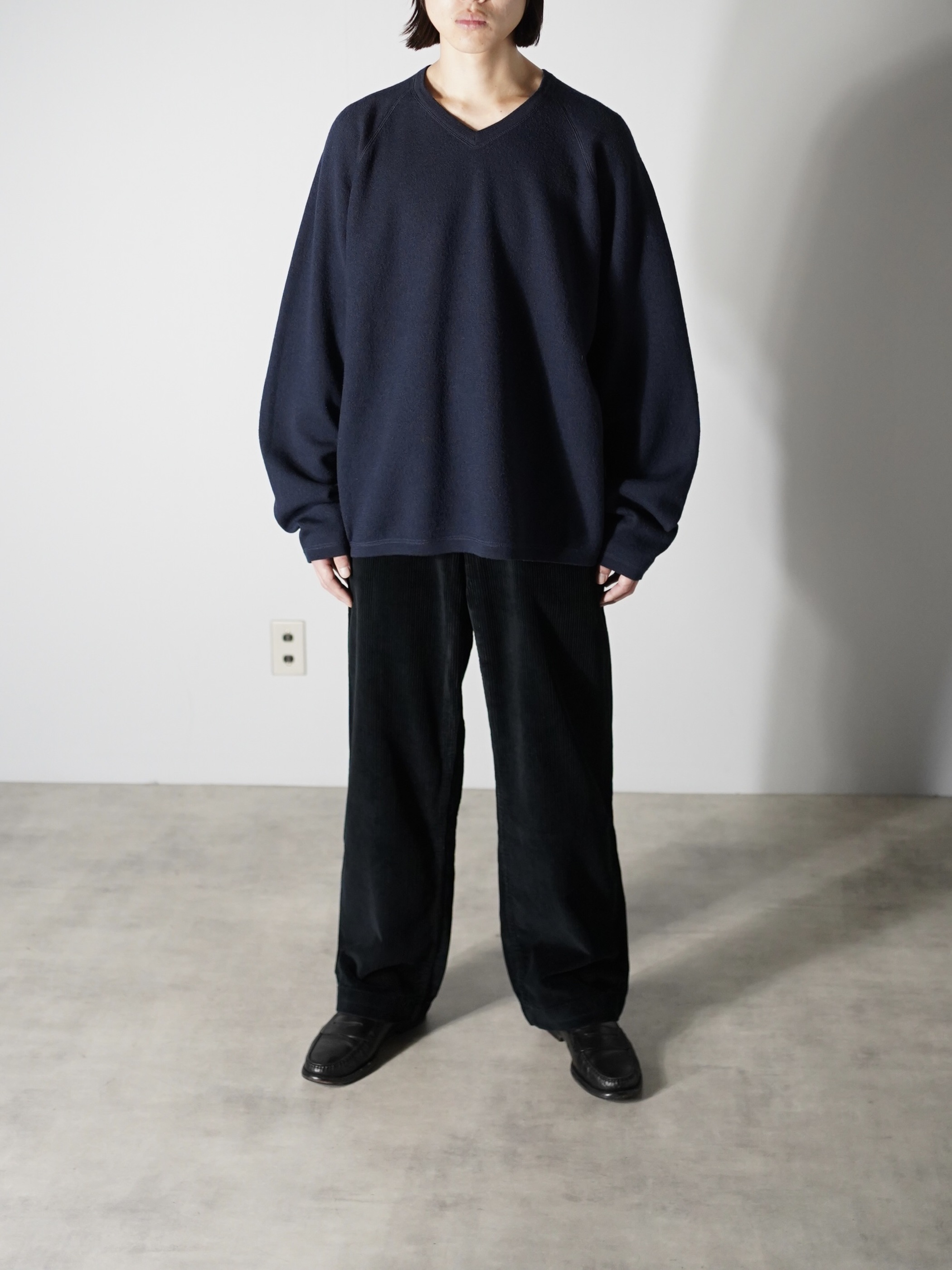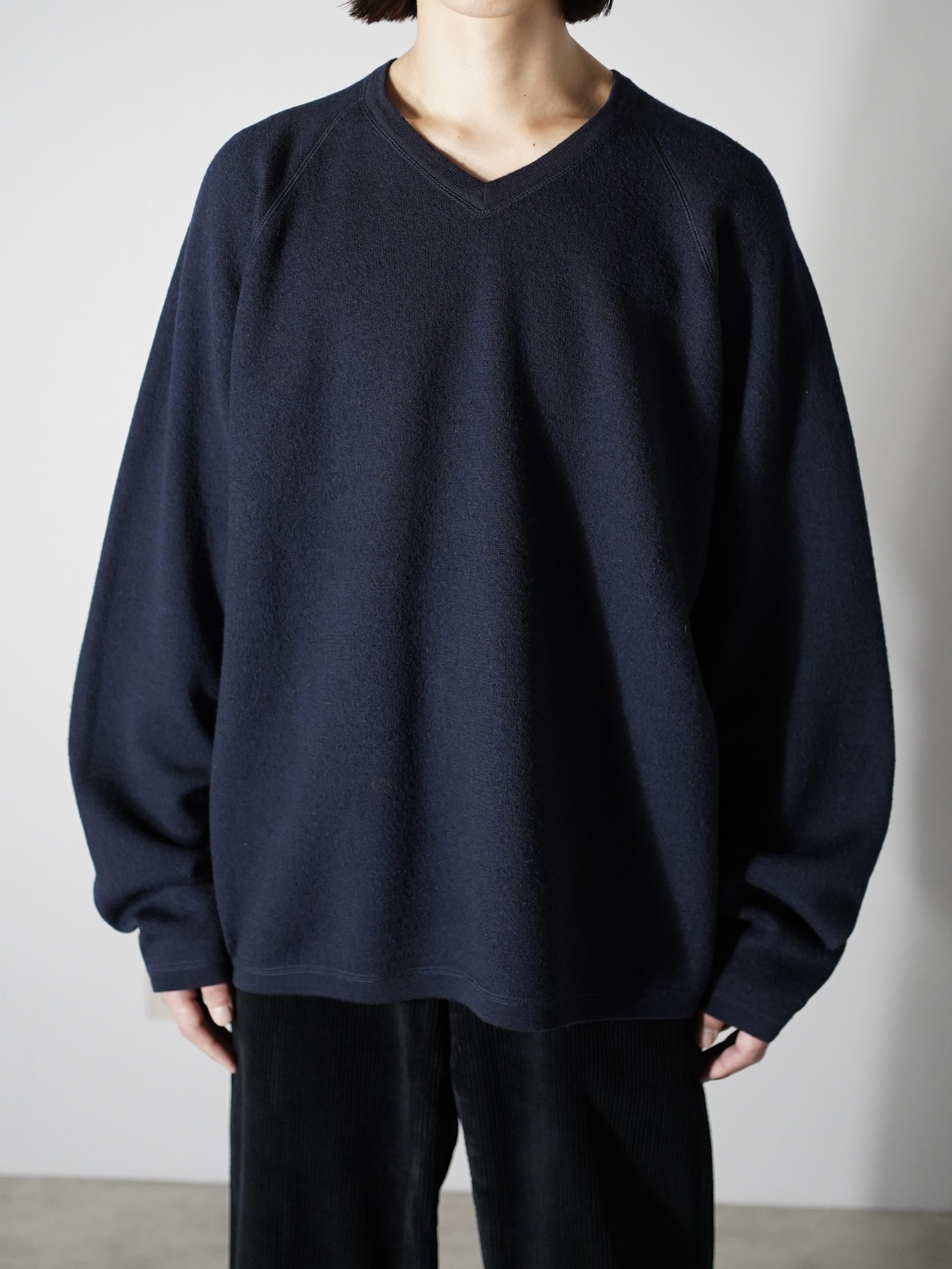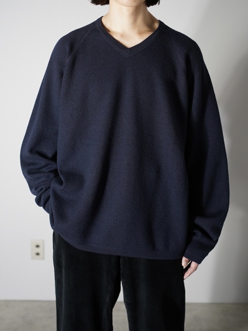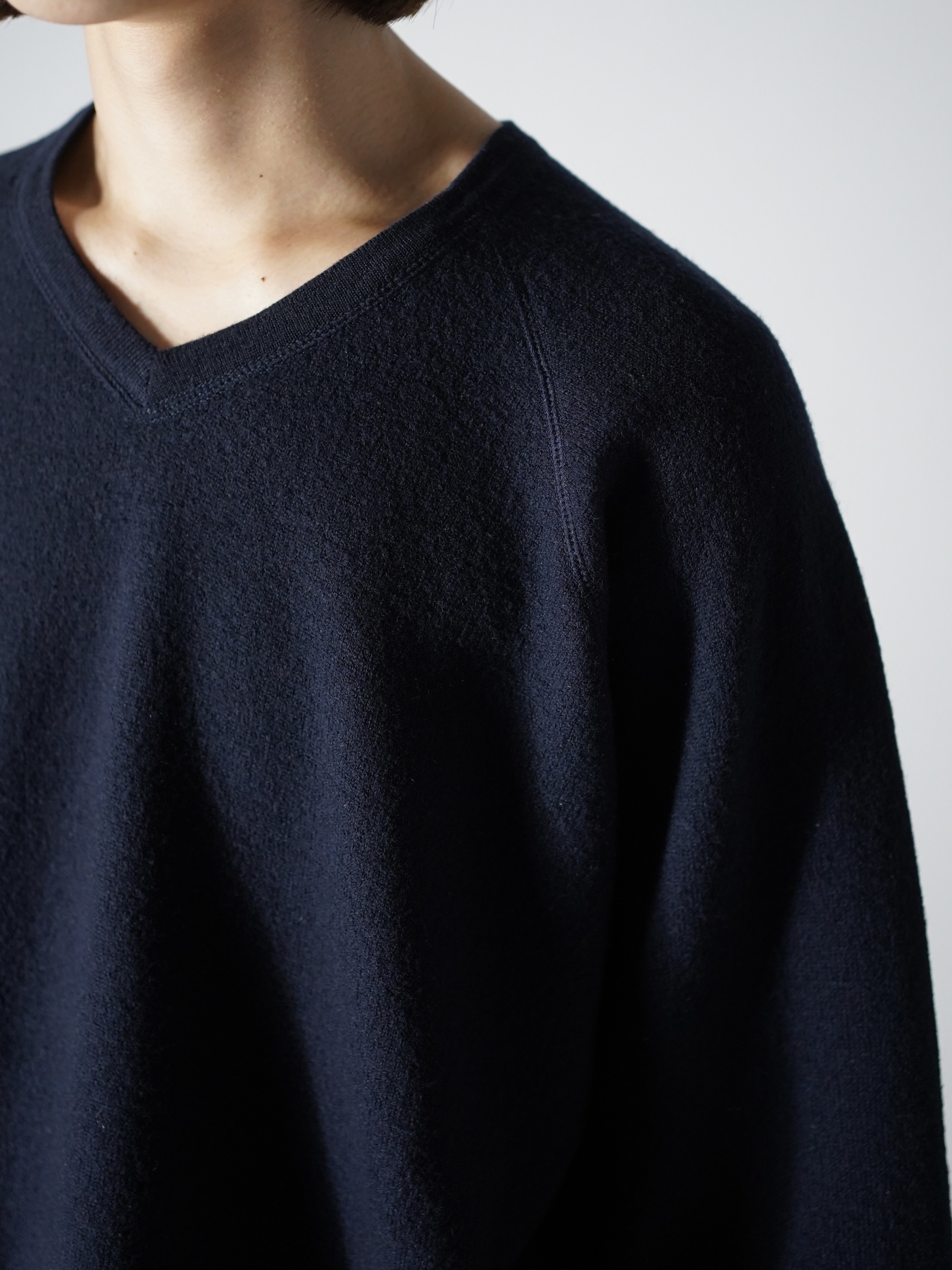 身幅は広く着丈は短い、襟ぐりは浅めのメルトンウールVネックセーター。