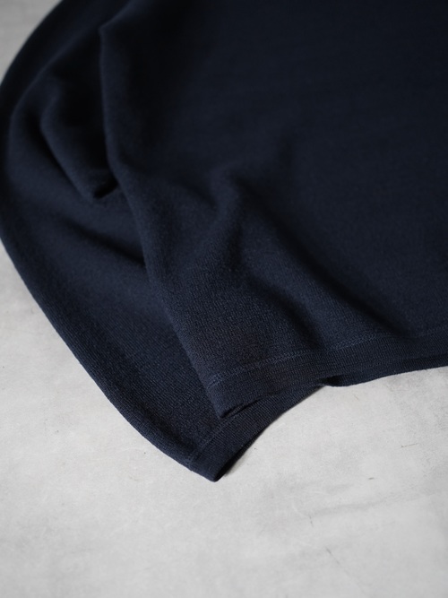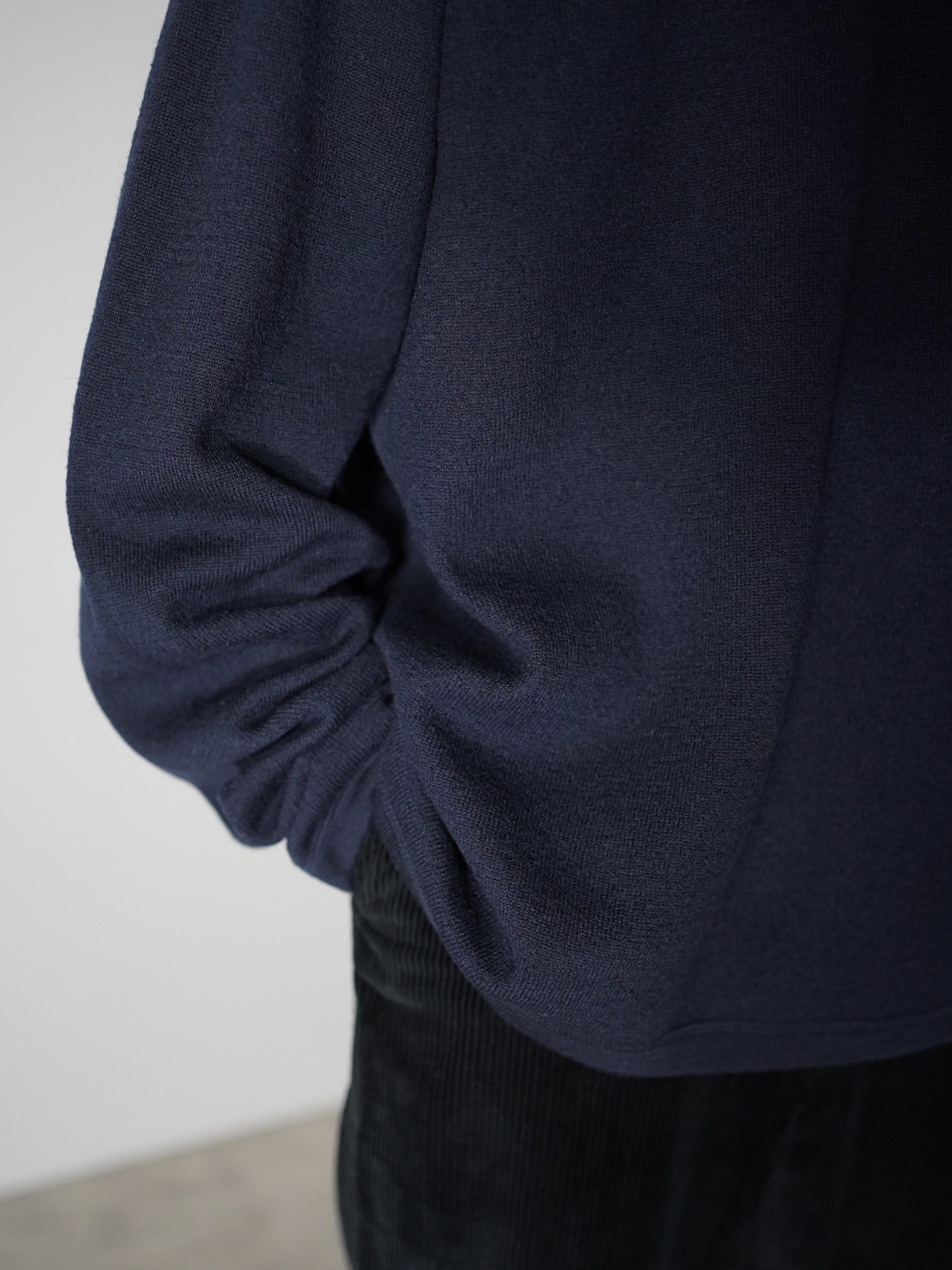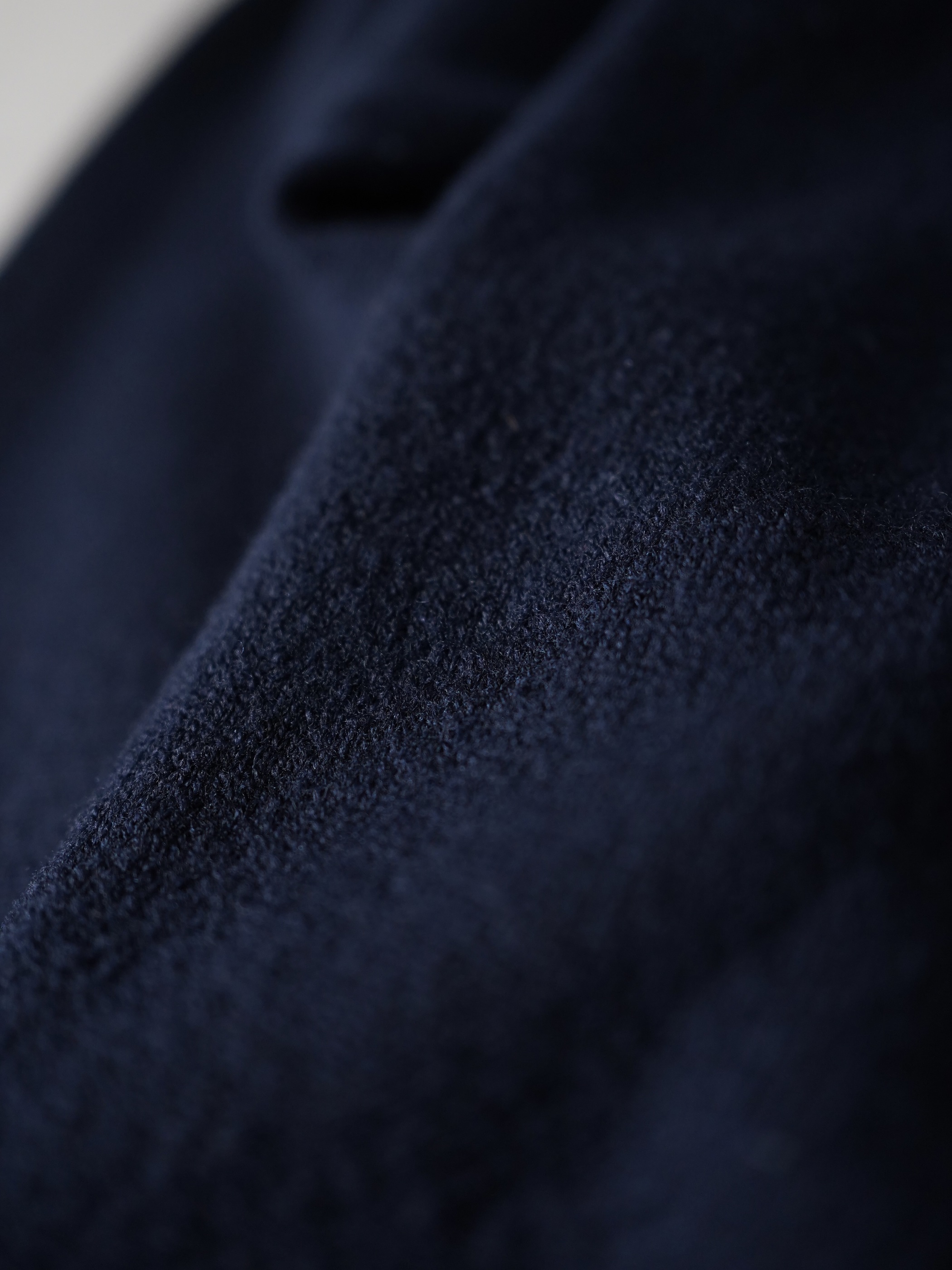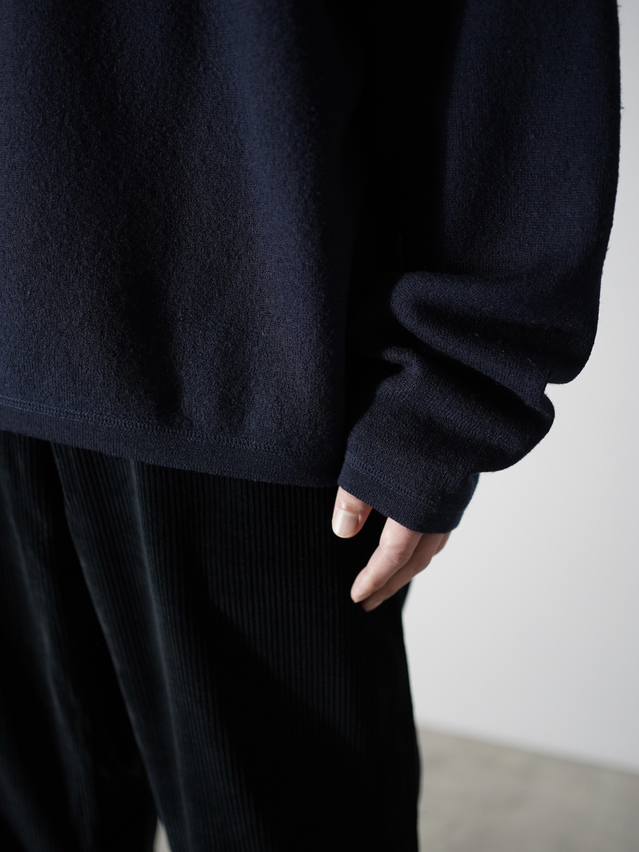 身幅は広く着丈は短い、襟ぐりは浅めのメルトンウールVネックセーター。