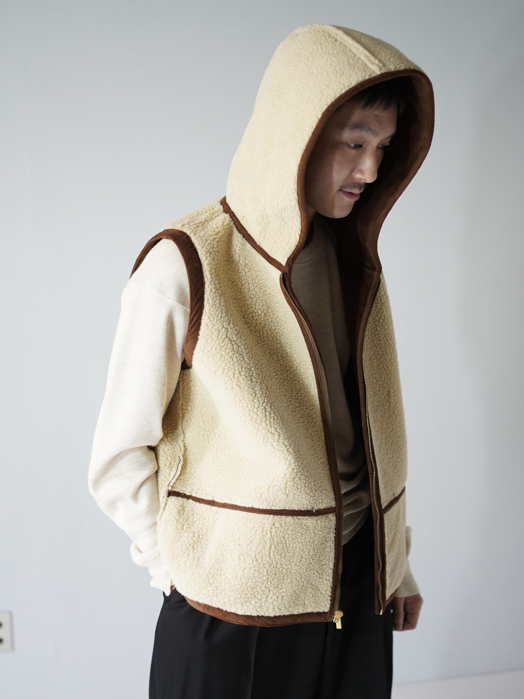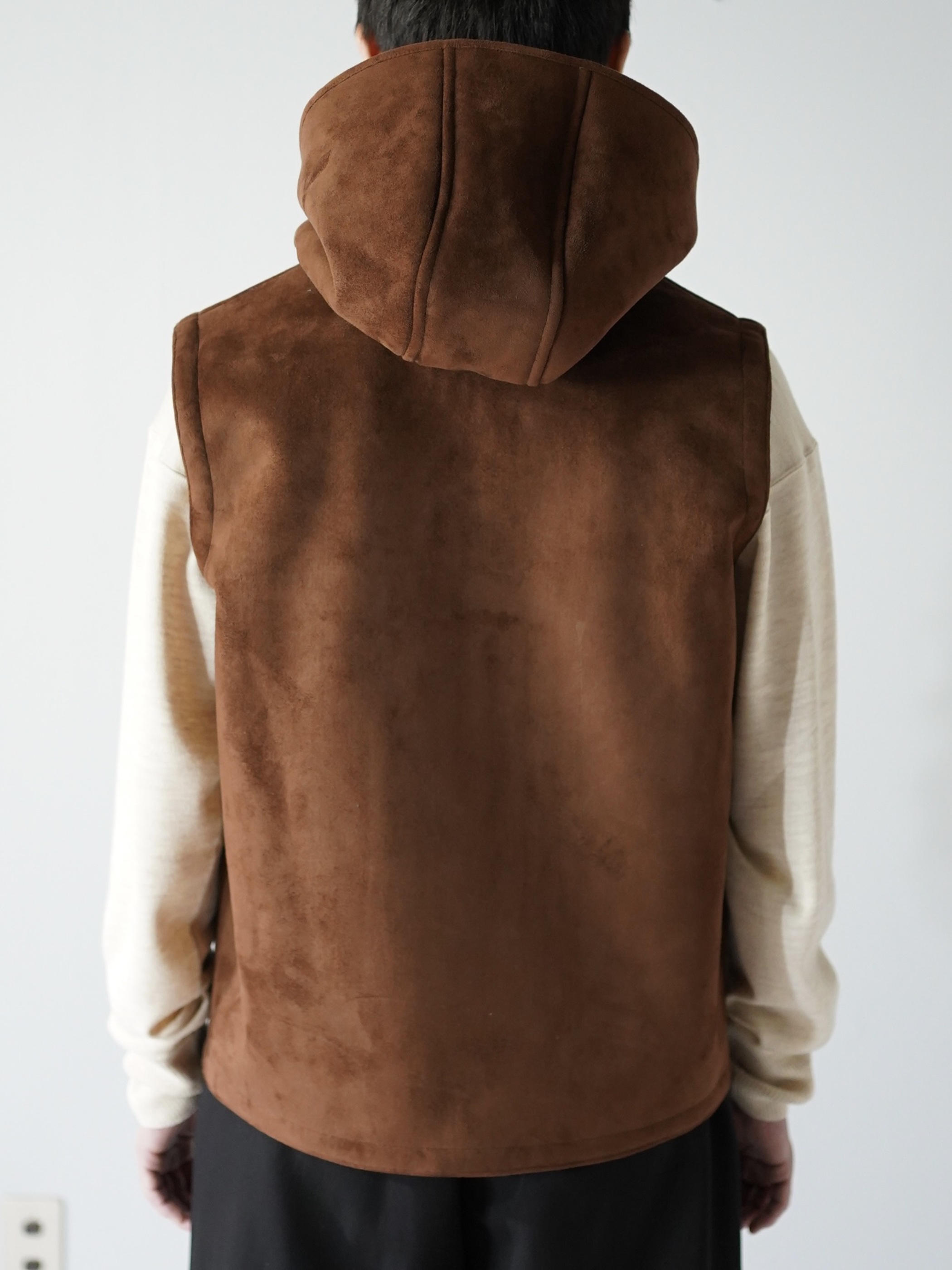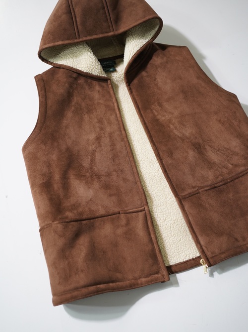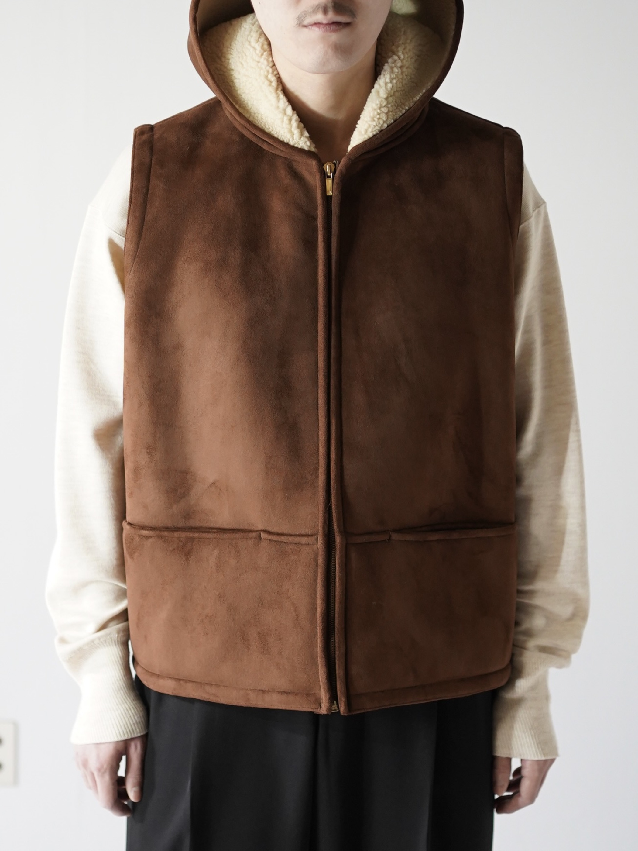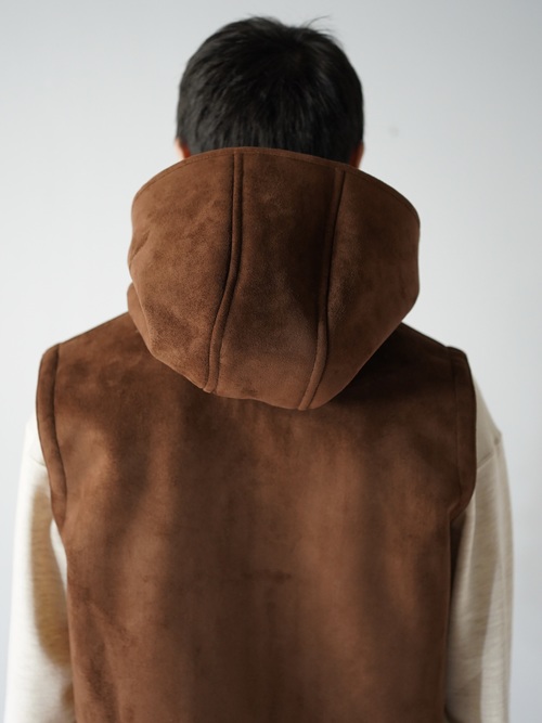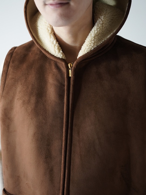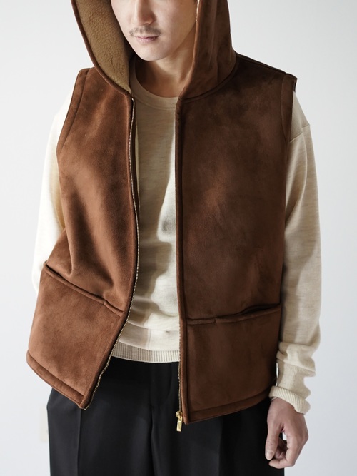 本物に負けず劣らずのもっちりした肉厚の生地、スムースな毛足の流れを感じれるフェイクムートンフーディベスト。
