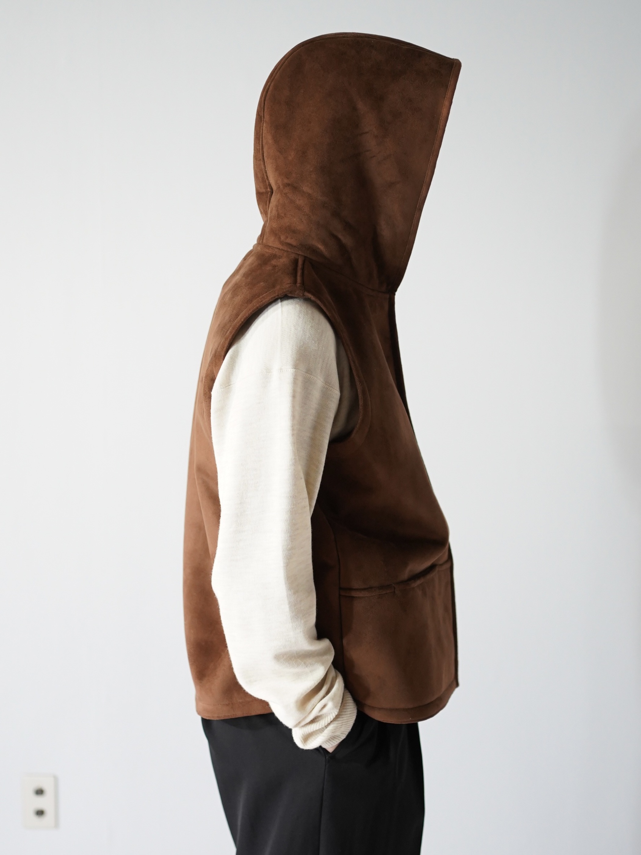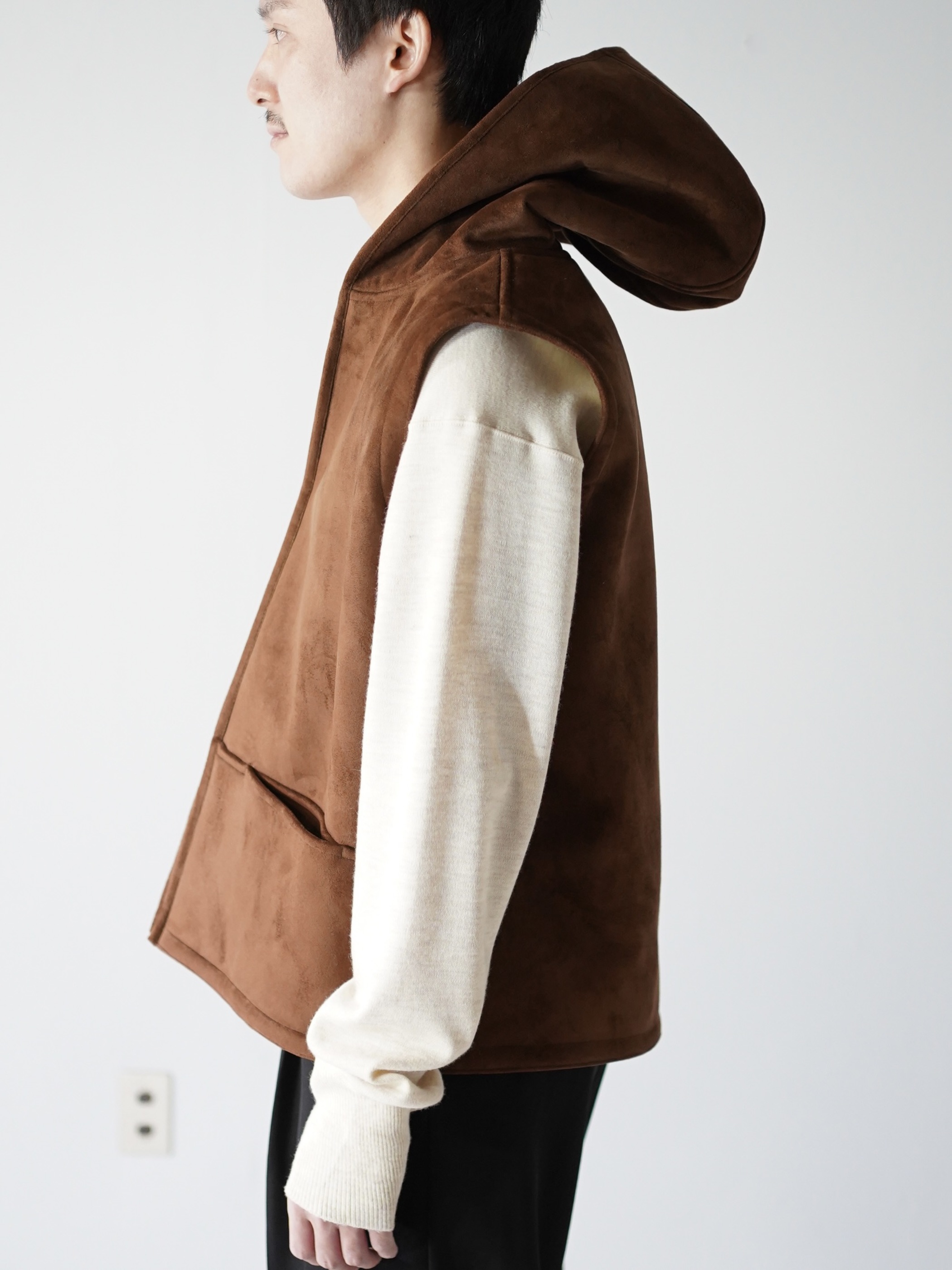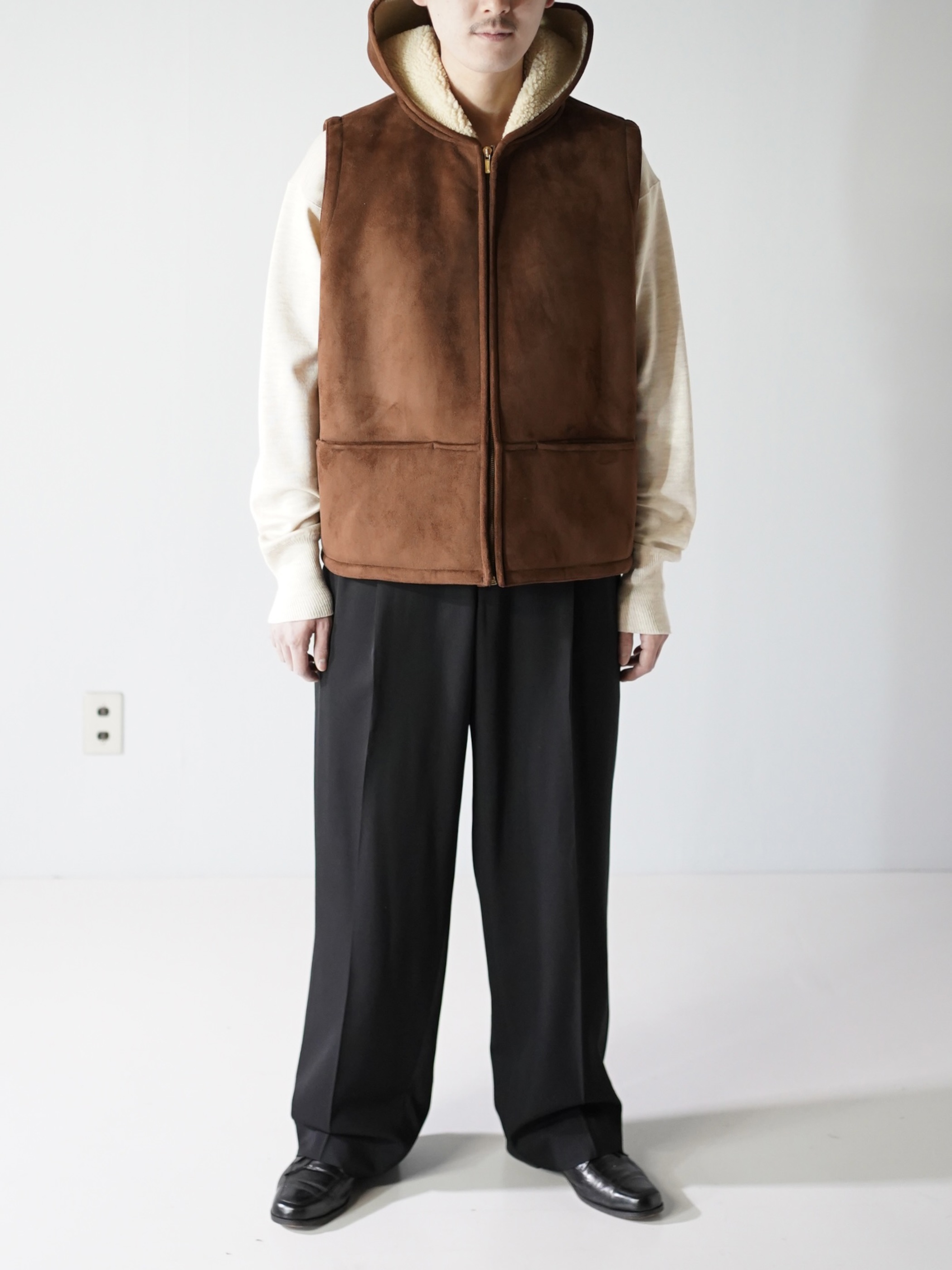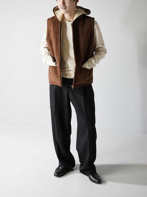 本物に負けず劣らずのもっちりした肉厚の生地、スムースな毛足の流れを感じれるフェイクムートンフーディベスト。