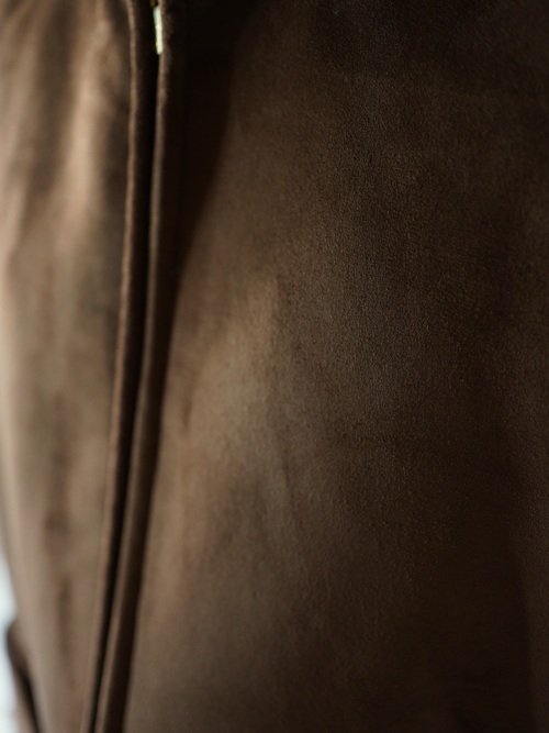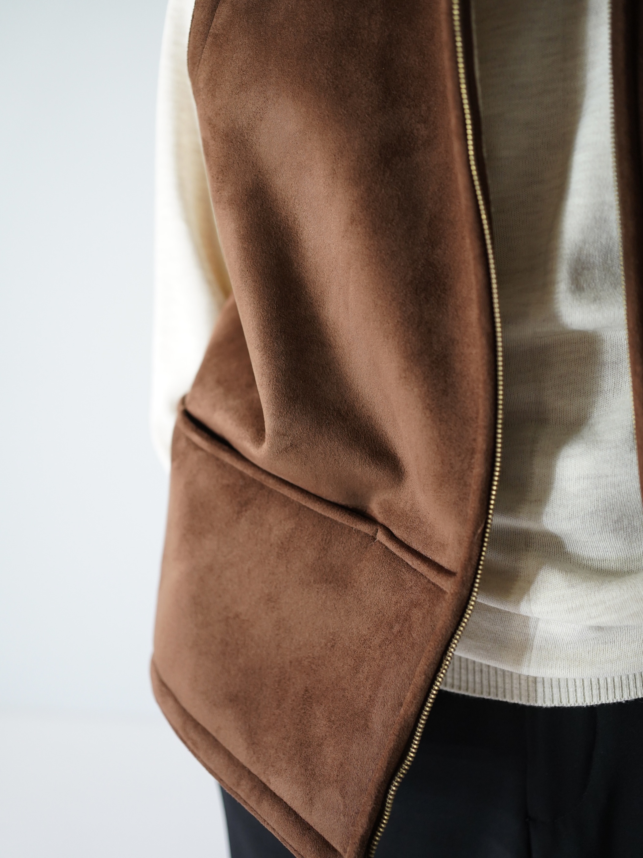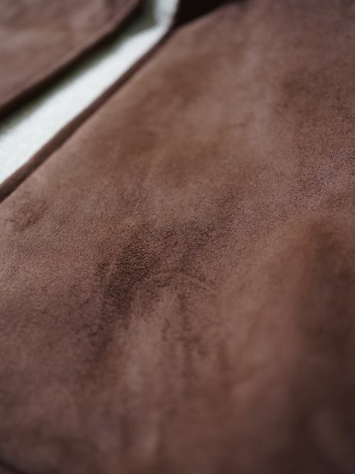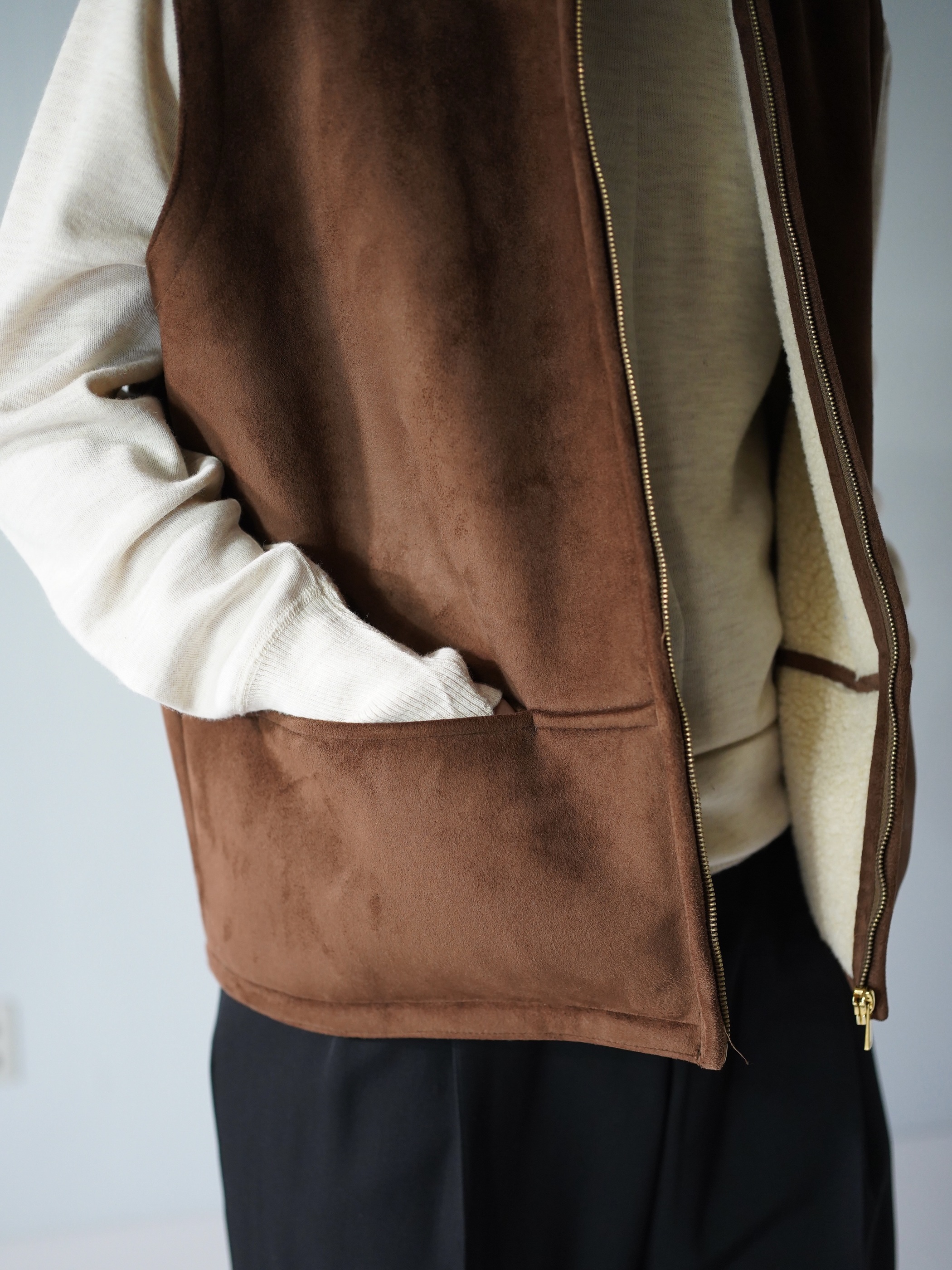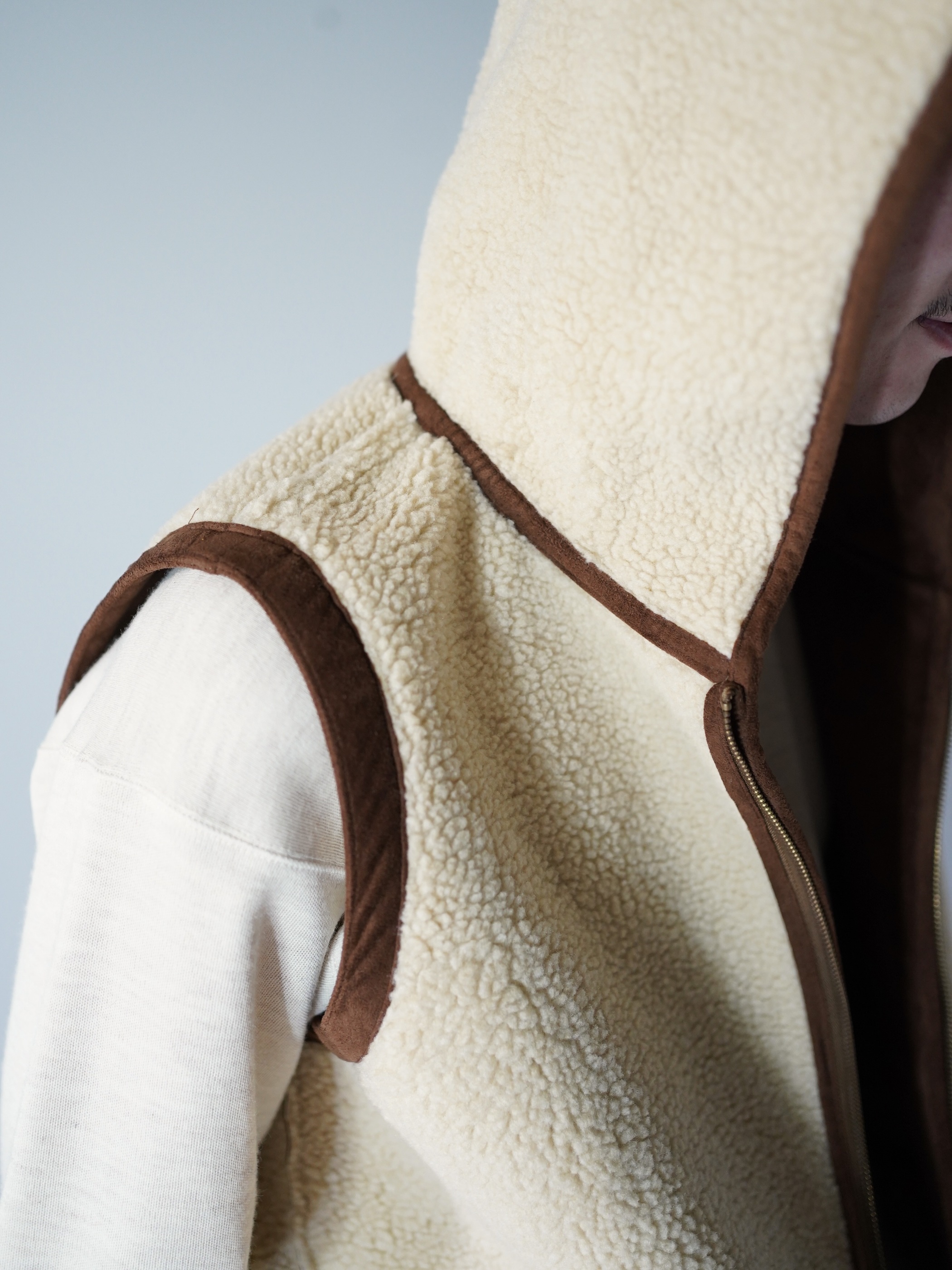 本物に負けず劣らずのもっちりした肉厚の生地、スムースな毛足の流れを感じれるフェイクムートンフーディベスト。