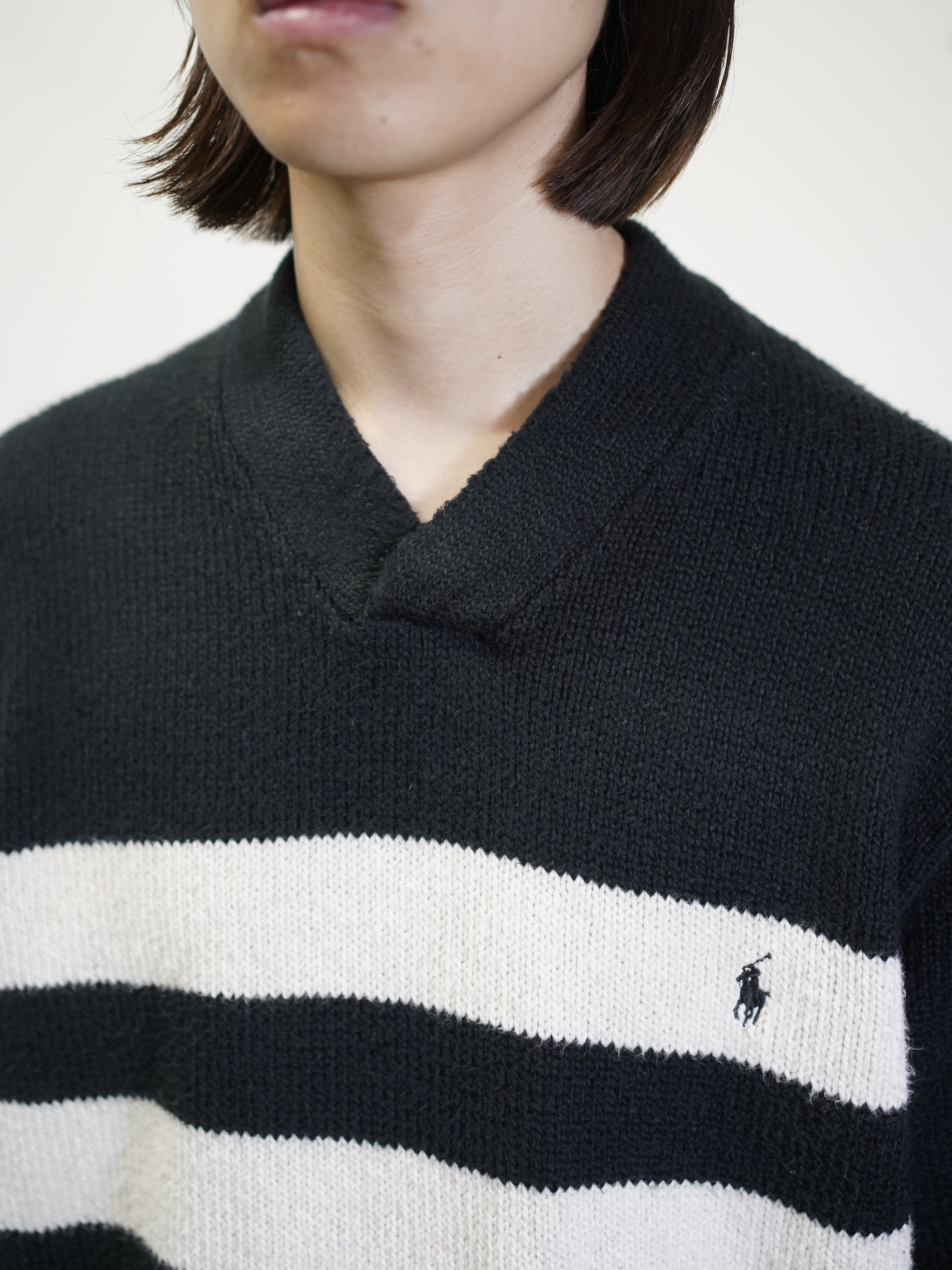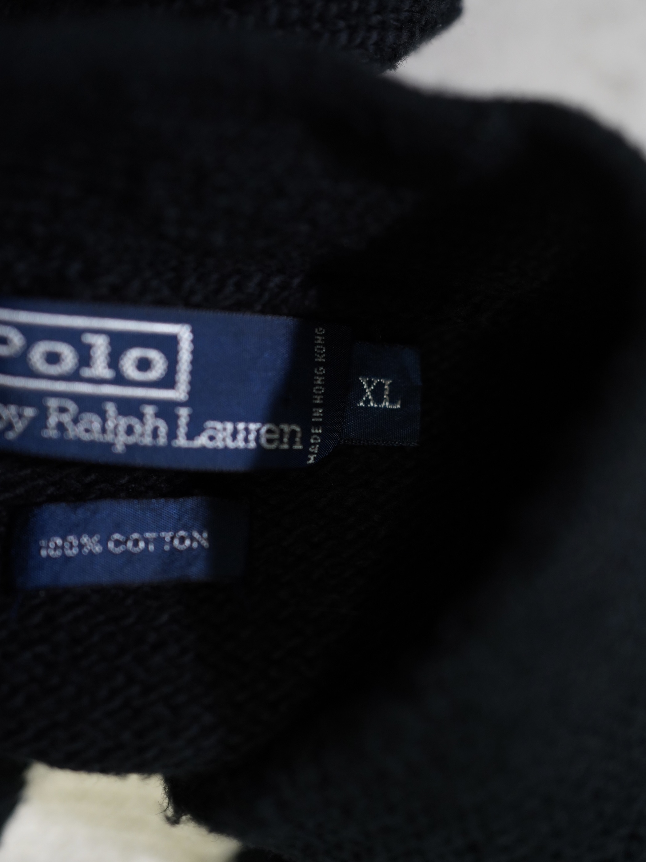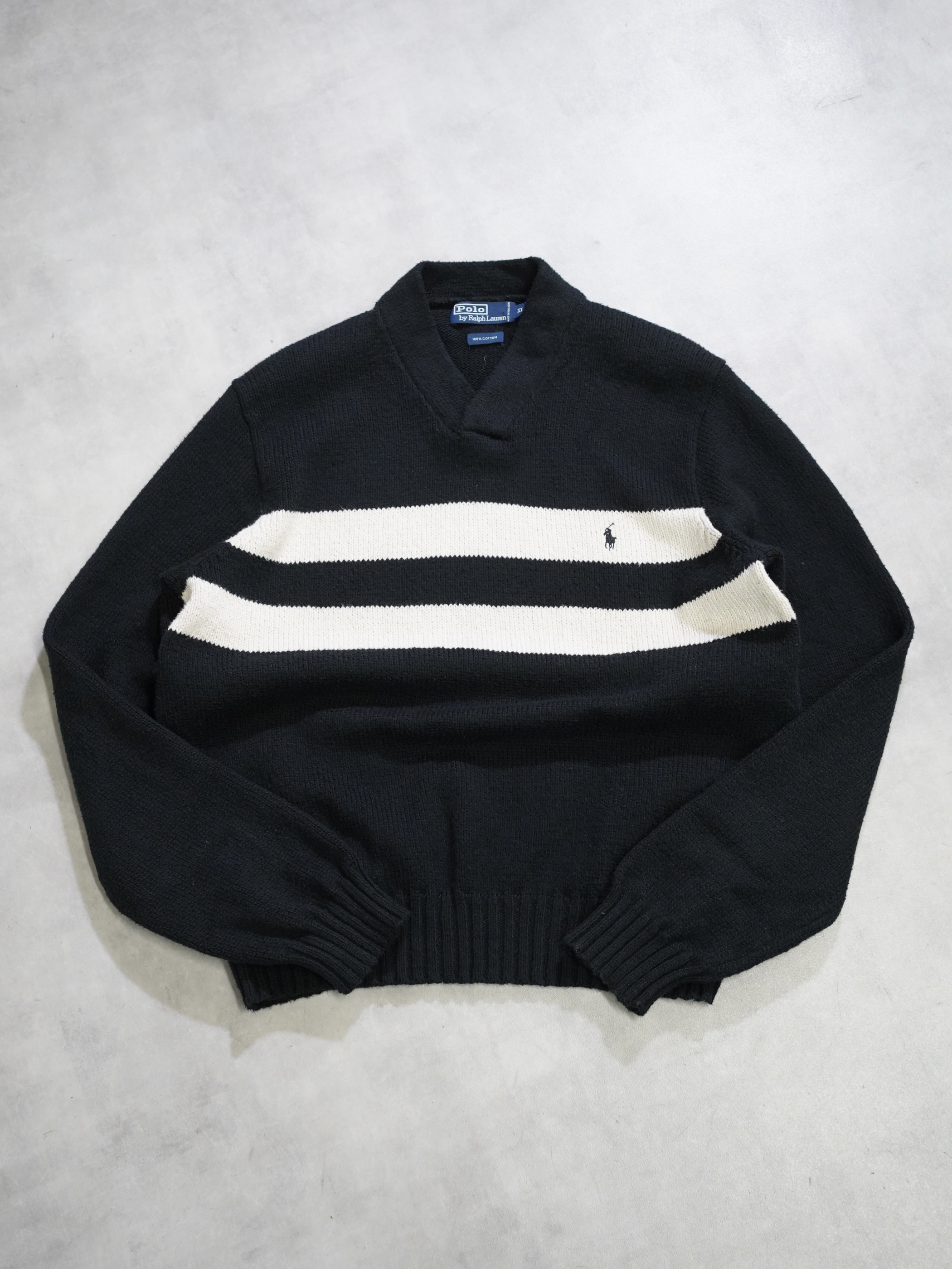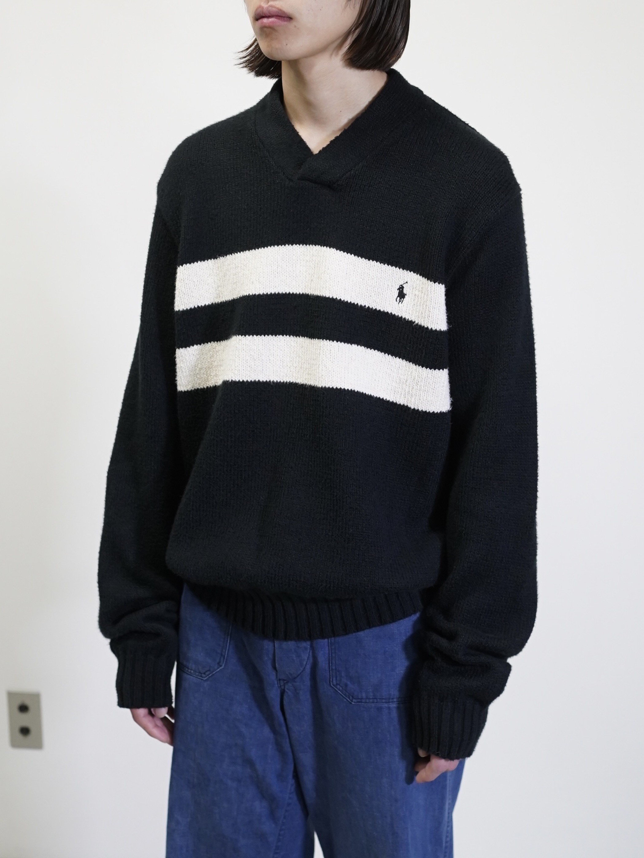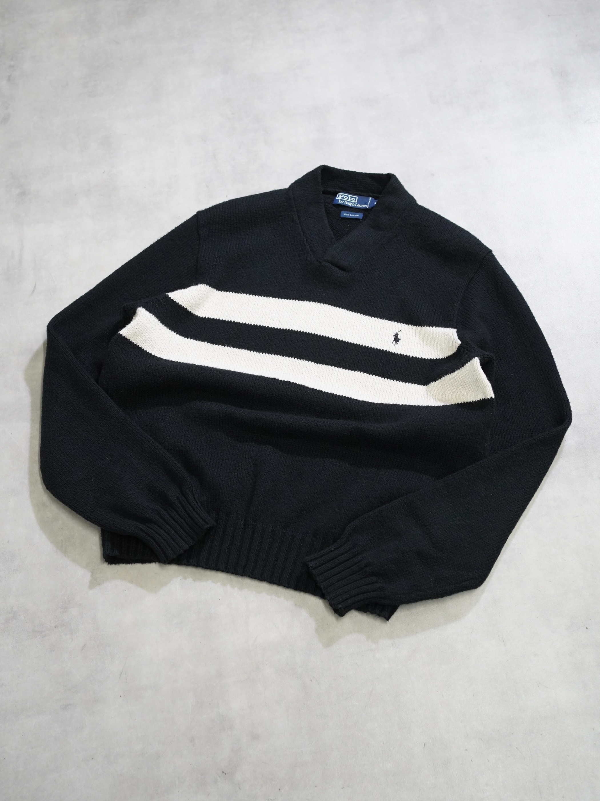 1990's Polo by Ralph Lauren 100% Cotton Vintage lettered motif V-neck knit sweater/Made in Hong Kong