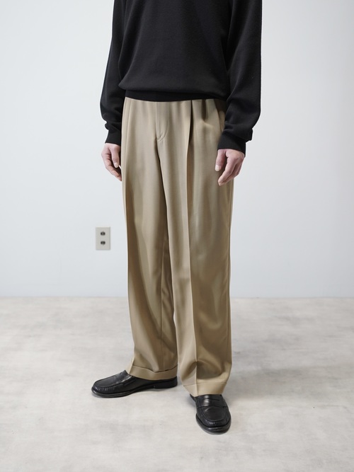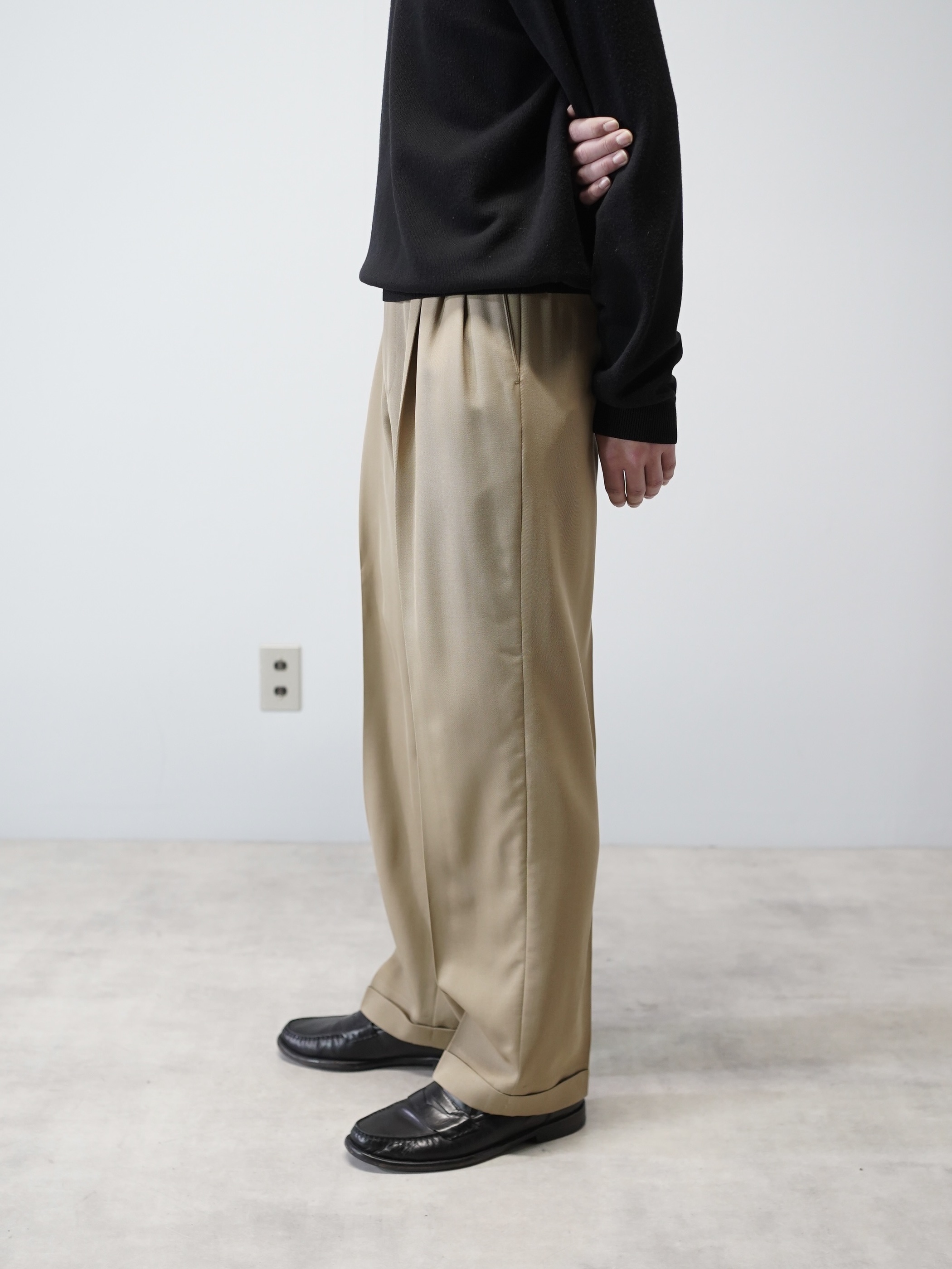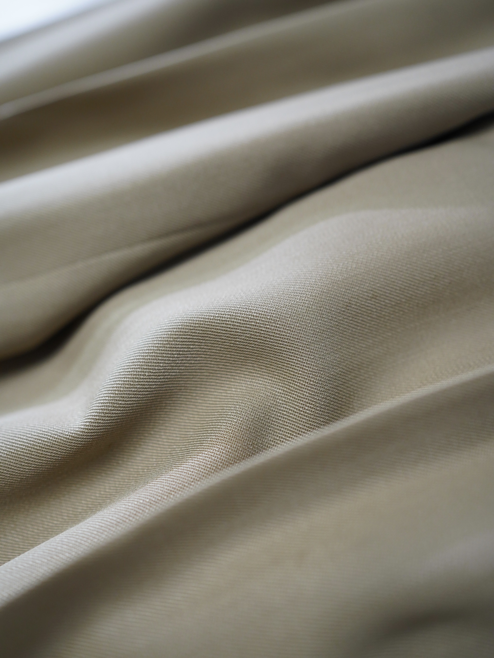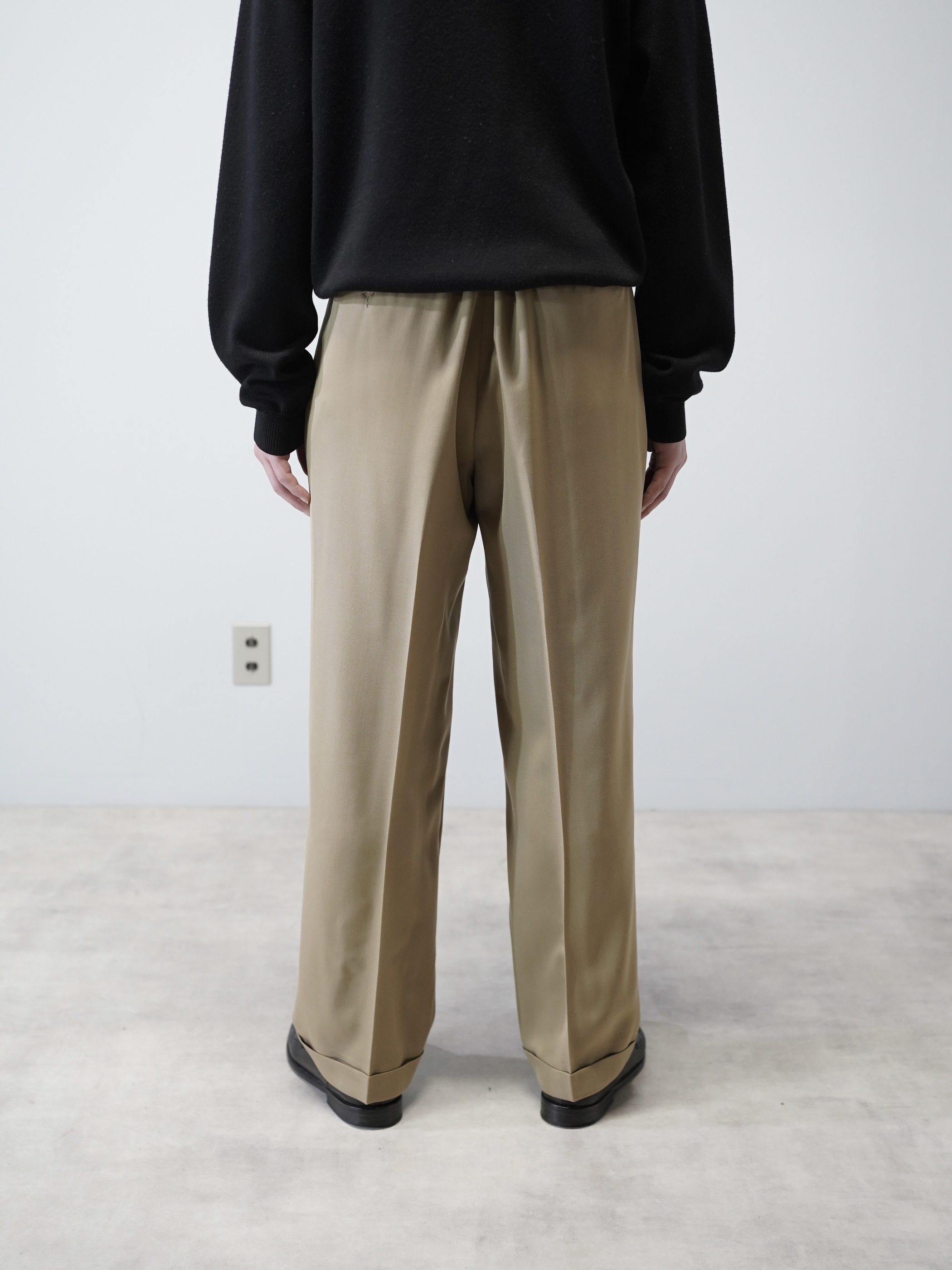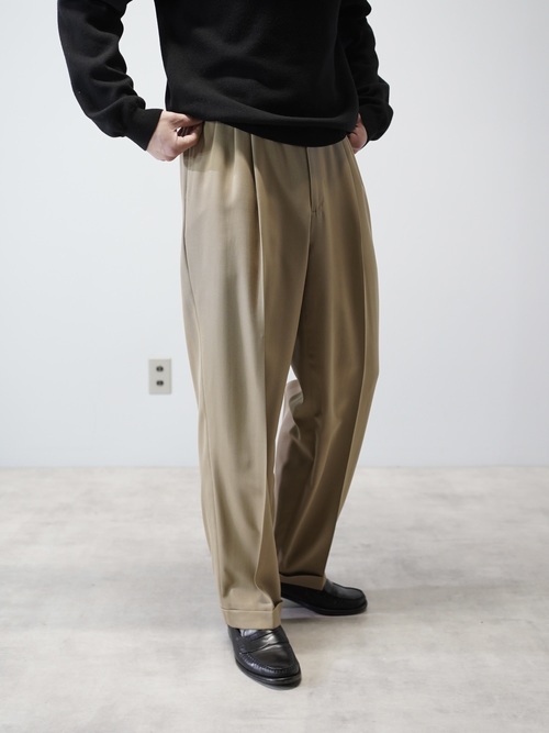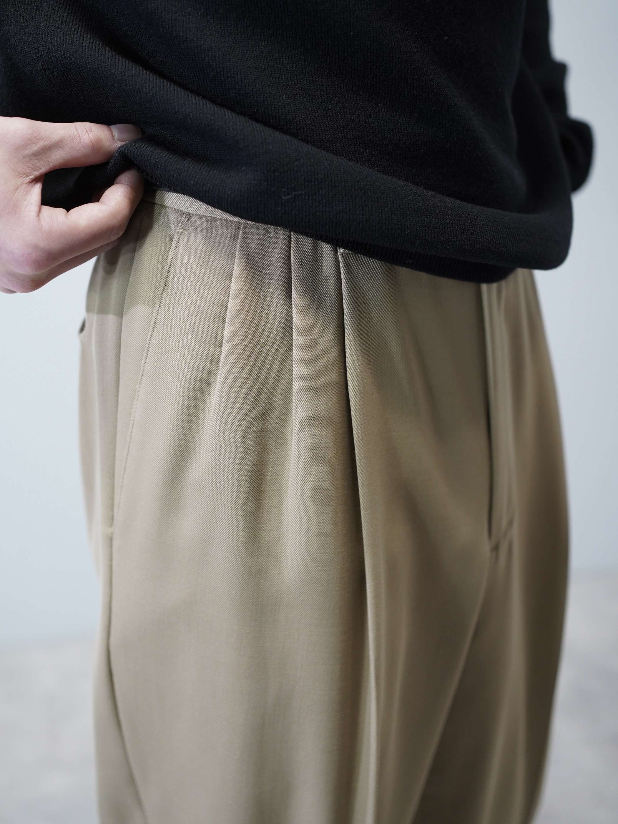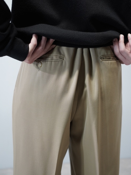 上質なギャバジン素材が生む重厚なドレープ感と落ち感、端正な艶とシルエット美。