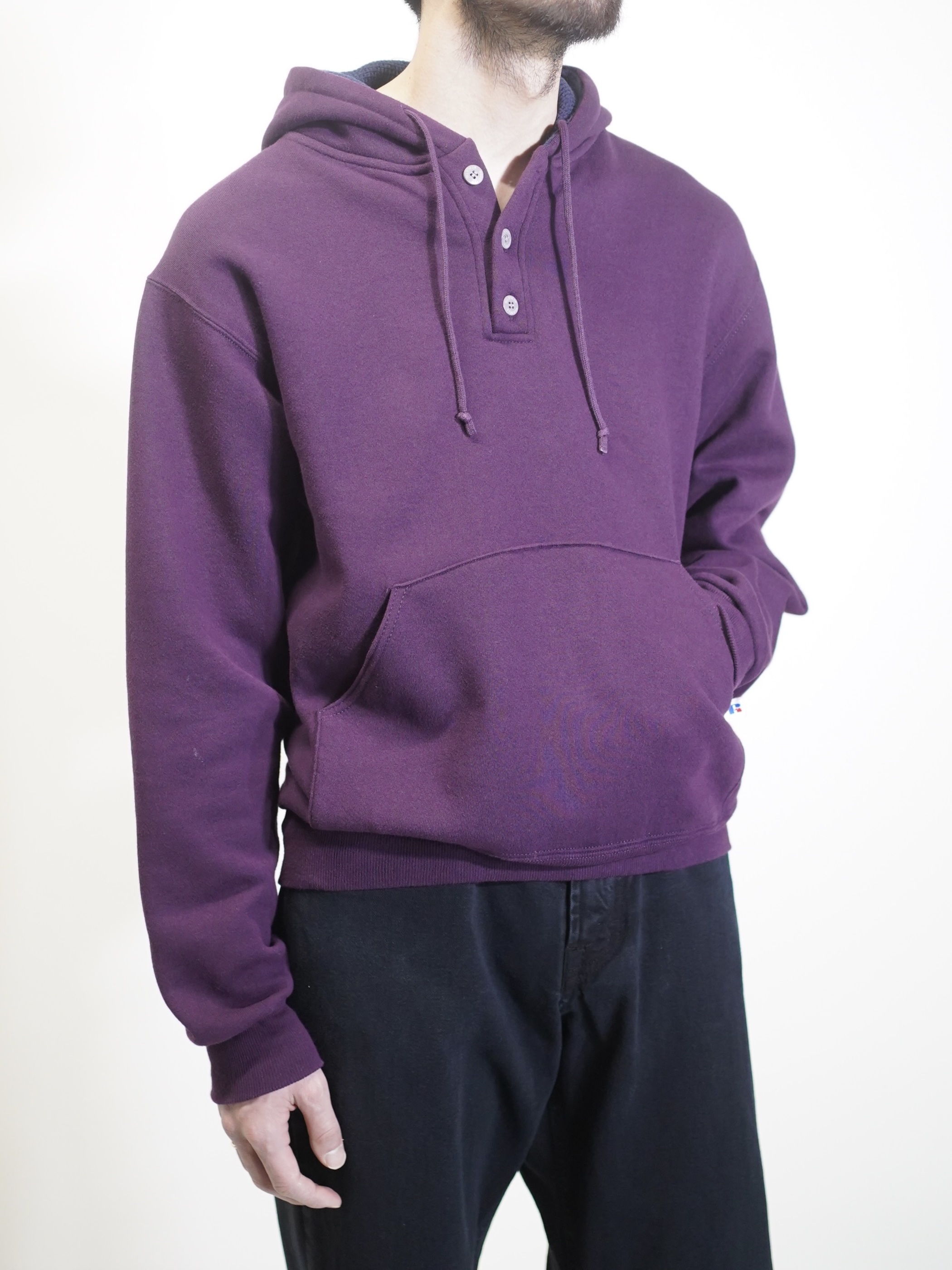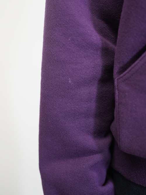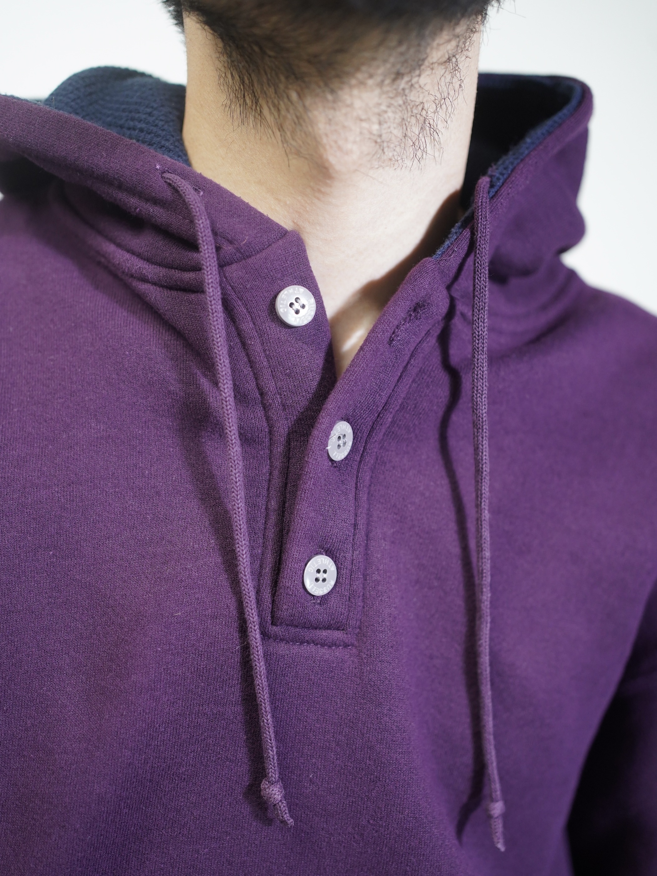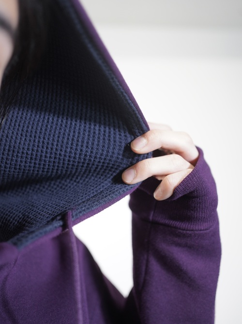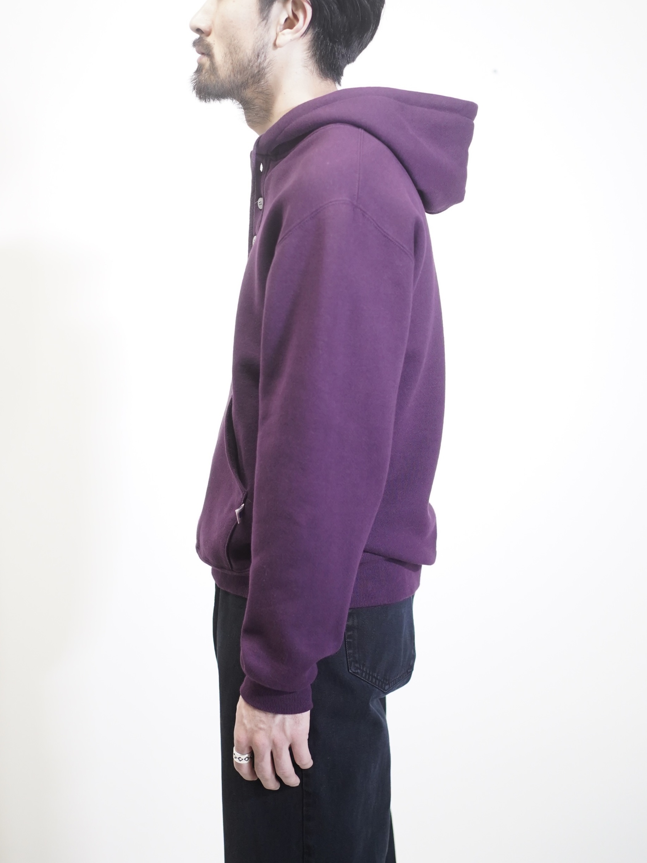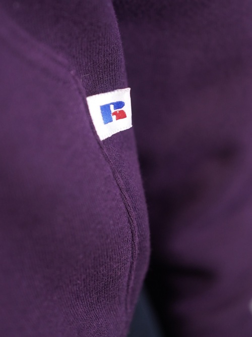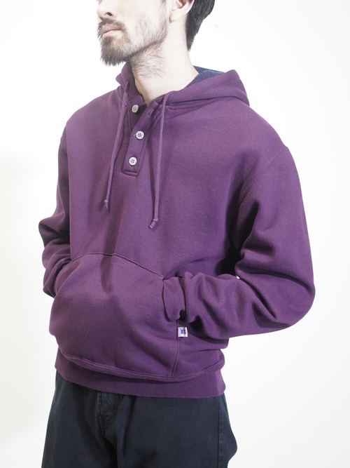 ポップなスウェットパーカーをヘンリー仕様と、パープルカラーで品を持たせた仕上がりに。