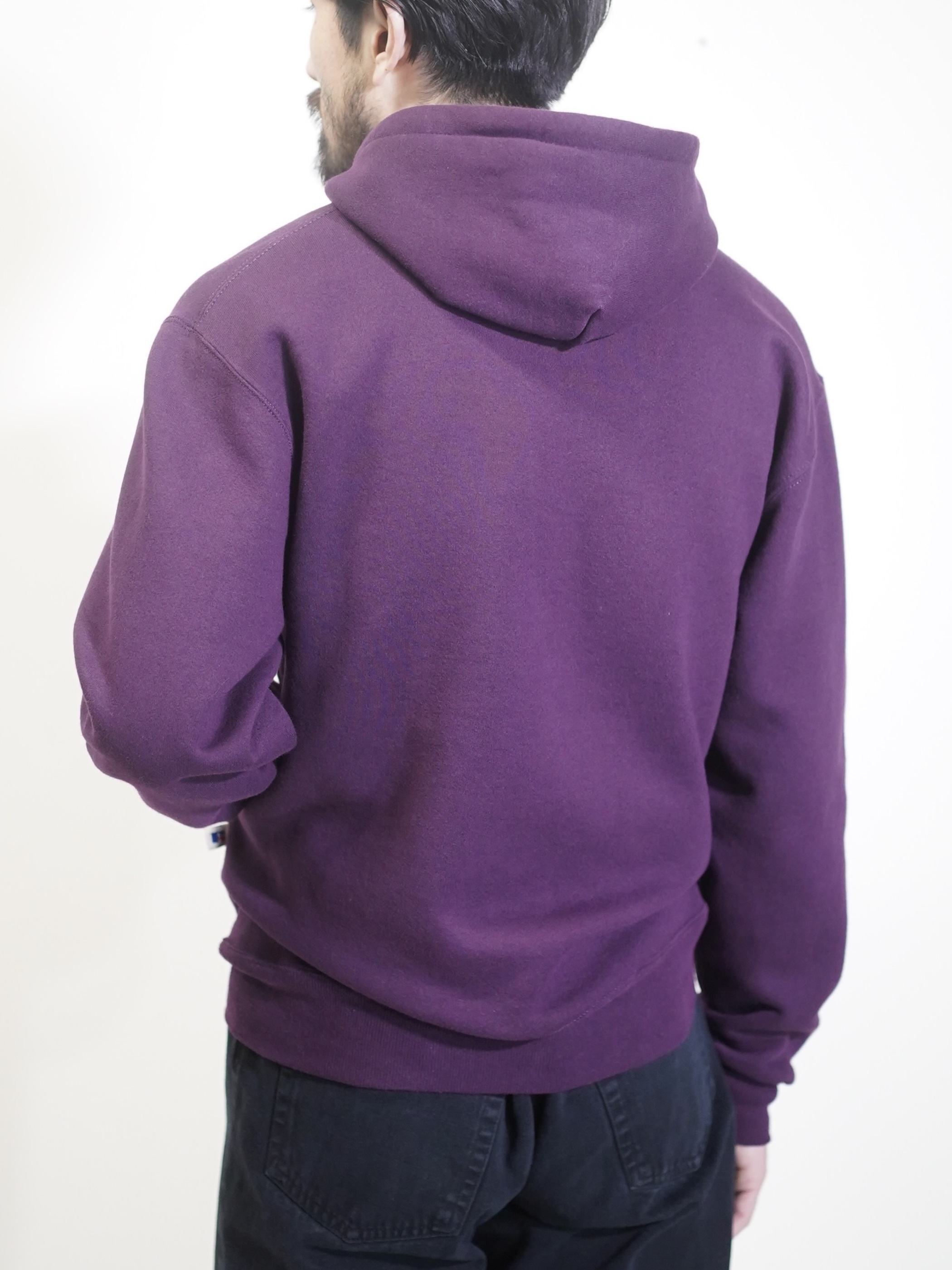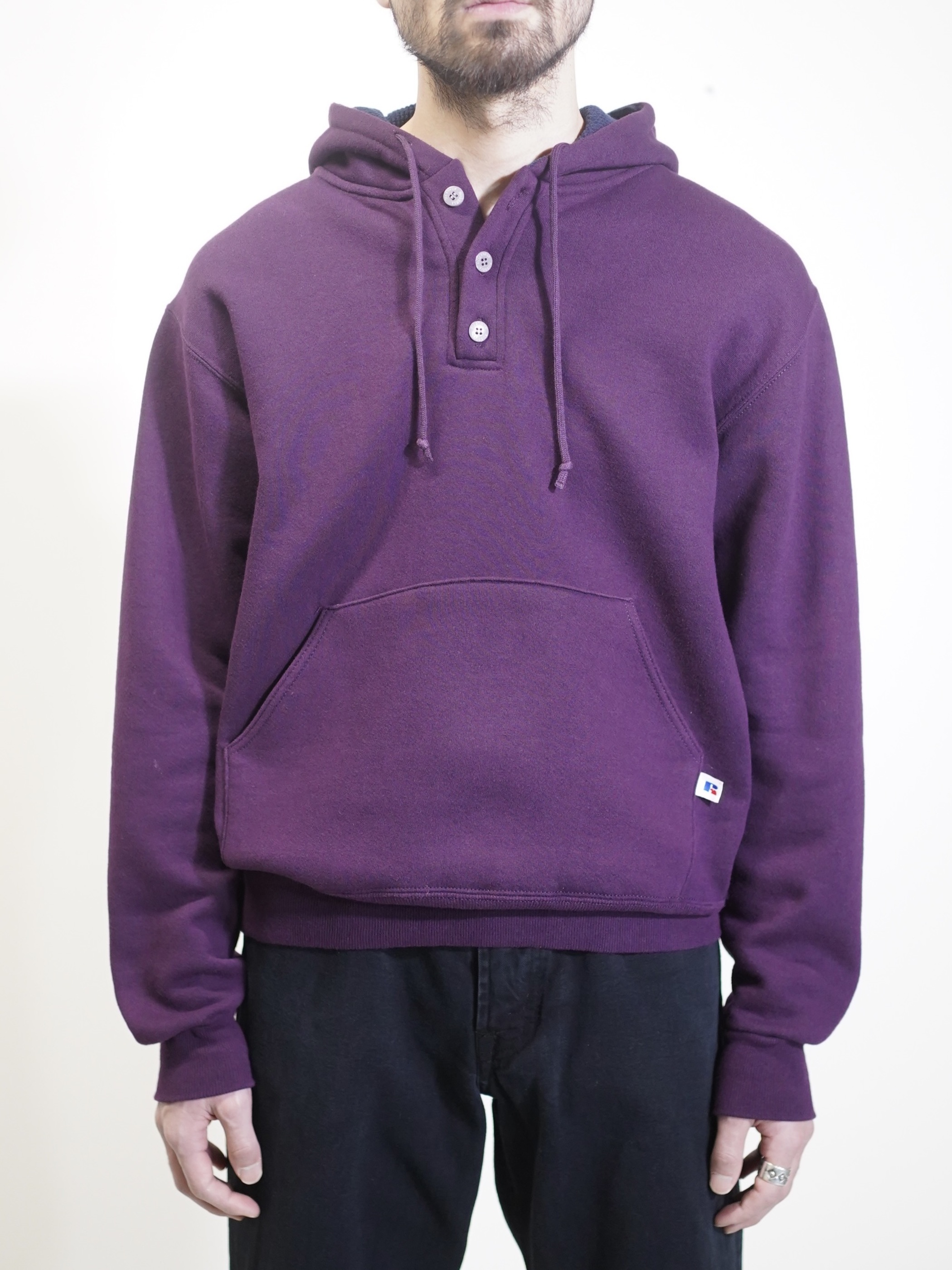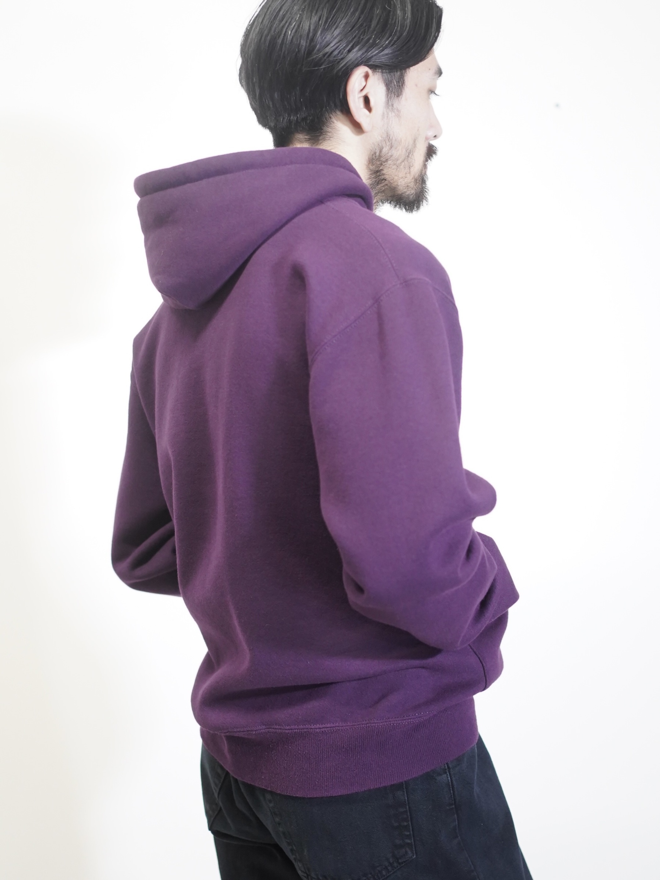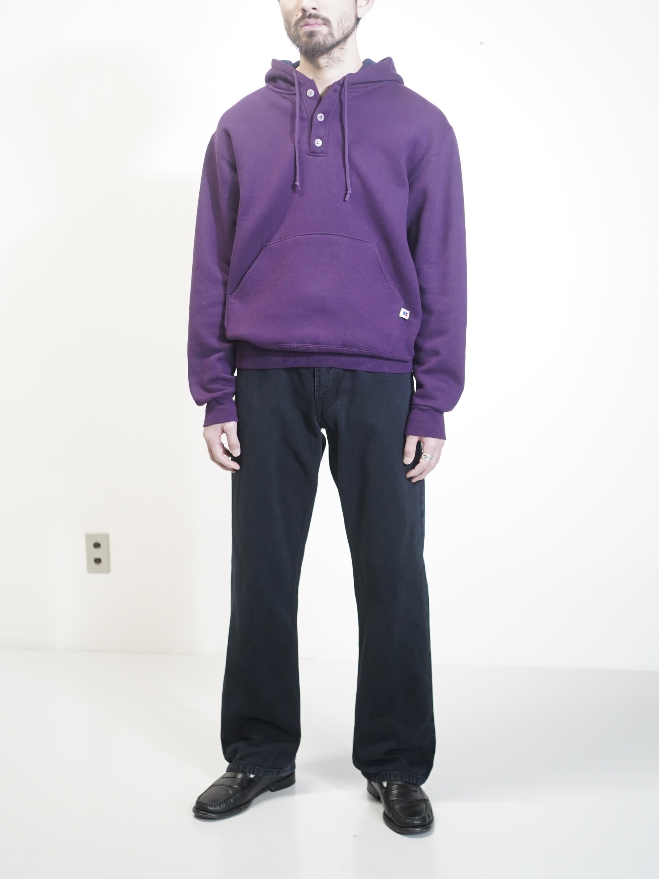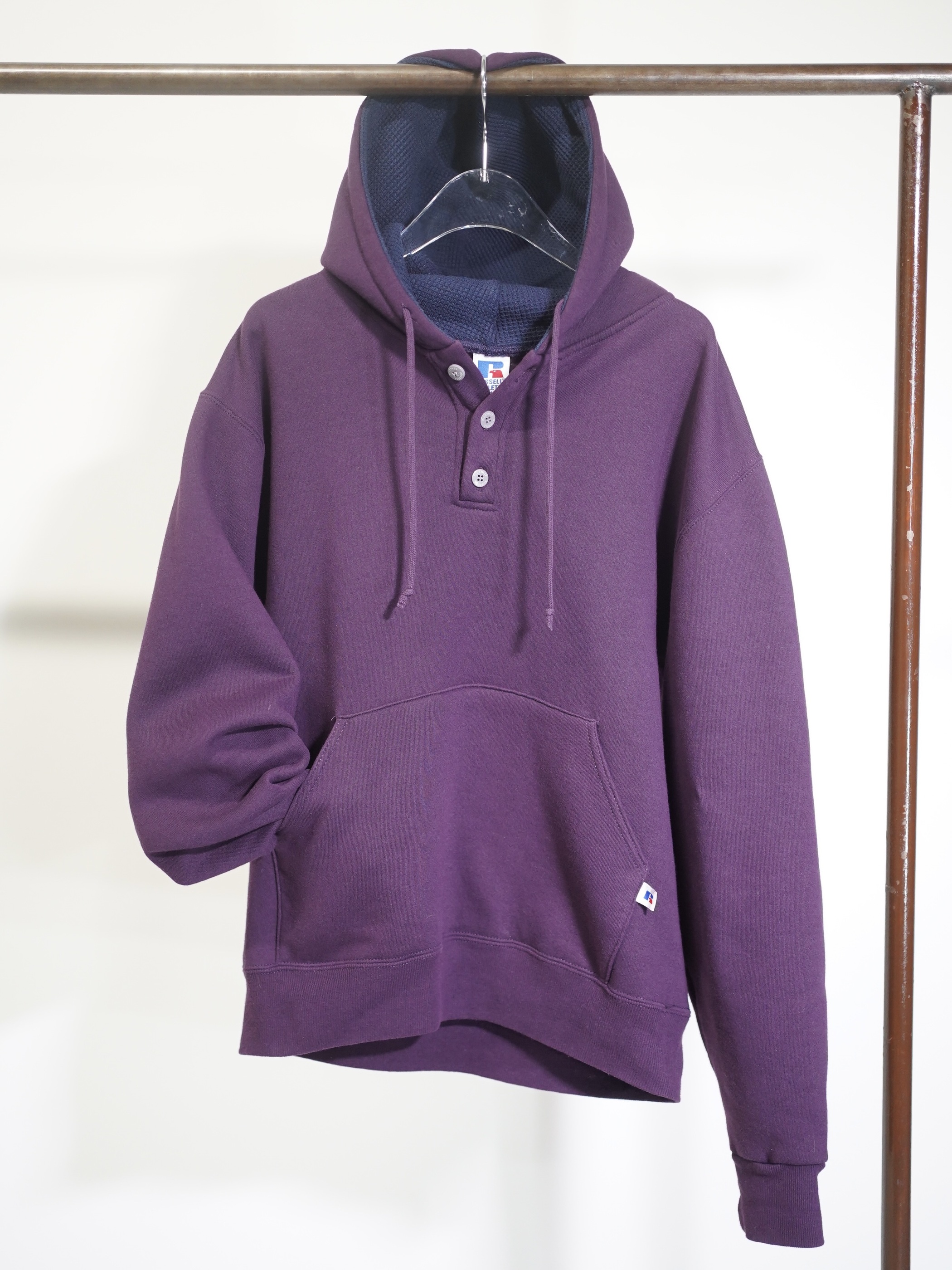 ポップなスウェットパーカーをヘンリー仕様と、パープルカラーで品を持たせた仕上がりに。