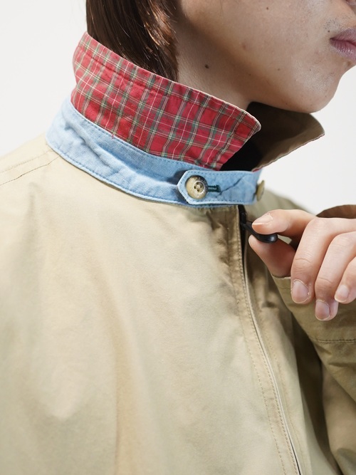 ベーシックなベージュカラーをベースとし、襟裏・チンストラップはチェック、シャンブレー生地切り替え。