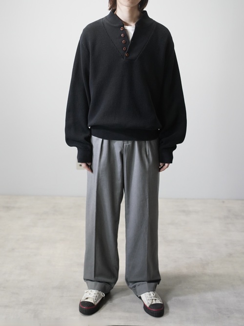 春先はボタンを開けてインナーでも遊べる可動域の広いトップスです。