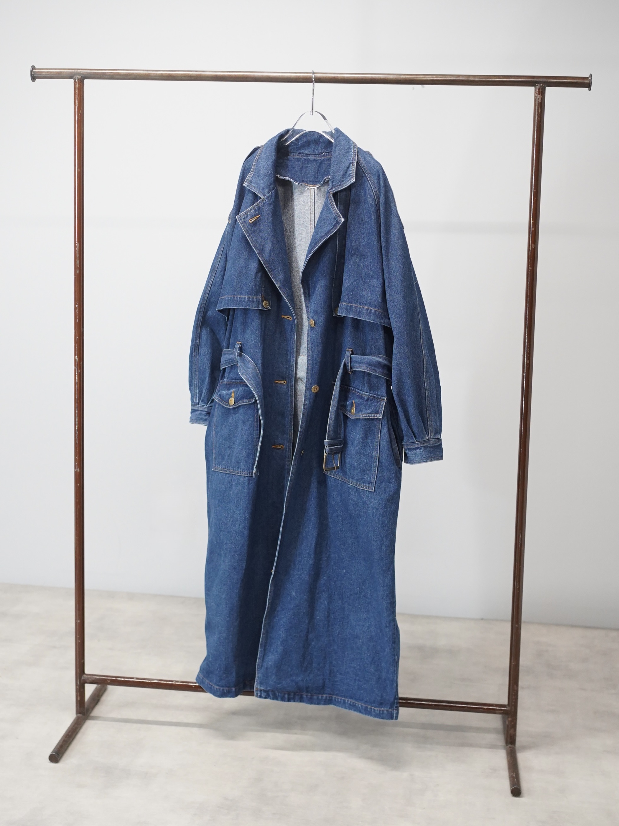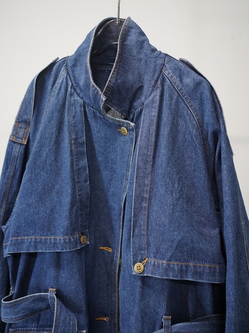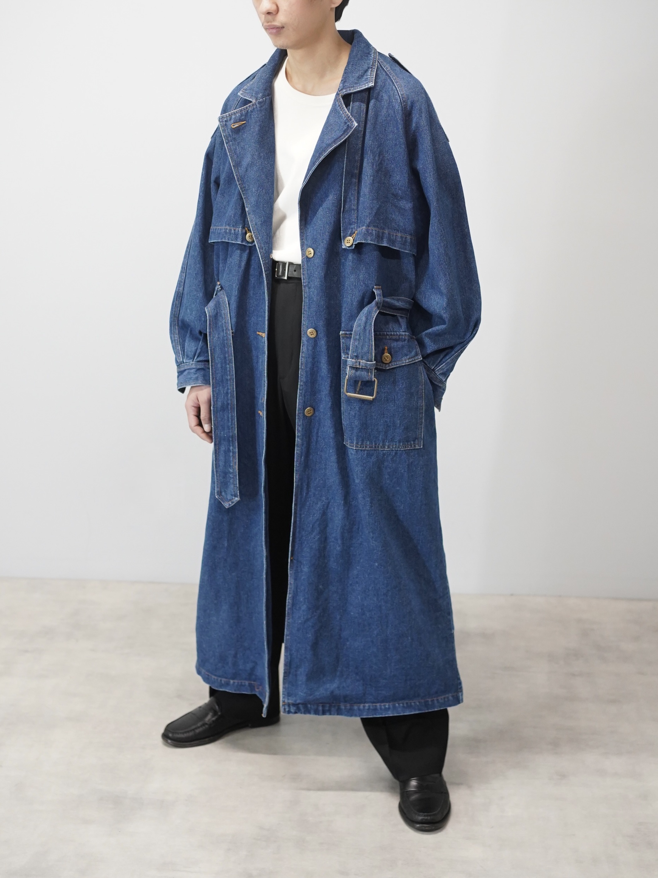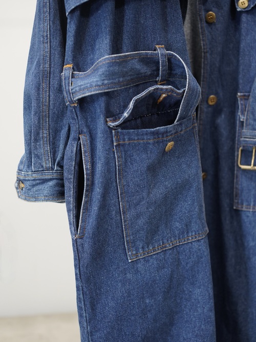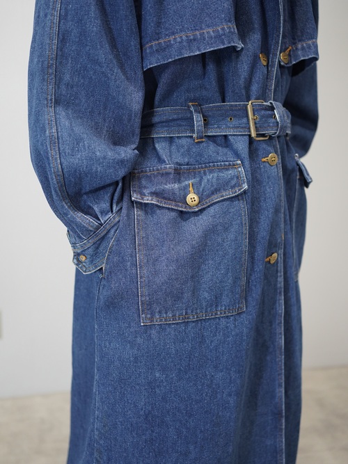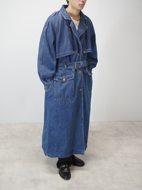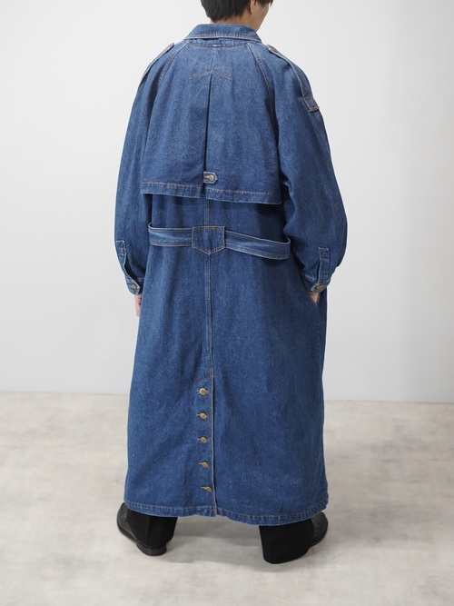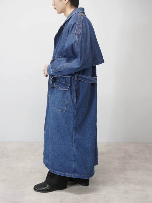 トレンチコートの構造をなぞりながら、素材をデニムに置き換えたロングコート。