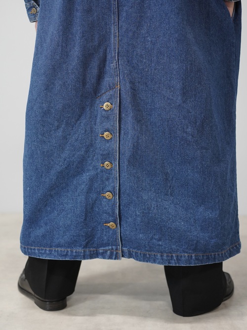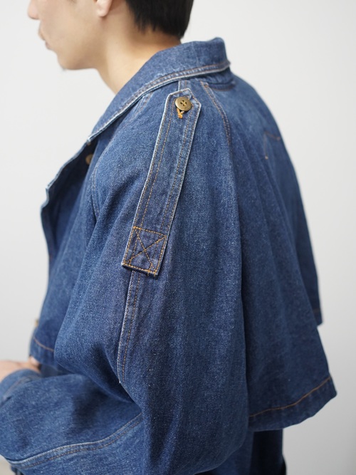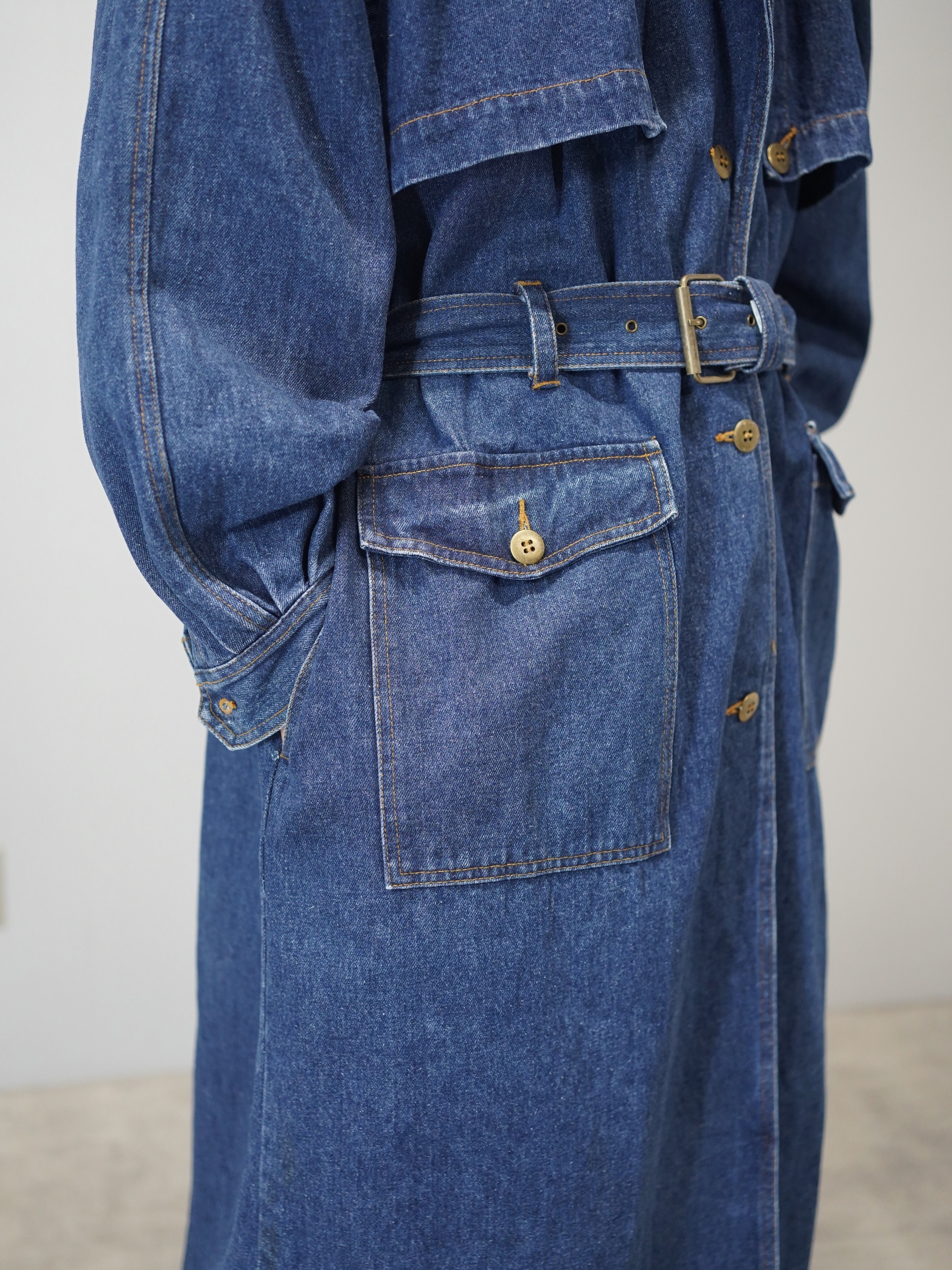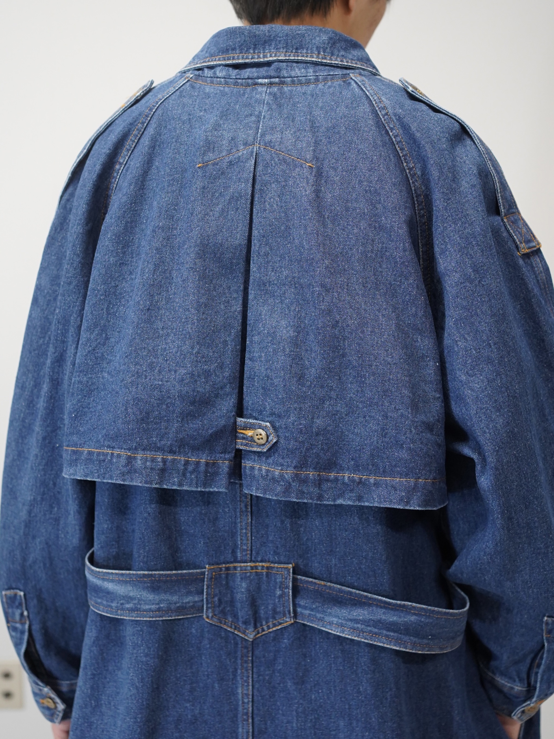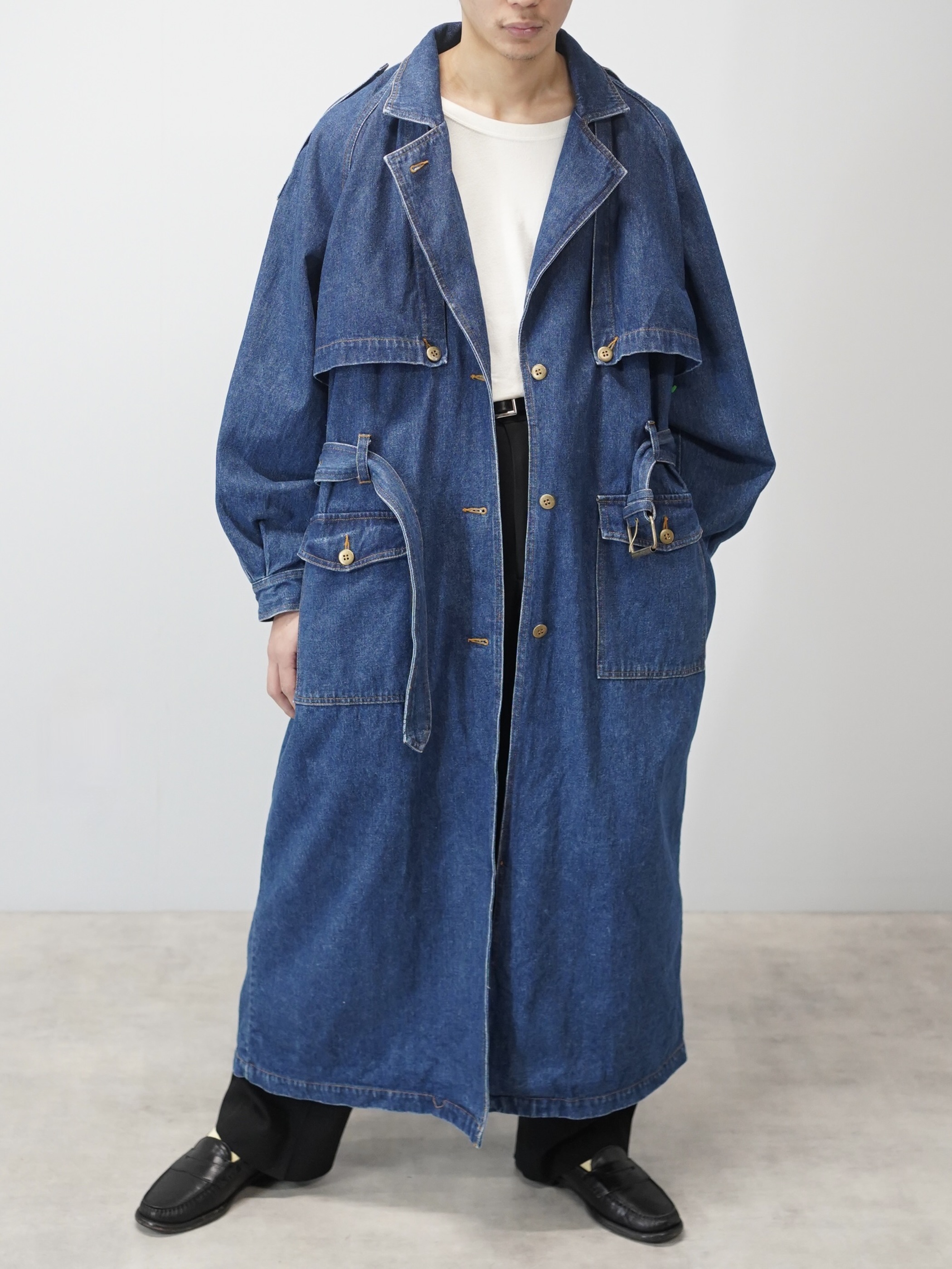 トレンチコートの構造をなぞりながら、素材をデニムに置き換えたロングコート。