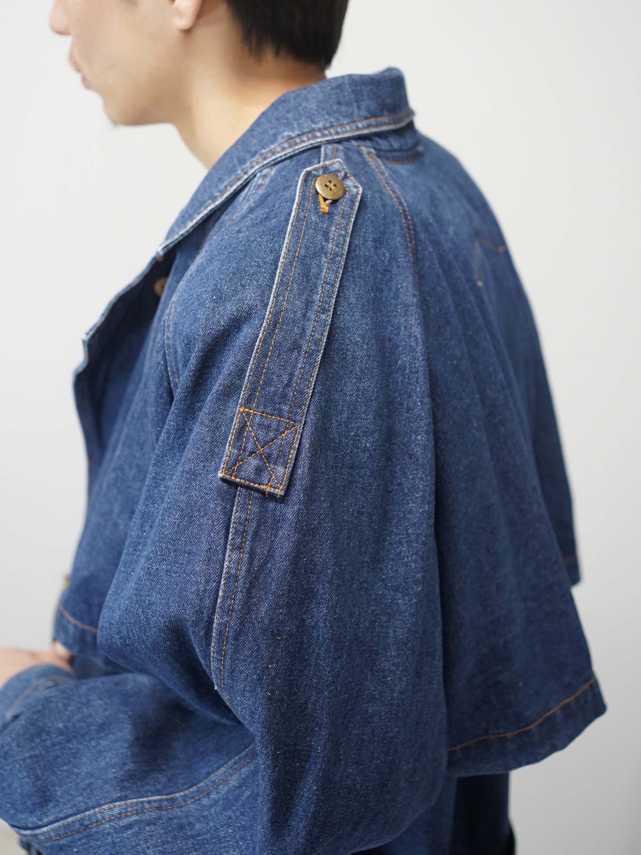 ガンフラップや背面のアンブレラヨーク、エポレット、ウエストベルトなど、クラシックなディティールを備えつつ、インディゴデニムの柔らかさが全体的な印象を少し穏やかにしています。