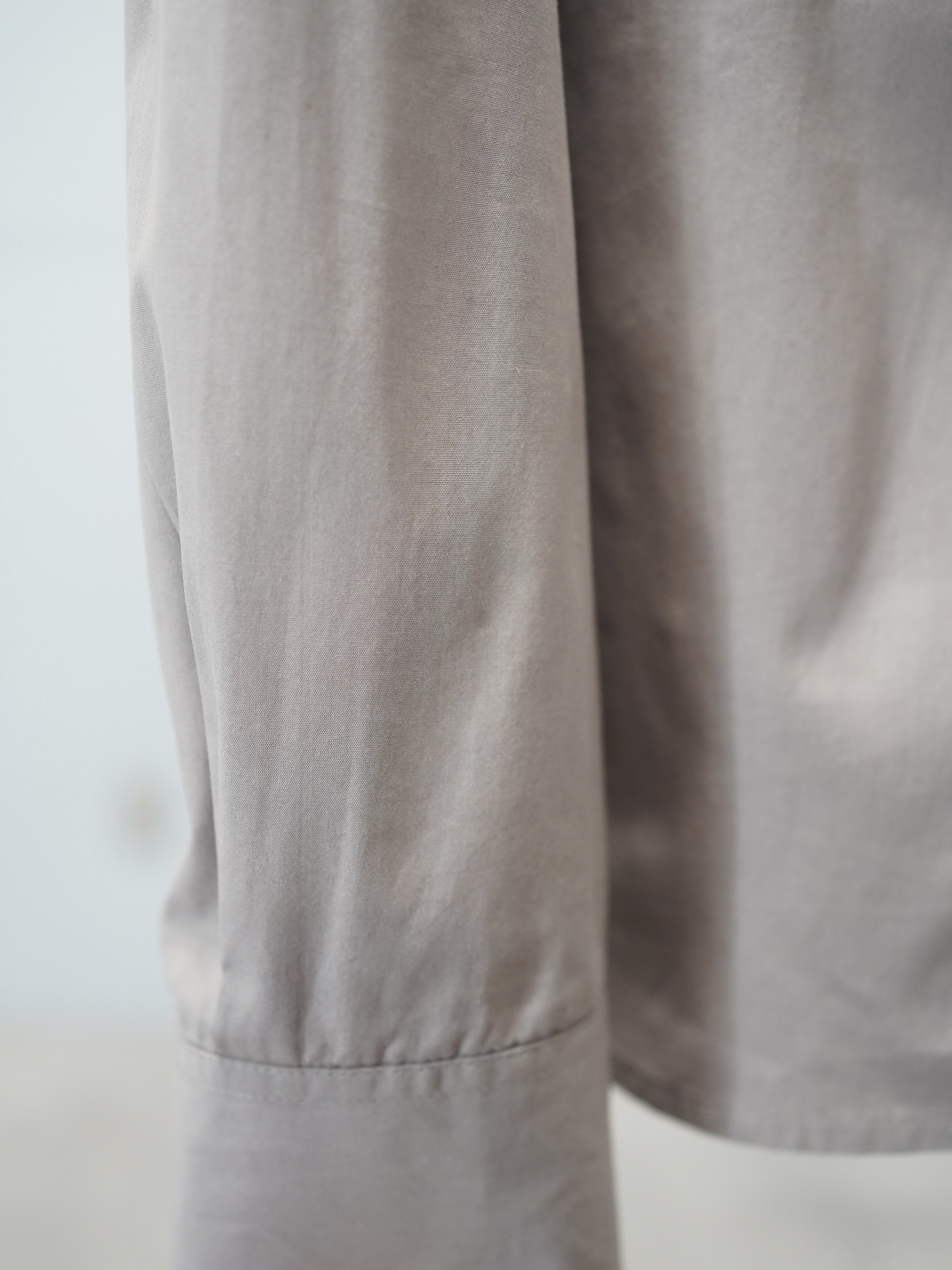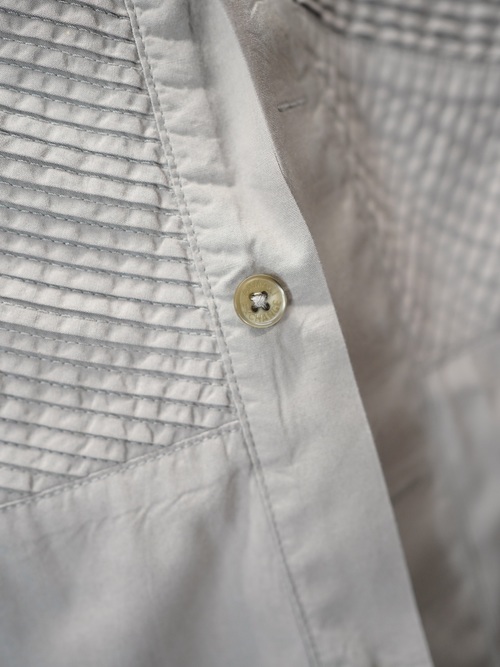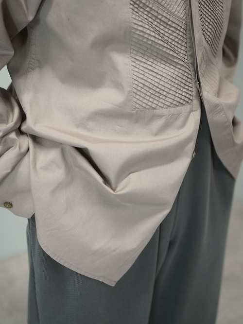 タキシードシャツなどに見られるピンタックの装飾を取り入れながらも、現代的なパターンや落ち着いた色味で日常着に馴染む塩梅に。