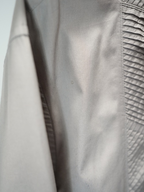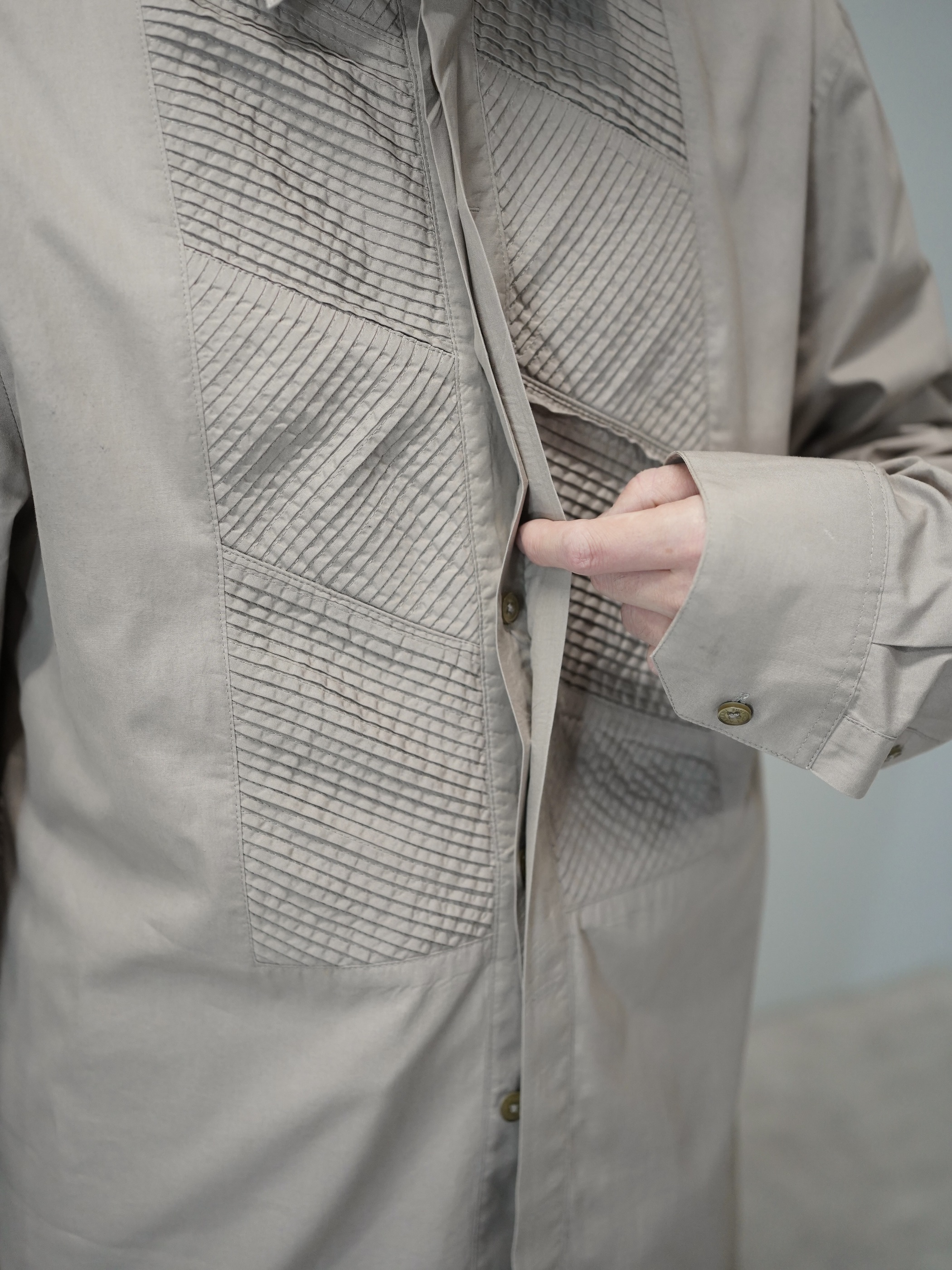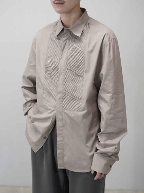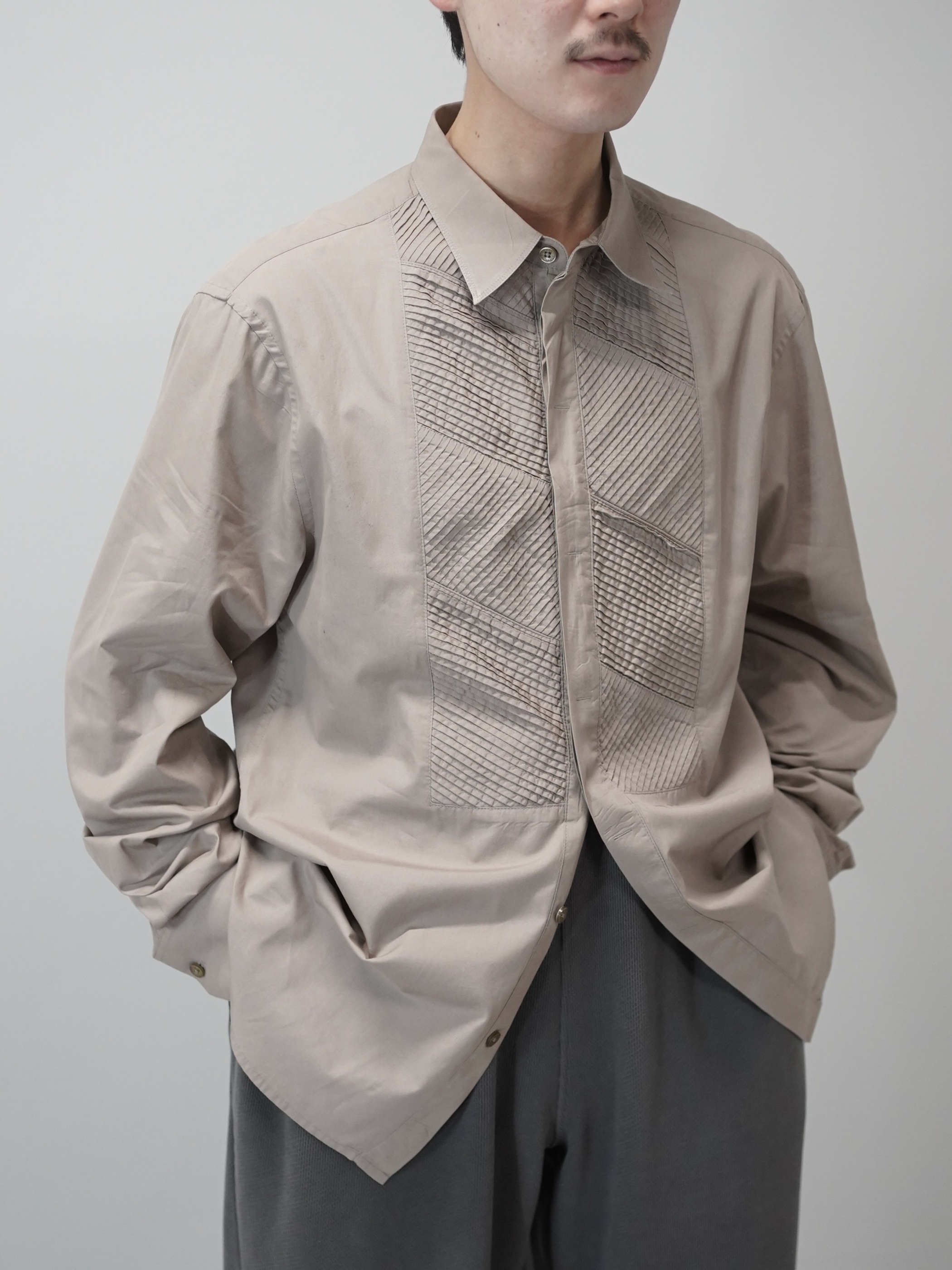 斜めのラインを組み合わせた幾何学的な切り替え、ピンタックデザインシャツ。