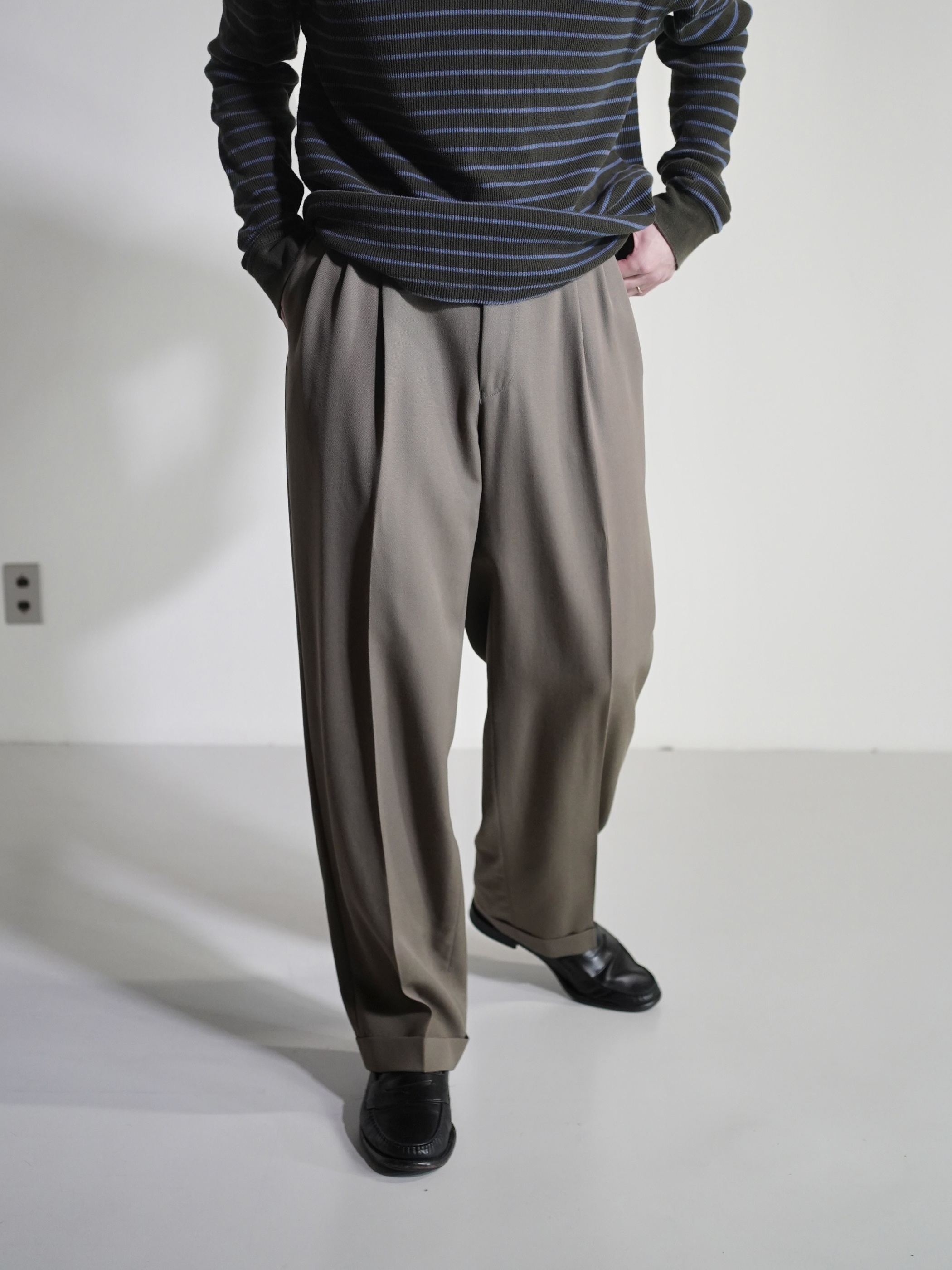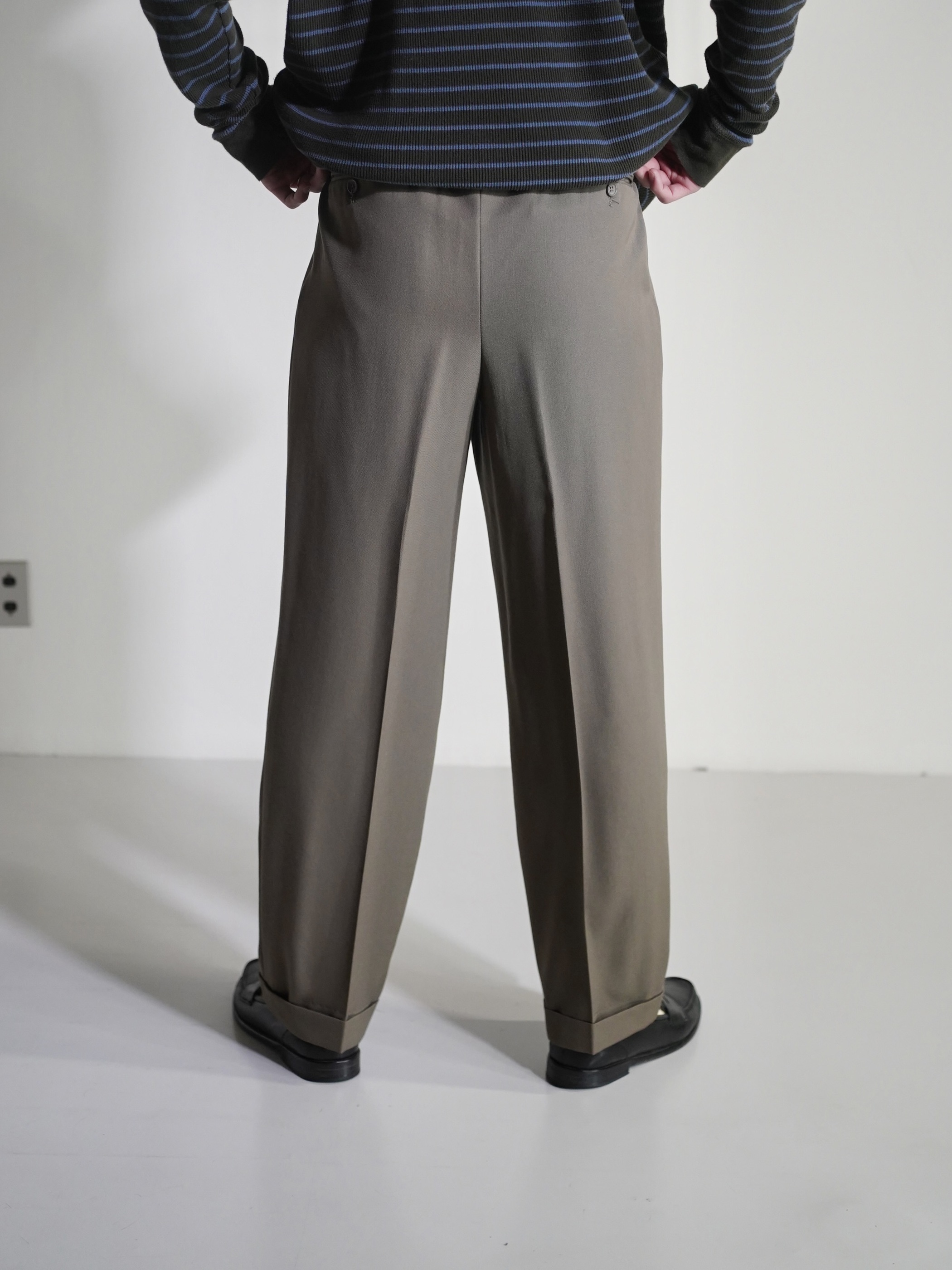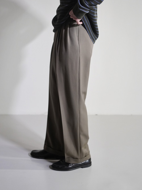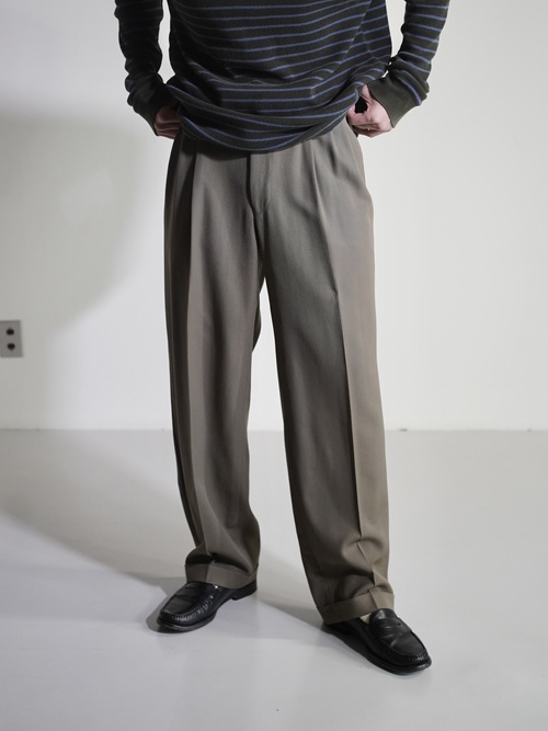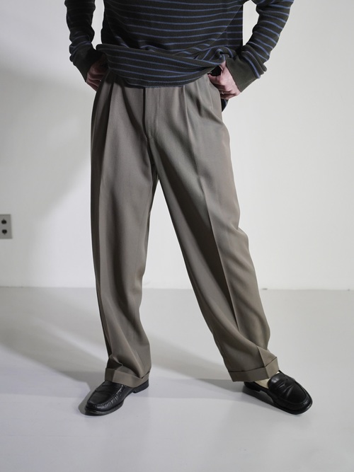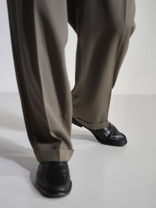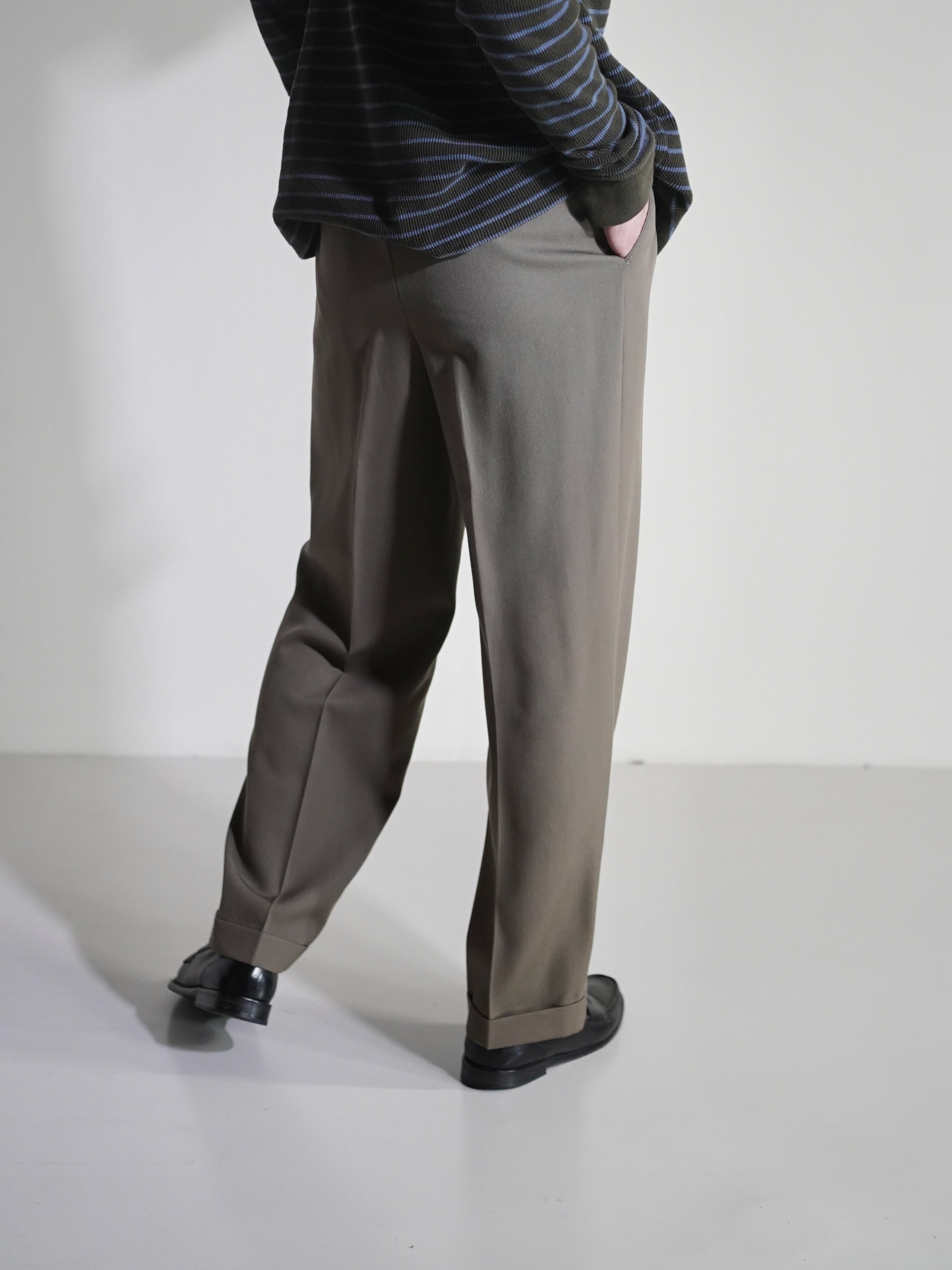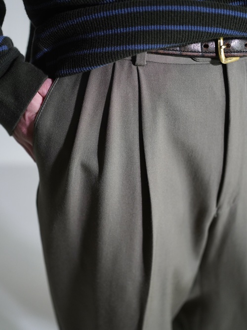 アダルティな暗いカーキベージュの陰影が素敵なスラックスです。