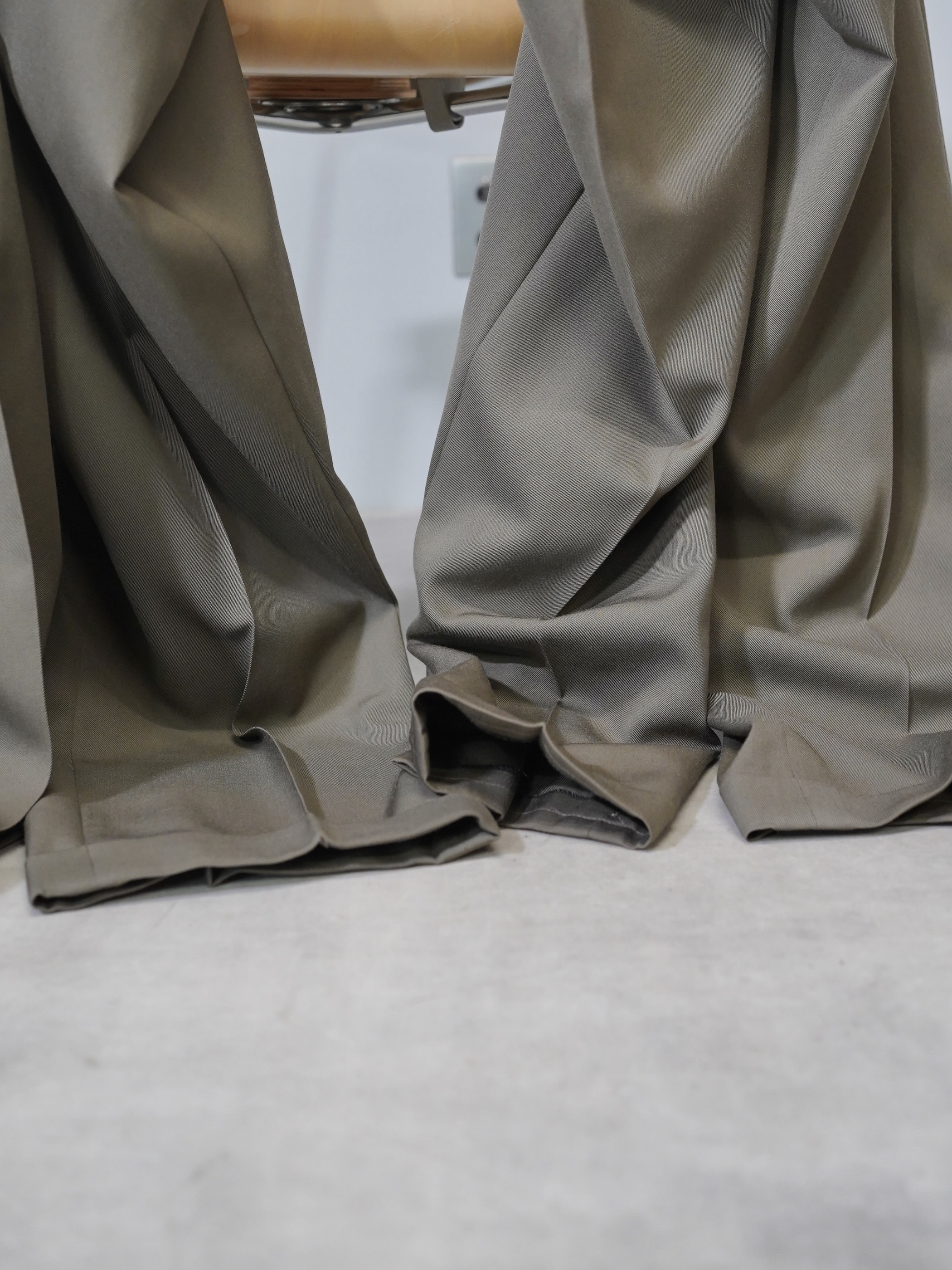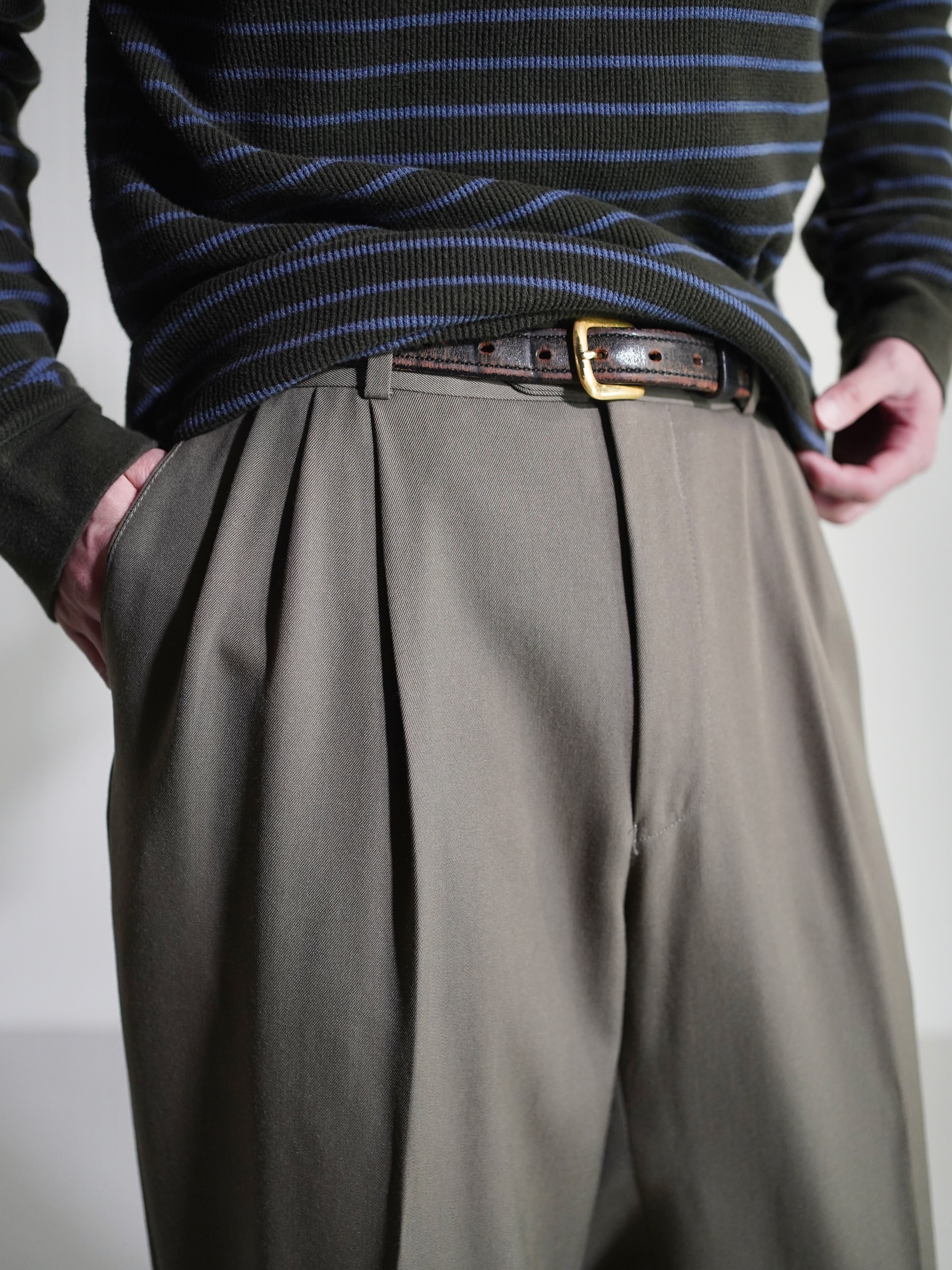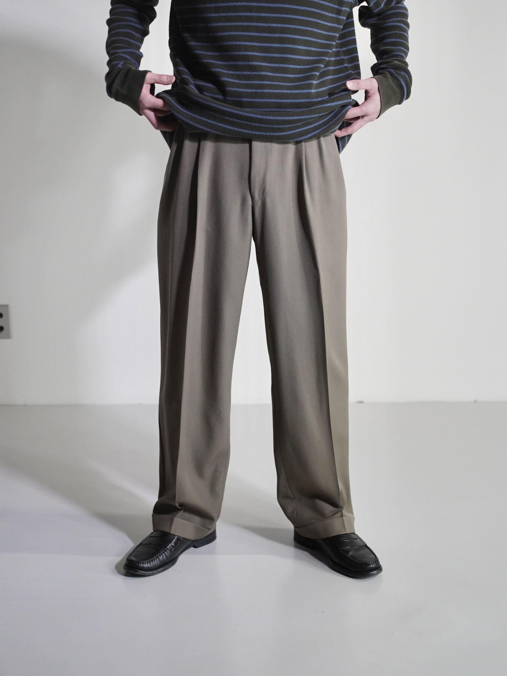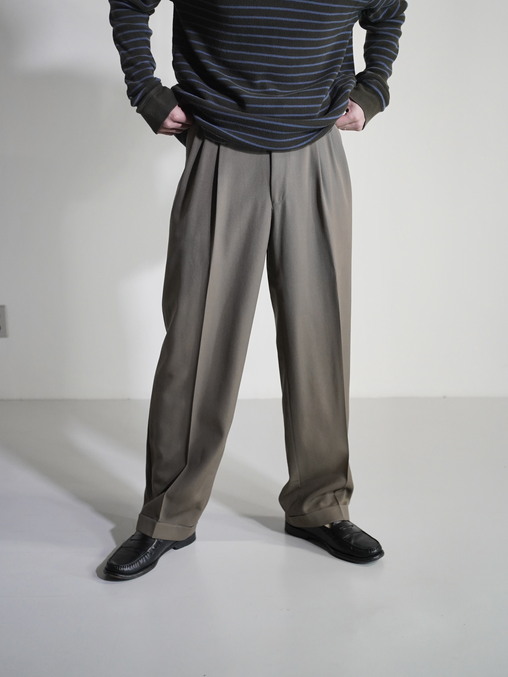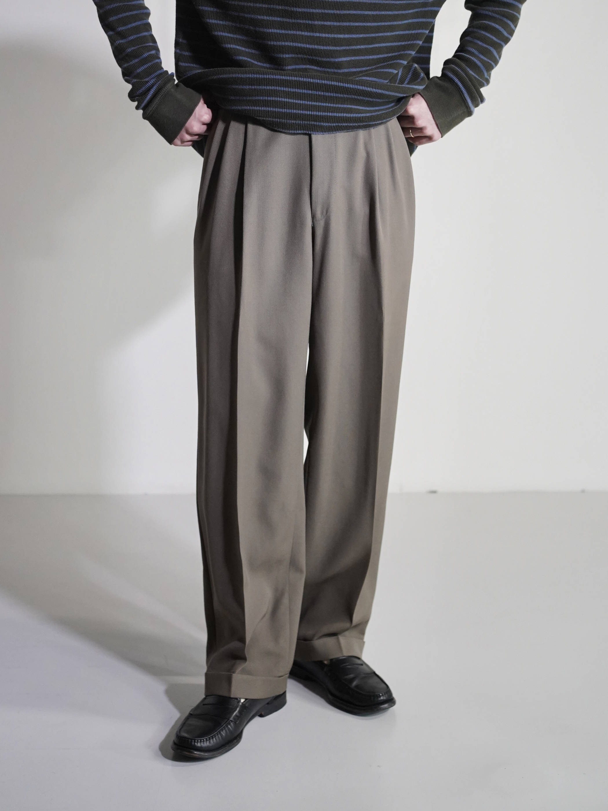 アダルティな暗いカーキベージュの陰影が素敵なスラックスです。