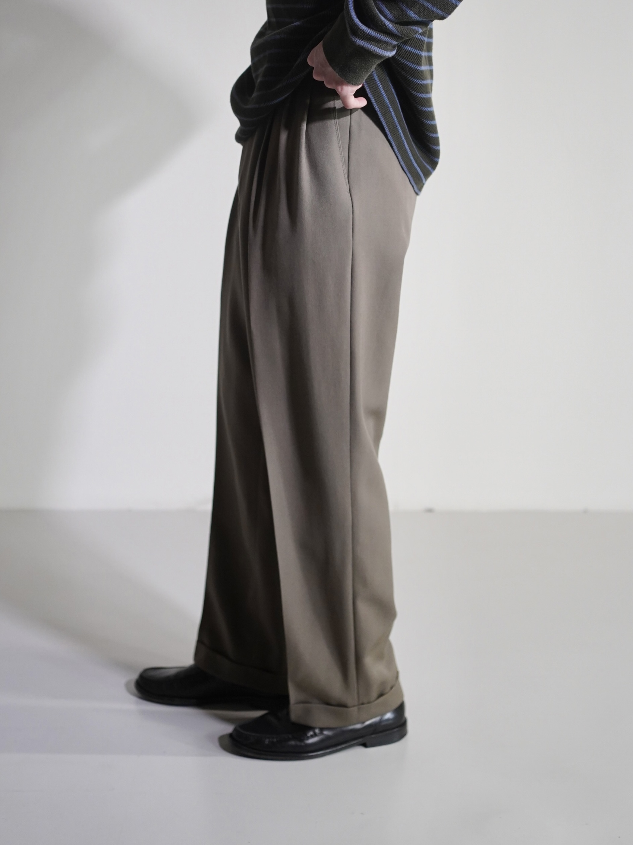 ワイドなシルエットからくる生地量が、揺れる色気と重厚ながら空気感のあるドレープを実現しています。