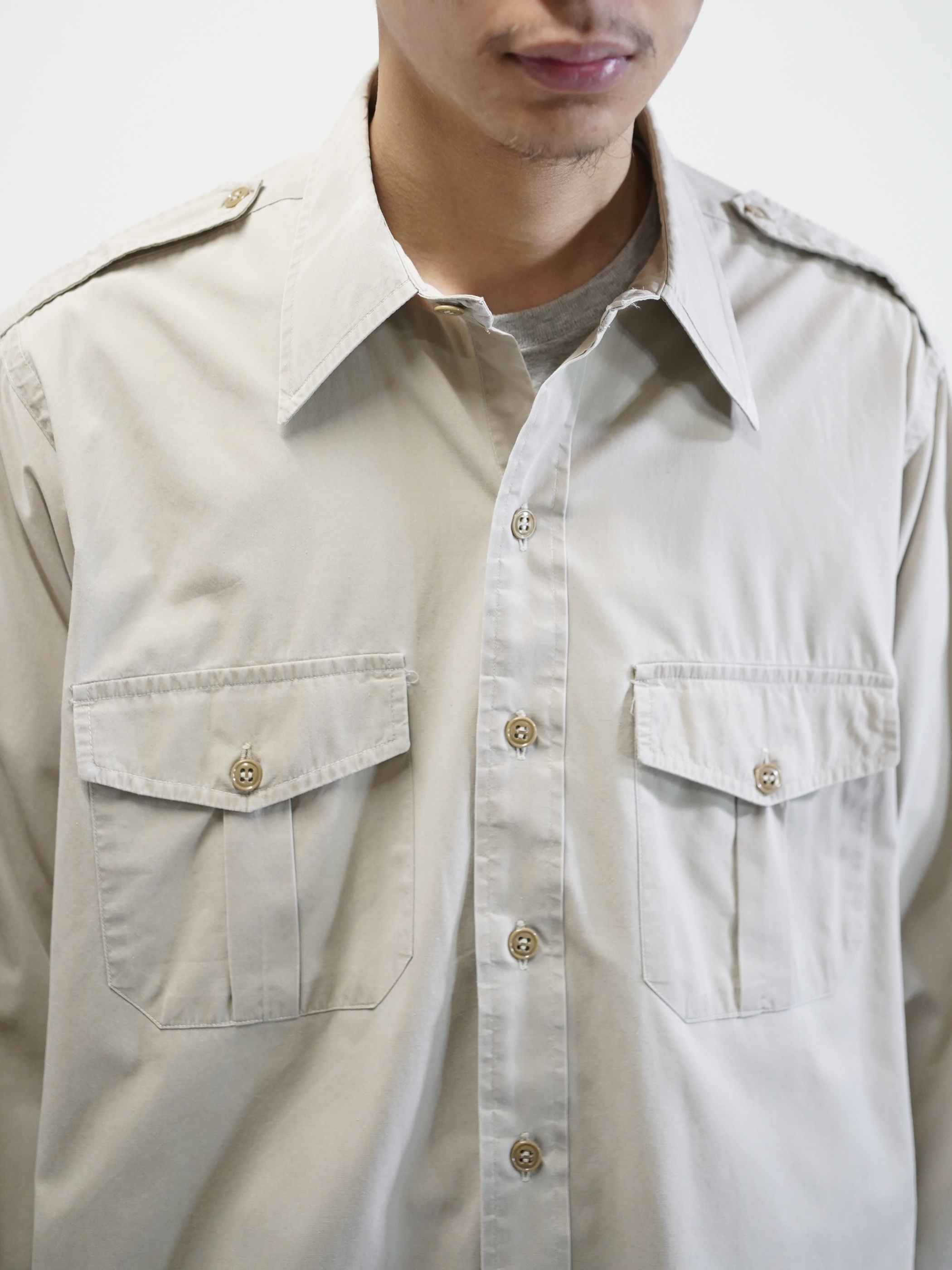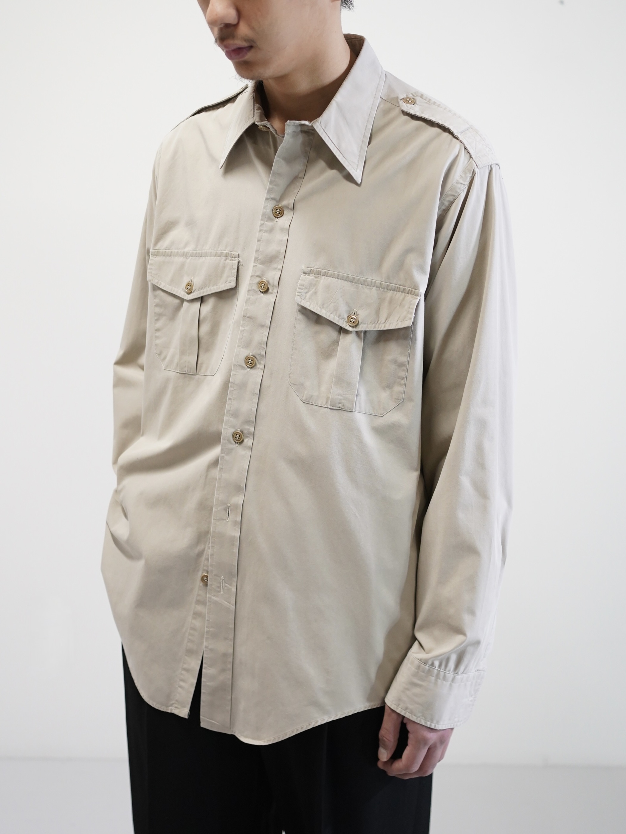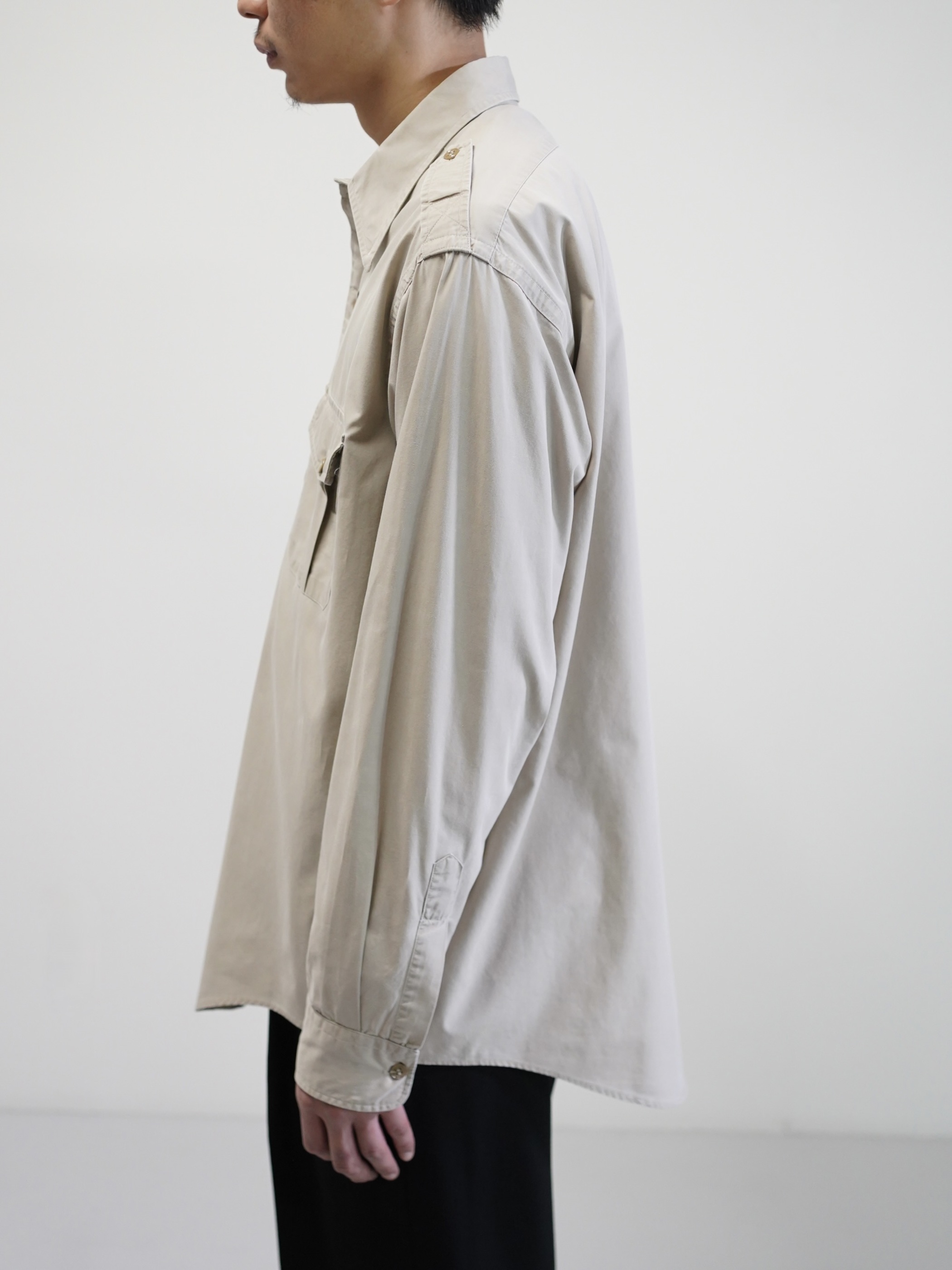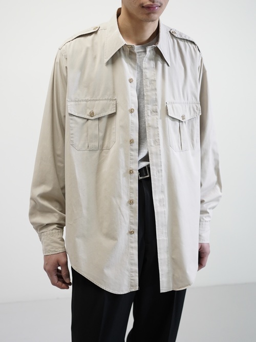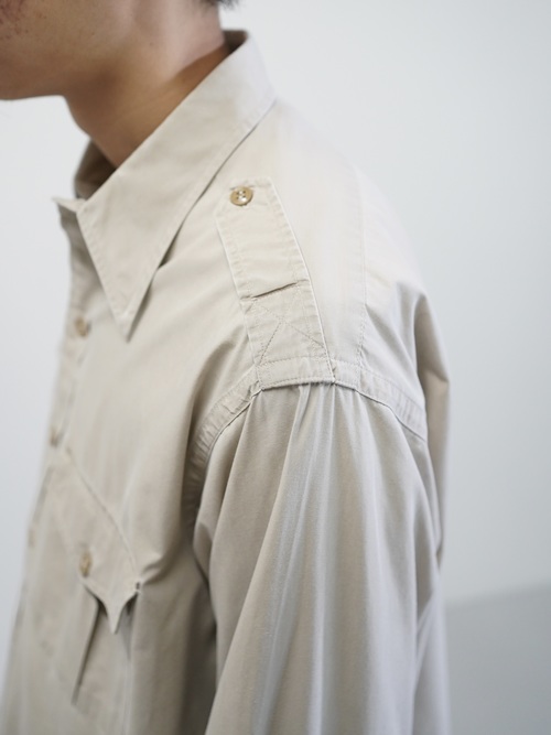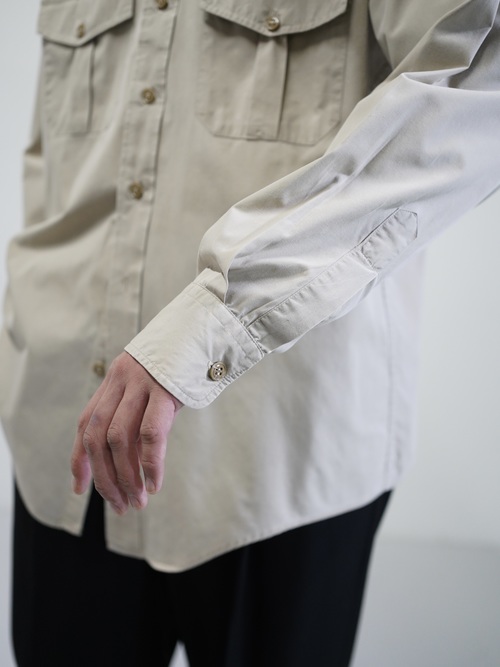 エポレットや両胸のフラップポケットといった、フィールドウェア由来のディティールを備えながらも、そうした背景を前に出しすぎないサファリシャツ。