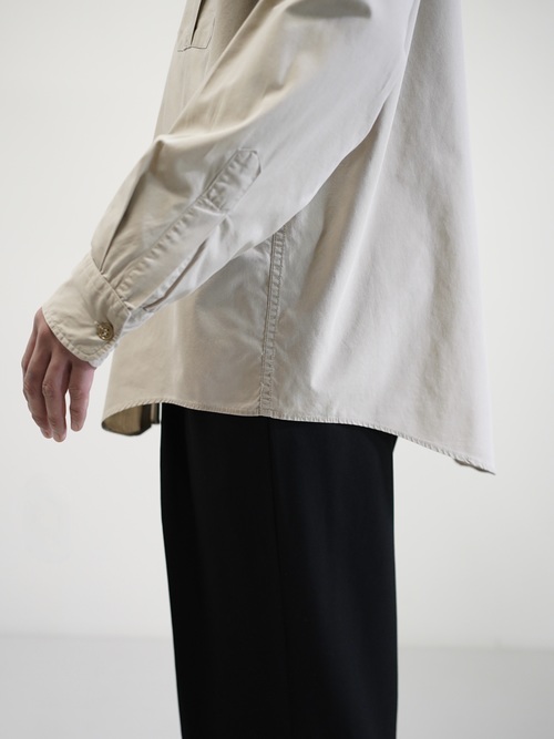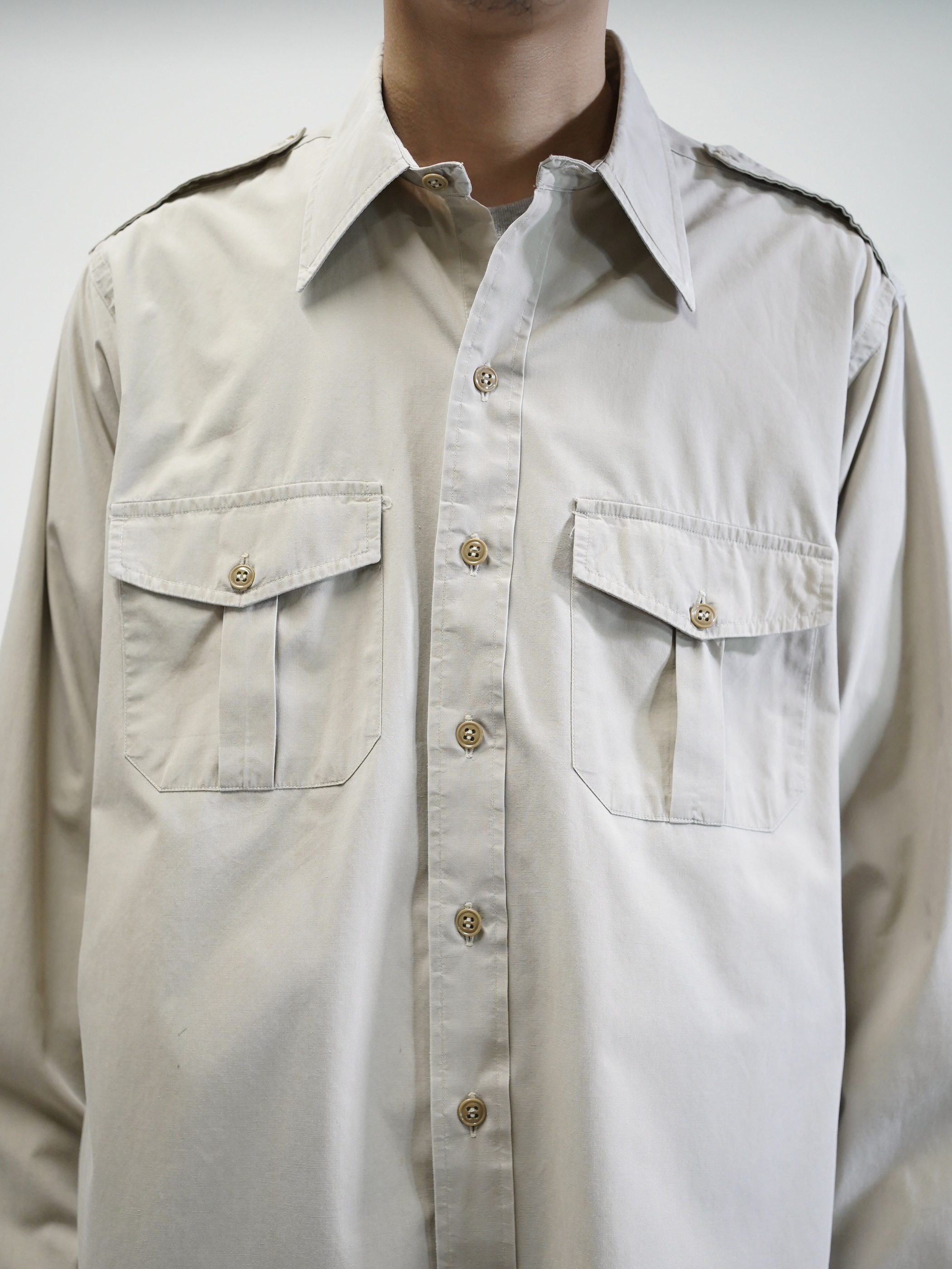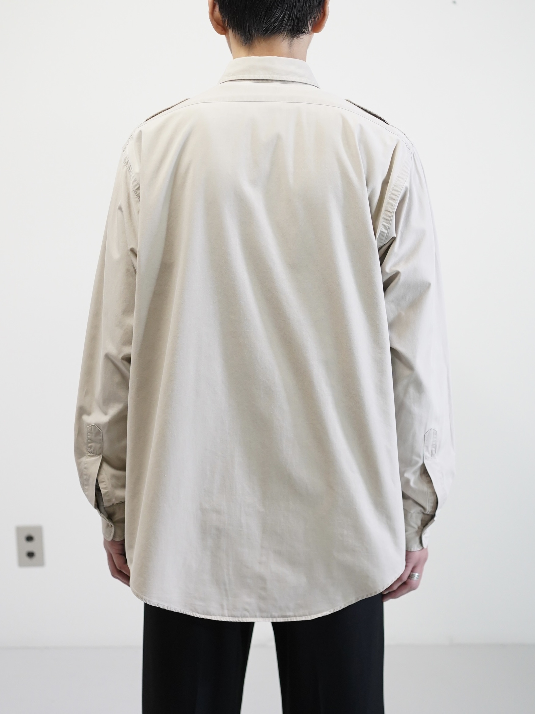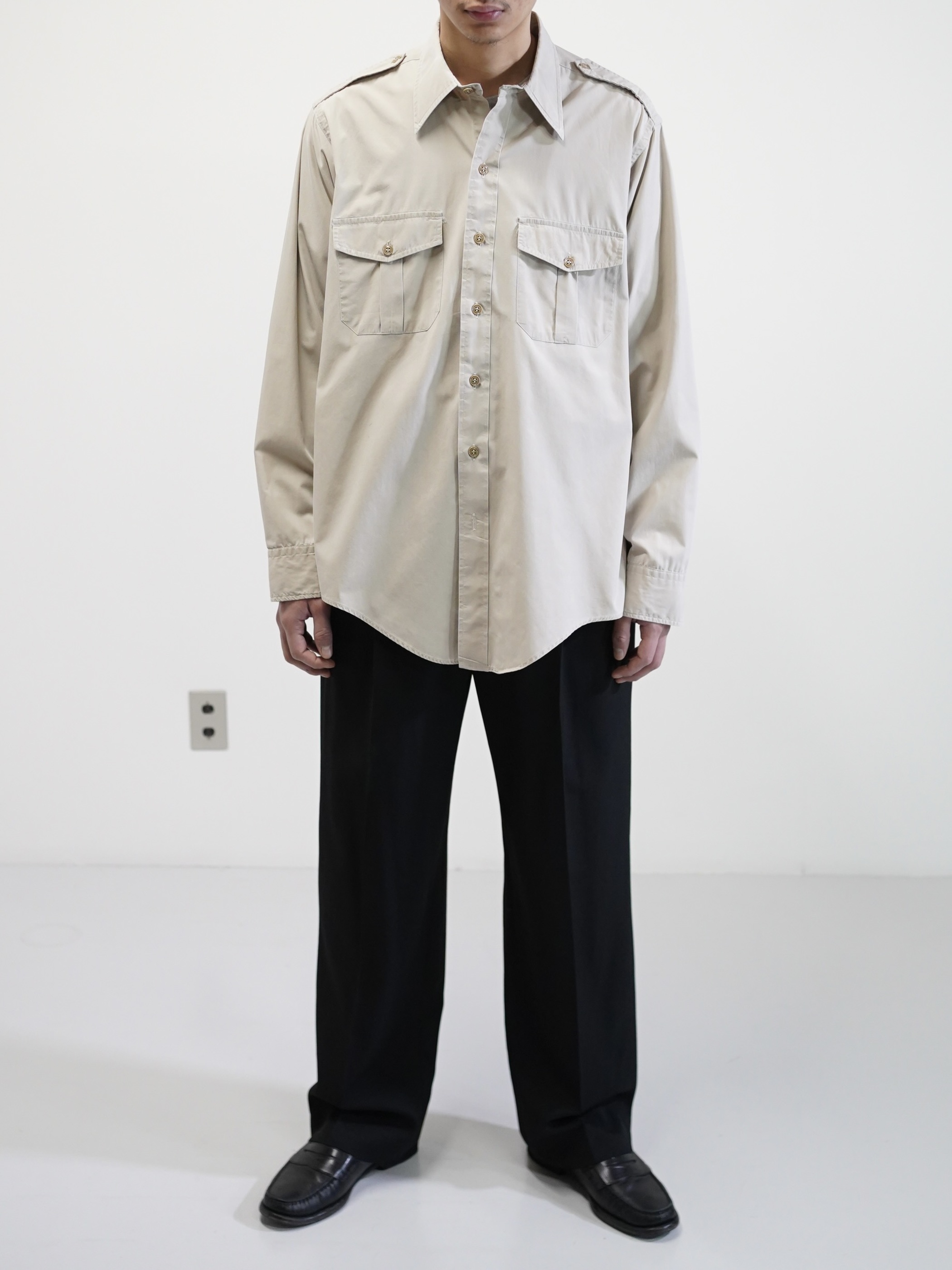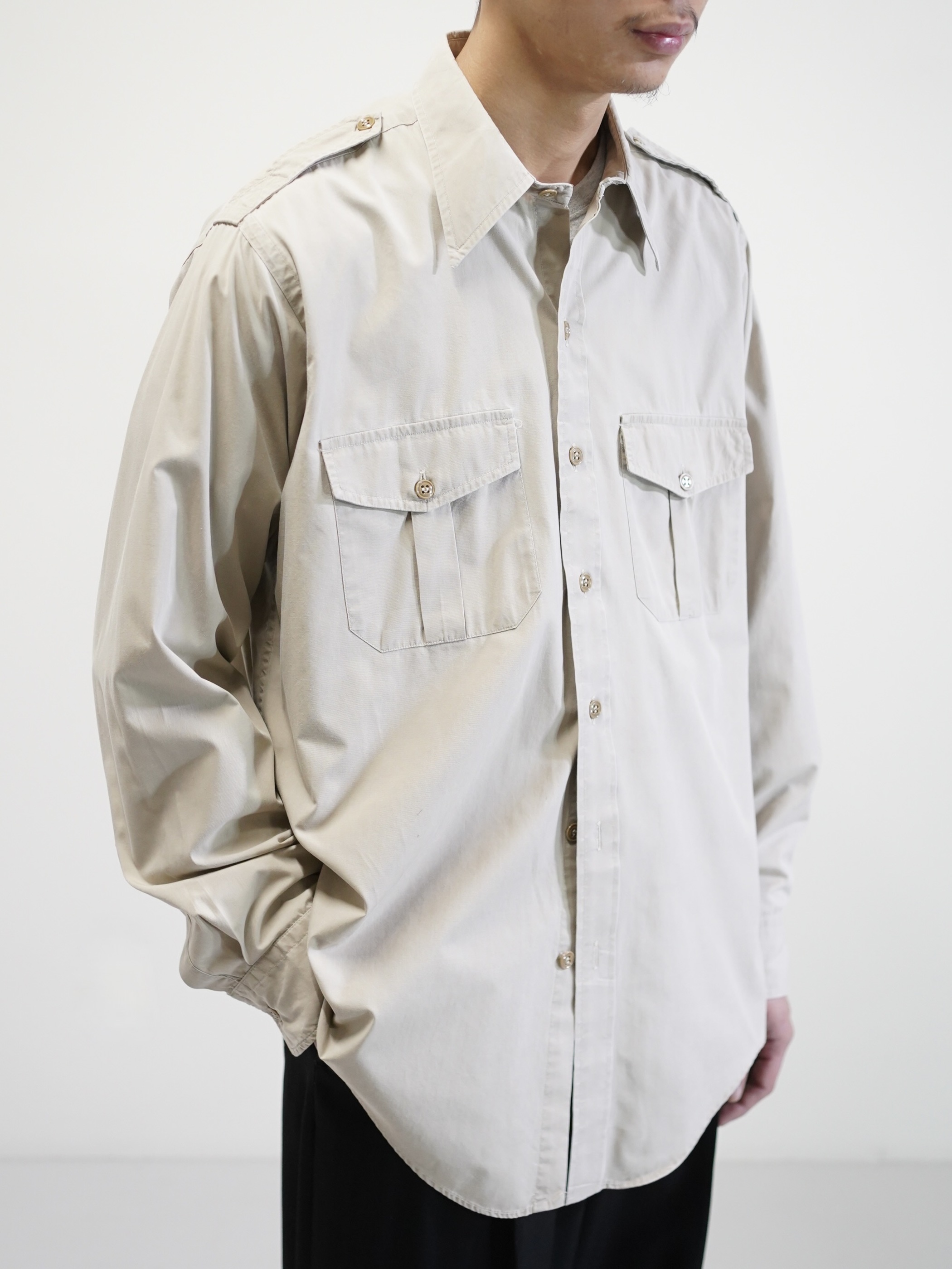 エポレットや両胸のフラップポケットといった、フィールドウェア由来のディティールを備えながらも、そうした背景を前に出しすぎないサファリシャツ。