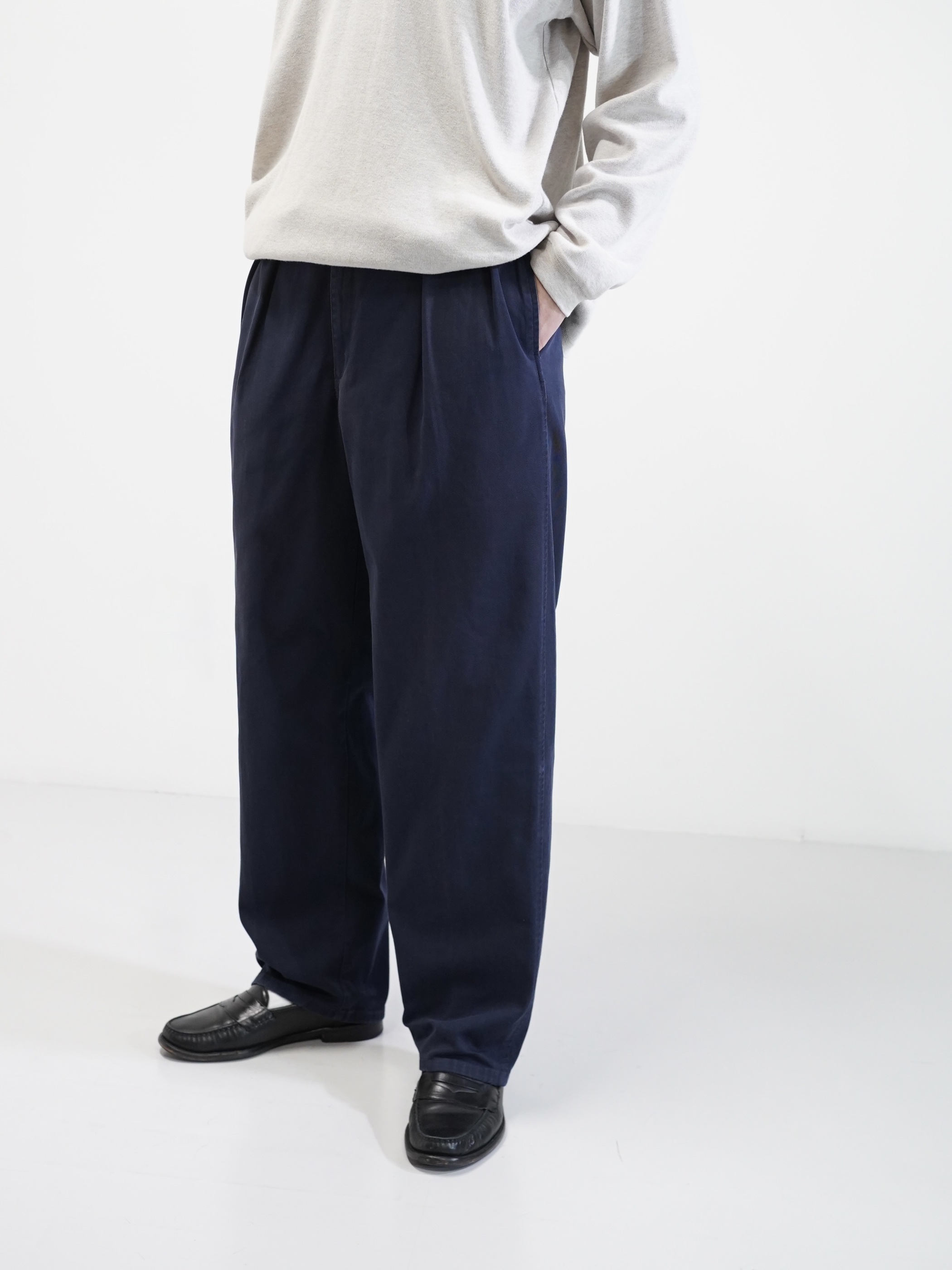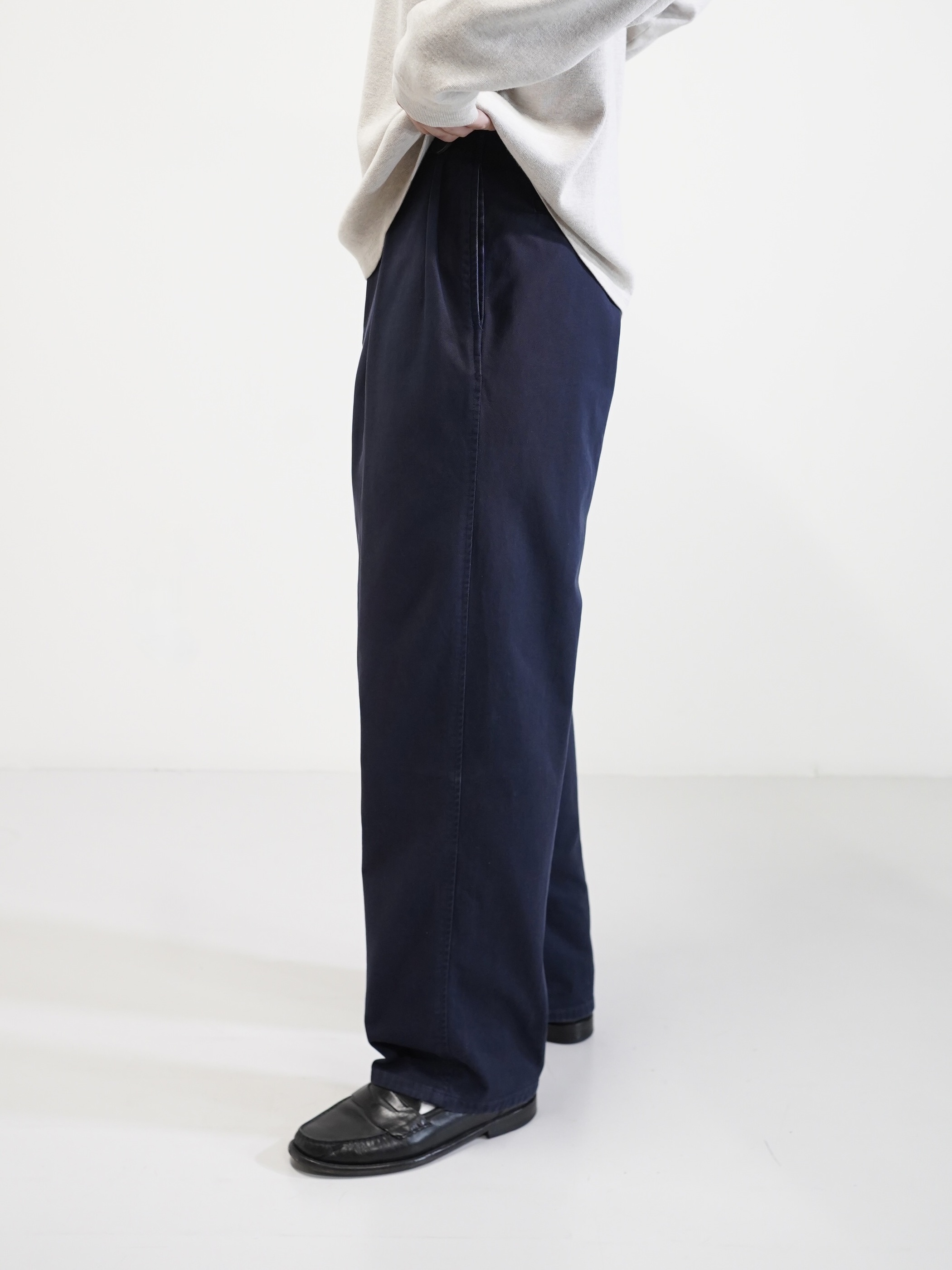 裾に向かって極端にテーパードしすぎない素直なライン。太さはありつつも整ったこの年代ならではのシルエット。