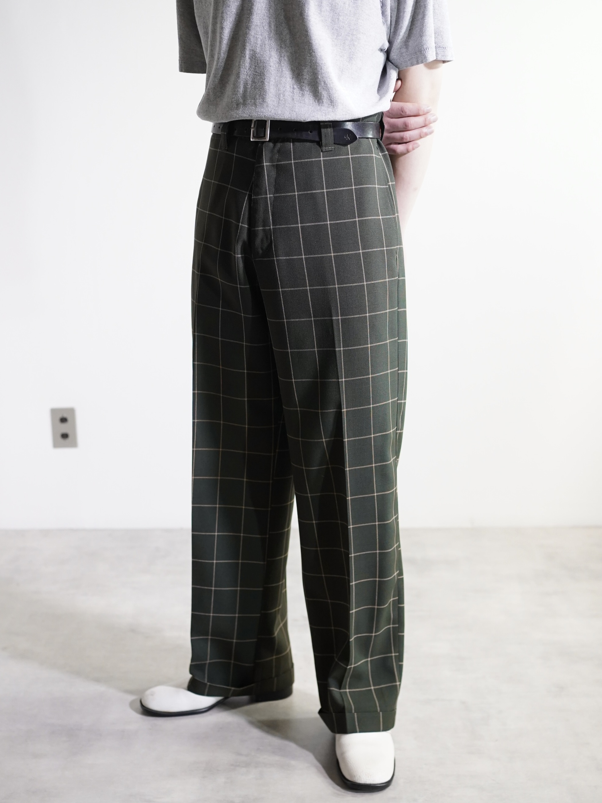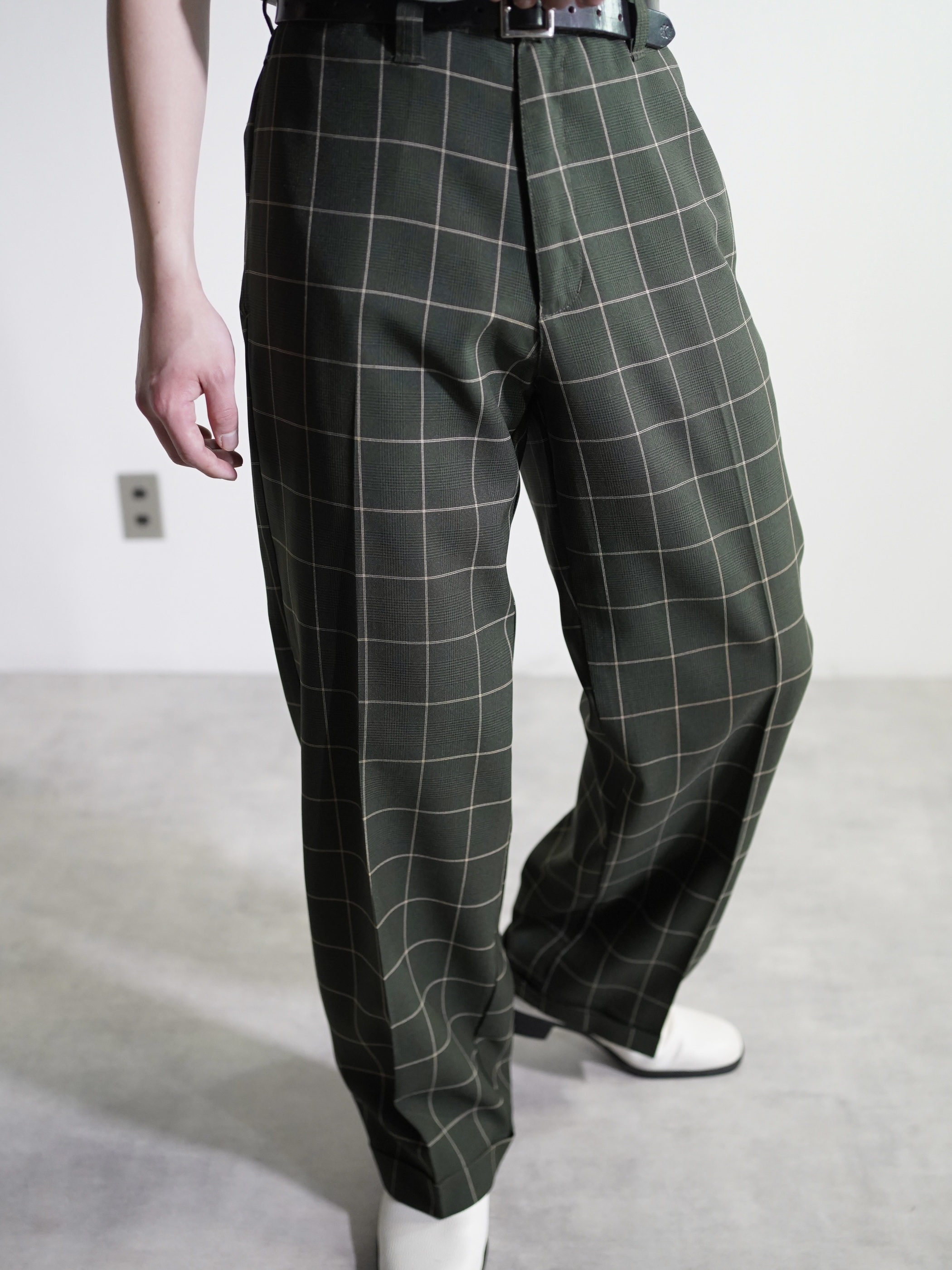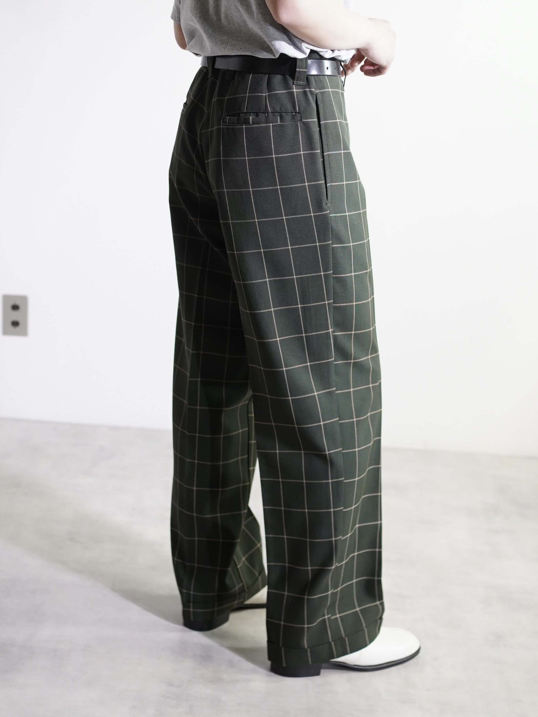 1990's Kik Wear glen&windowpane check poly rayon ”No tuck” wide slacks/Made in USA
