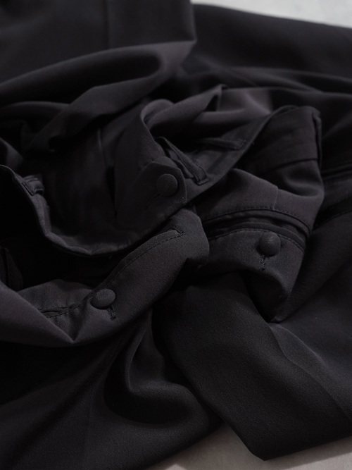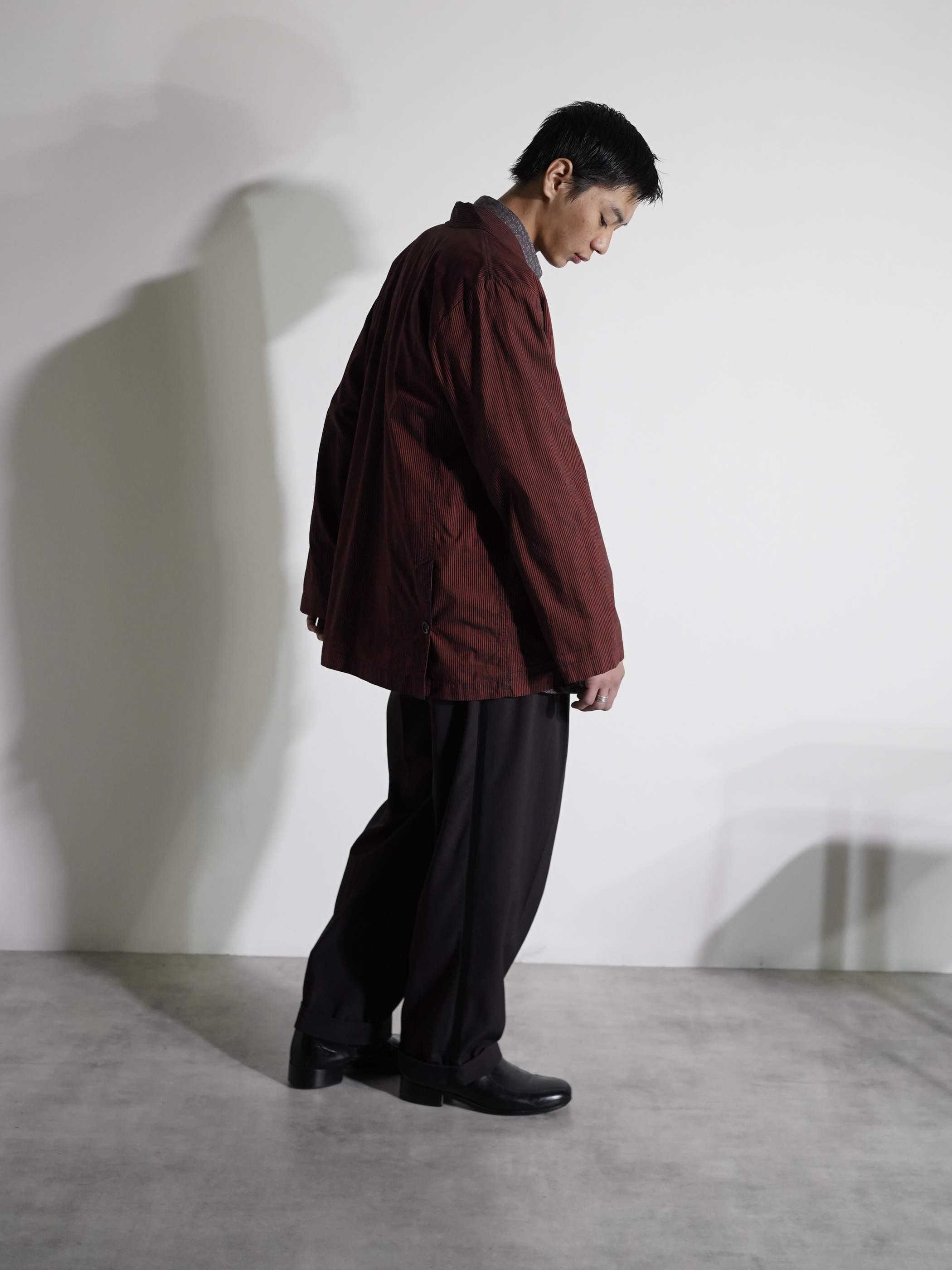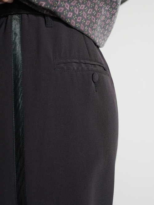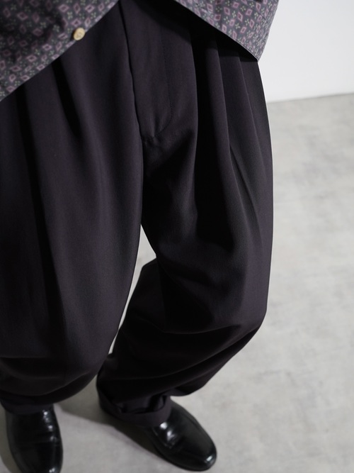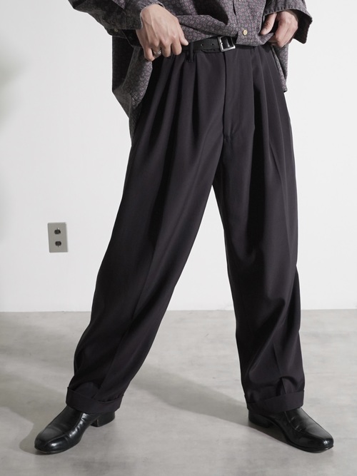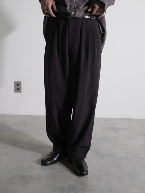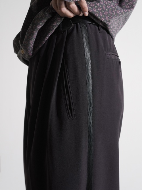 広いワタリとサージの重さで揺れるシルエットは、どこかズートを思わせる佇まい。