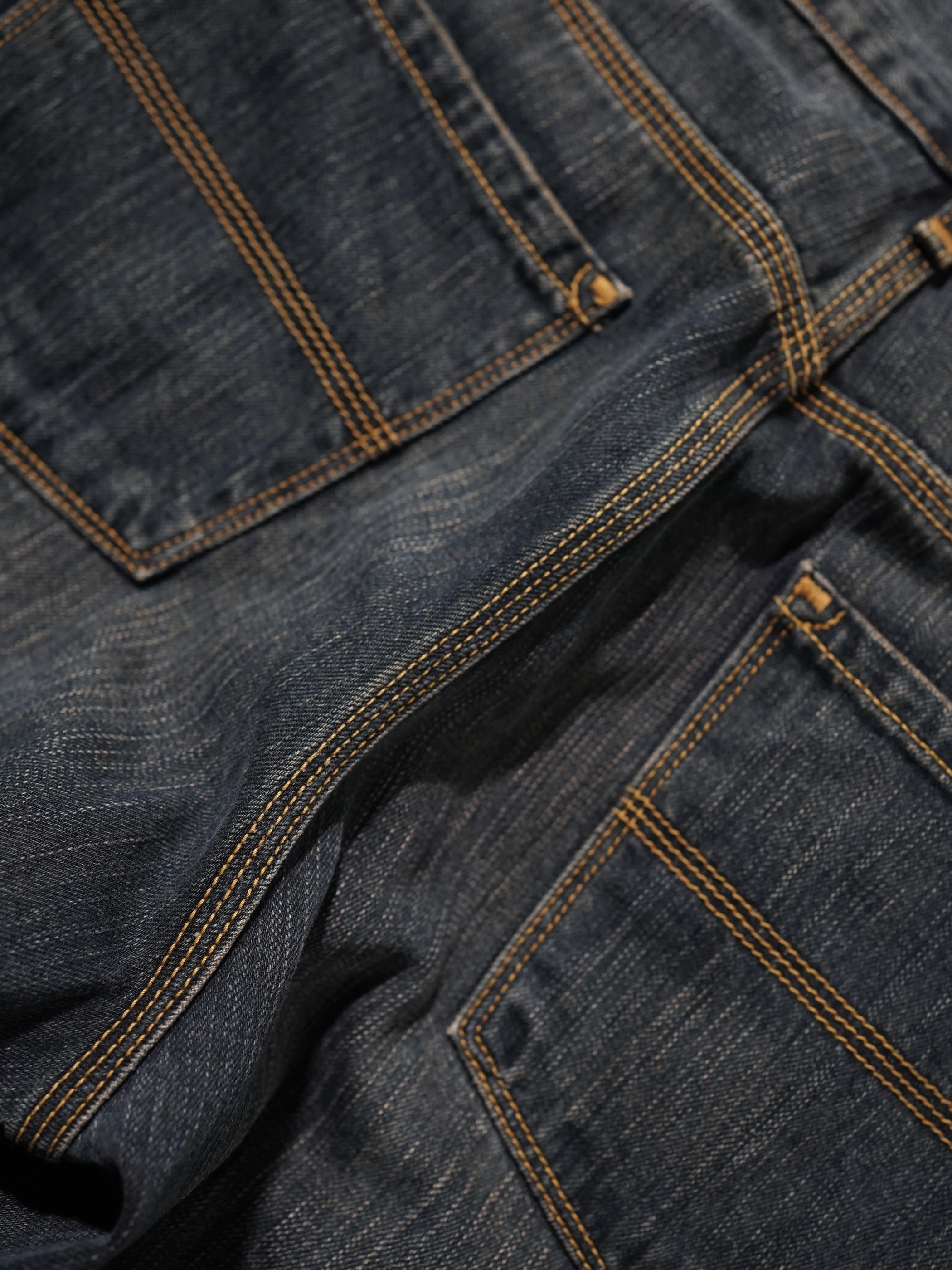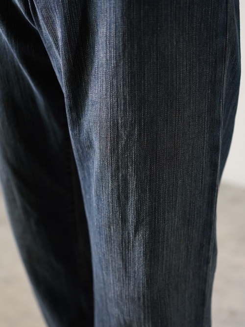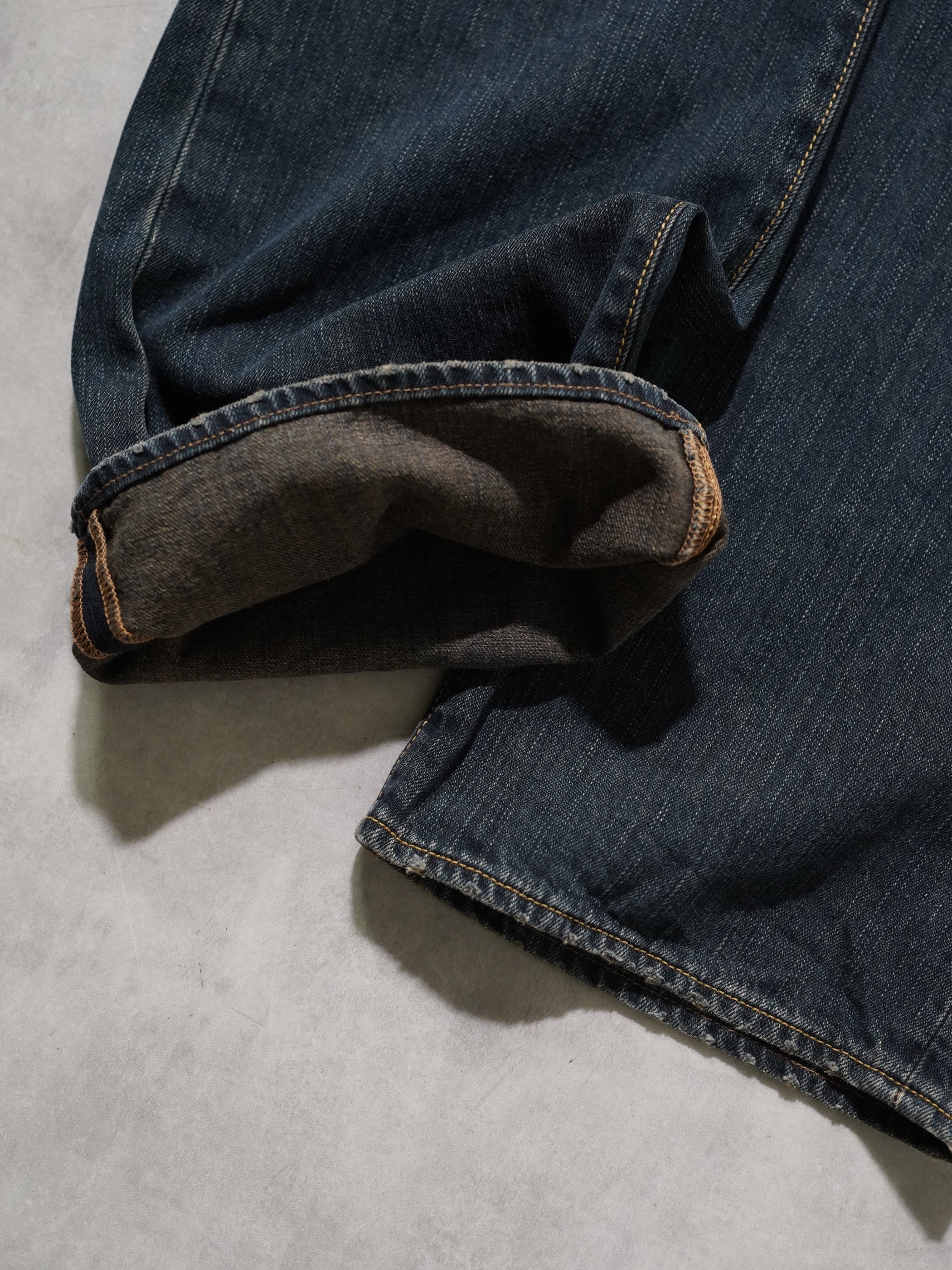 ベージュ系の裏糸を使用したゴールドインディゴボディ。煙たい空気感を演出。