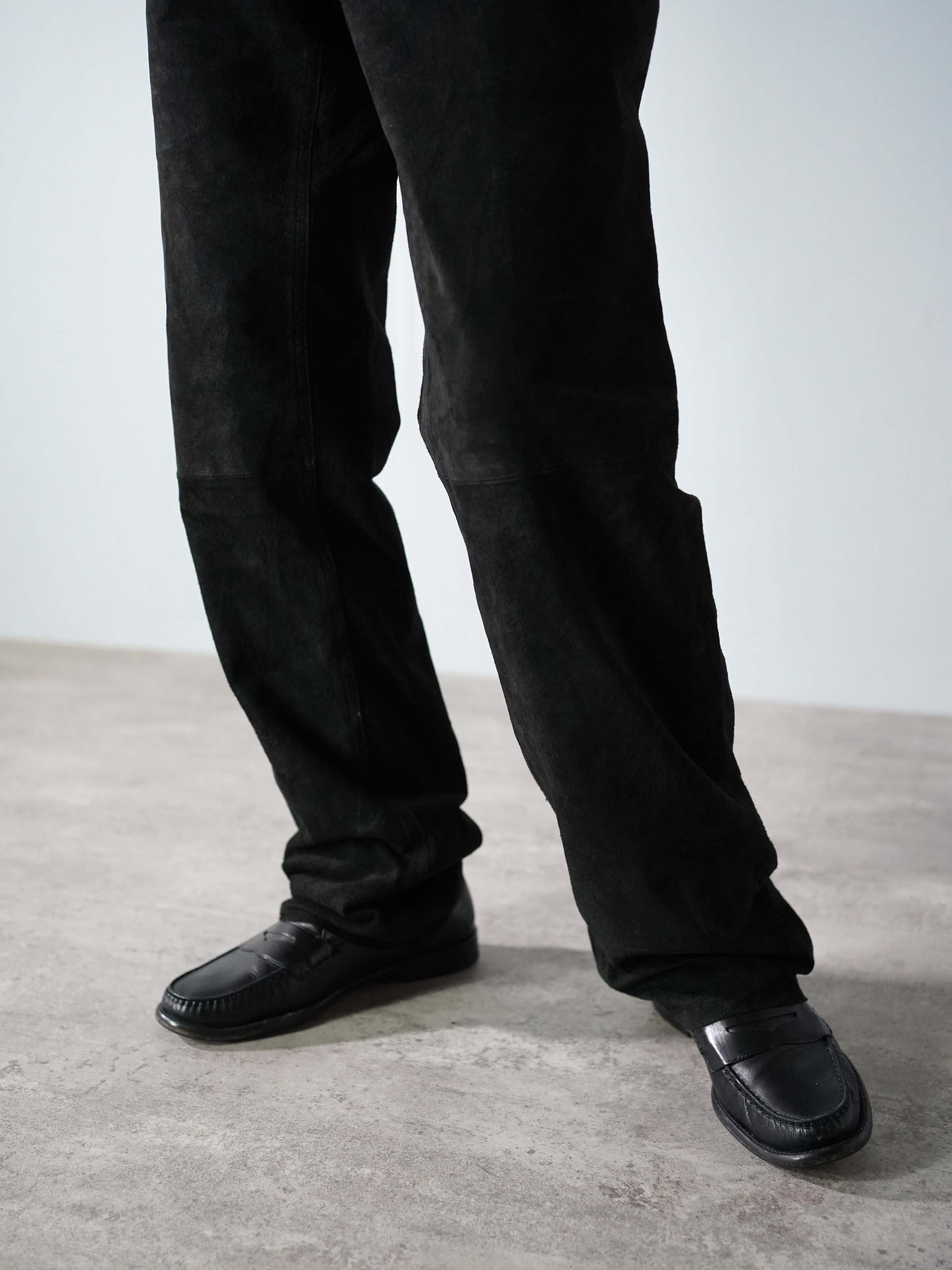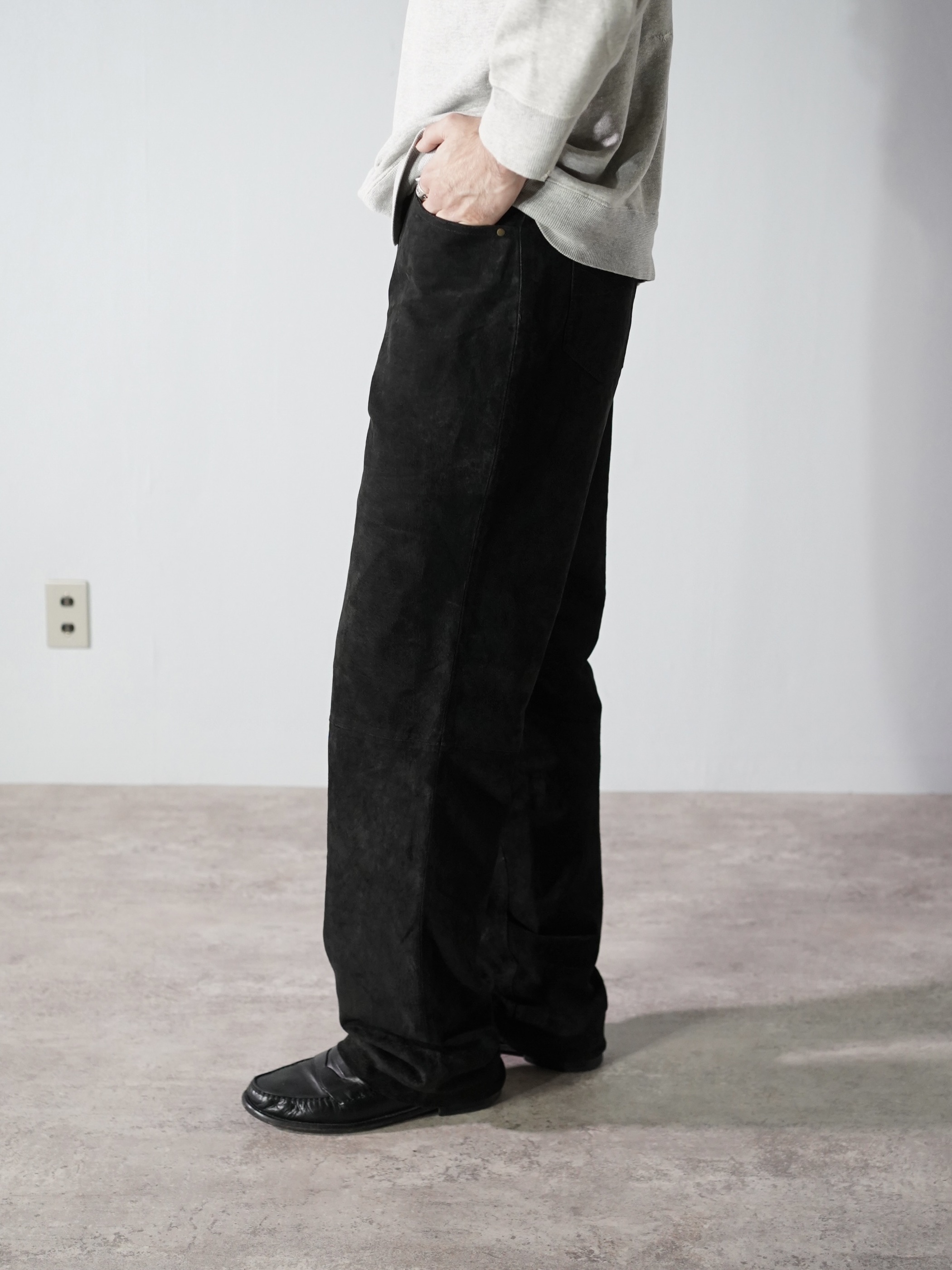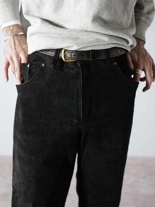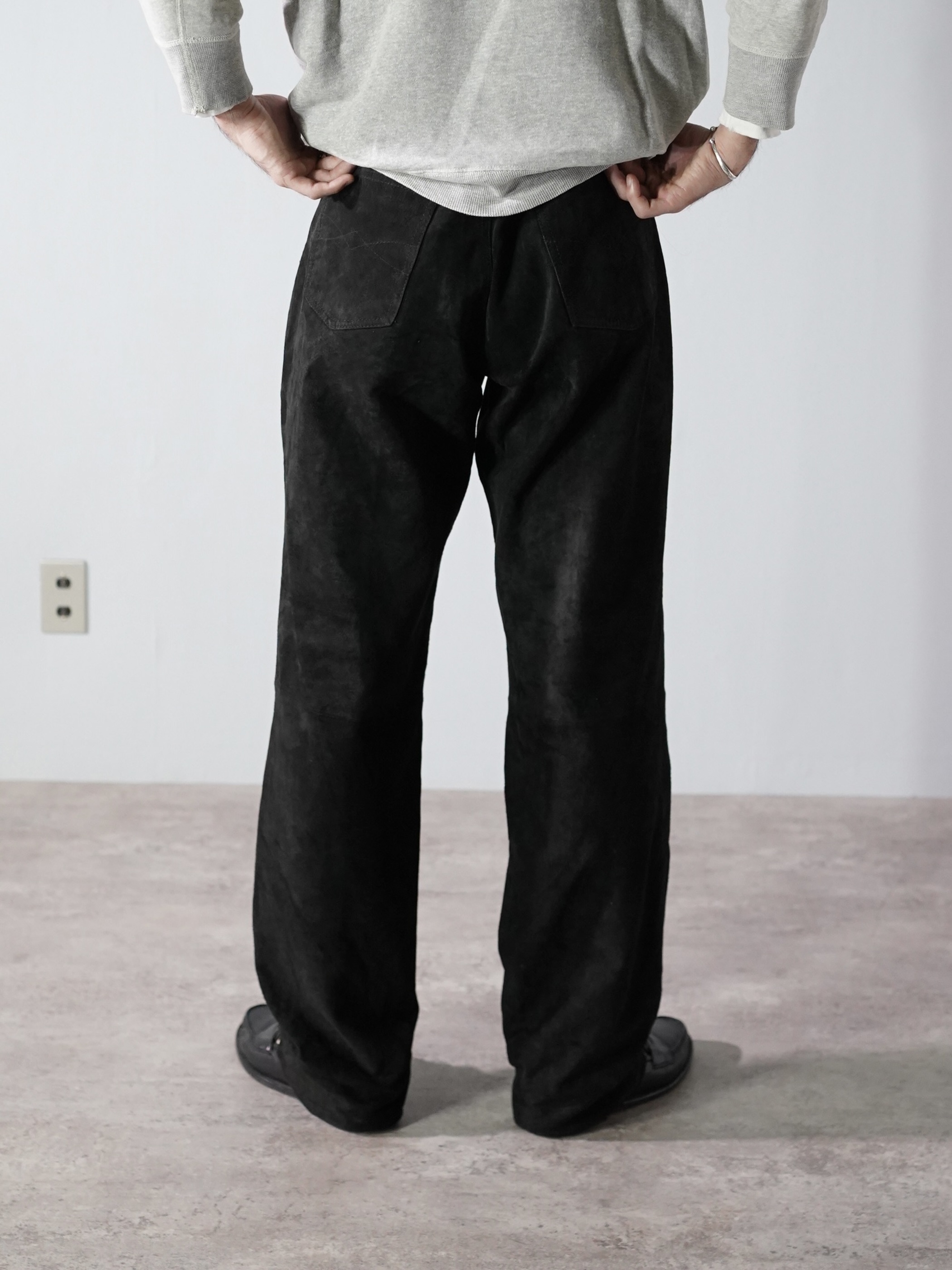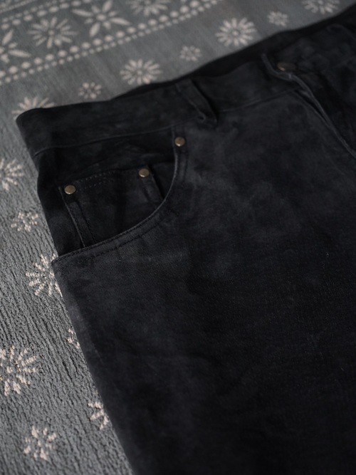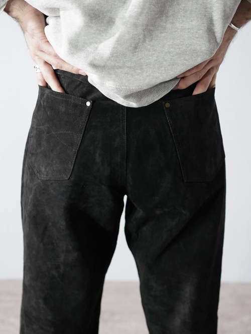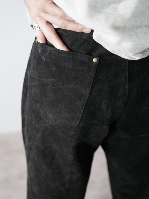 多くの方に馴染み深いジーンズの5ポケットデザインを、しなやかなスエードレザーを用いて再構築した一本。
