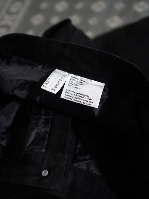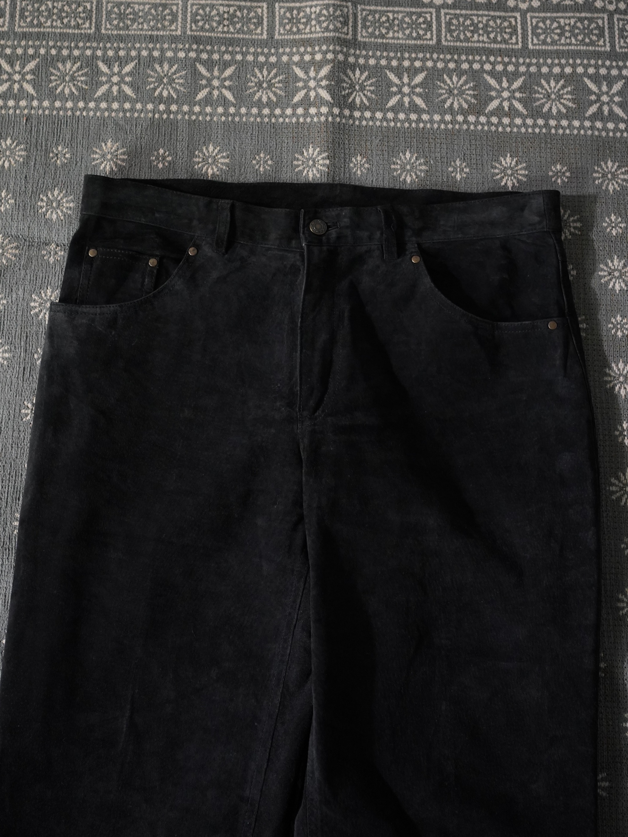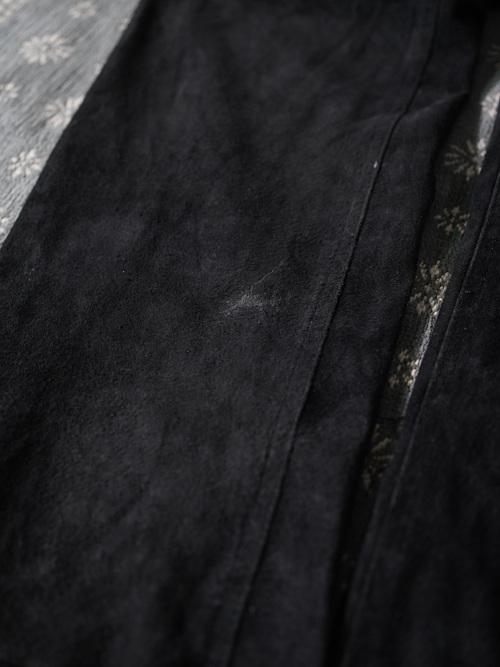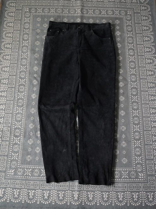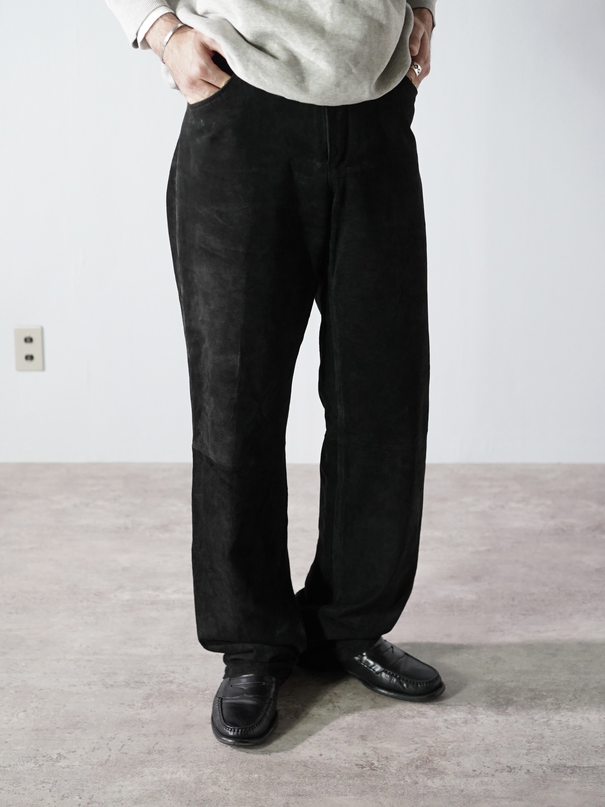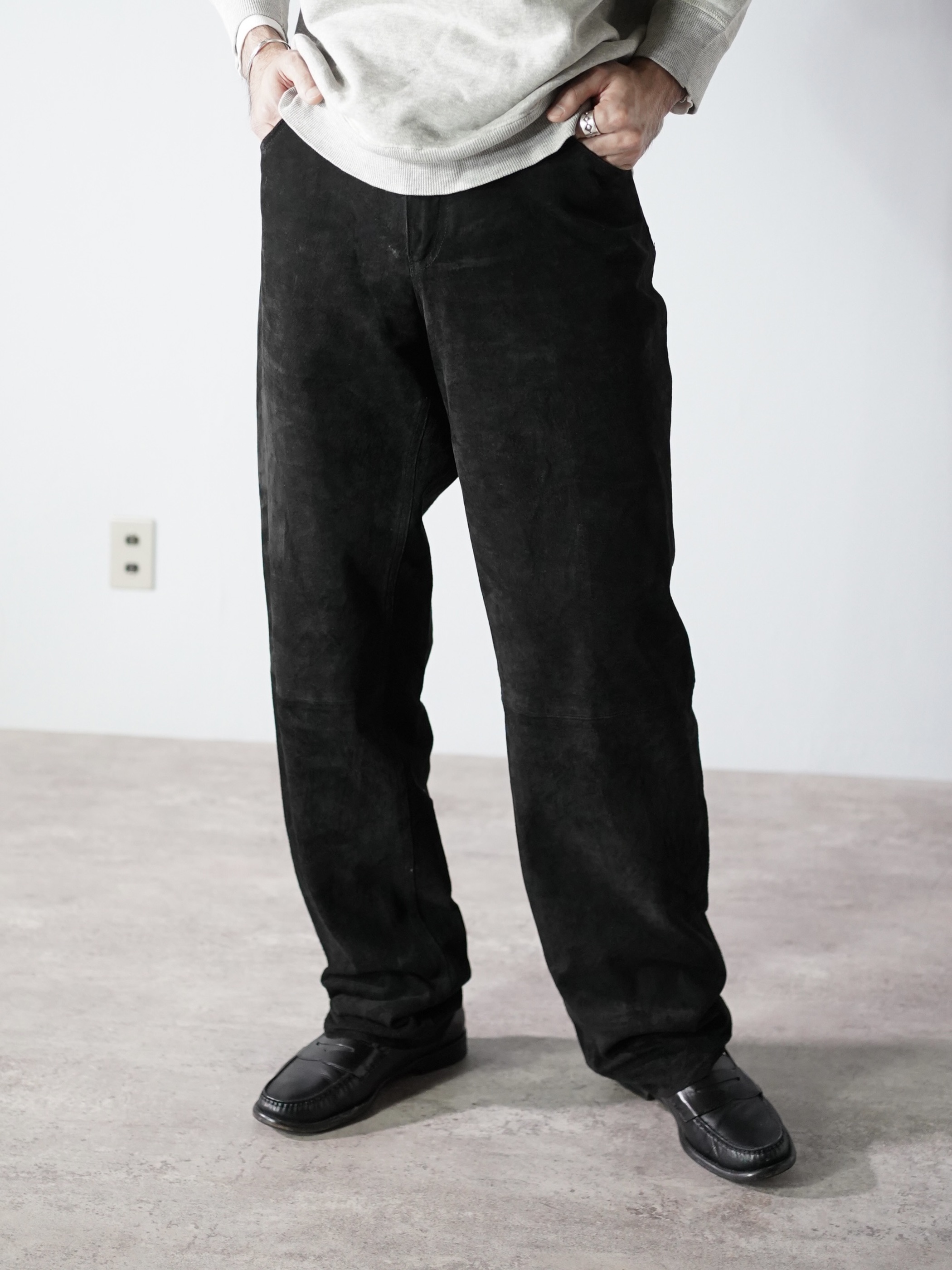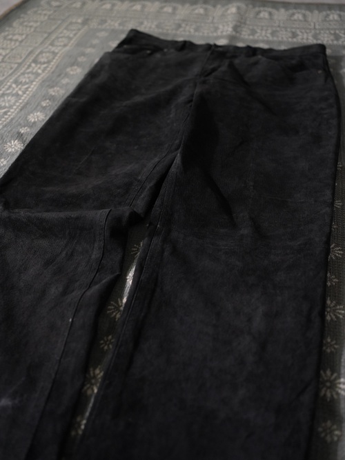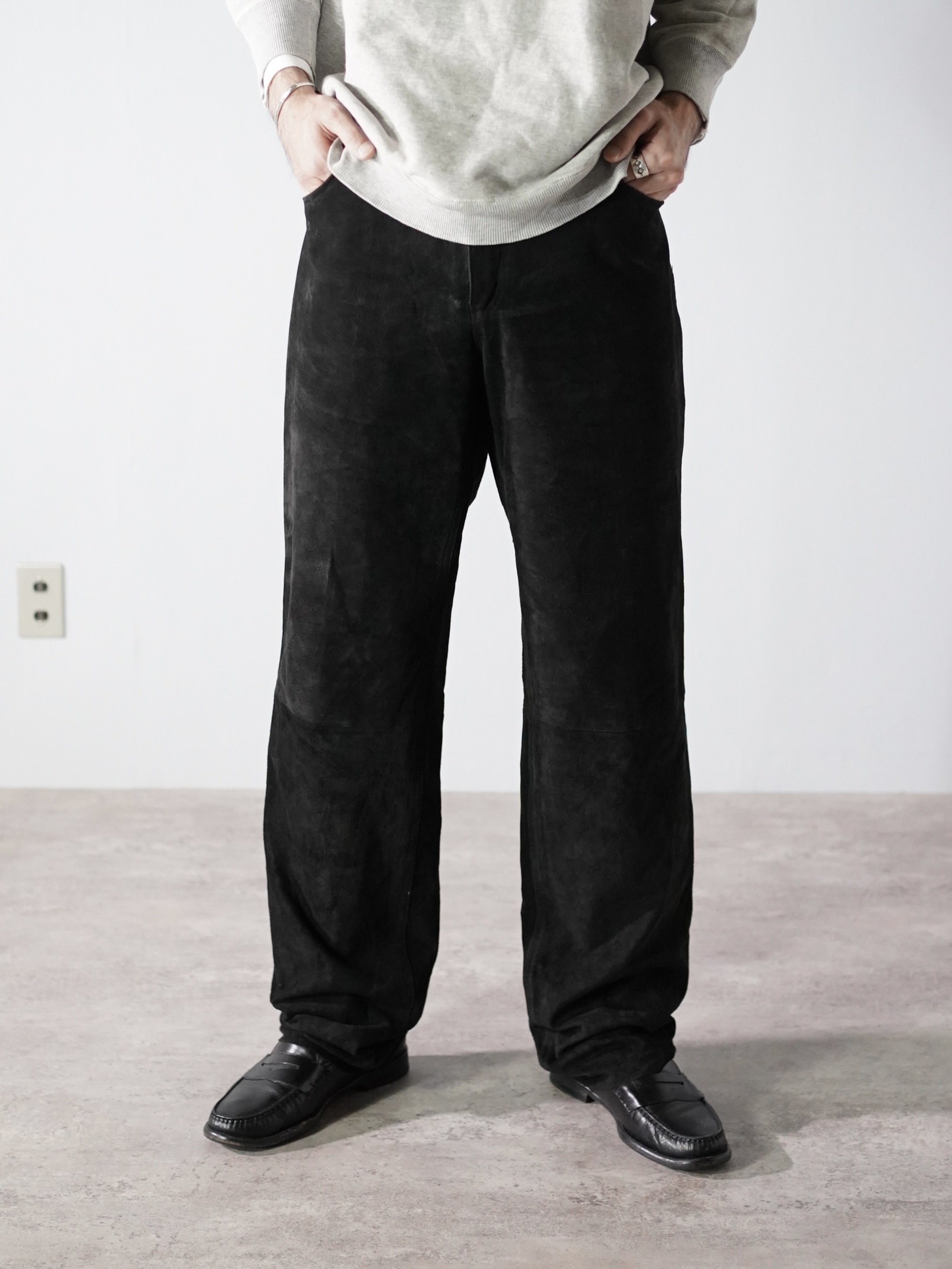 多くの方に馴染み深いジーンズの5ポケットデザインを、しなやかなスエードレザーを用いて再構築した一本。