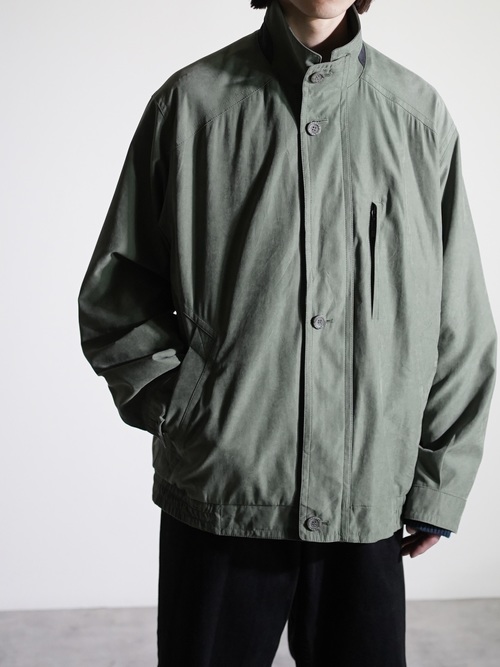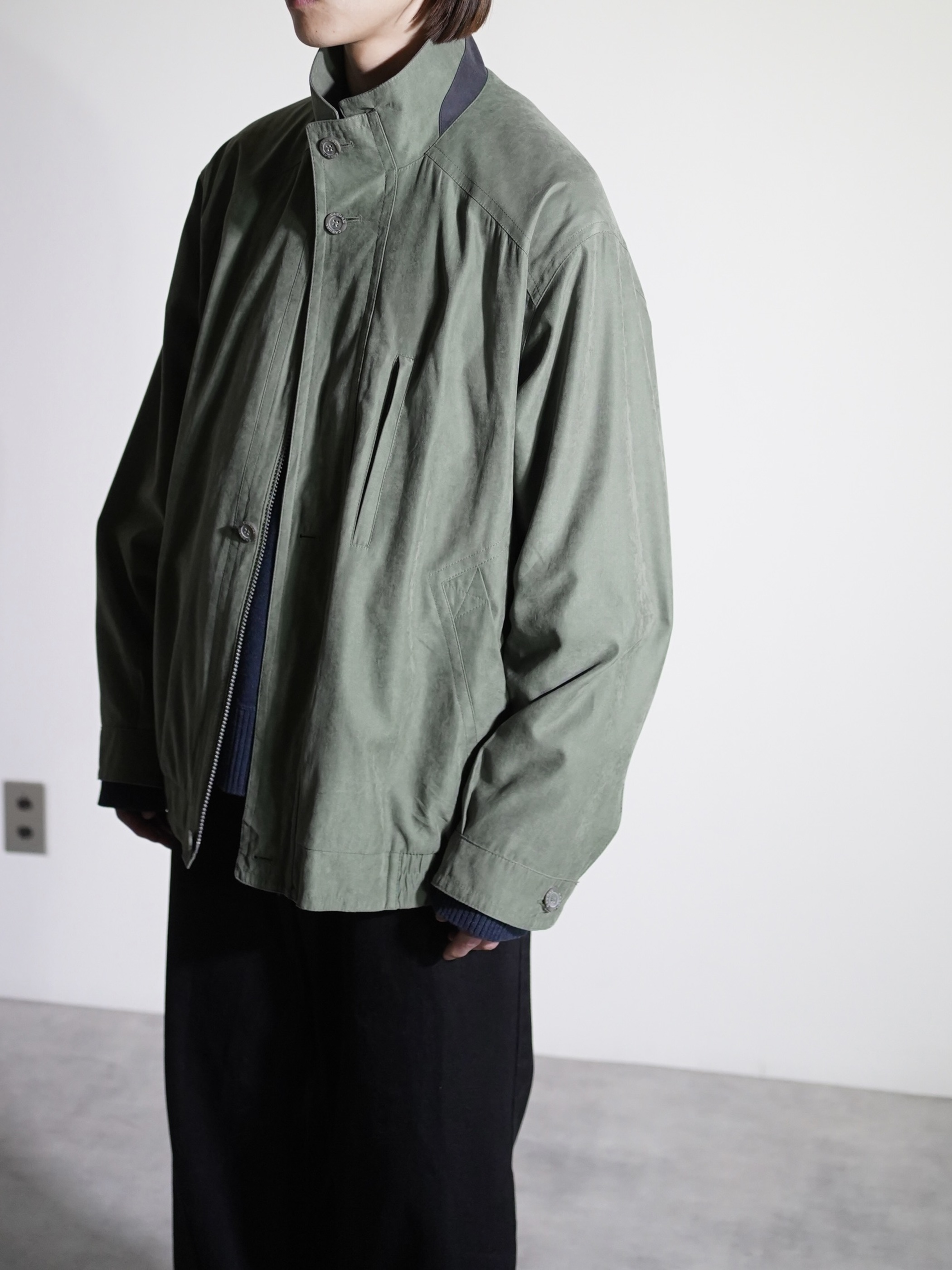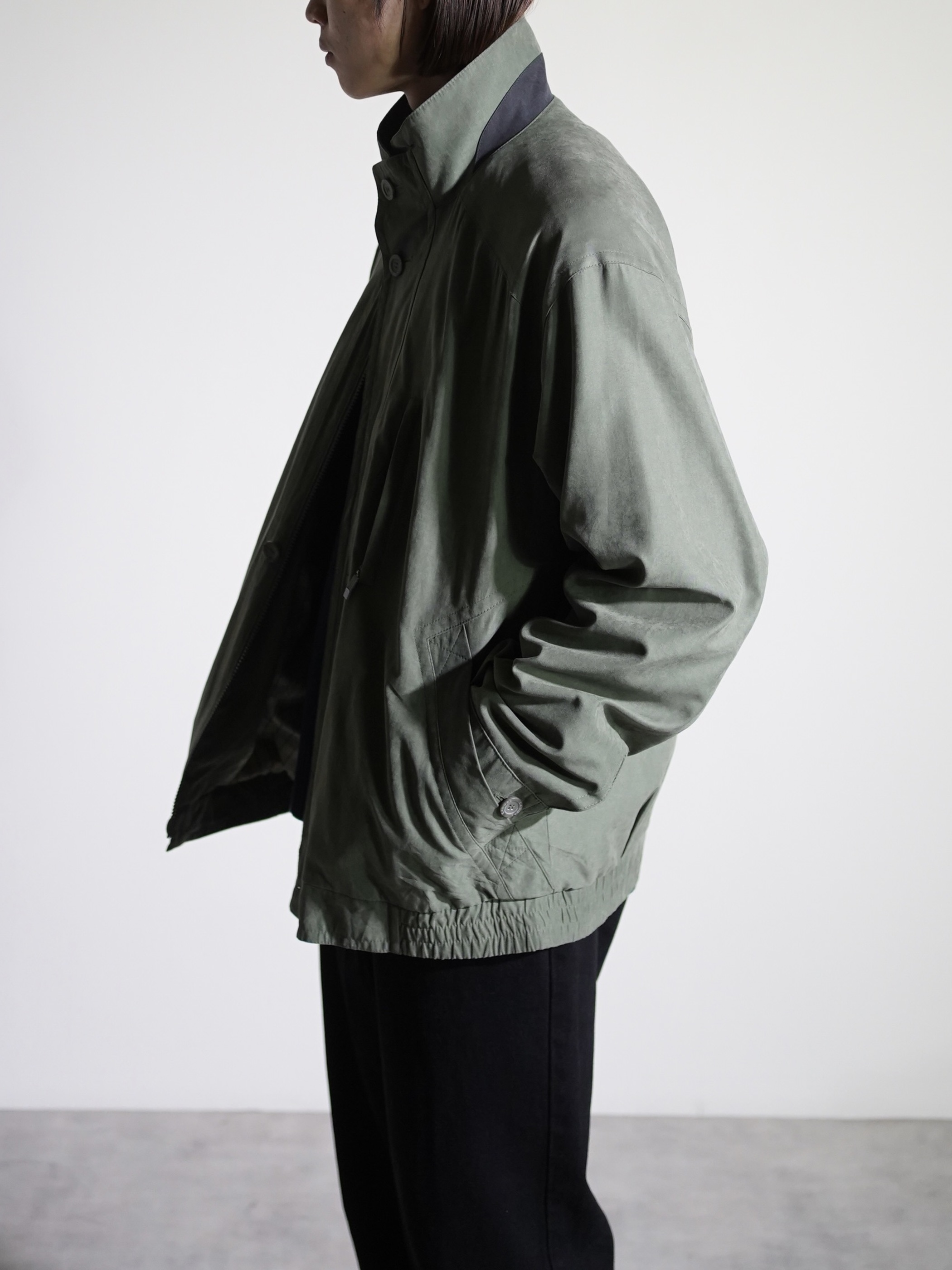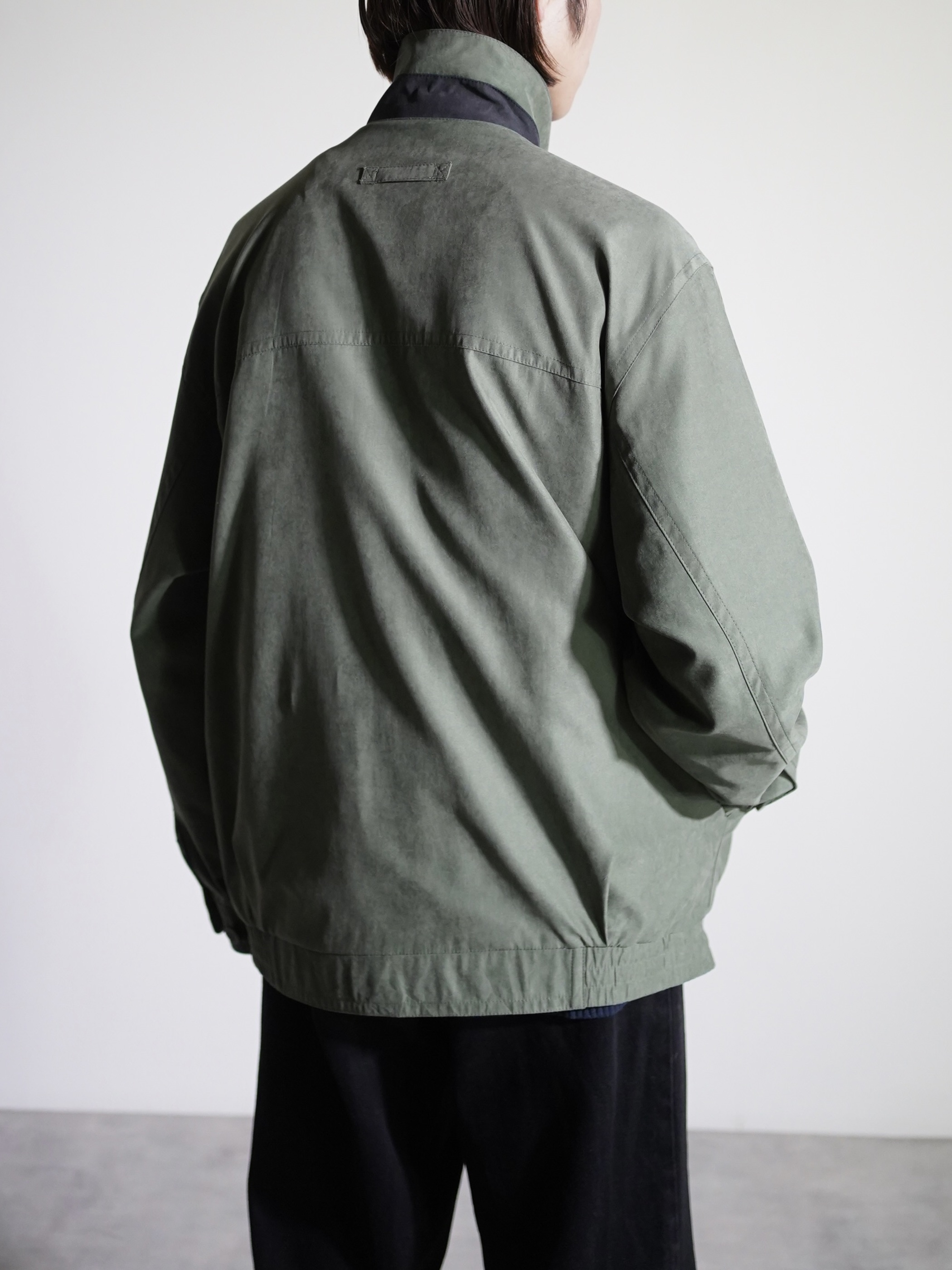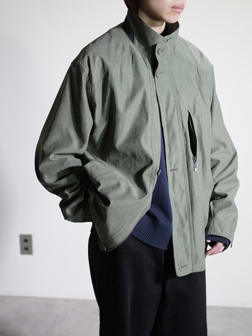 マットな艶と滑らかな質感のピーチスキンスタンドネックブルゾン。