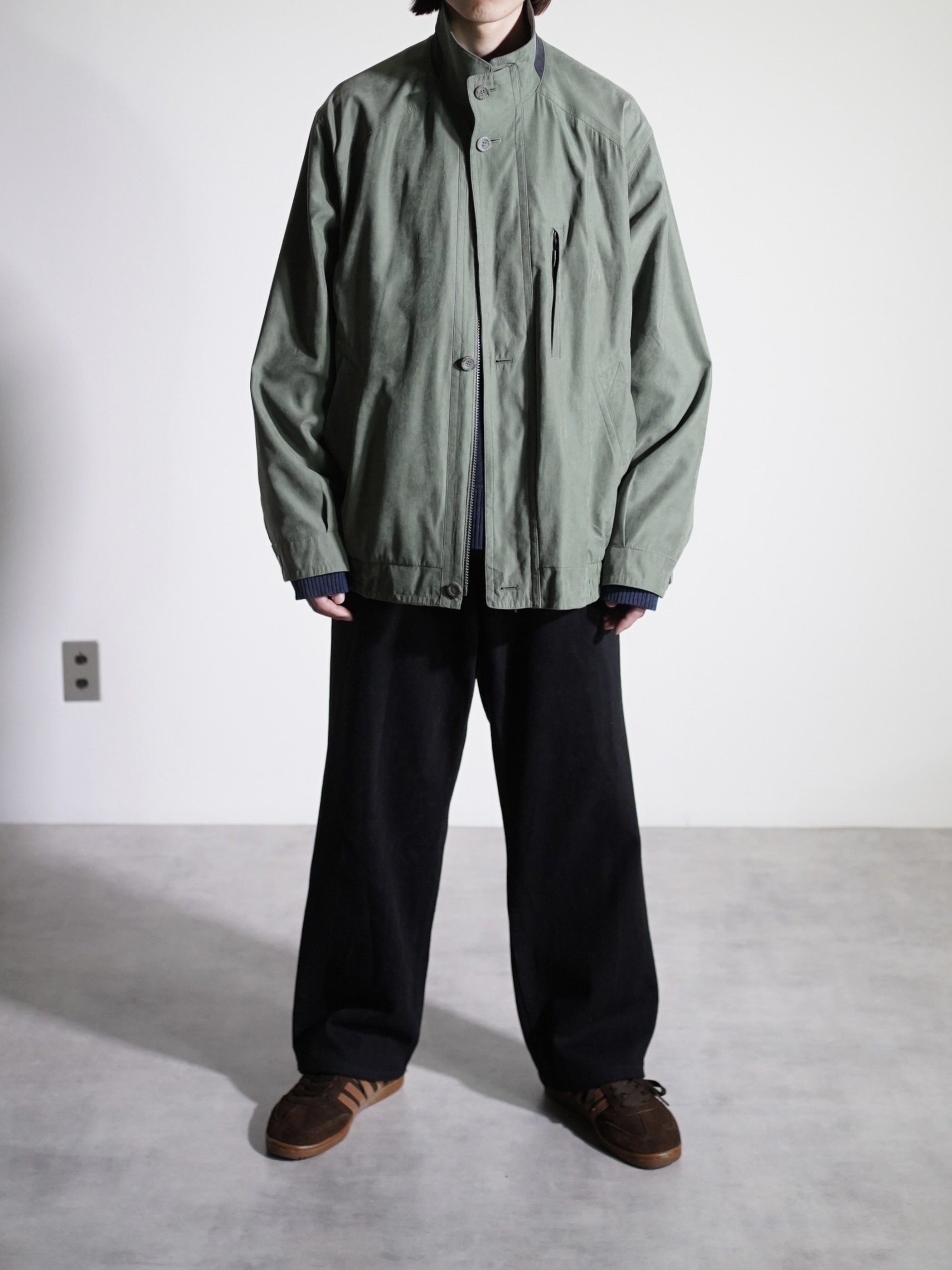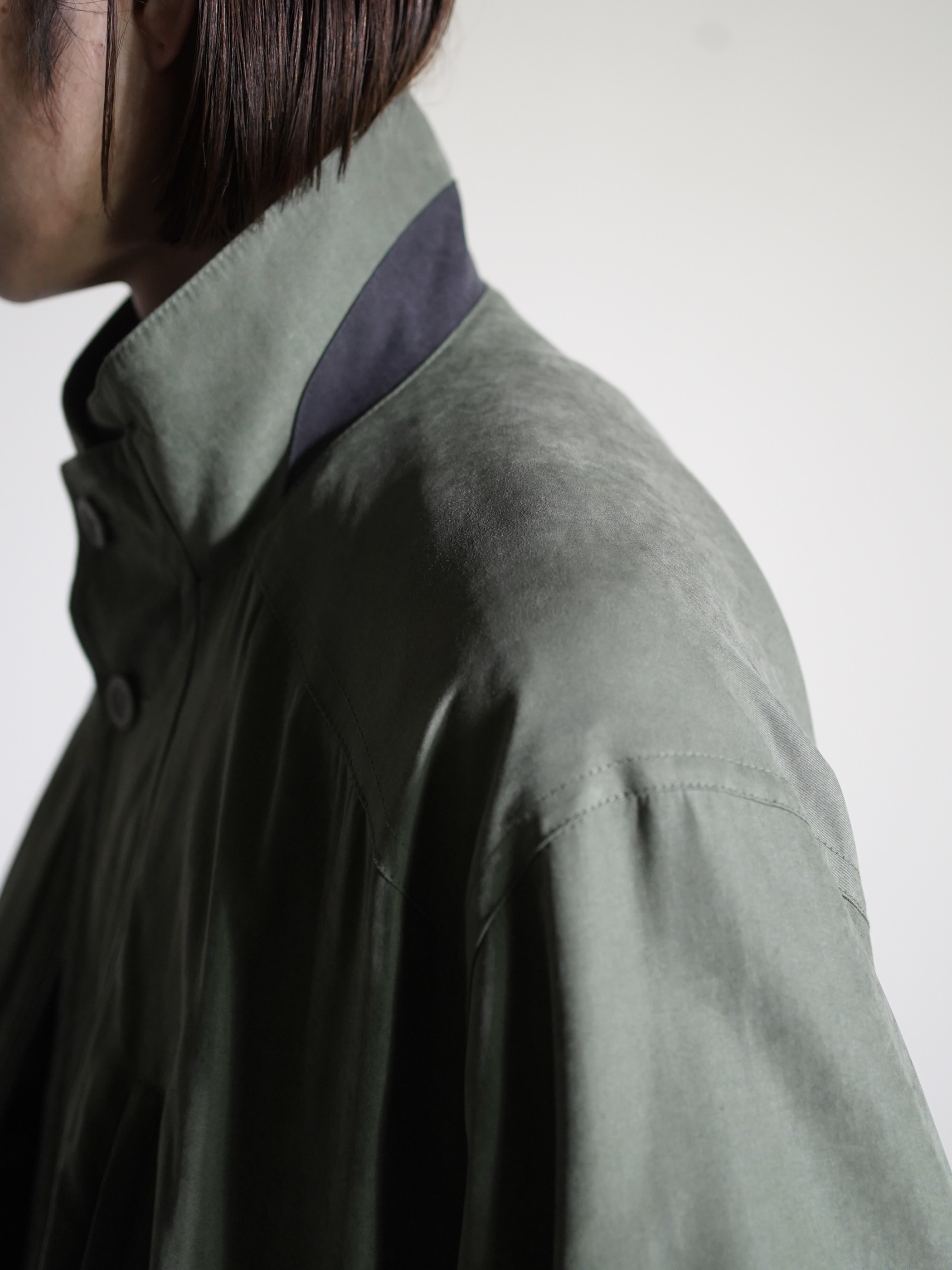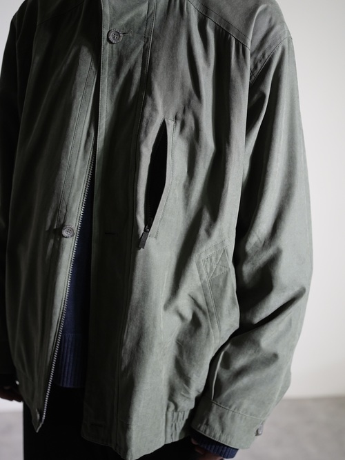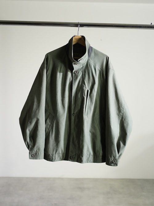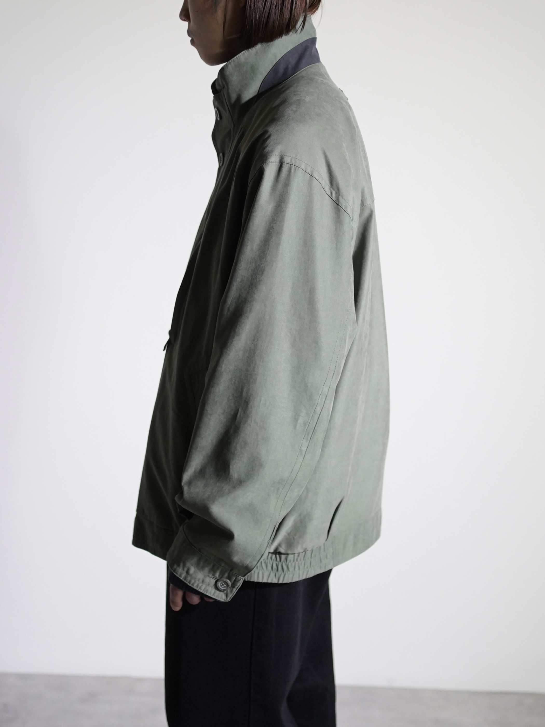 マットな艶と滑らかな質感のピーチスキンスタンドネックブルゾン。