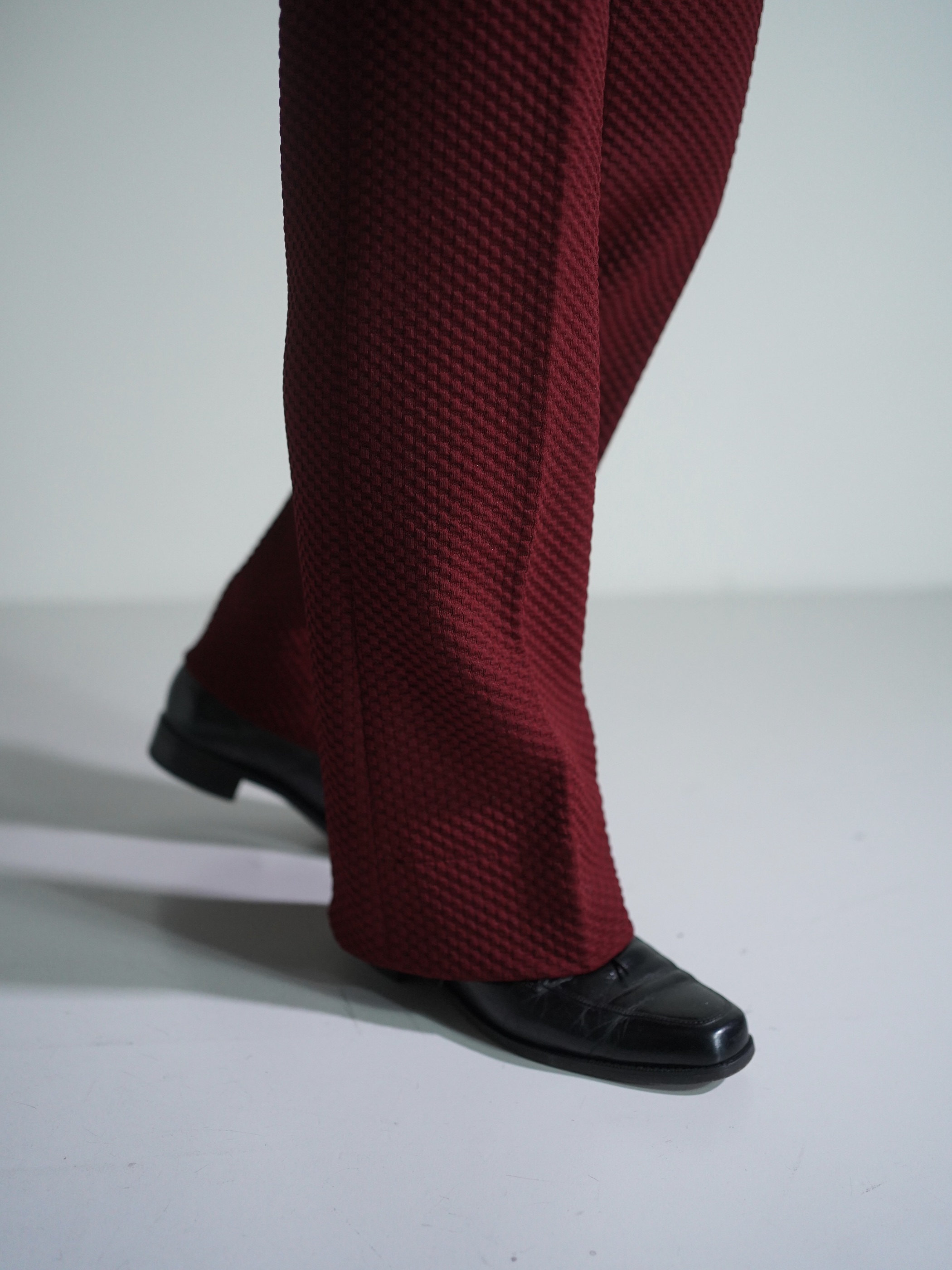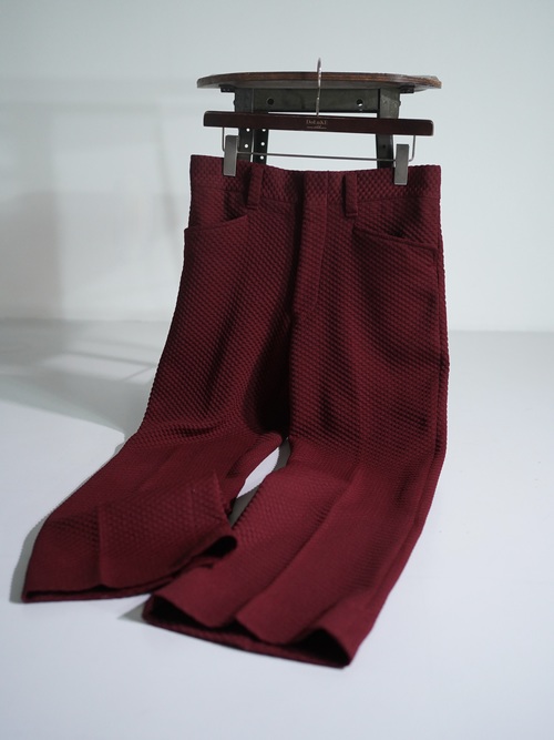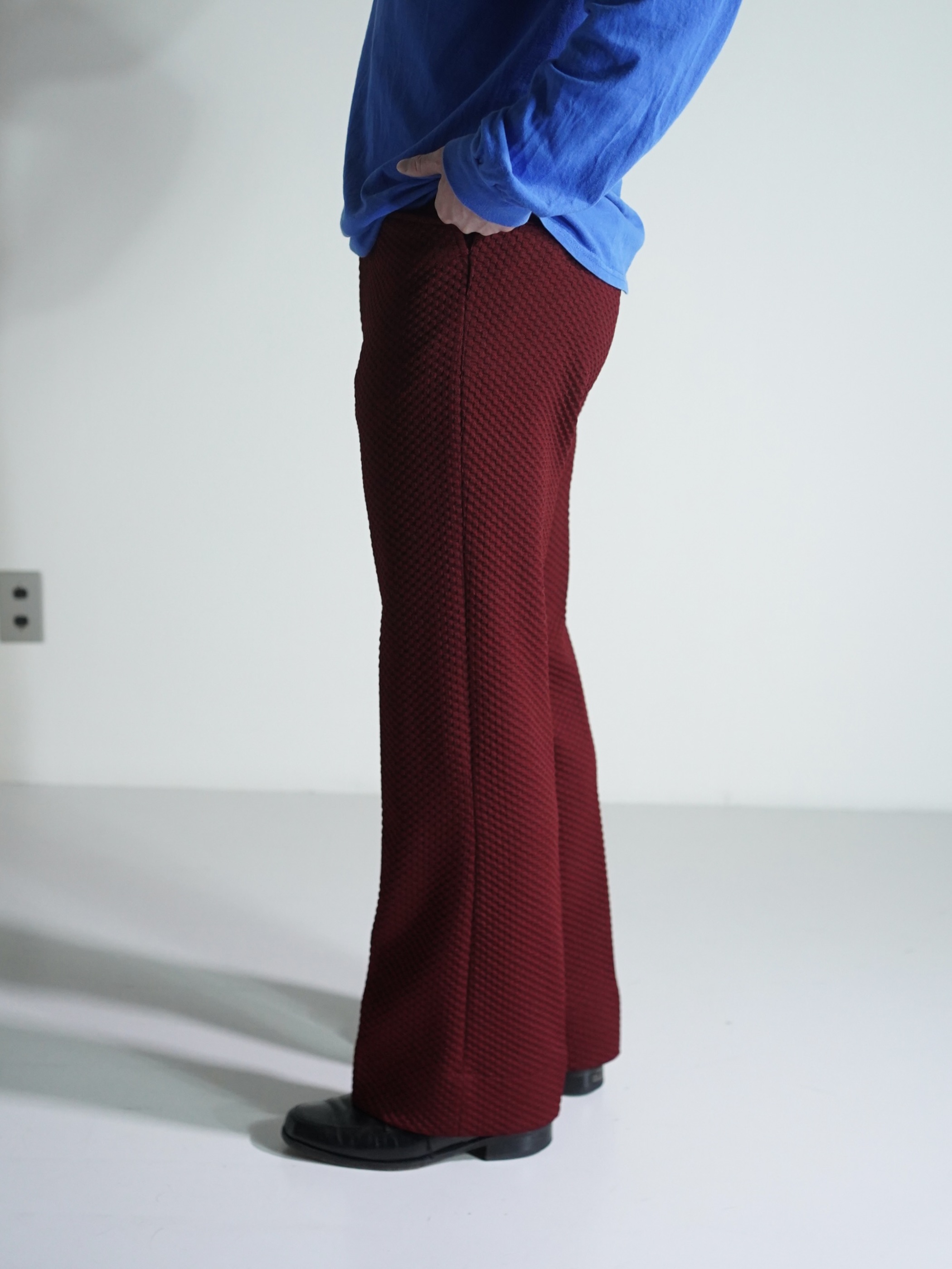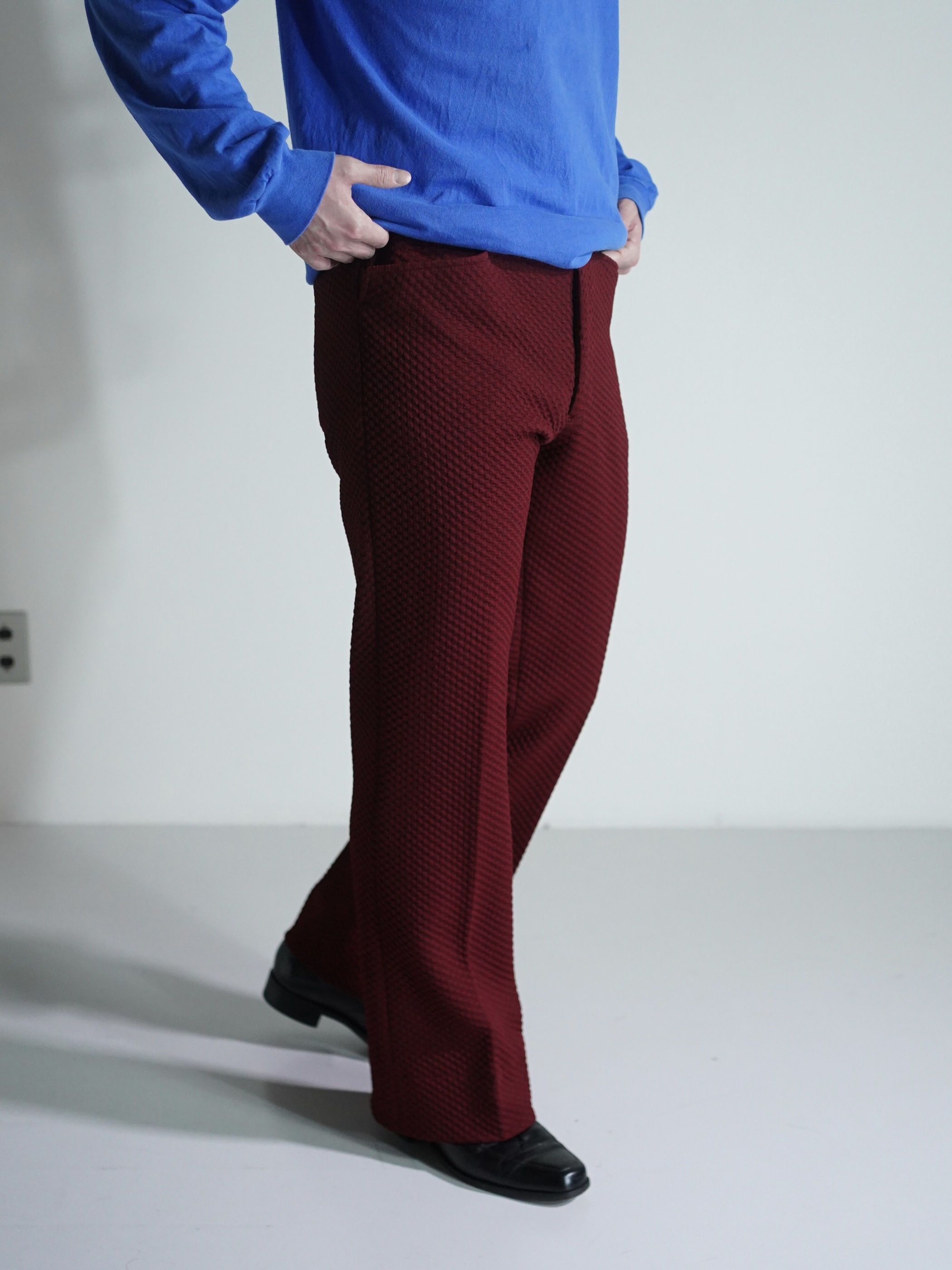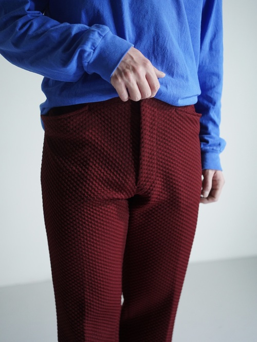 凸凹生地で仕立てられたブーツカットのトラウザーズ。