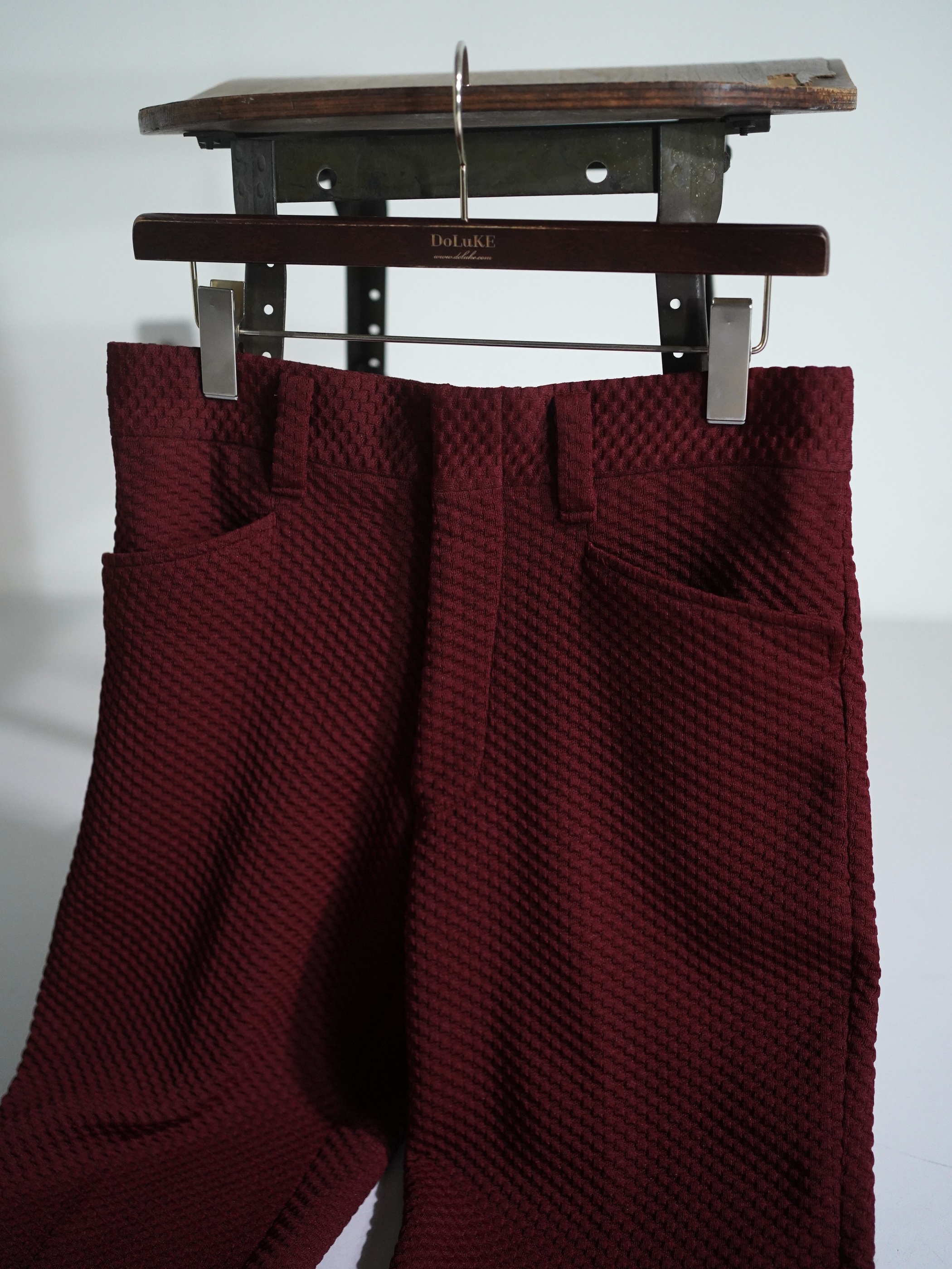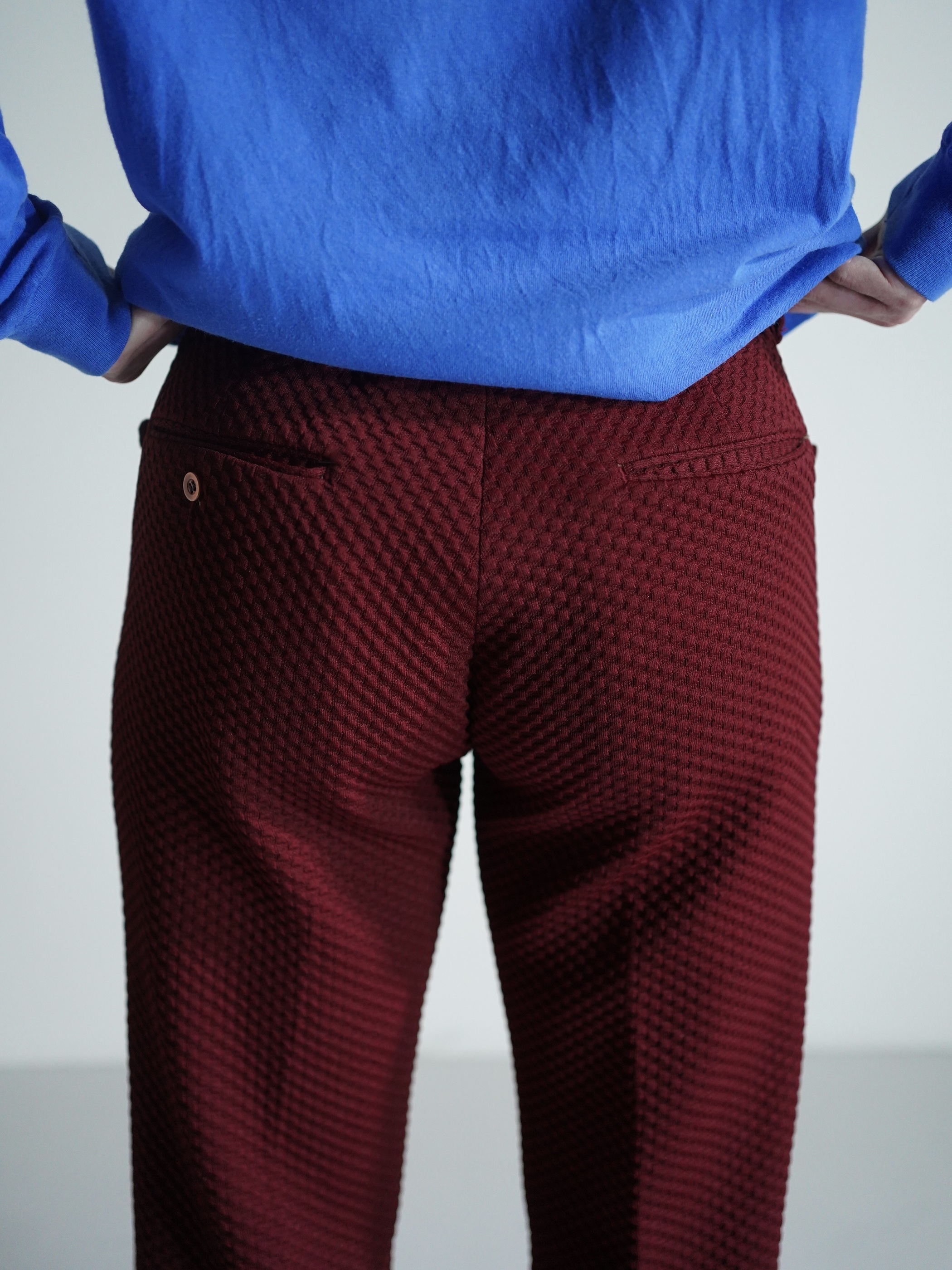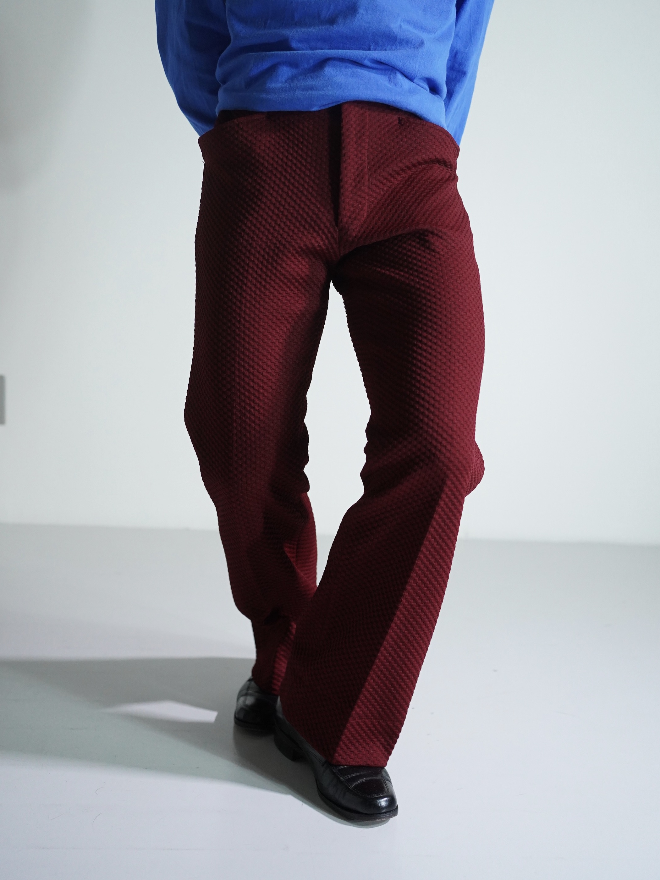 凸凹生地で仕立てられたブーツカットのトラウザーズ。