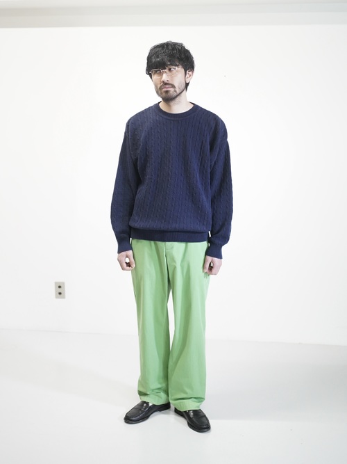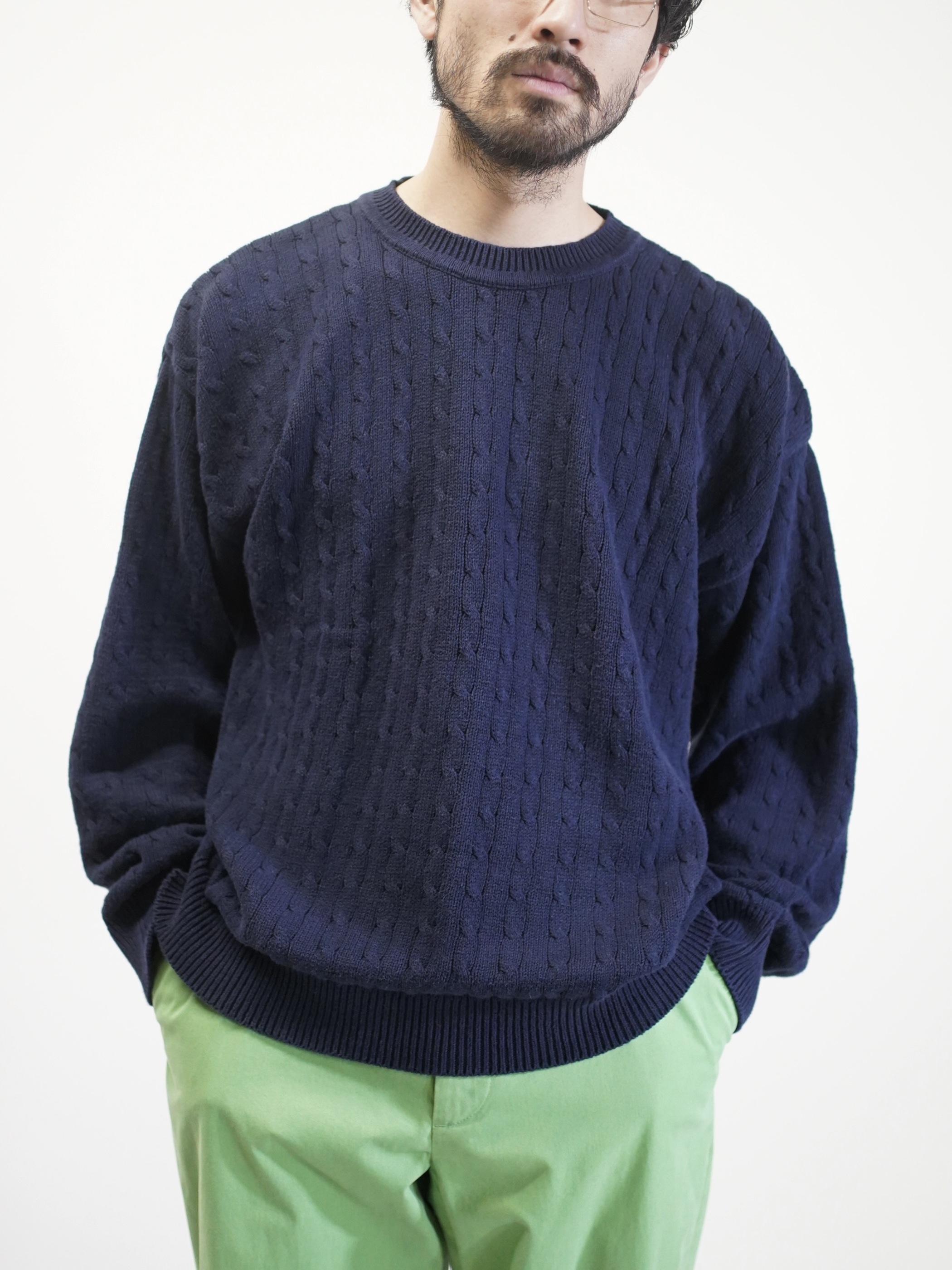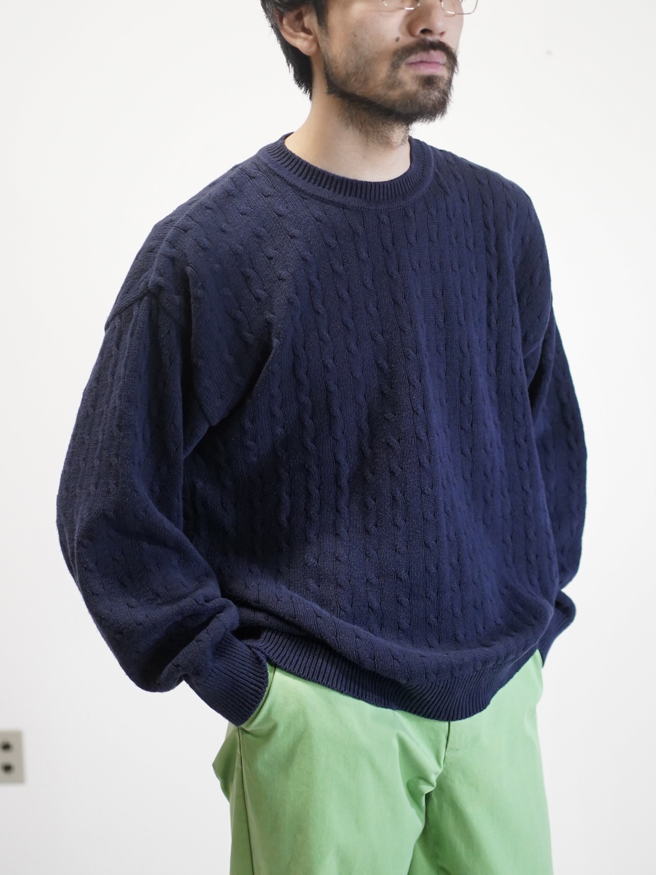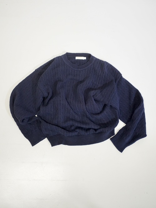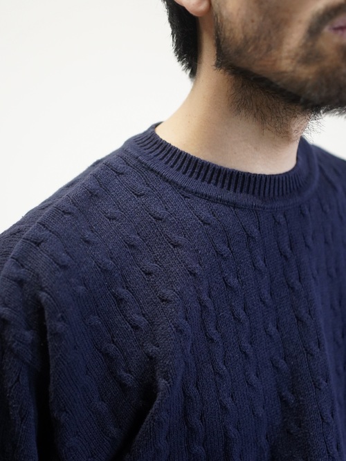伝統的なケーブル編みをネイビーカラーで仕上げたコットン素材。