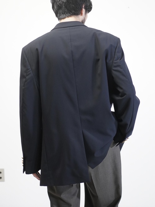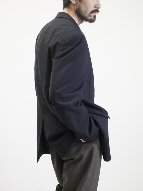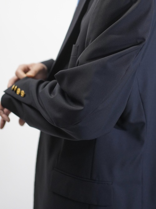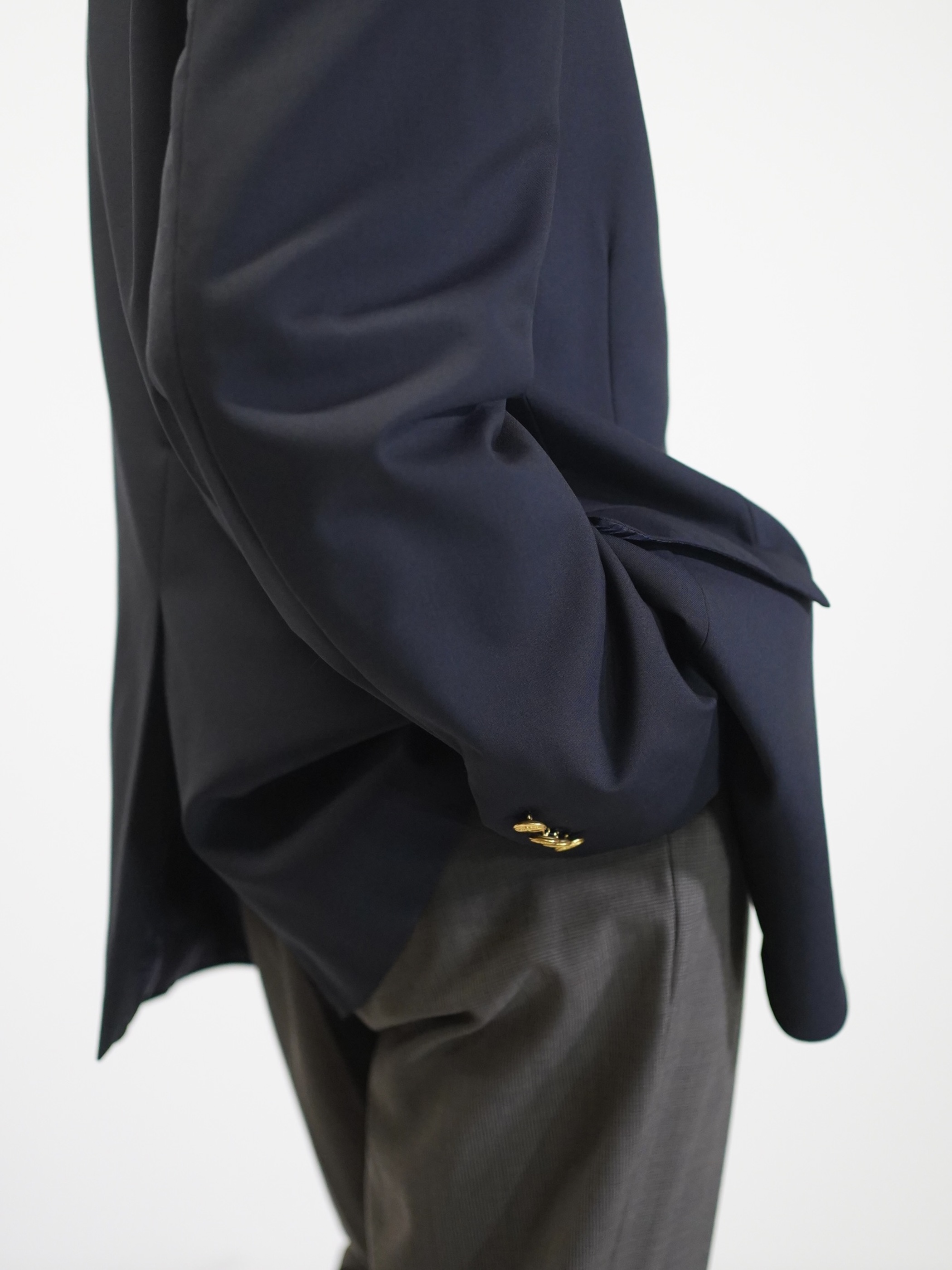優雅に揺れるドレープを纏い、程よく余白を持たせたネイビーブレザー。