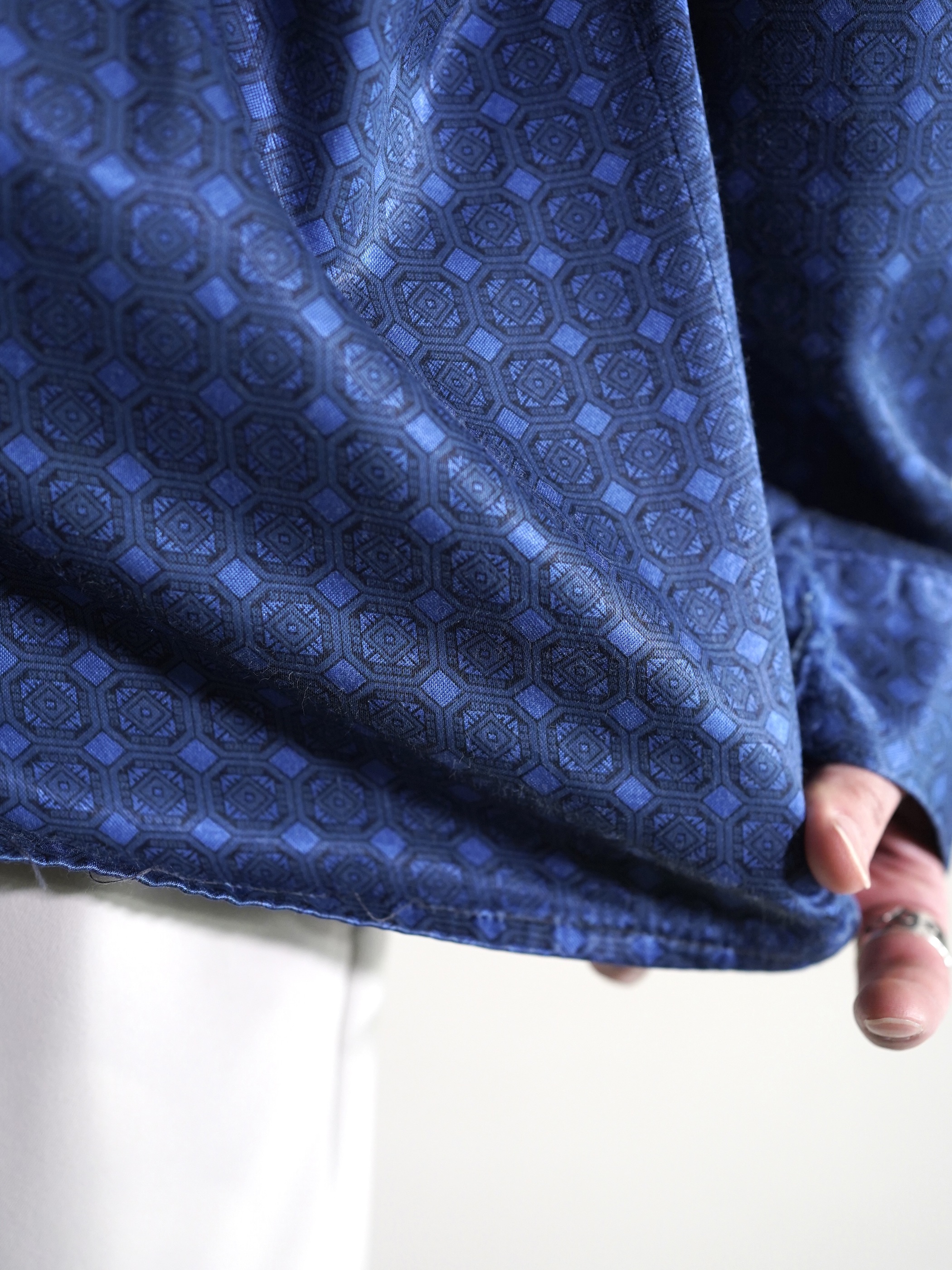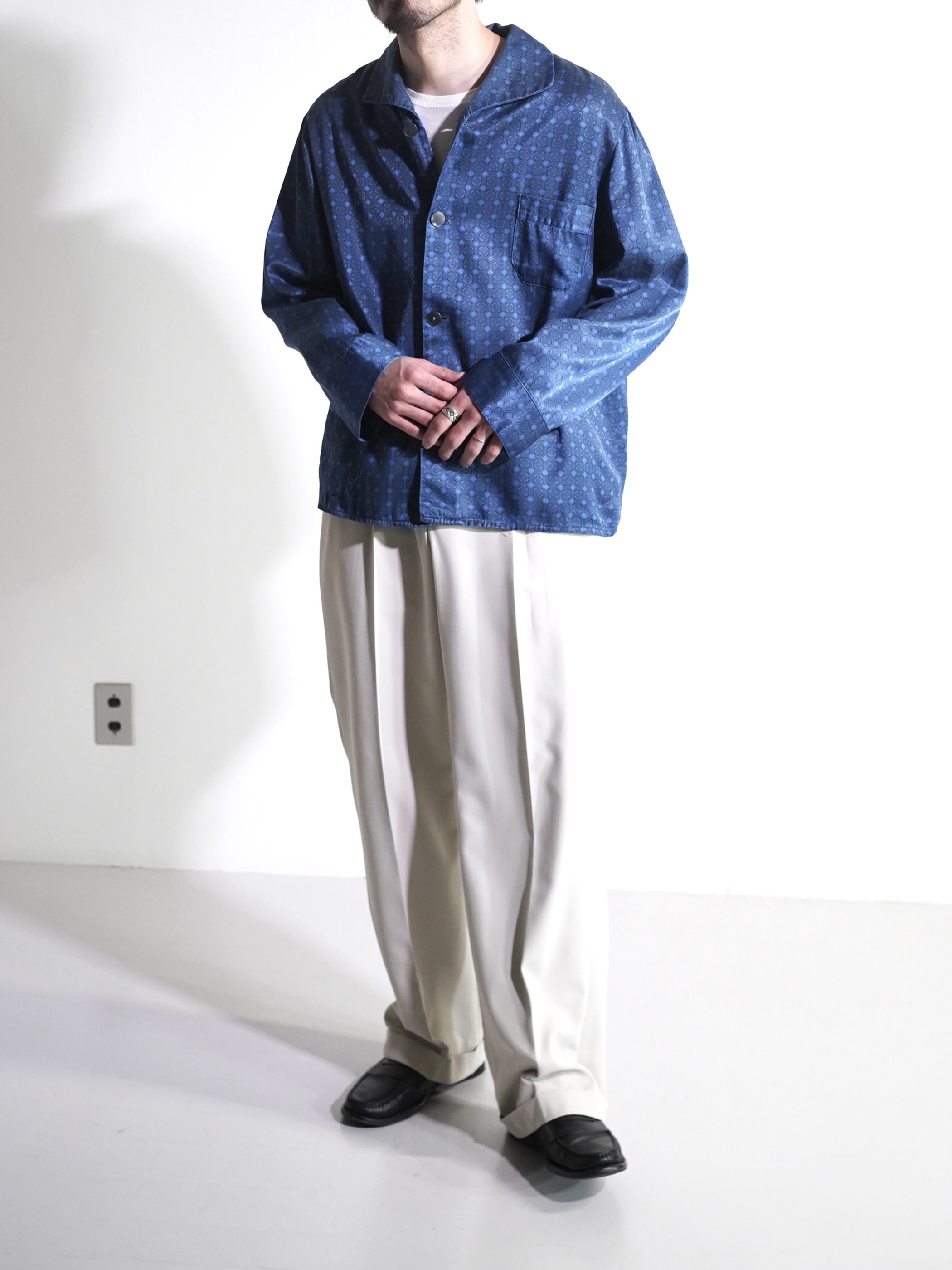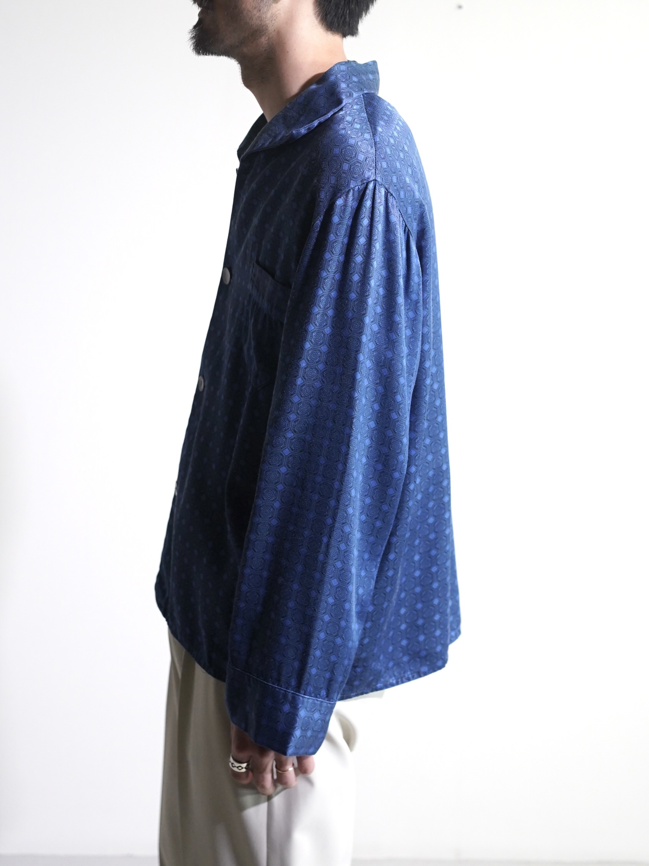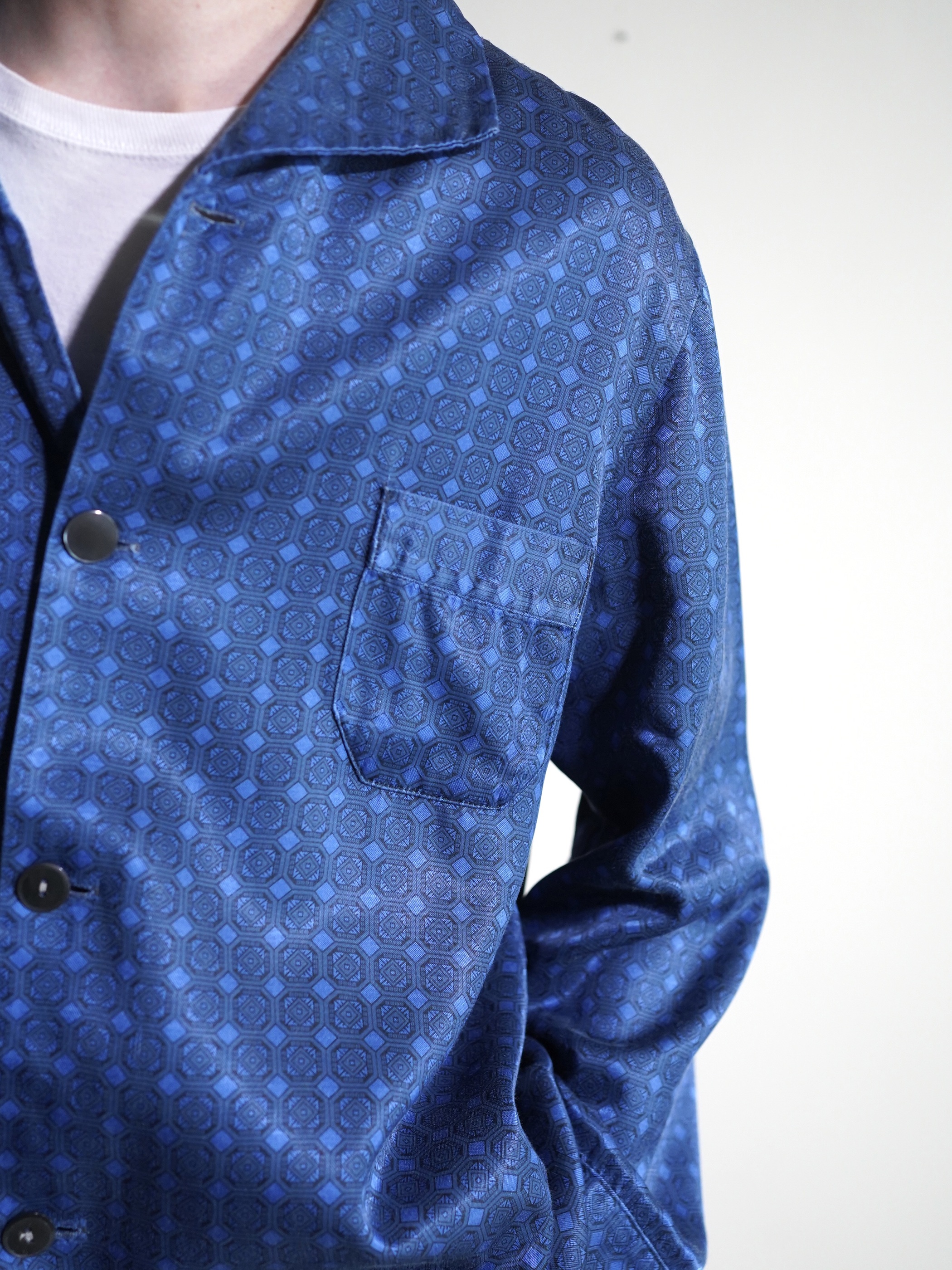1980's Europa horizontal open collar exotic pattern poly fab pajama shirts