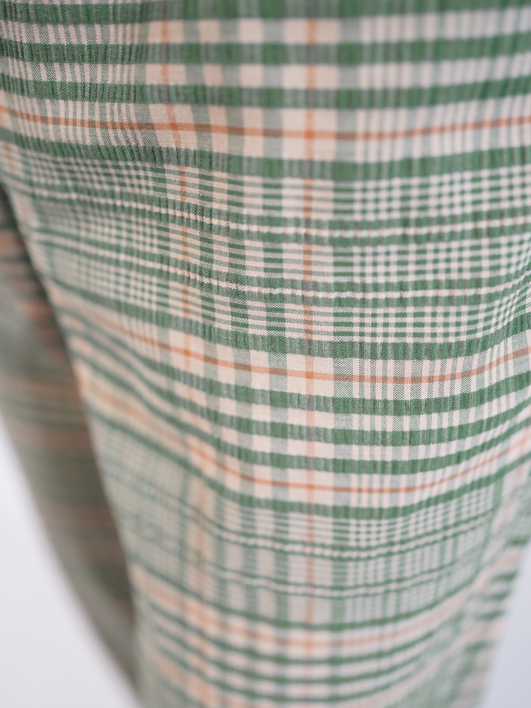 さらっとした質感のシアサッカー地を彩る、緑とオレンジのチェック柄。